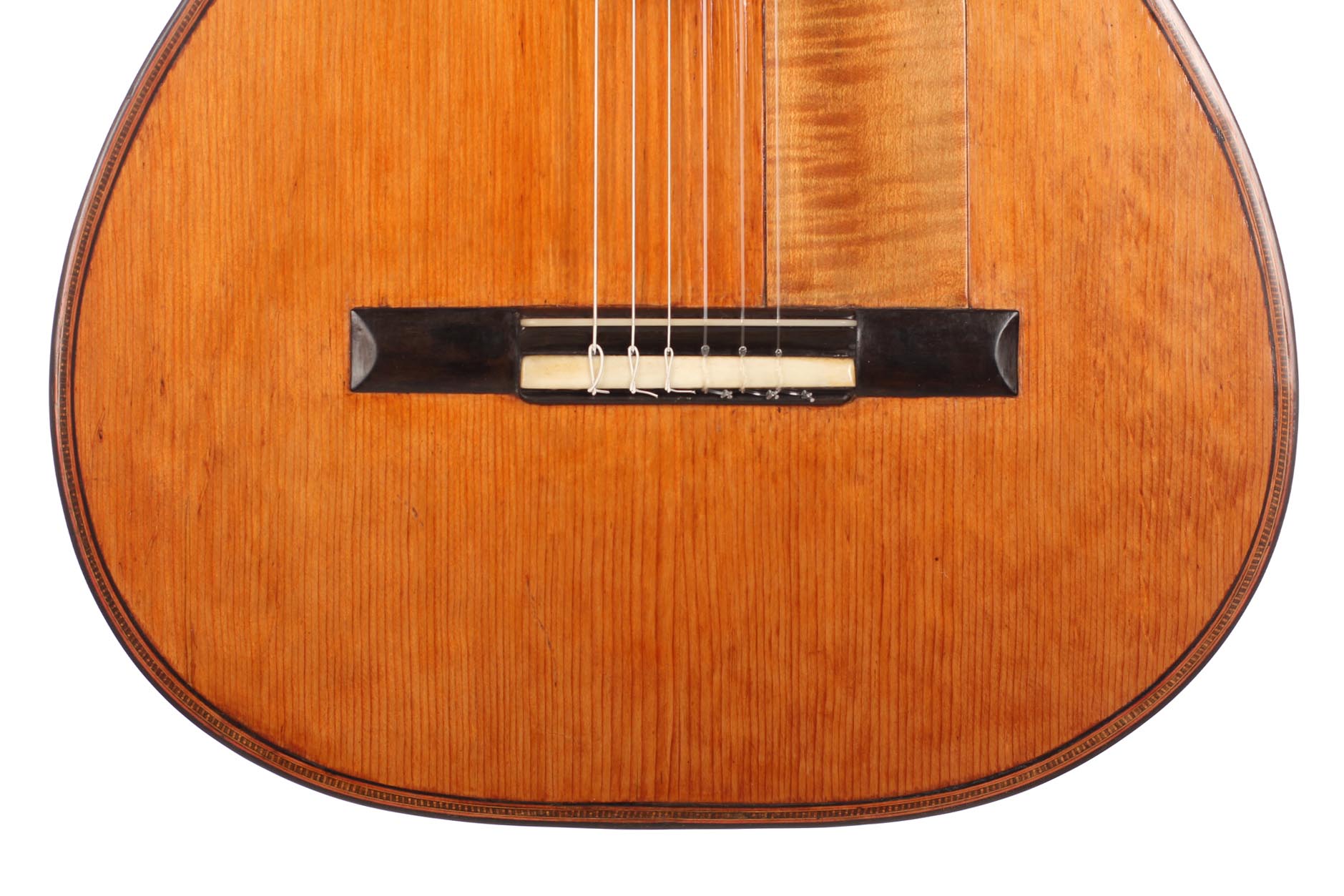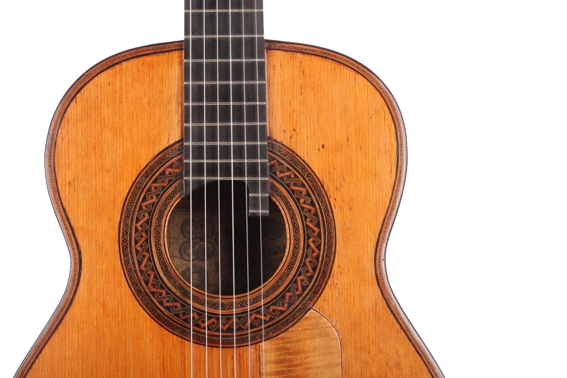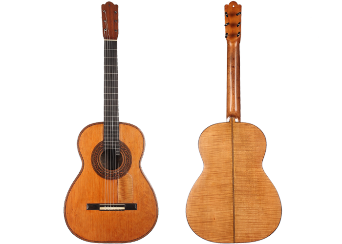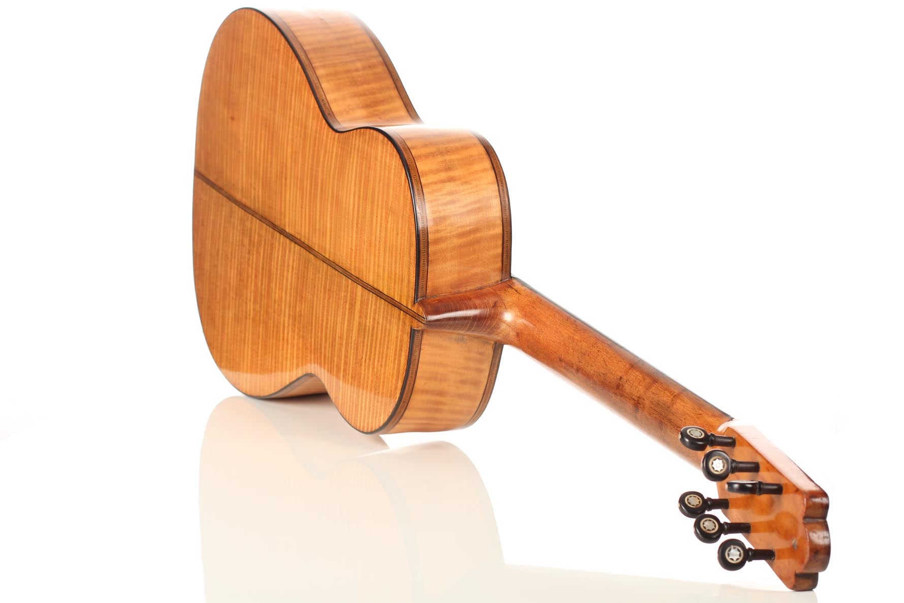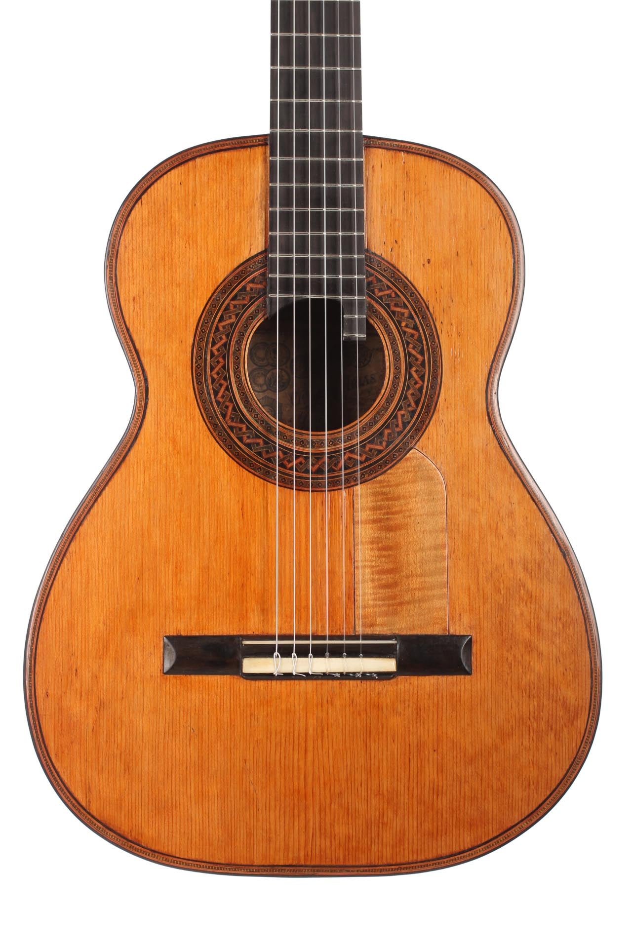 Dieses Instrument wurde 1913 gebaut und ist reichlich dekoriert. Es handelt sich um ein großes Konzert-Model mit Boden und Zargen aus sehr schönem geflammten Ahorn. Ein interessantes Merkmal diese Gitarre ist der originale Ahorn-Schlagschutz (Golpeador) auf der Decke. Die Gitarre ist sehr gut abgestimmt und wunderbar zu spielen. Das Klangbild ist sehr ausgewogen. Diese Arias verfügt über einen sehr vielfältigen und verlockenden Klang, einen reichhaltigen Diskant und schöne tiefe Bässe. Ein Hartschalenkoffer ist inklusive.