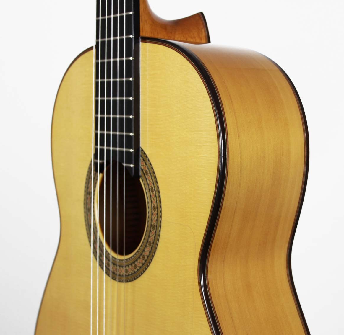 Vicente Carrillo was born in 1963 being the 4th generation luthier in the Carrillo family. Vicente contructs Flamenco and Classical guitars. He was awarded in 2009 with the Regional Craftsmanship Award and in 2010 with the National Craftsmanship Award. His guitars are and were played by Paco de Lucía, Tomatito, J.M. Cañizarez, El Niño Josele, Rafael Cañizares, Javier Limón, Keith Richards. This guitar by Vicente Carrillo has spruce top. Back and sides are made of finest cypress wood. The guitar is easy to play and has a bright and punchy sound. Overall condition is very good. The machine heads are made by Gotoh. Hard shell case included.