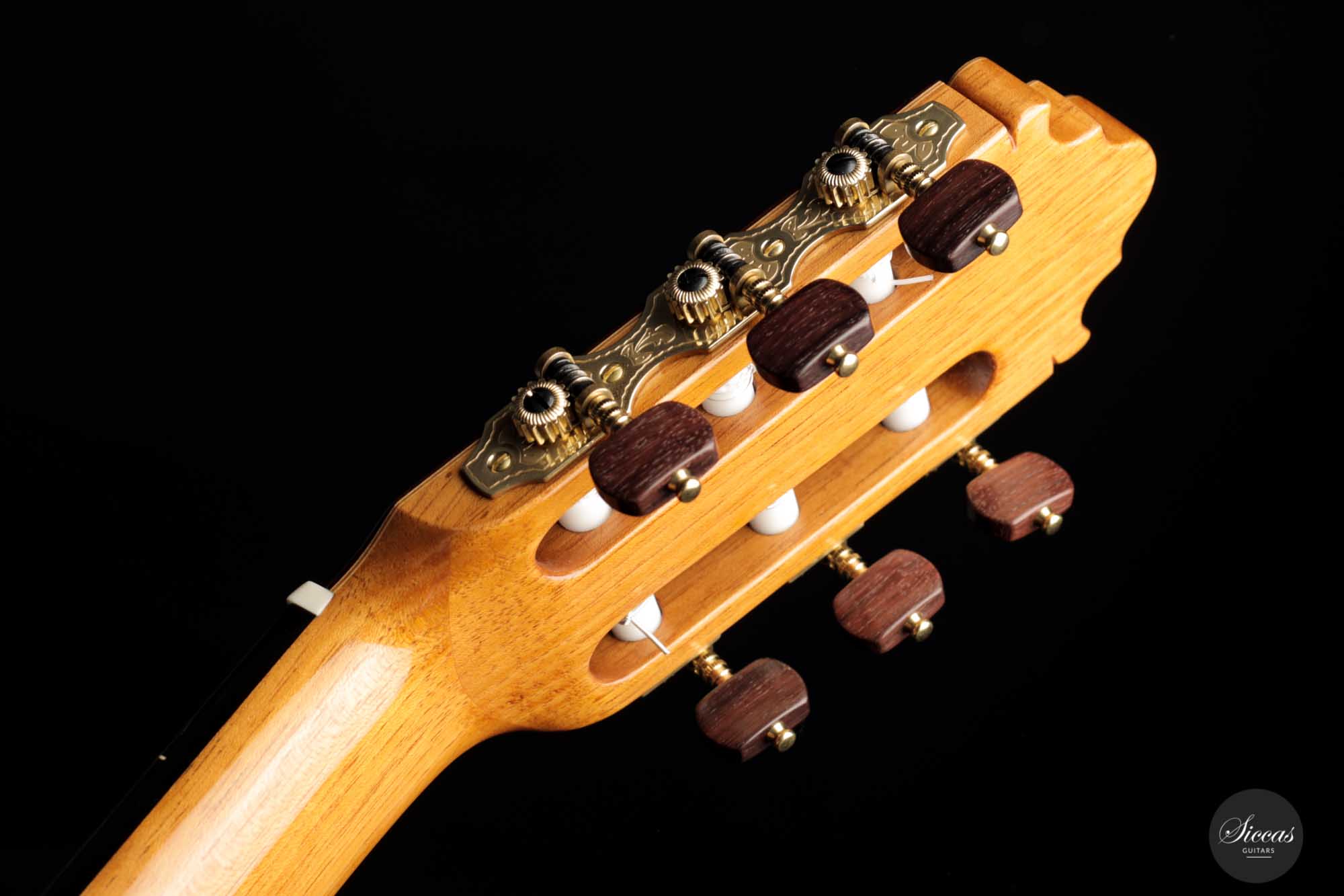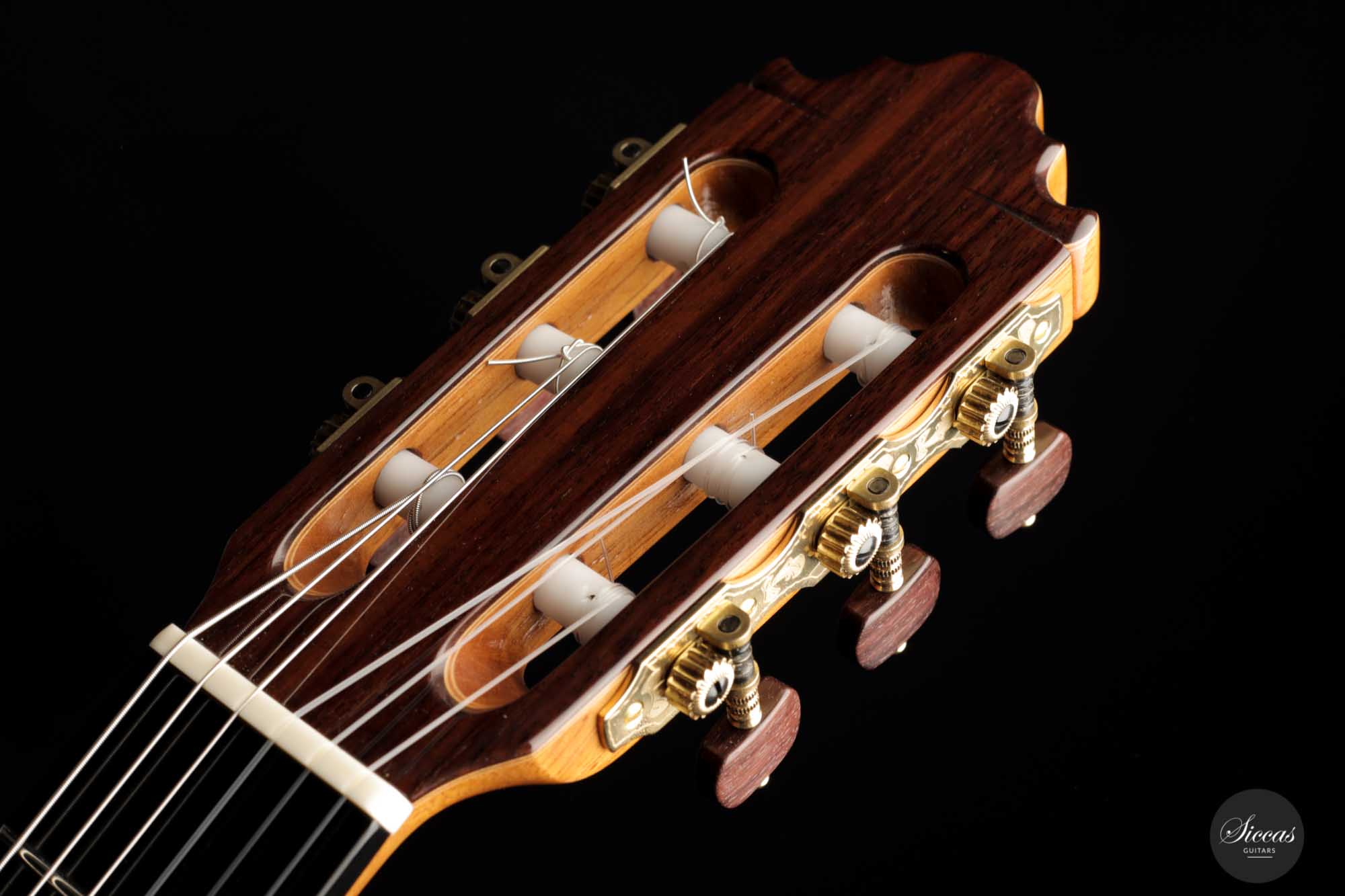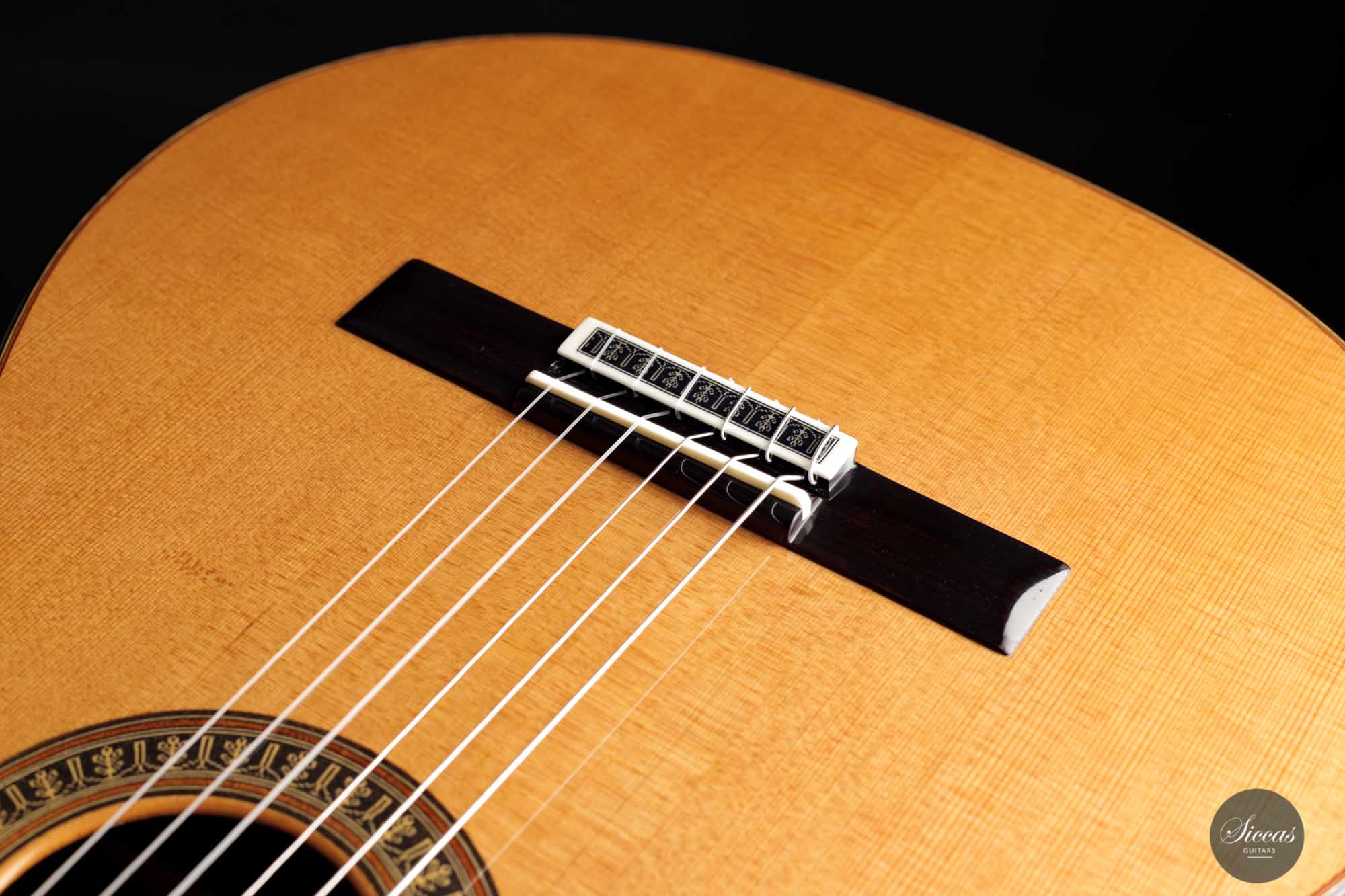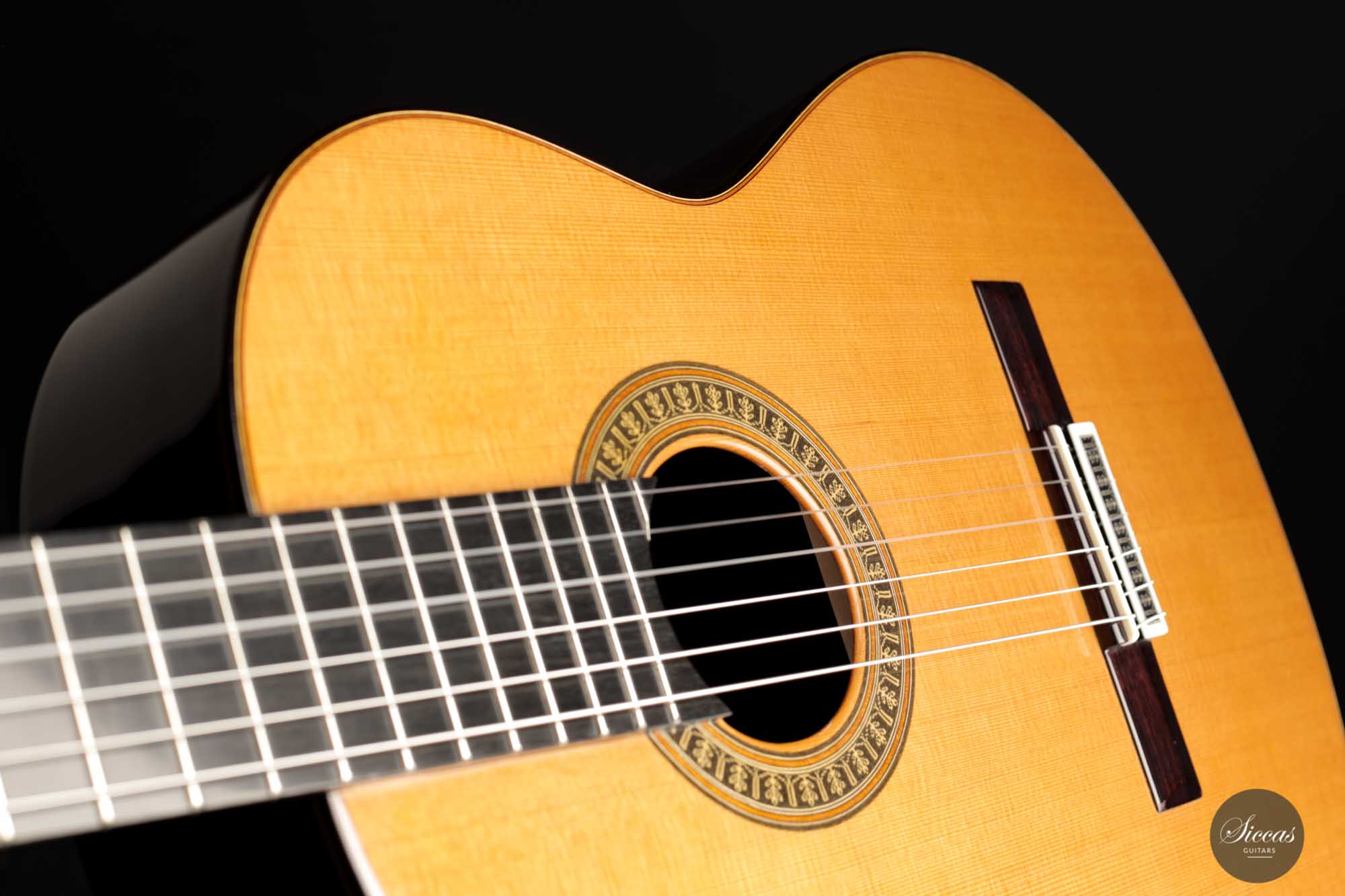 The "Herencia" model is Vicente Carrillo's most famous model and is an accurate benchmark of his distinguished luthiery skills. You will often see the Herencia on stage, in international competitions, or in your local music school in your teacher's hand. This guitar, an homage to the heritage left by his guitar makers' family, is a blend of tradition and modernity. It features a carbon-free lattice bracing made of spruce, which, combined with the cedar soundboard, provides a mighty warm and precise sound. The thickness and darkness of the tone are striking, yet, a certain clarity makes the counterpoint effortless to follow. The sensitivity and mellowness of the trebles are particularly remarkable on this guitar, and the amount of emotion that the guitarist can carry with this instrument is exceptional.