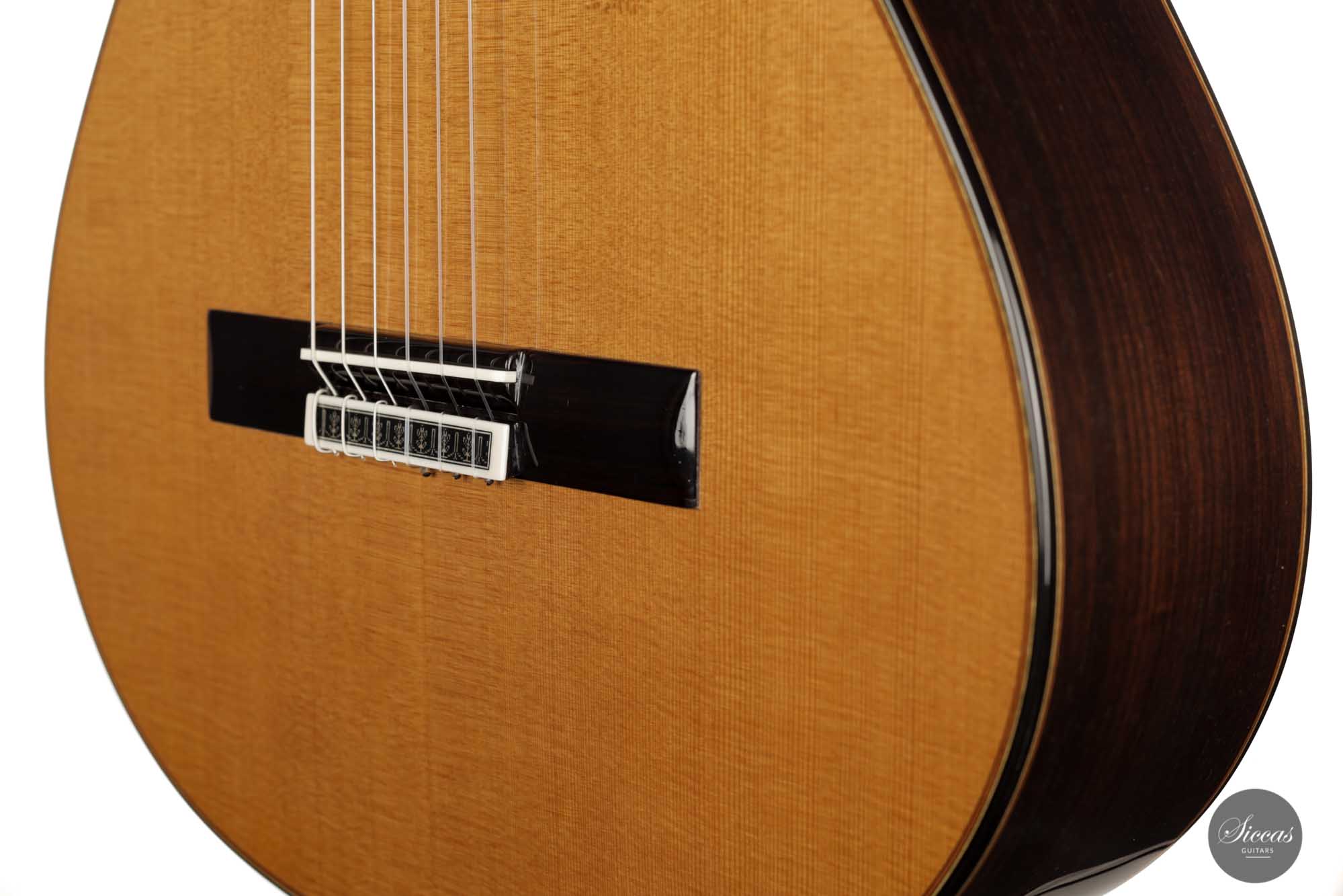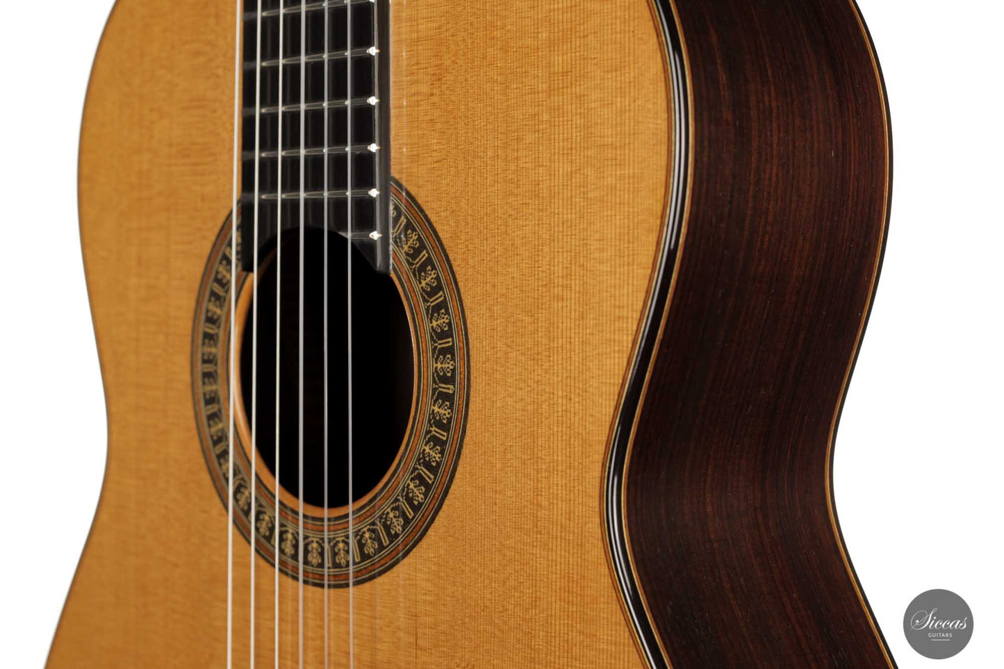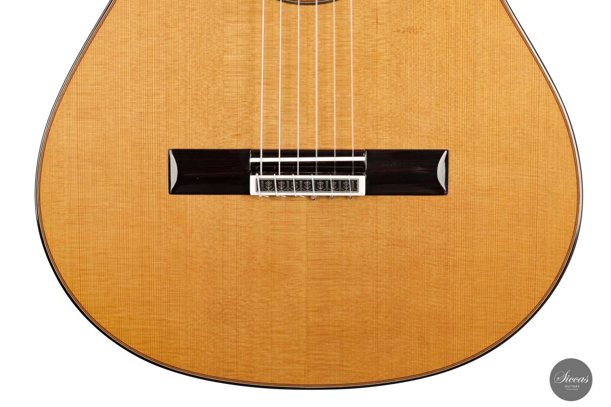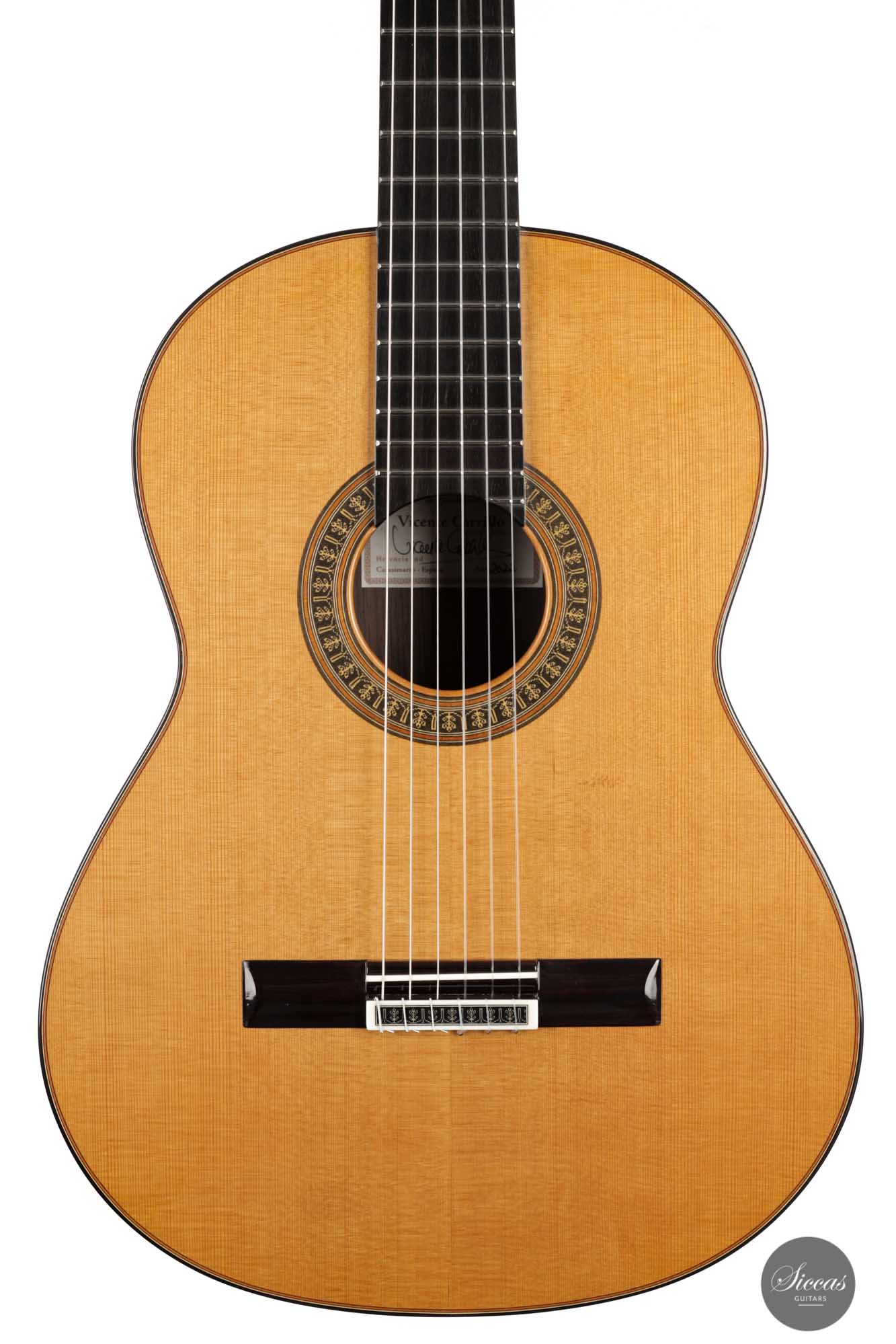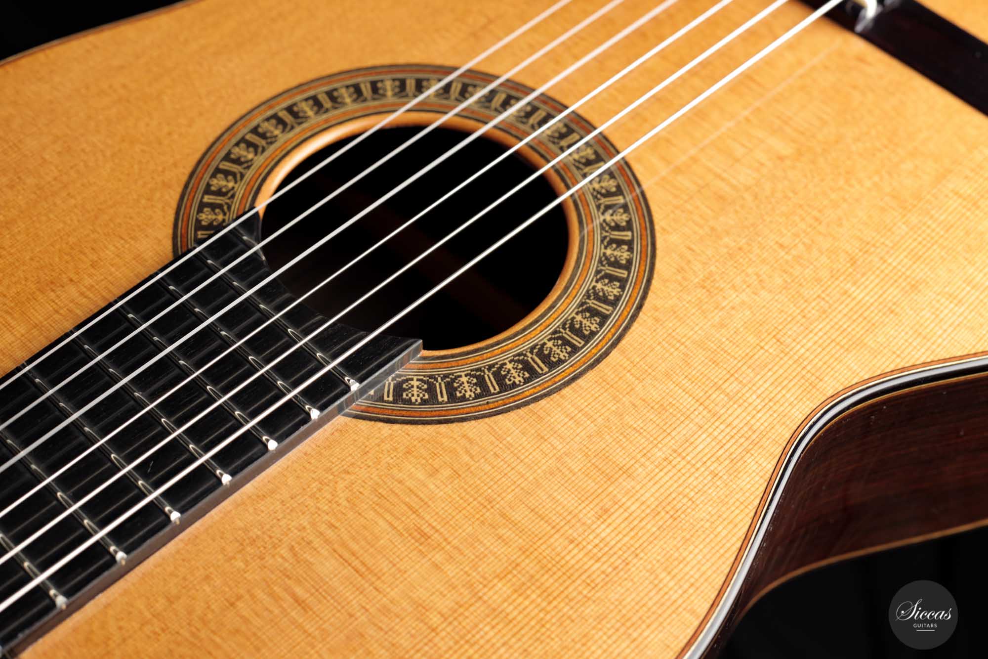 The "Herencia" model is Vicente Carrillo's most famous model and is an accurate benchmark of his distinguished luthiery skills. You will often see the Herencia on stage, in international competitions, or in your local music school in your teacher's hand. This guitar, an homage to the heritage left by his guitar makers' family, is a blend of tradition and modernity. It features a carbon-free lattice bracing made of spruce, which, combined with the cedar soundboard, provides a mighty warm and precise sound. The thickness and darkness of the tone are striking, yet, a certain clarity makes the counterpoint effortless to follow. The sensitivity and mellowness of the trebles are particularly remarkable on this guitar, and the amount of emotion that the guitarist can carry with this instrument is exceptional.