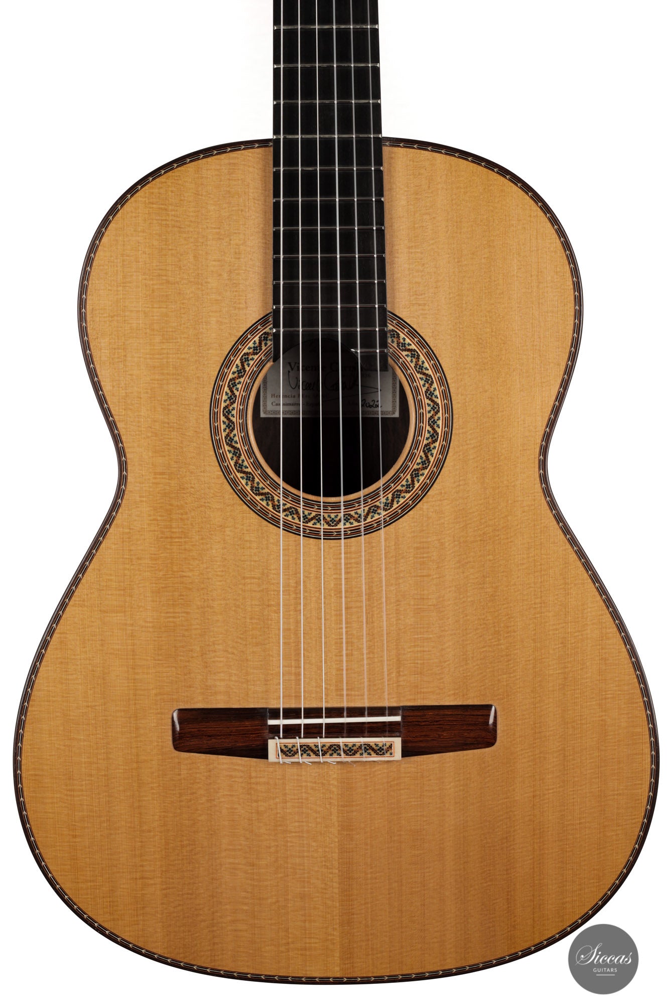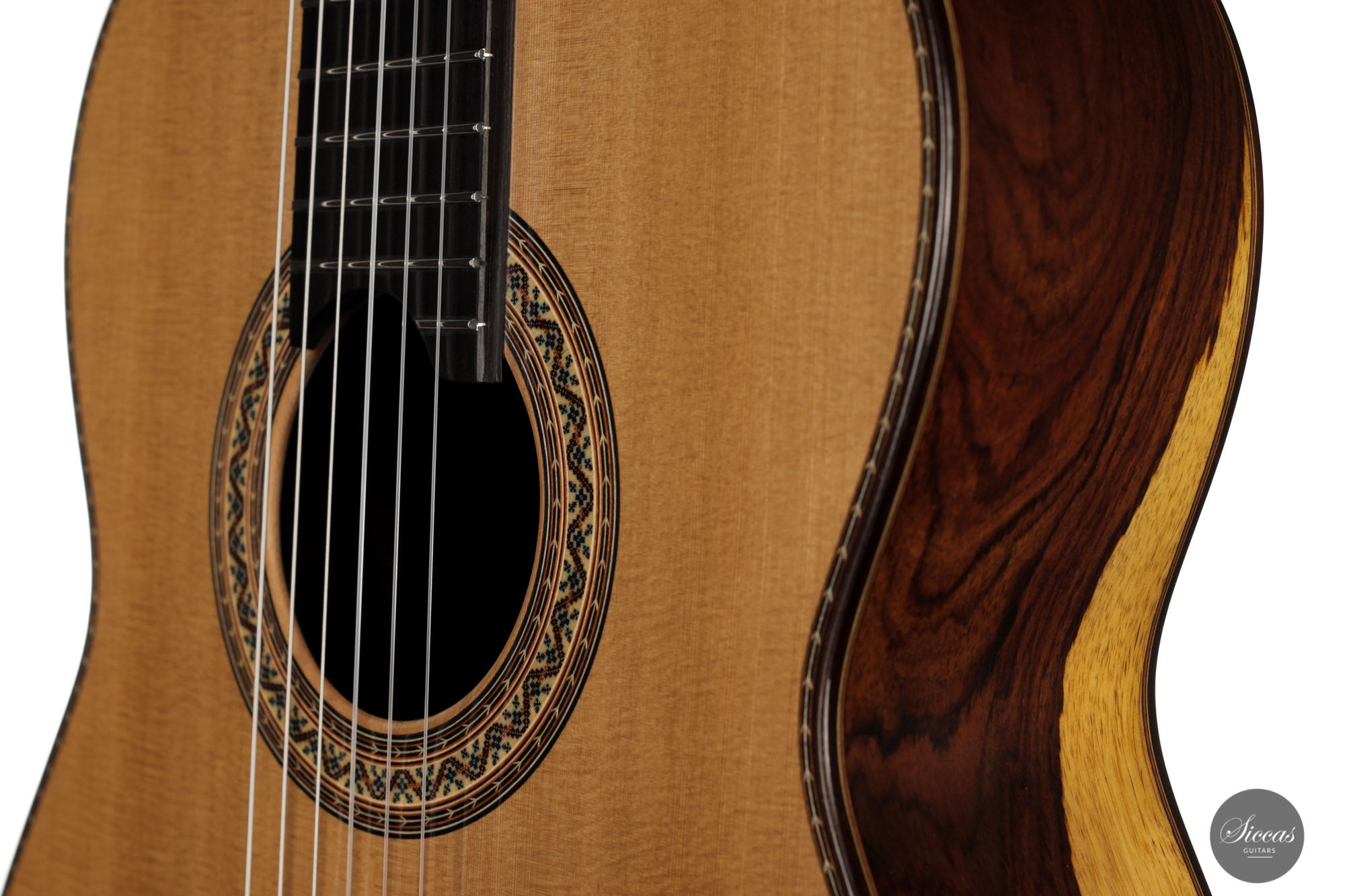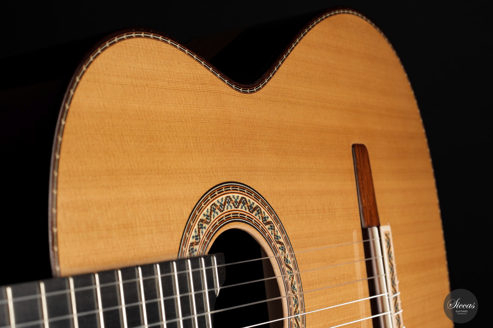 Diese wunderschöne Herencia Especial Palo Escrito wurde speziell für uns von Vicente Carrillo gefertigt und ist sein Spitzenmodell. Die Auswahl der Hölzer ist umwerfend und die ohne Carbonfasern dünn gearbeitete Zederndecke mit Lattice-Beleistung ist so reaktionsschnell, dass sie fast schon vom bloßen Ansehen vibriert. Das Volumen und die Klangpalette dieser Gitarre sind erstklassig. Ihr leicht dunkler und lieblich anmutender Klangcharakter verleiht ihr eine ansprechende und warme Persönlichkeit. Die Offenheit und Spontaneität jedes Tons, die beeindruckende Klangfülle, das angenehme Handling und der einzigartige Klangcharakter dieser Gitarre machen sie zu einem überaus fesselnden Instrument.