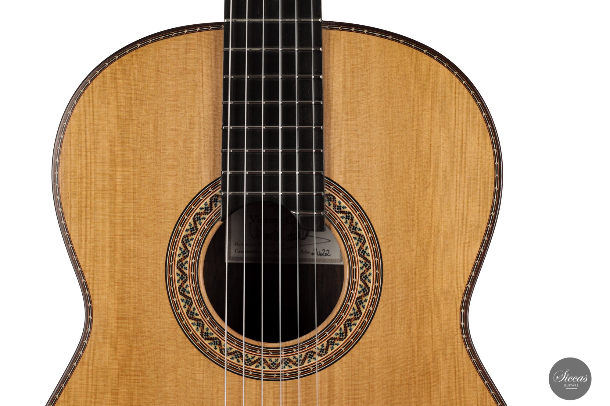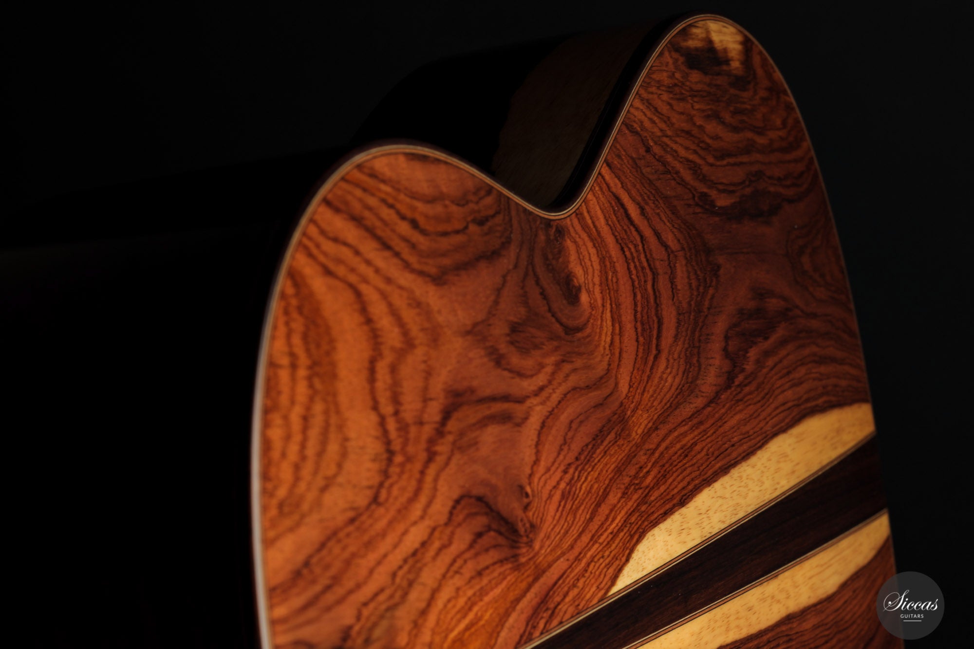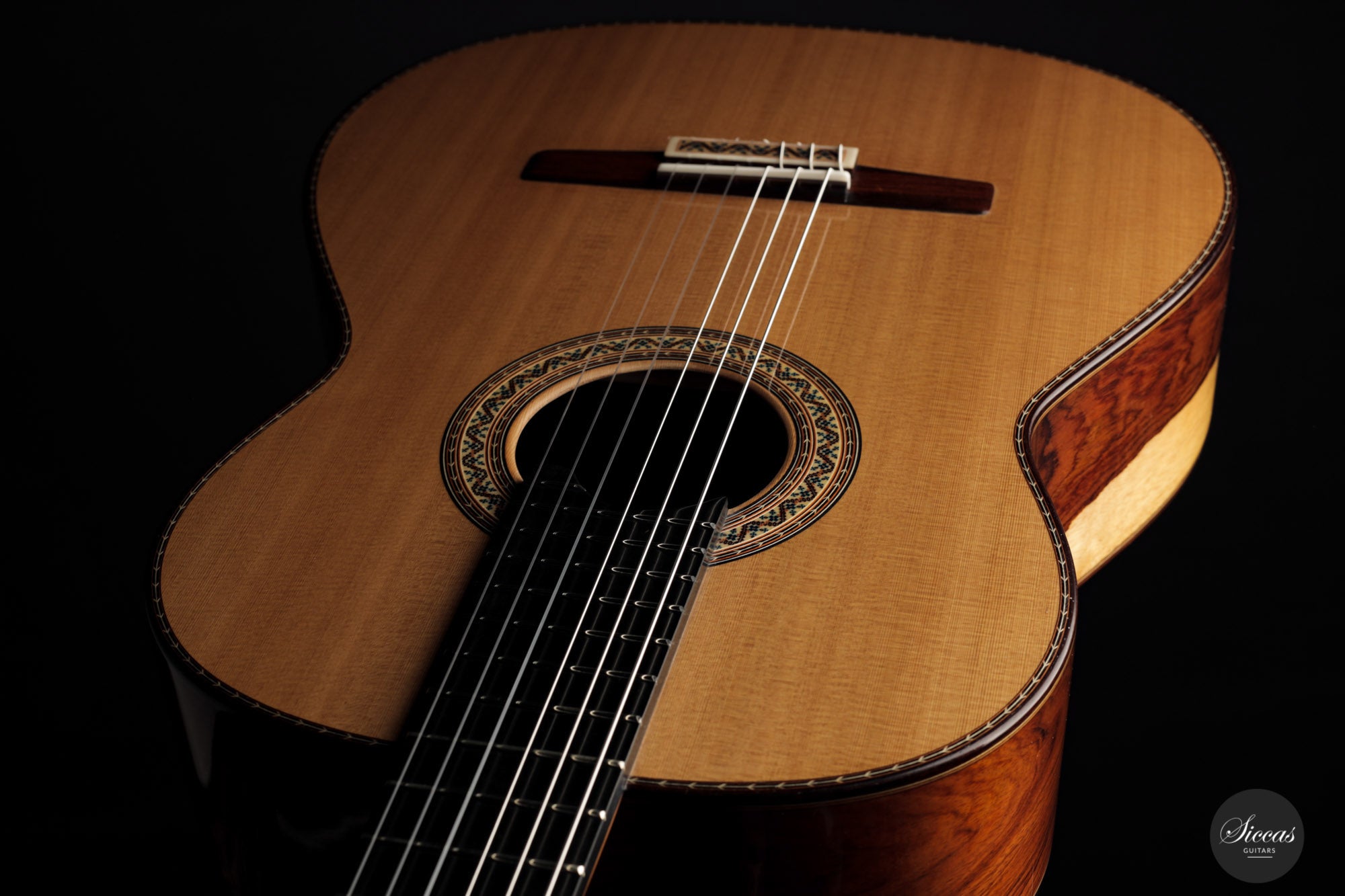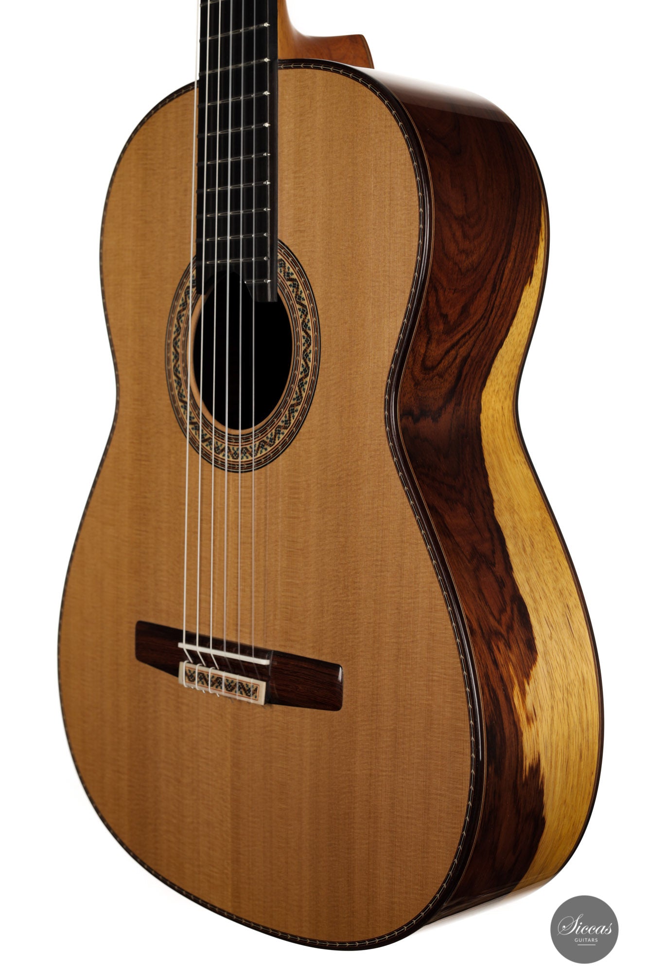 Diese wunderschöne Herencia Especial Palo Escrito wurde speziell für uns von Vicente Carrillo gefertigt und ist sein Spitzenmodell. Die Auswahl der Hölzer ist umwerfend und die ohne Carbonfasern dünn gearbeitete Zederndecke mit Lattice-Beleistung ist so reaktionsschnell, dass sie fast schon vom bloßen Ansehen vibriert. Das Volumen und die Klangpalette dieser Gitarre sind erstklassig. Ihr leicht dunkler und lieblich anmutender Klangcharakter verleiht ihr eine ansprechende und warme Persönlichkeit. Die Offenheit und Spontaneität jedes Tons, die beeindruckende Klangfülle, das angenehme Handling und der einzigartige Klangcharakter dieser Gitarre machen sie zu einem überaus fesselnden Instrument.