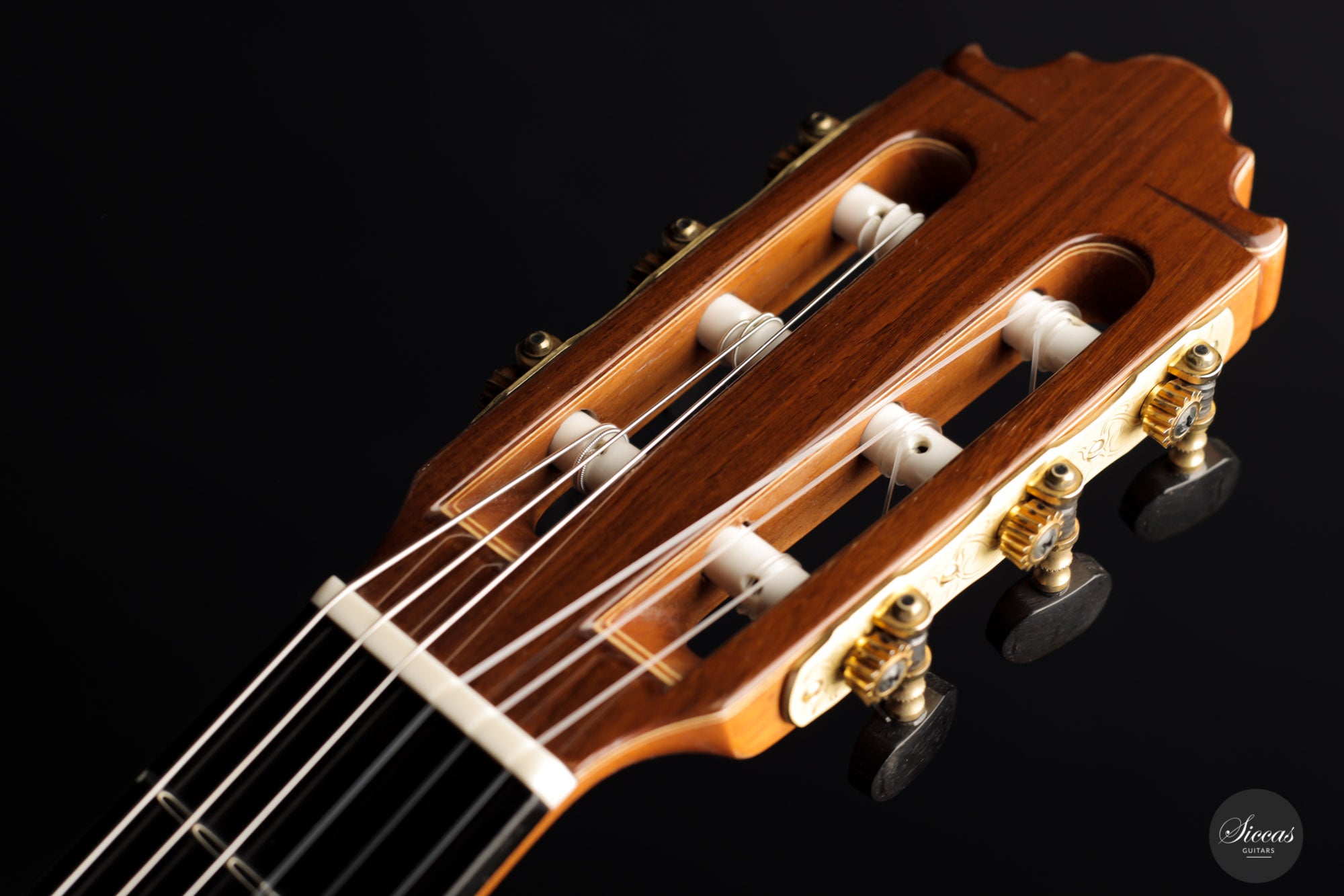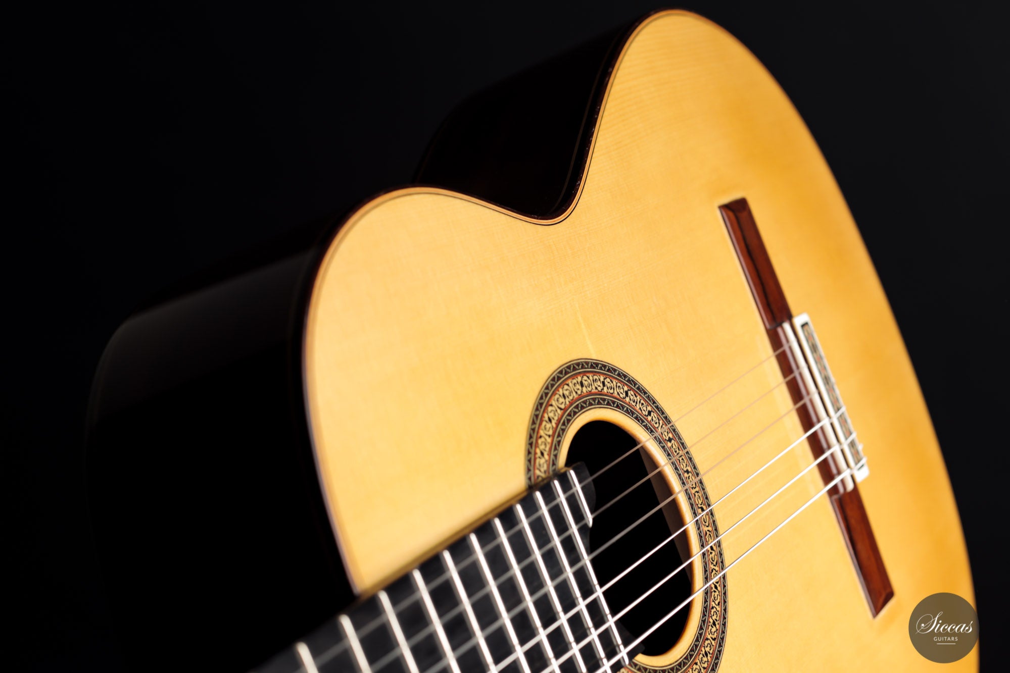 Die Decke dieser wunderschönen Gitarre ist aus feiner Fichte und Boden und Zargen aus Madagaskar-Palisander gefertigt, was ihr ein exotisches und edles Aussehen verleiht. Dank der exzellenten Ansprache bedarf es nur eines minimalen Aufwands in der rechten Hand, um maximale Projektion und Lautstärke zu erreichen. Die sehr komfortable 63-cm-Mensur bietet zudem eine hervorragende Bespielbarkeit und unterstützt den Gitarristen bei Streckungen und akrobatischen Fingersätzen. Der Klang dieser Gitarre ist sowohl sehr spontan und spielfreudig als auch äußerst warm und sanglich. Die Höhen haben eine ausgeprägte Personalität und einen abgerundeten, spanischen Klang. Die Bässe besitzen eine schöne Tiefe und bieten einen großen Raum für kraftvolle und samtige Mitten. Dank ihrer kürzeren Mensur ist sie außerdem ausgesprochen gut spielbar und insgesamt sowohl für den Gitarristen wie auch für das Publikum ein echter Hörgenuss.