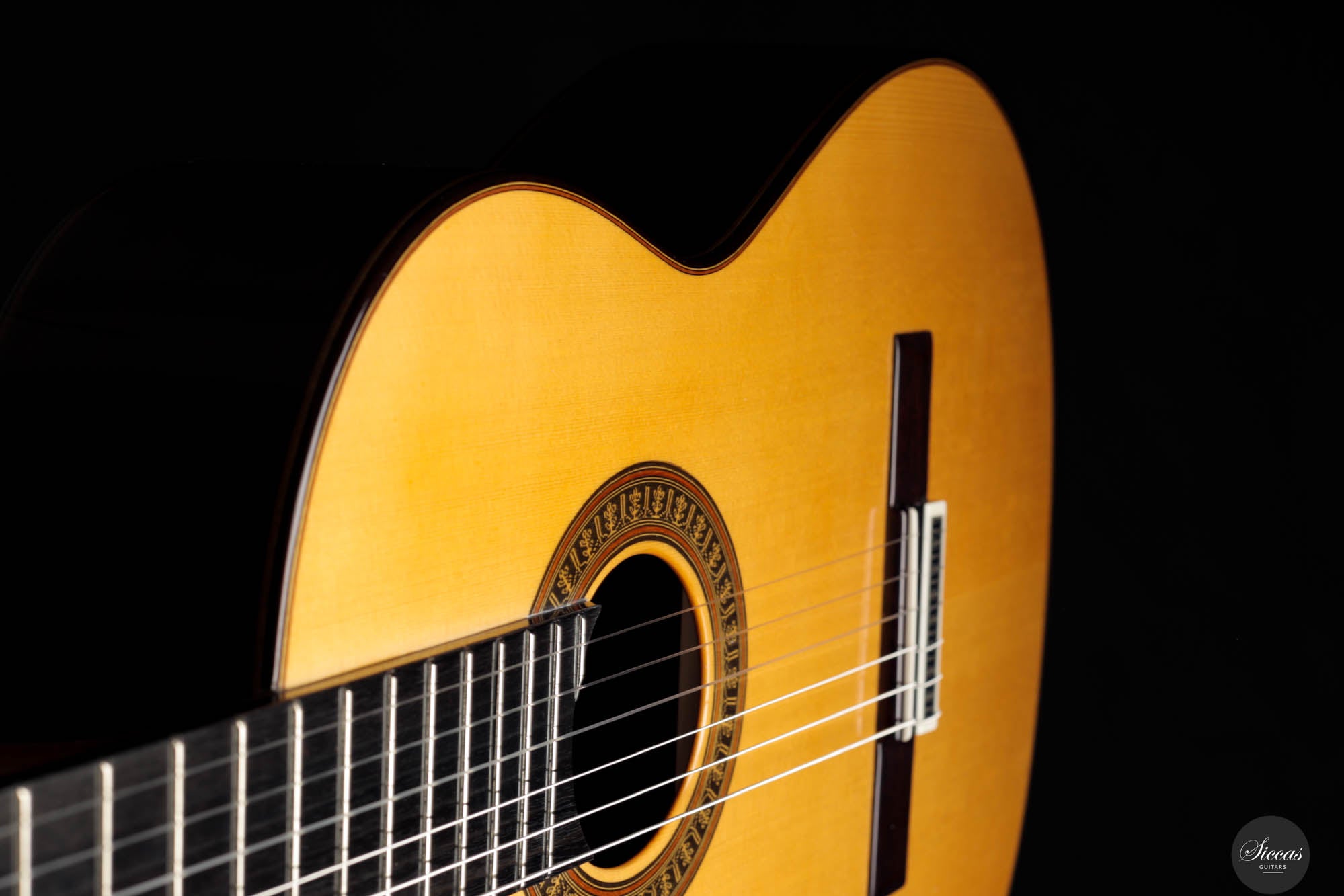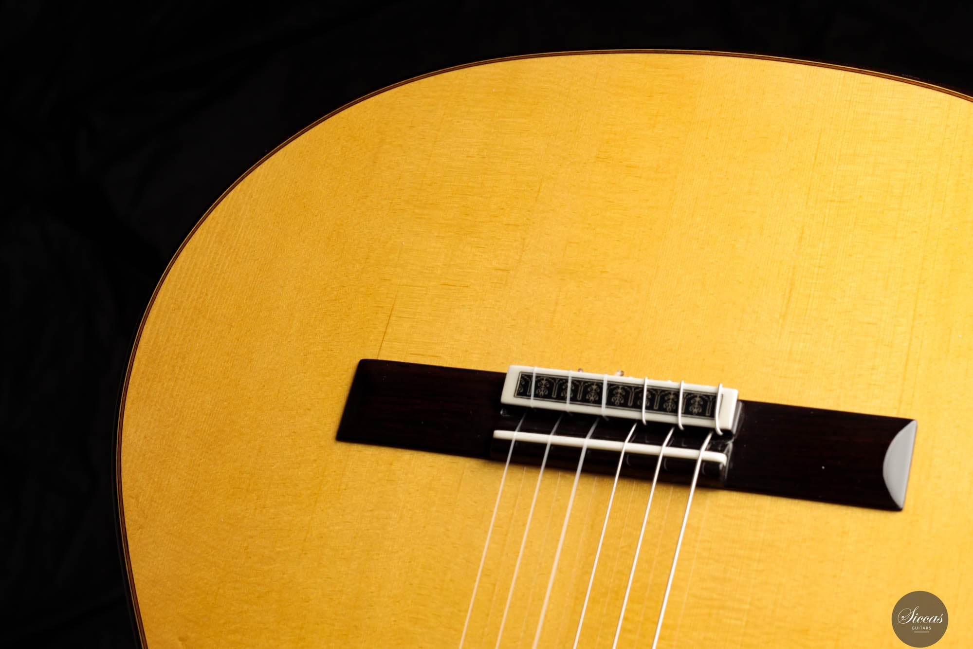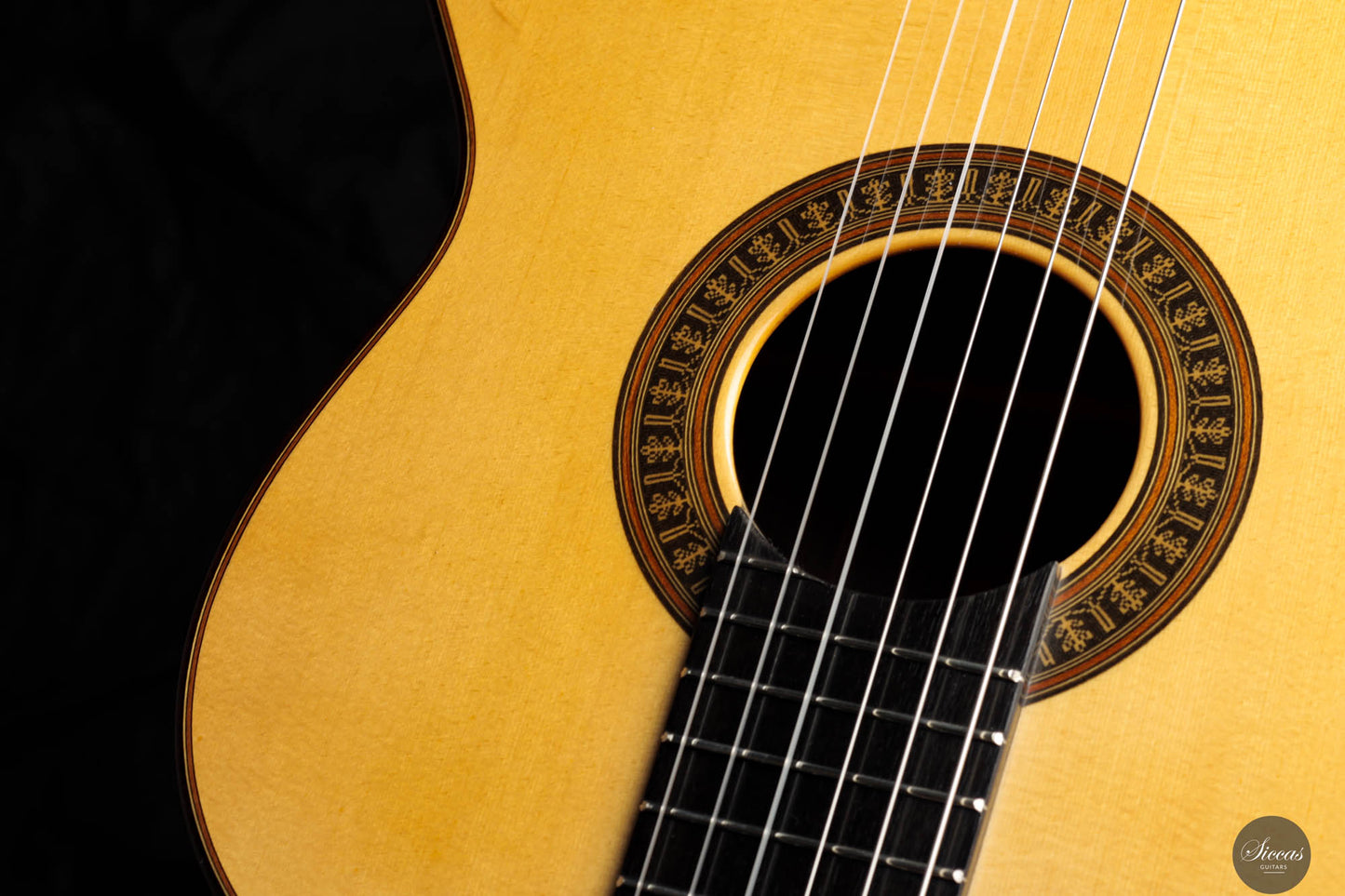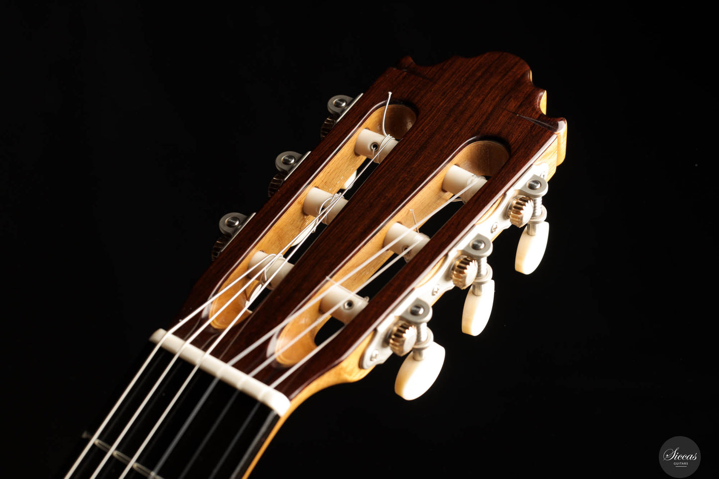 The "Herencia" model is Vicente Carrillo's most famous model and is an accurate benchmark of his distinguished luthiery skills. You will often see the Herencia on stage, in international competitions, or in your local music school in your teacher's hand. This guitar, an homage to the heritage left by his guitar makers' family, is a blend of tradition and modernity. It features a carbon-free lattice bracing made of spruce, which, combined with the spruce soundboard, provides a clear and precise sound. The thickness and darkness of the tone are striking, yet, a certain clarity makes the counterpoint effortless to follow. The sensitivity and mellowness of the trebles are particularly remarkable on this guitar, and the amount of emotion that the guitarist can carry with this instrument is exceptional.