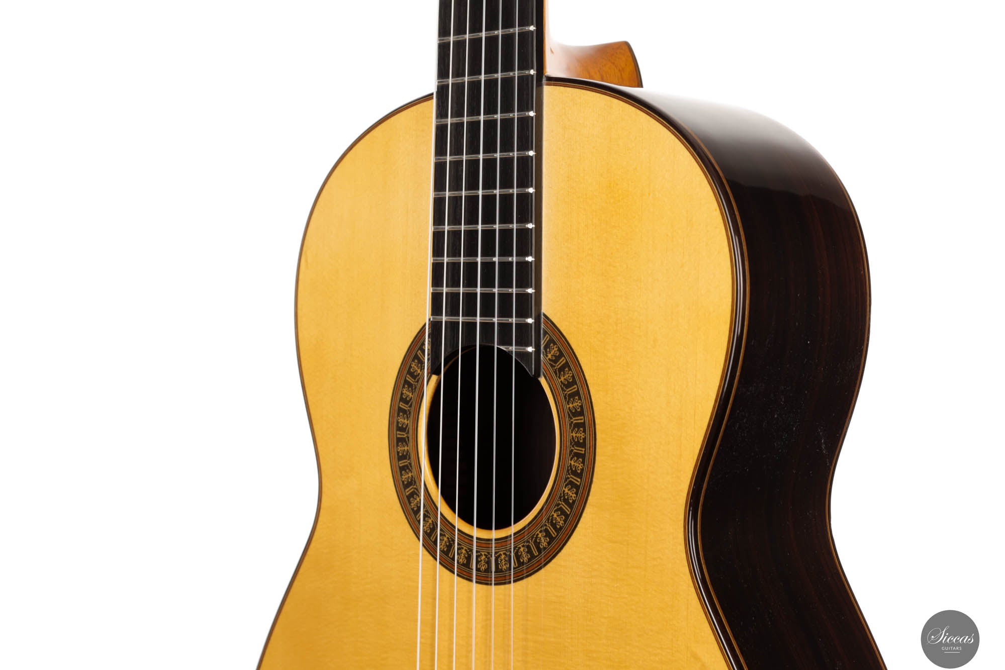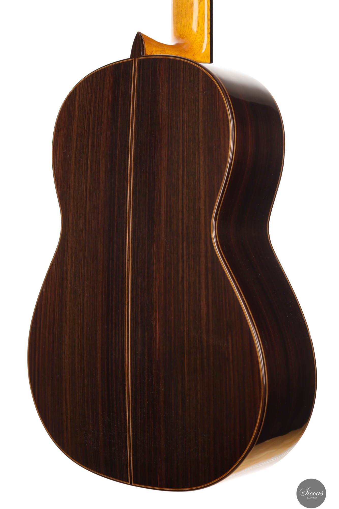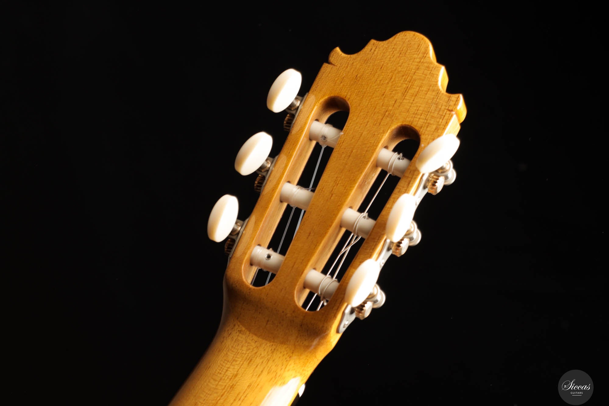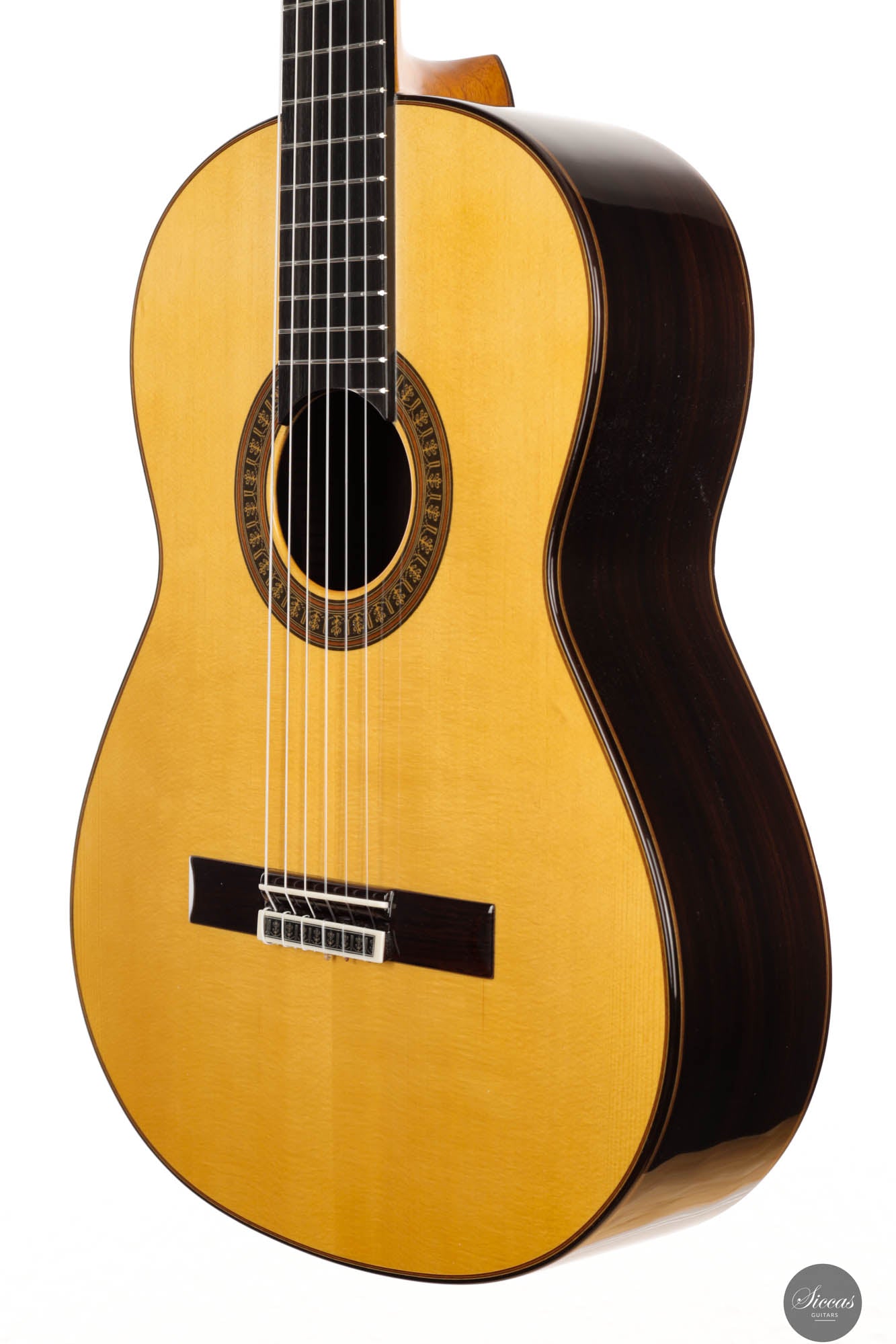 The "Herencia" model is Vicente Carrillo's most famous model and is an accurate benchmark of his distinguished luthiery skills. You will often see the Herencia on stage, in international competitions, or in your local music school in your teacher's hand. This guitar, an homage to the heritage left by his guitar makers' family, is a blend of tradition and modernity. It features a carbon-free lattice bracing made of spruce, which, combined with the spruce soundboard, provides a clear and precise sound. The thickness and darkness of the tone are striking, yet, a certain clarity makes the counterpoint effortless to follow. The sensitivity and mellowness of the trebles are particularly remarkable on this guitar, and the amount of emotion that the guitarist can carry with this instrument is exceptional.