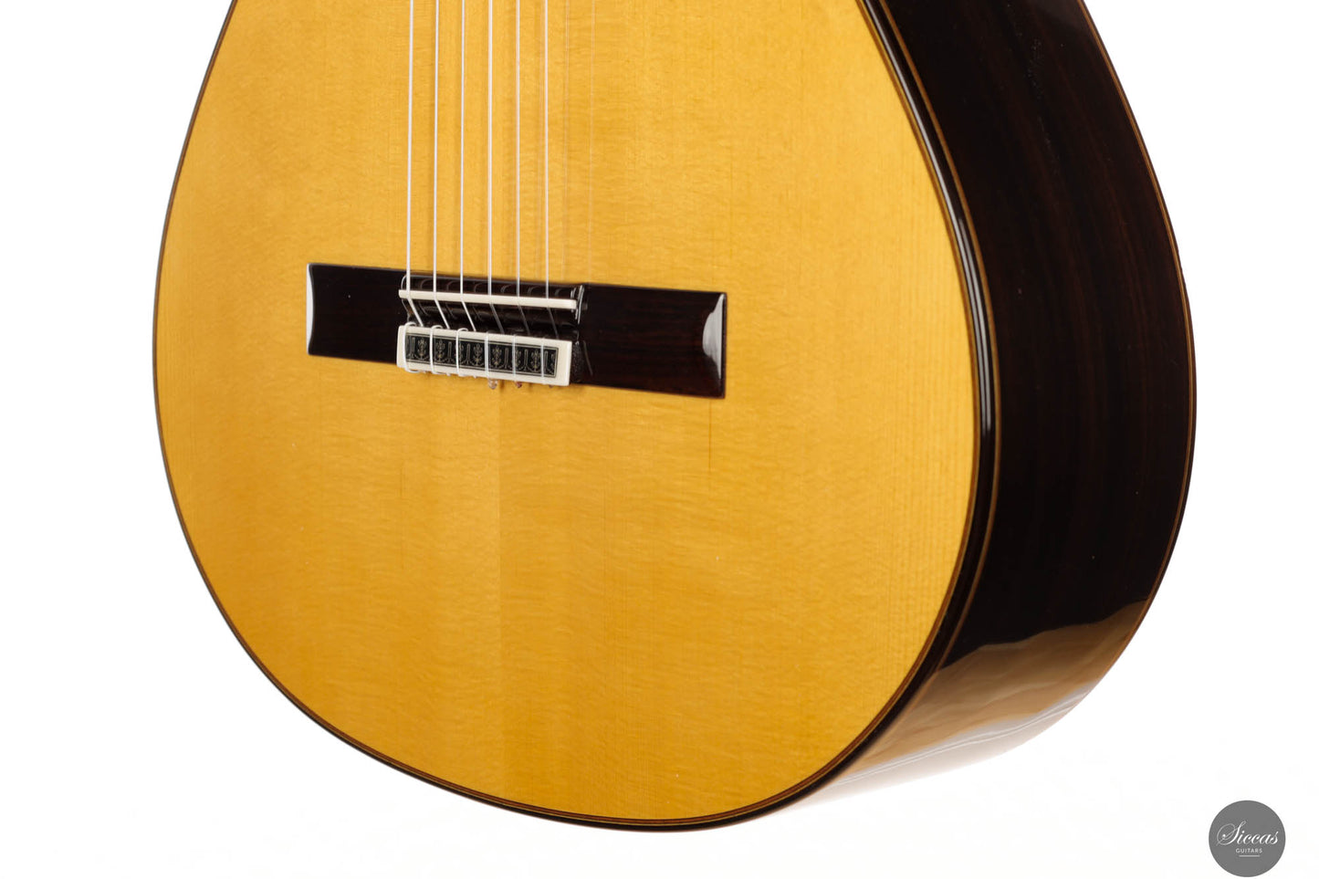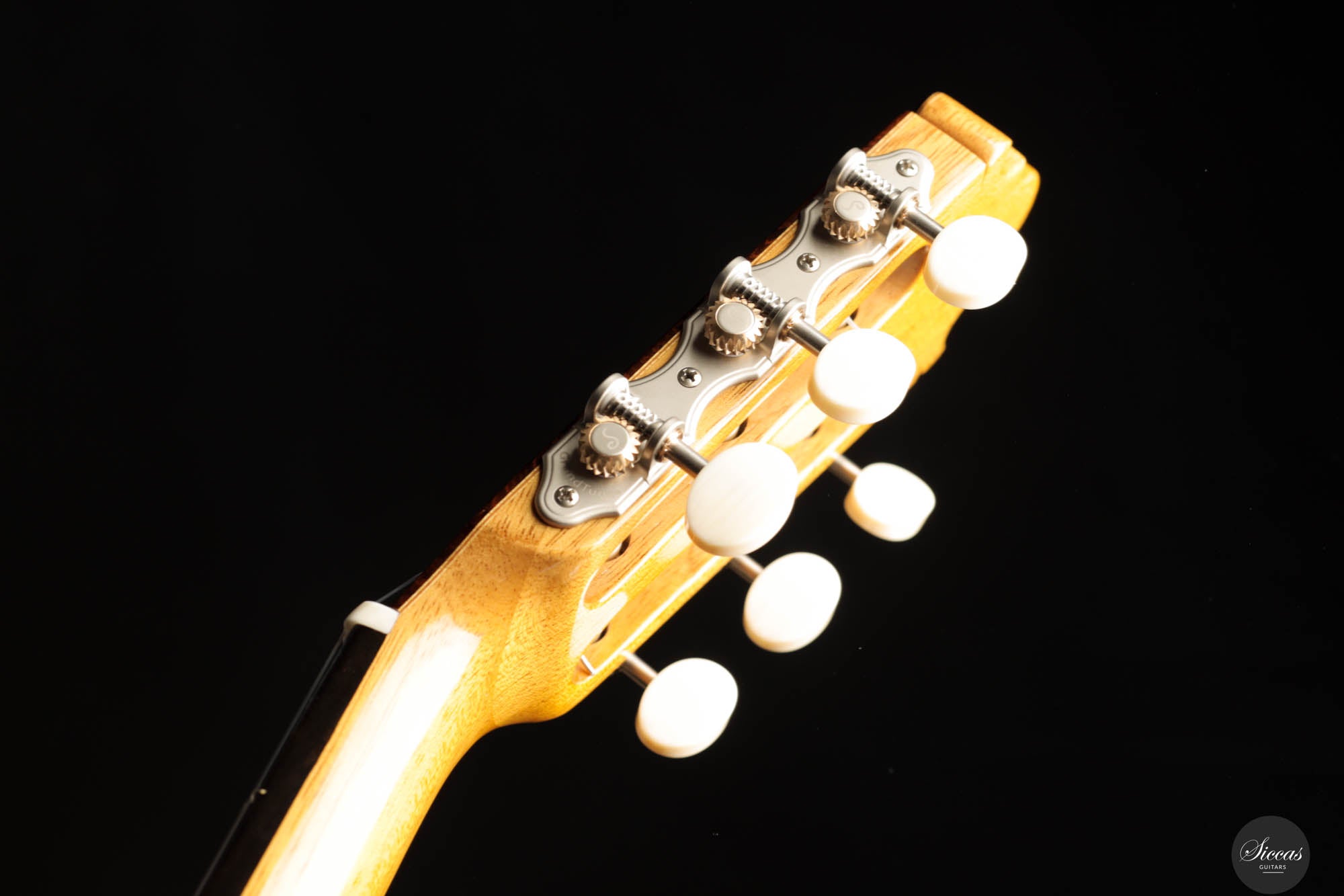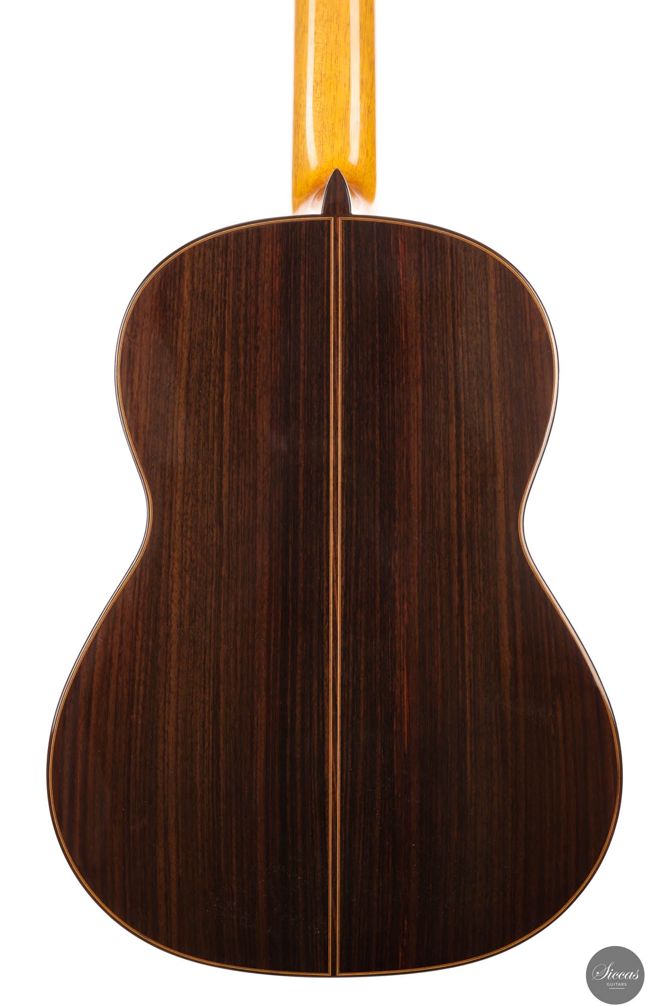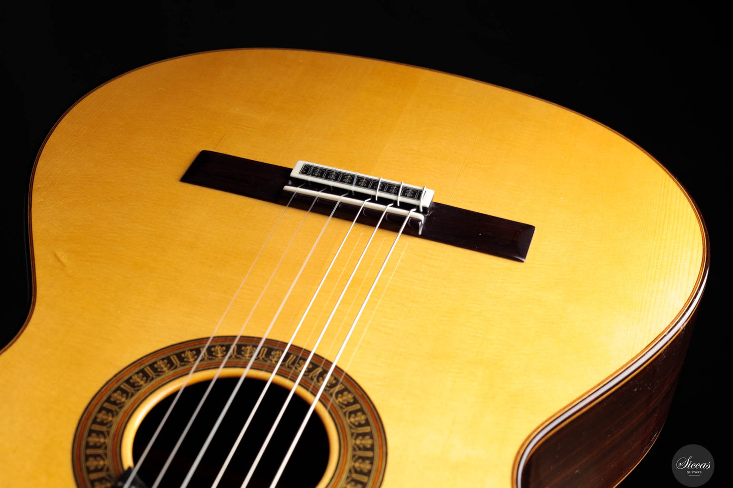 The "Herencia" model is Vicente Carrillo's most famous model and is an accurate benchmark of his distinguished luthiery skills. You will often see the Herencia on stage, in international competitions, or in your local music school in your teacher's hand. This guitar, an homage to the heritage left by his guitar makers' family, is a blend of tradition and modernity. It features a carbon-free lattice bracing made of spruce, which, combined with the spruce soundboard, provides a clear and precise sound. The thickness and darkness of the tone are striking, yet, a certain clarity makes the counterpoint effortless to follow. The sensitivity and mellowness of the trebles are particularly remarkable on this guitar, and the amount of emotion that the guitarist can carry with this instrument is exceptional.