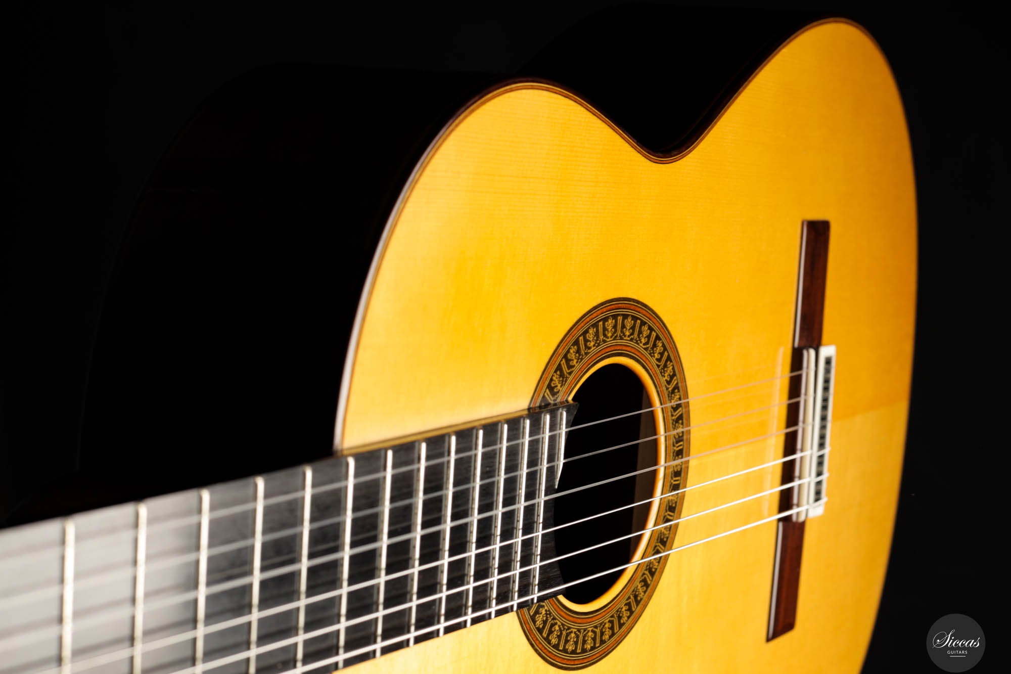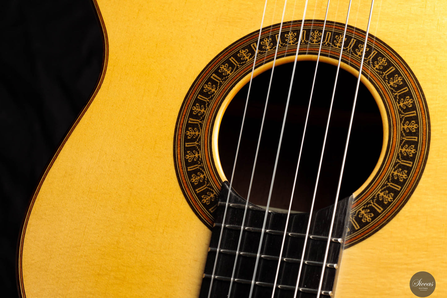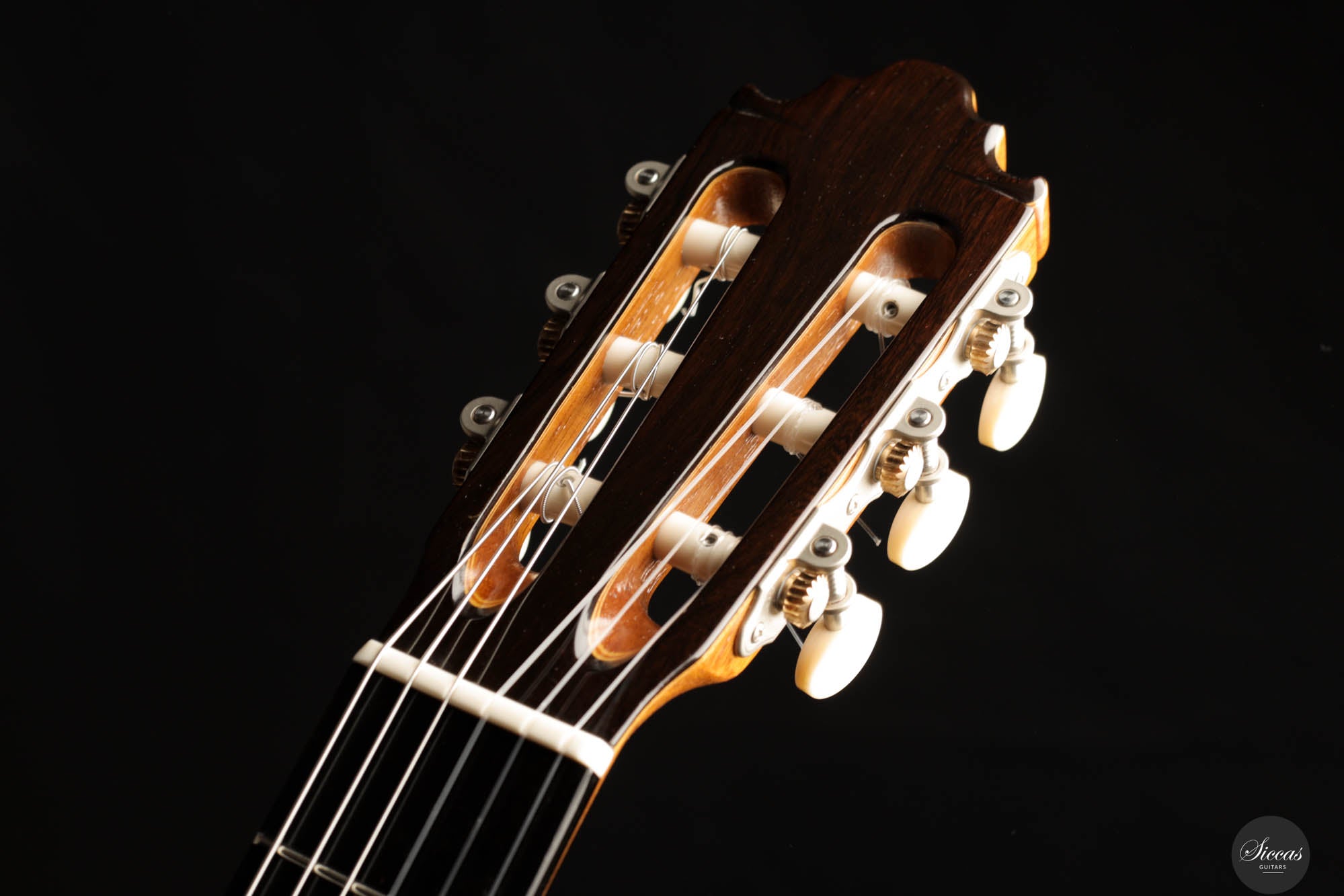 Das „Herencia“-Modell ist Vicente Carrillos berühmtestes Modell und ein genaues Maß für seine herausragenden Fähigkeiten im Gitarrenbau. Häufig sieht man die Herencia auf Bühnen, in internationalen Wettbewerben oder in den Händen Ihres Lehrers in Ihrer örtlichen Musikschule. Diese Gitarre, eine Hommage an das Erbe, das seine Familie von Gitarrenbauern hinterlassen hat, ist eine Mischung aus Tradition und Moderne. Sie verfügt über ein kohlenstofffreies Gitterleistensystem aus Fichte, das in Kombination mit der Fichtenschalldecke einen klaren und präzisen Klang bietet. Die Dicke und Dunkelheit des Tons sind beeindruckend, und doch ermöglicht eine gewisse Klarheit, dass der Kontrapunkt mühelos verfolgt werden kann. Die Sensibilität und Weichheit der Höhen sind bei dieser Gitarre besonders bemerkenswert, und die Menge an Emotion, die der Gitarrist mit diesem Instrument transportieren kann, ist außergewöhnlich.