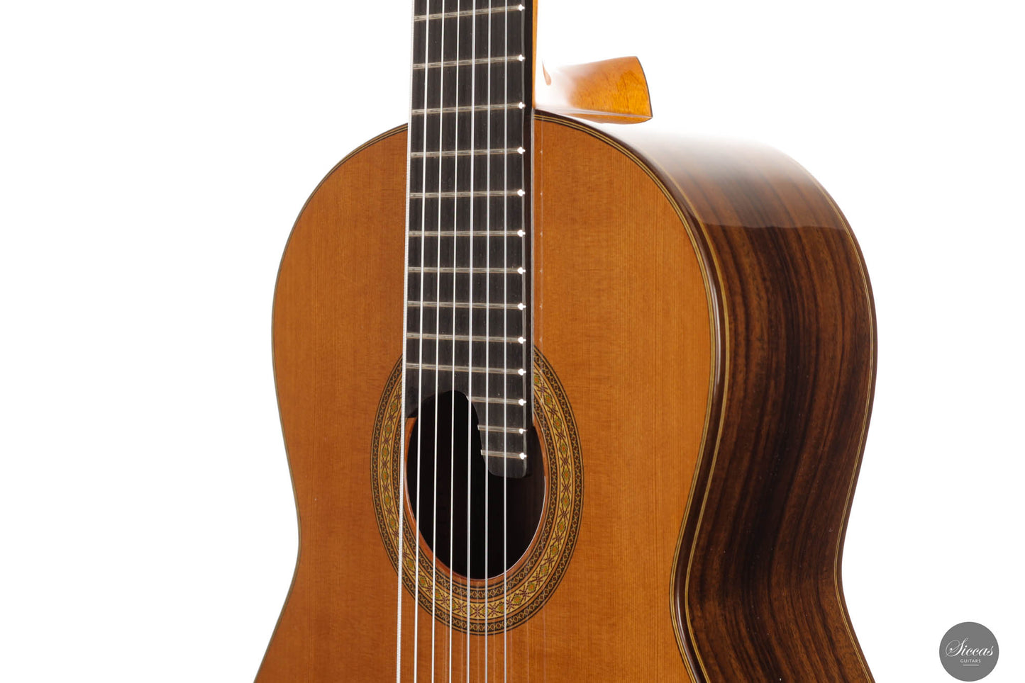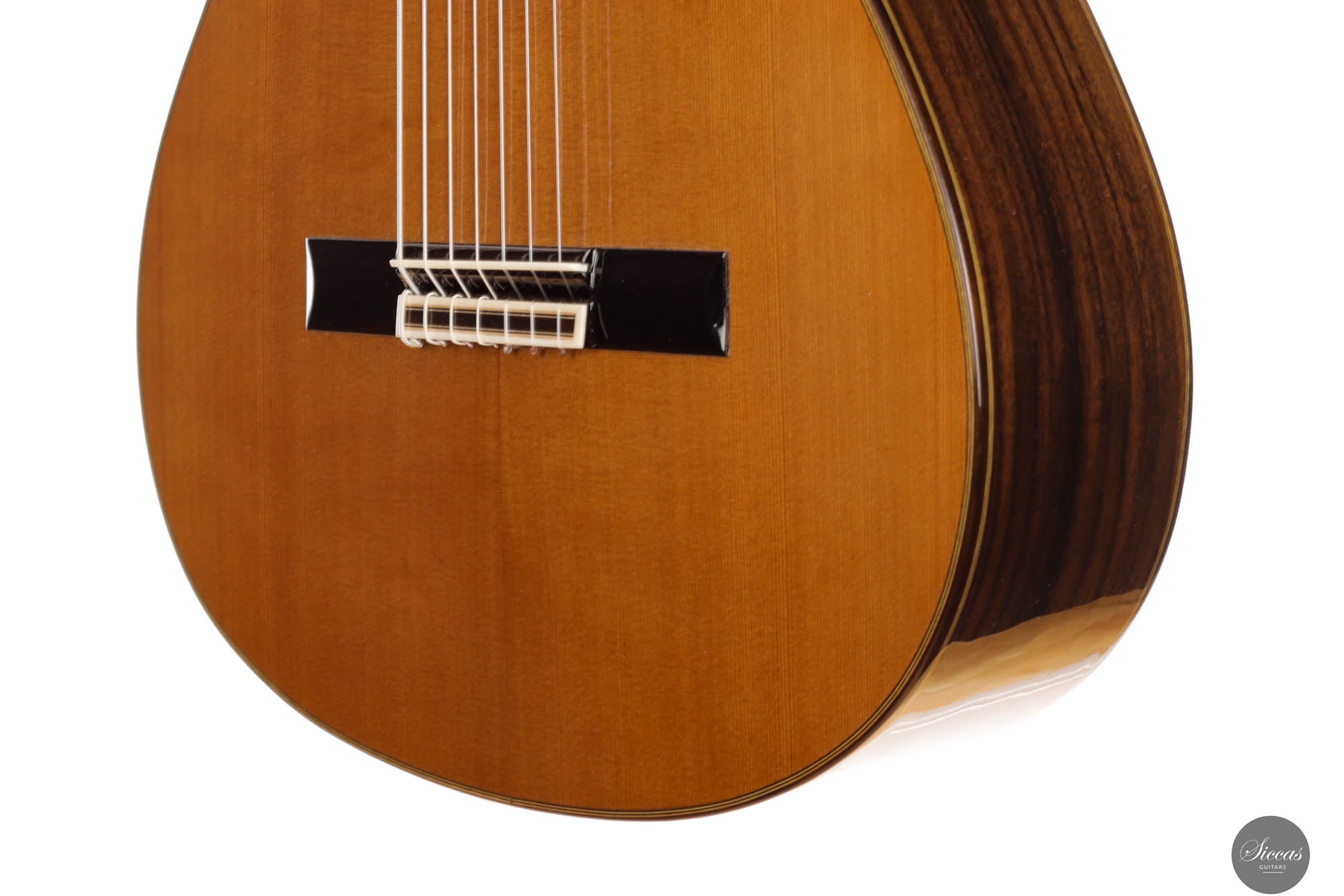 Dieses faszienierende Modell besticht durch seine Zederndecke sowie Boden und Zargen aus indischem Palisander. Diese edlen Materialien sorgen für einen klar definierten und kraftvollen Klang, selbst bei moderatem Anschlag. Der Hals des Instruments ist trotz seiner Breite und des etwas schwereren Kopfes, der Platz für die siebte Saite bietet, sehr komfortabel und die Gitarre hervorragend ausbalanciert.