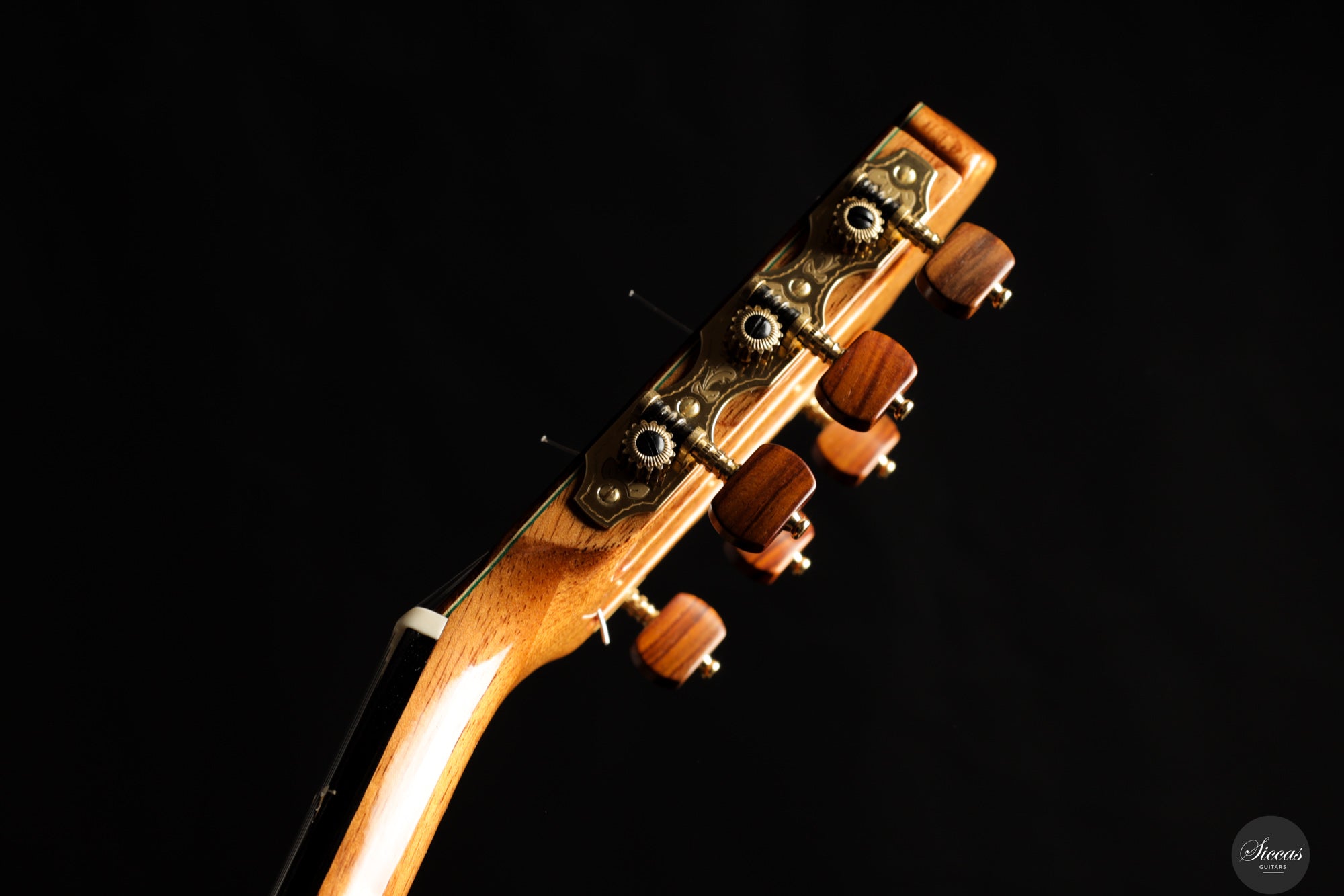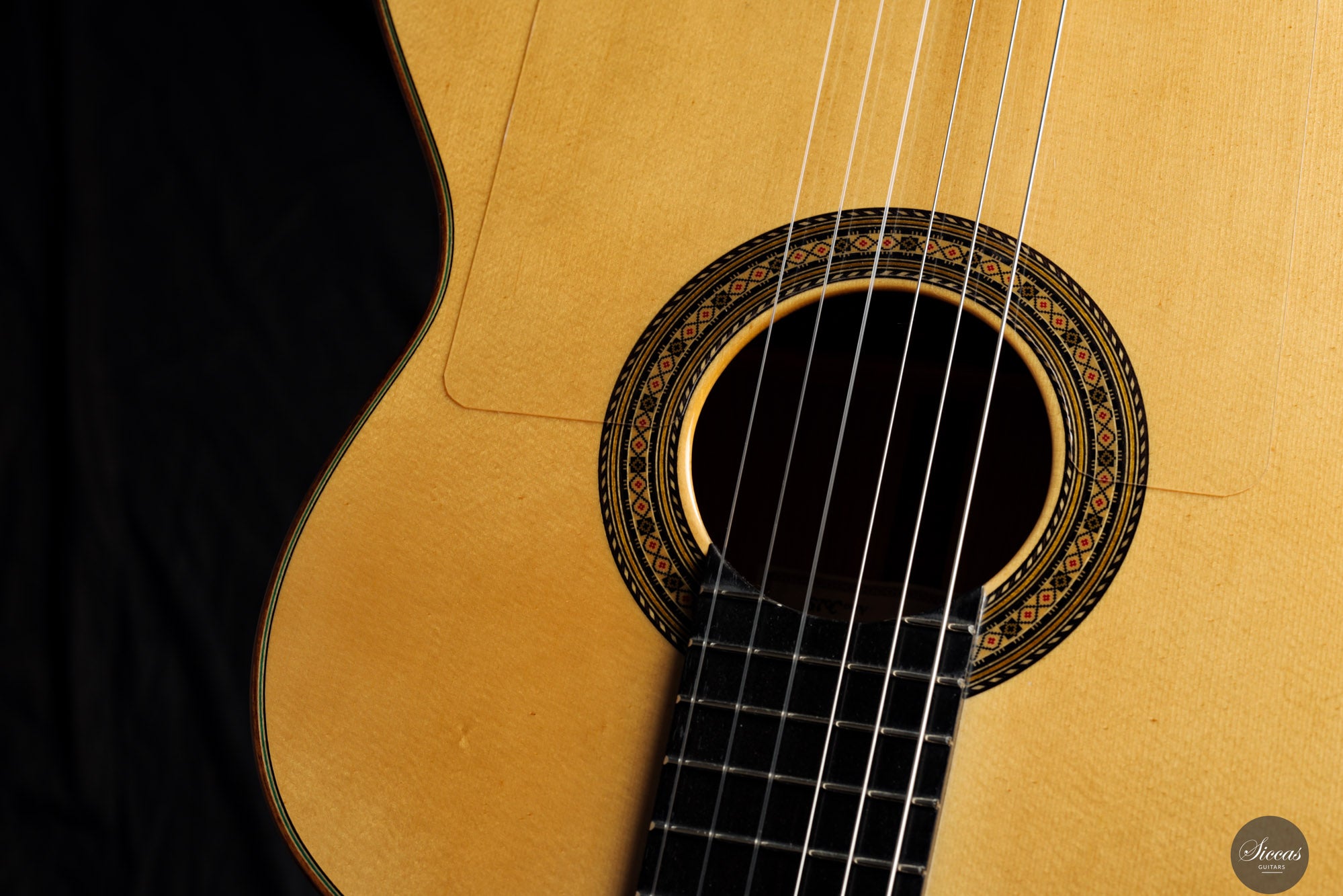 Diese 2025 gebaute Flamenca Blanca von Vicente Carrillo vereint den klanglichen Charakter traditioneller Flamenco-Gitarren mit einem konstruktiven Ansatz, der in dieser Kategorie nur selten anzutreffen ist: einem lattice-verstrebten Deckenaufbau. In Kombination mit einer Fichtendecke und optisch auffällig gemasertem spanischem Zypressenholz verleiht diese Bauweise dem Instrument eine erhöhte Tragfähigkeit und farblich reichere Klangstruktur – ohne dabei die schnelle Ansprache und den trockenen Grundcharakter des Flamenco zu verlieren. Die Diskantlagen sind direkt und klar, während die Bässe straff und artikuliert bleiben und feinste rhythmische Akzente unterstützen. Die auffällige Maserung der exotisch geschnittenen Zypresse unterstreicht den individuellen Charakter dieses Instruments, das sich bewusst zwischen Tradition und Moderne positioniert. Eine Flamencogitarre mit erweitertem Ausdrucksspektrum – für Bühne, Studio und Konzertsaal gleichermaßen geeignet.