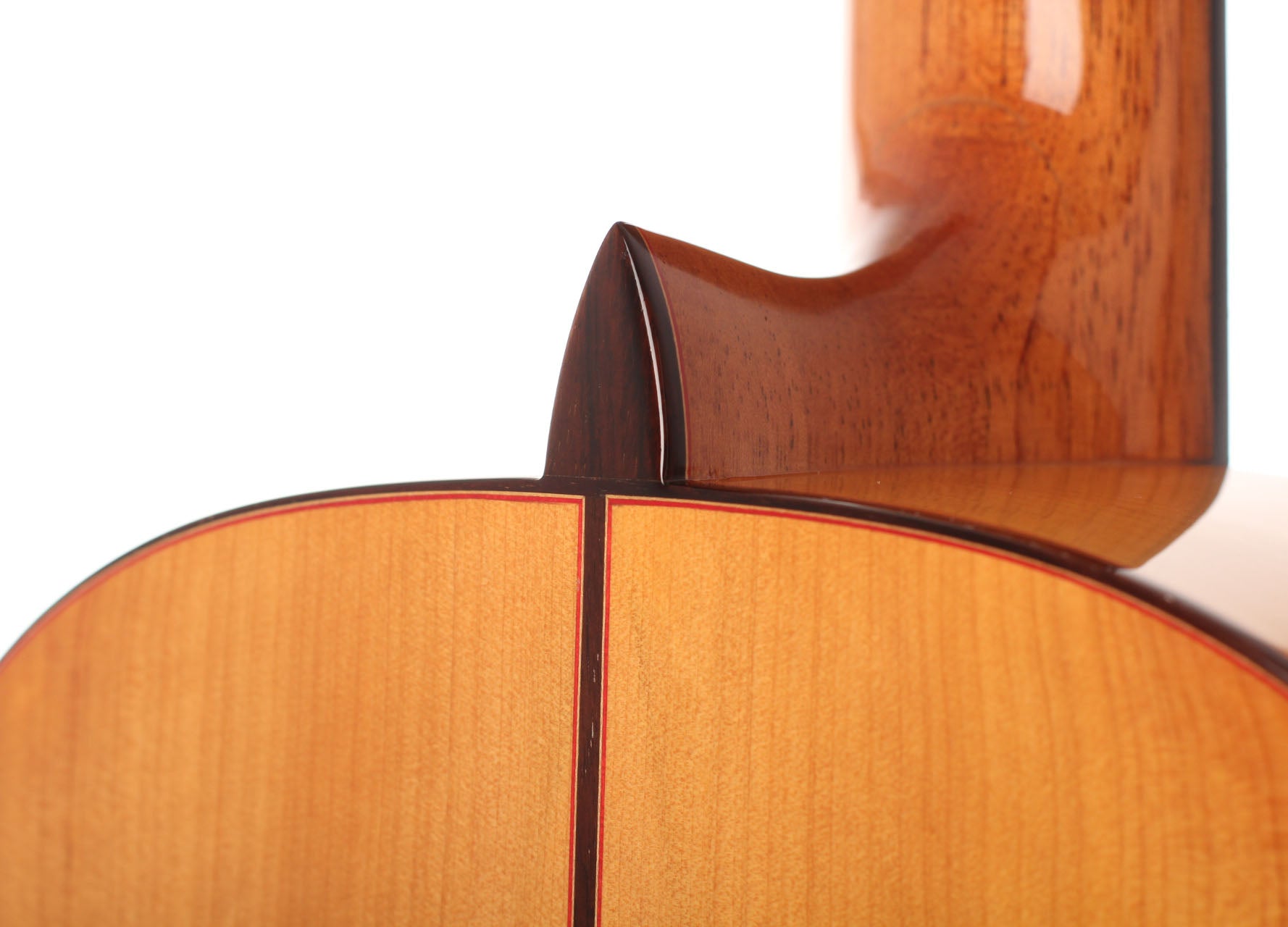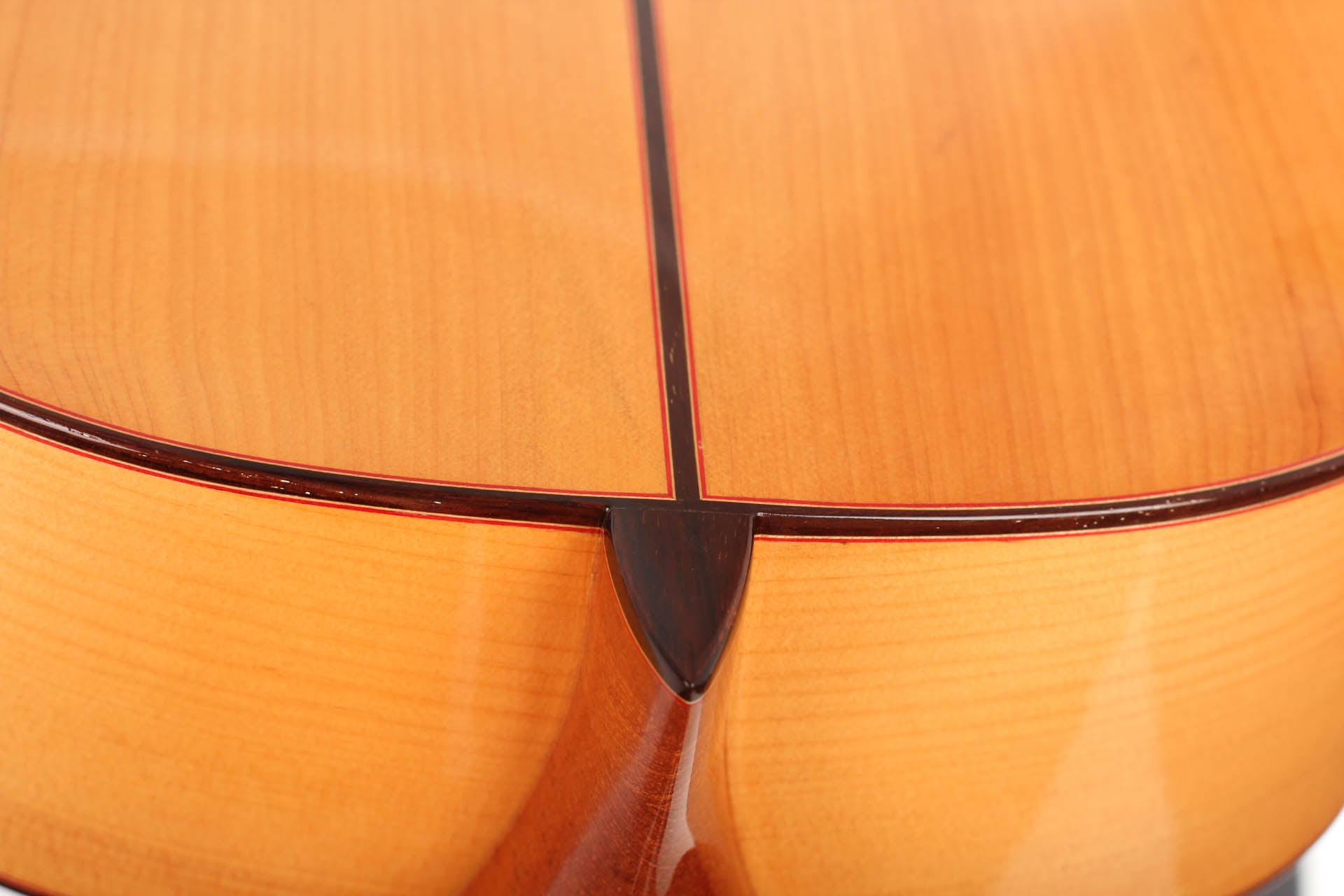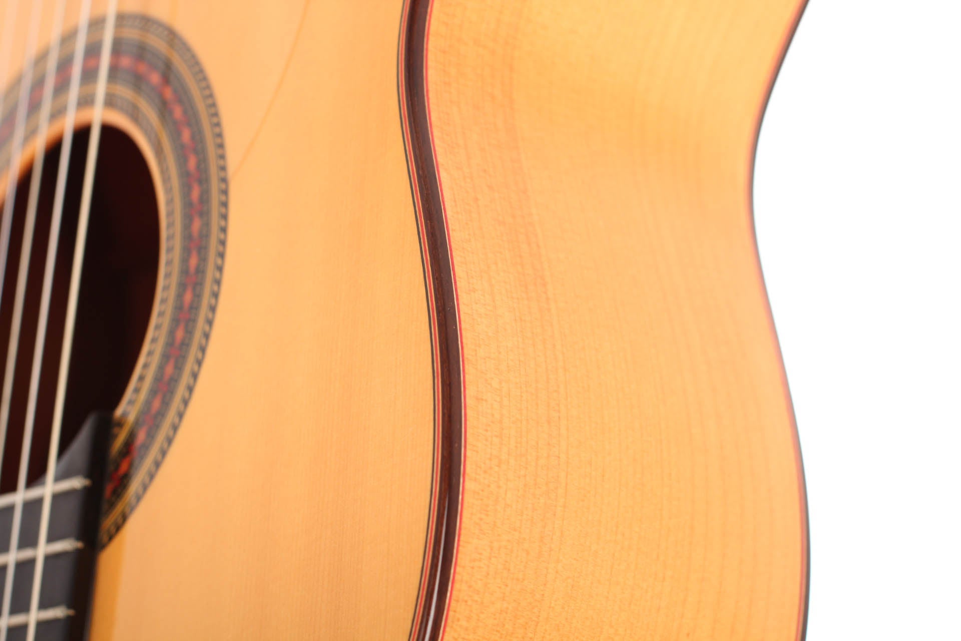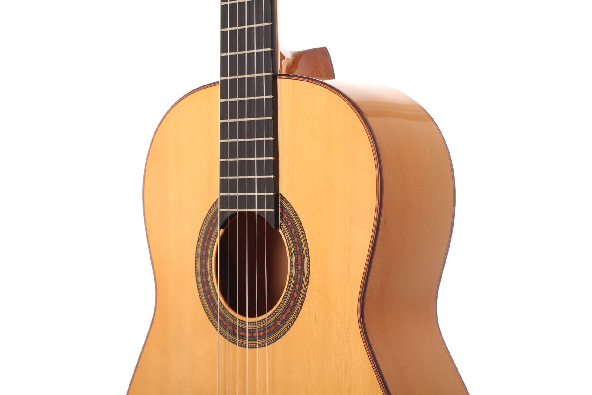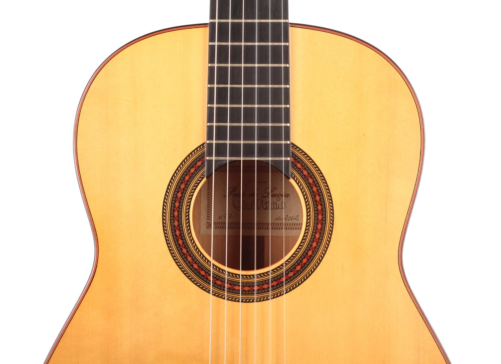Diese sehr schöne Flamencogitarre von Vicente Carrillo wurde 2002 in Zusammenarbeit mit Paco de Lucia und seinem Bruder Ramon entwickelt. Es handelt sich um das gleiche Modell, das auf der CD "Cositas Buenas" von Paco de Lucia zu hören ist. Die Decke ist aus bester Fichte gefertigt. Boden und Zargen sind aus feiner Zypresse. Die Gitarre ist leicht zu spielen und hat einen hellen und gleichzeitig kräftigen Klang. Die Mechaniken sind von Fustero. Ein Hartschalenkoffer ist inklusive.