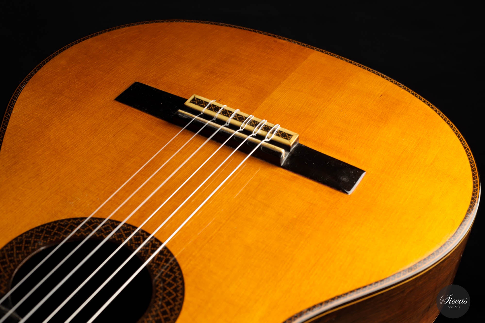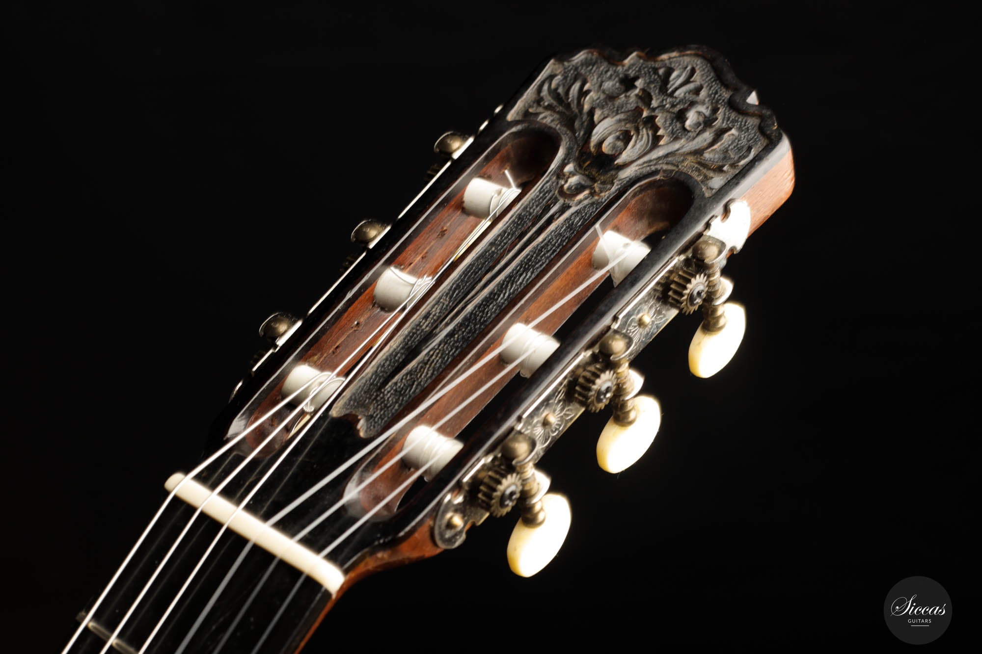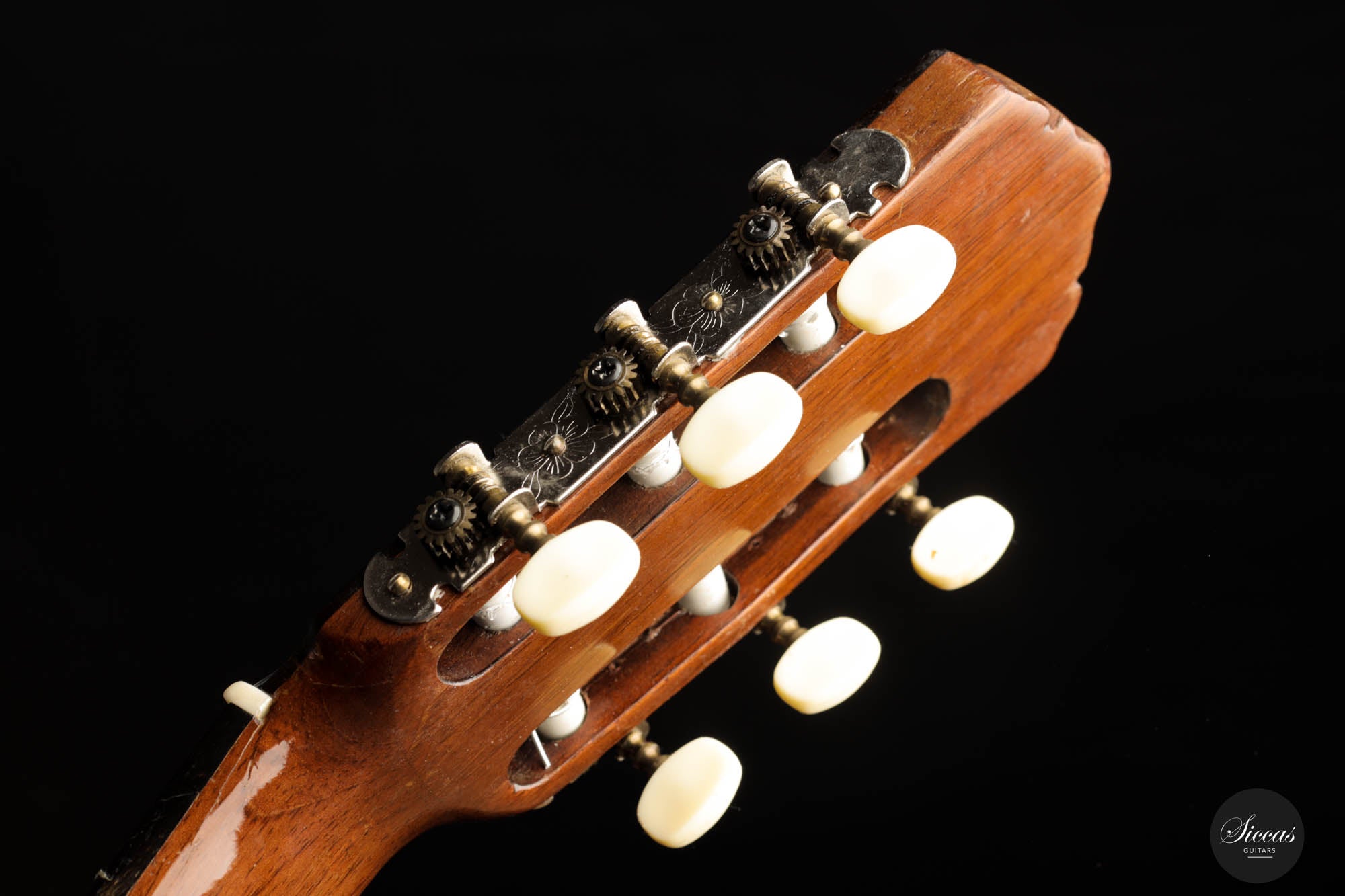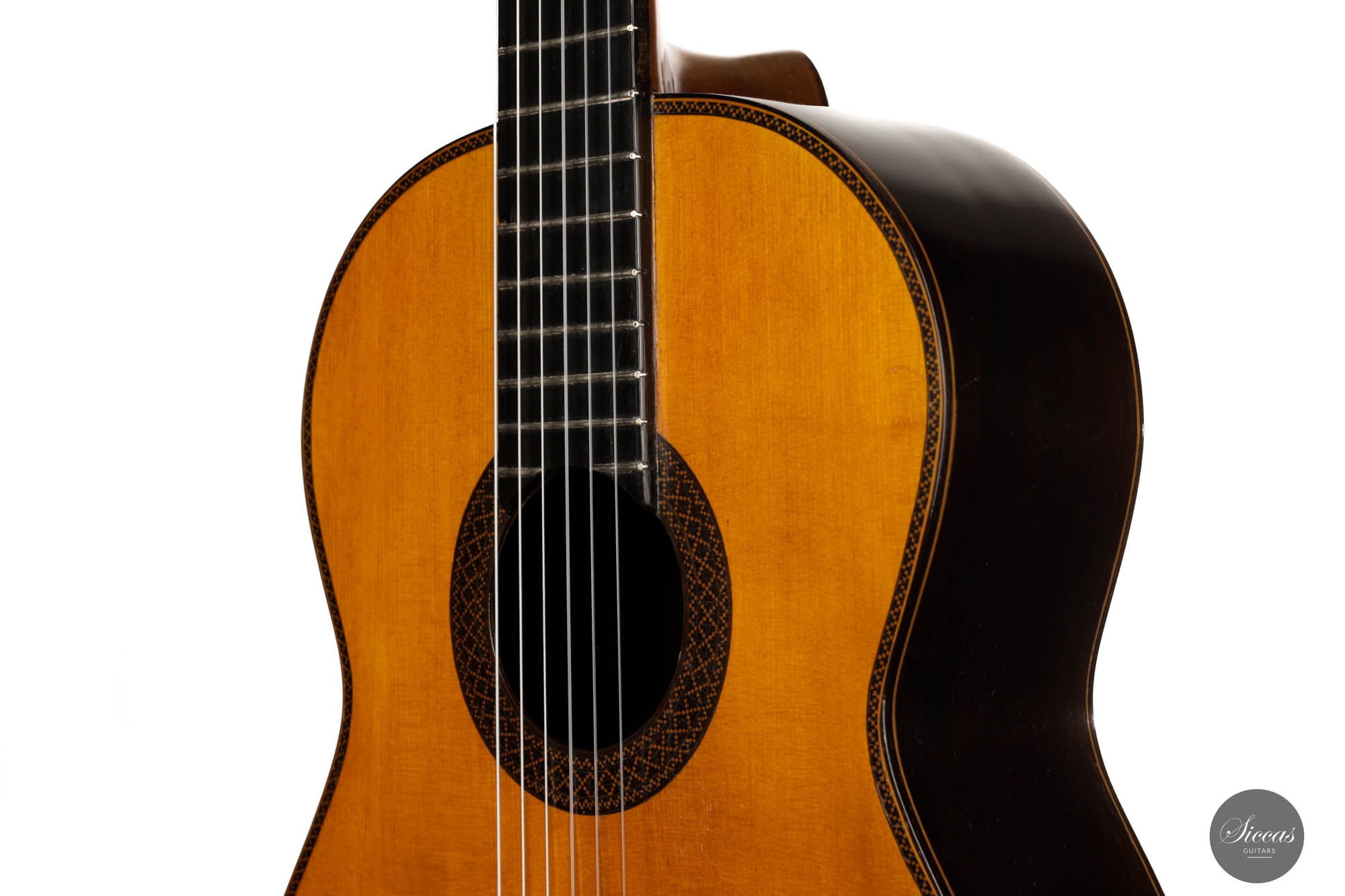 This wonderful guitar, built in 1955, with the number 142, is an absolute masterpiece. It is richly decorated with mosaic inlays, an ornate and elegant rosette, an elaborate tie block, a magnificent set of Brazilian rosewood, and a beautifully carved headstock. Rather than being a standard instrument from Cherubito's workshop, this is instead one that he built specifically for a good friend who owned and played it for almost 70 years to the present day. Its condition is excellent, with only minor playing signs, a thoroughly repaired hairline crack on the back, two typical repaired cracks on the top on both sides of the fingerboard, and a repair on the head. The sound of this guitar is open all the way through and has the typical 1950s vintage sound found only on those original instruments that have been continuously played and cared for.