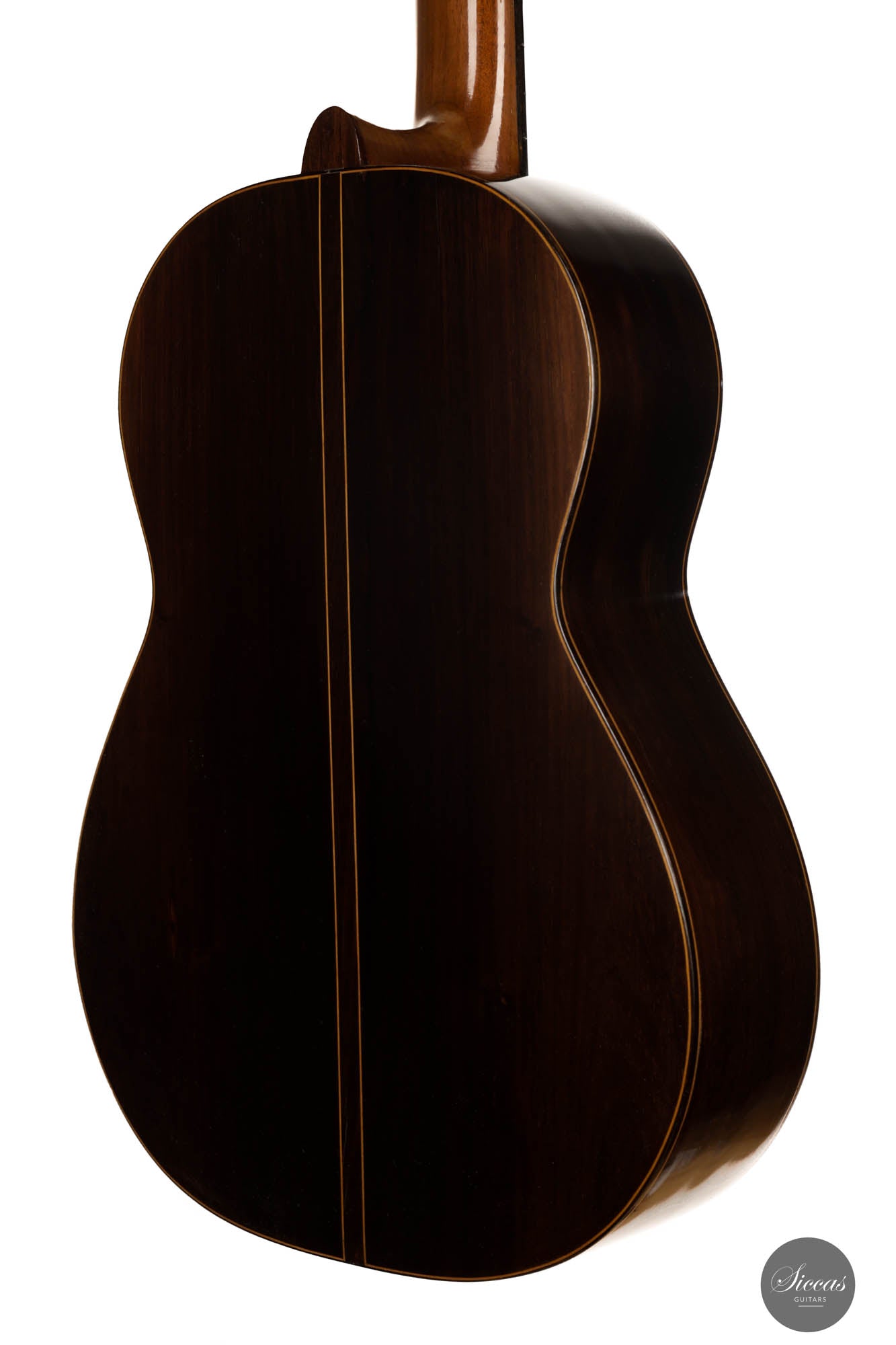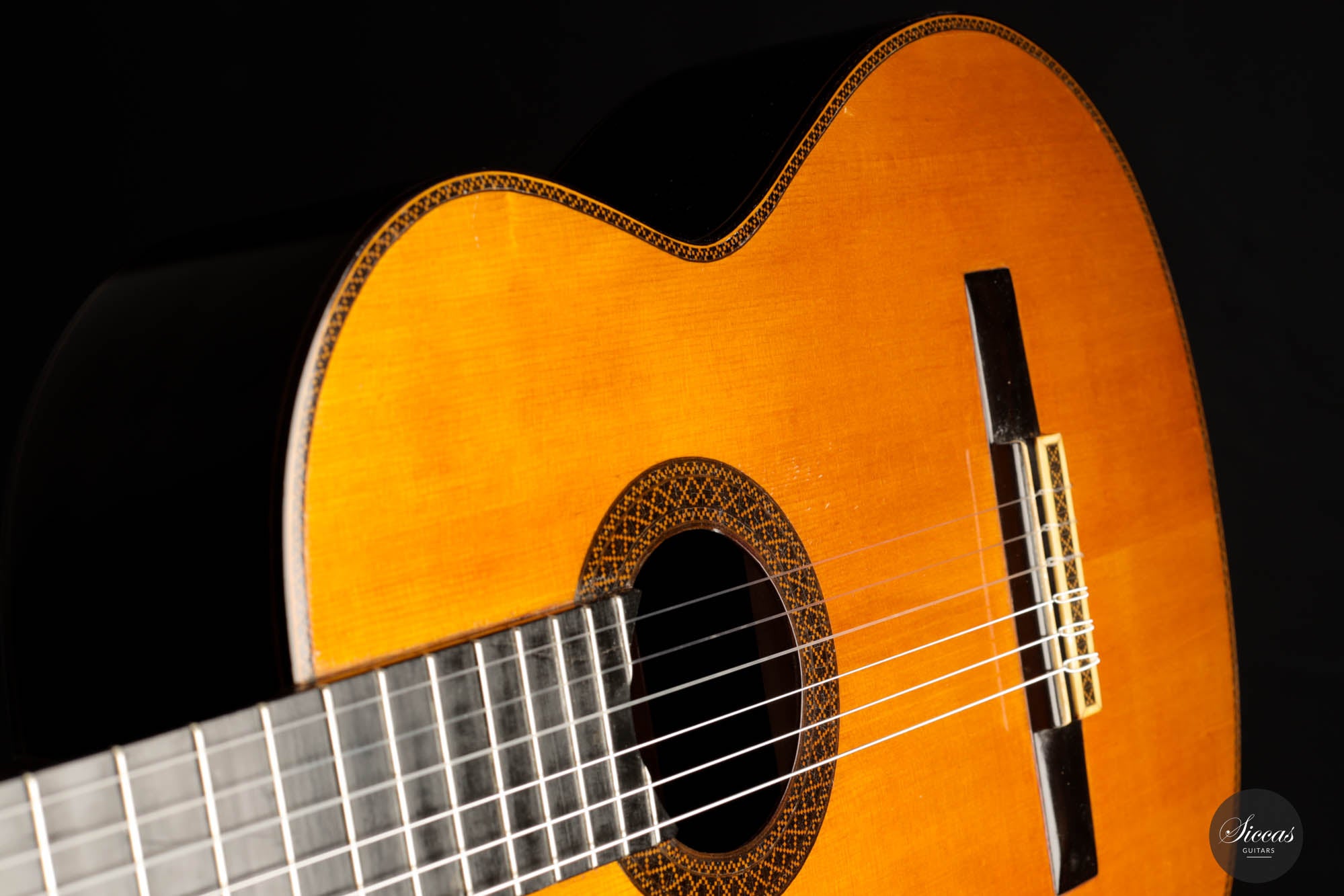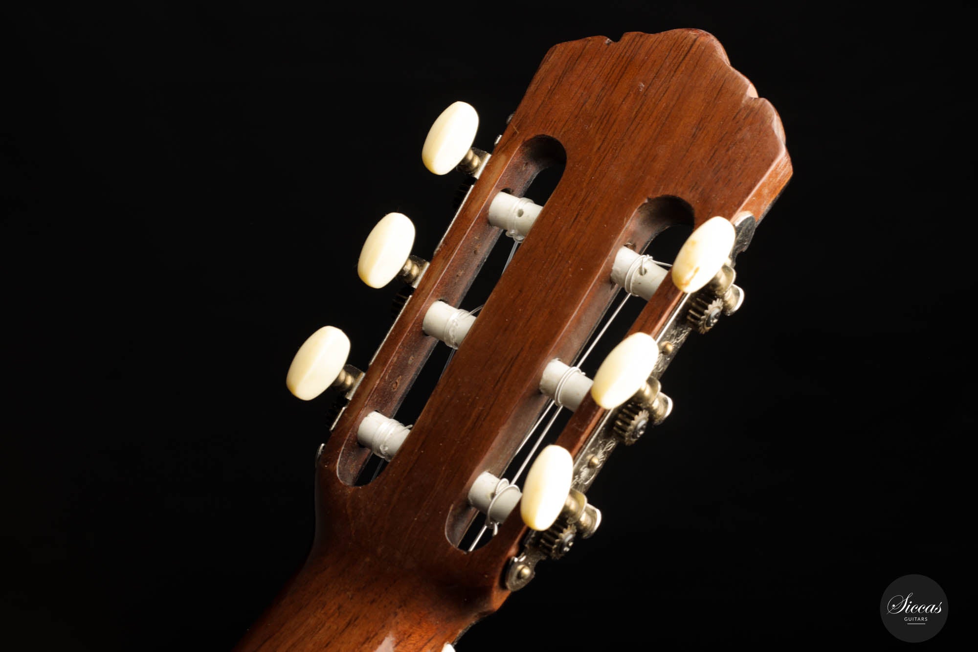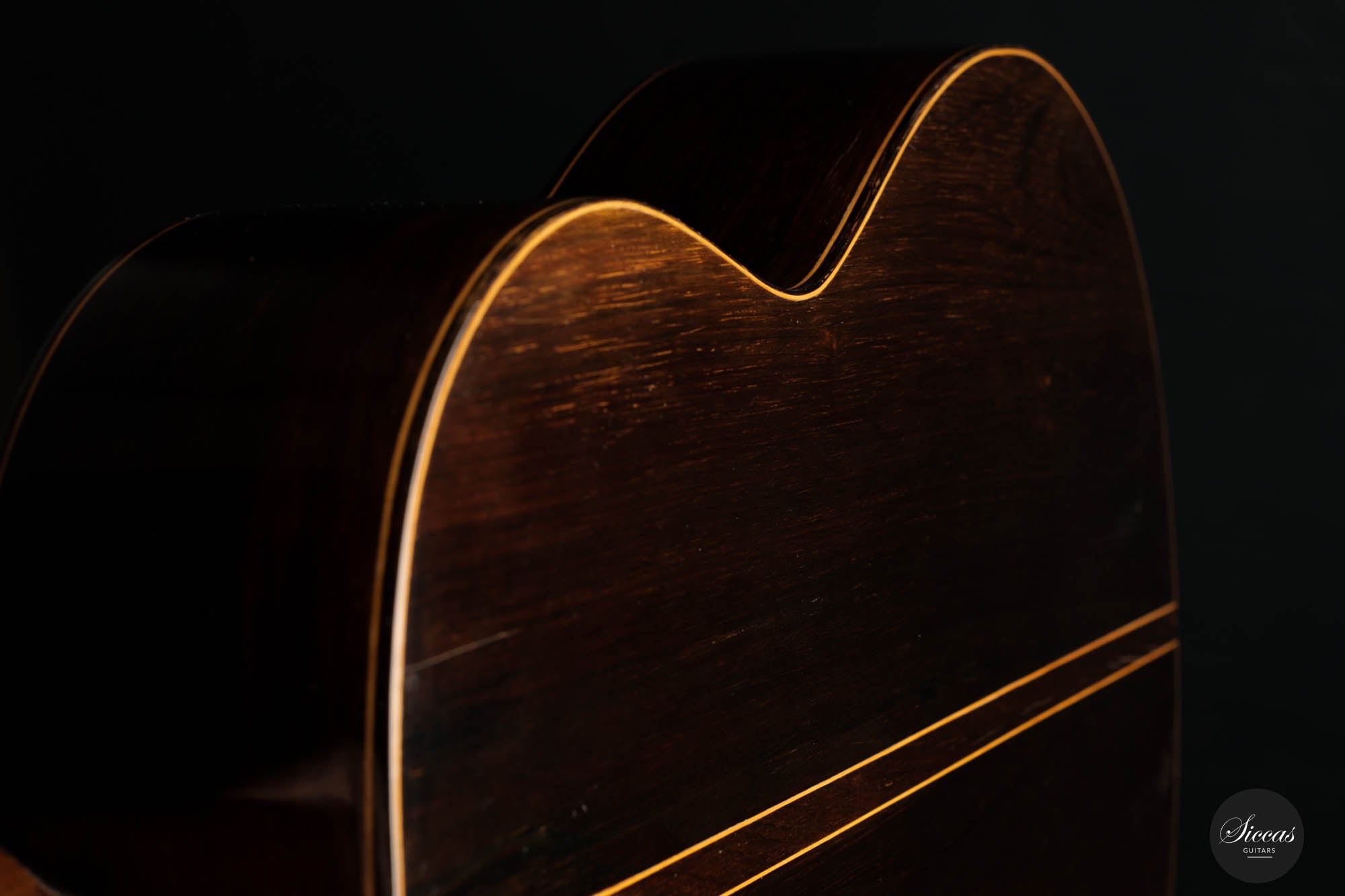This wonderful guitar, built in 1955, with the number 142, is an absolute masterpiece. It is richly decorated with mosaic inlays, an ornate and elegant rosette, an elaborate tie block, a magnificent set of Brazilian rosewood, and a beautifully carved headstock. Rather than being a standard instrument from Cherubito's workshop, this is instead one that he built specifically for a good friend who owned and played it for almost 70 years to the present day. Its condition is excellent, with only minor playing signs, a thoroughly repaired hairline crack on the back, two typical repaired cracks on the top on both sides of the fingerboard, and a repair on the head. The sound of this guitar is open all the way through and has the typical 1950s vintage sound found only on those original instruments that have been continuously played and cared for.
