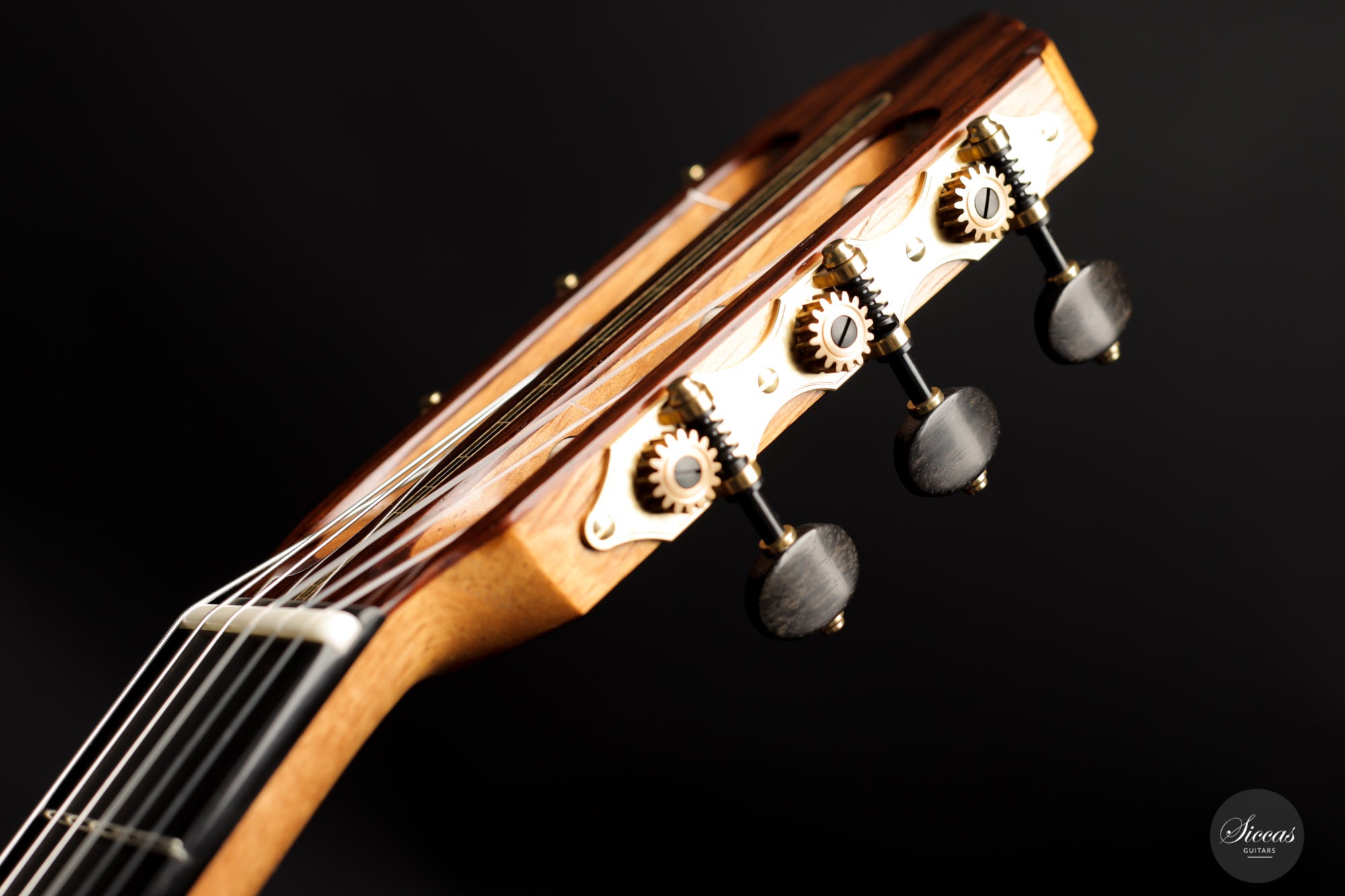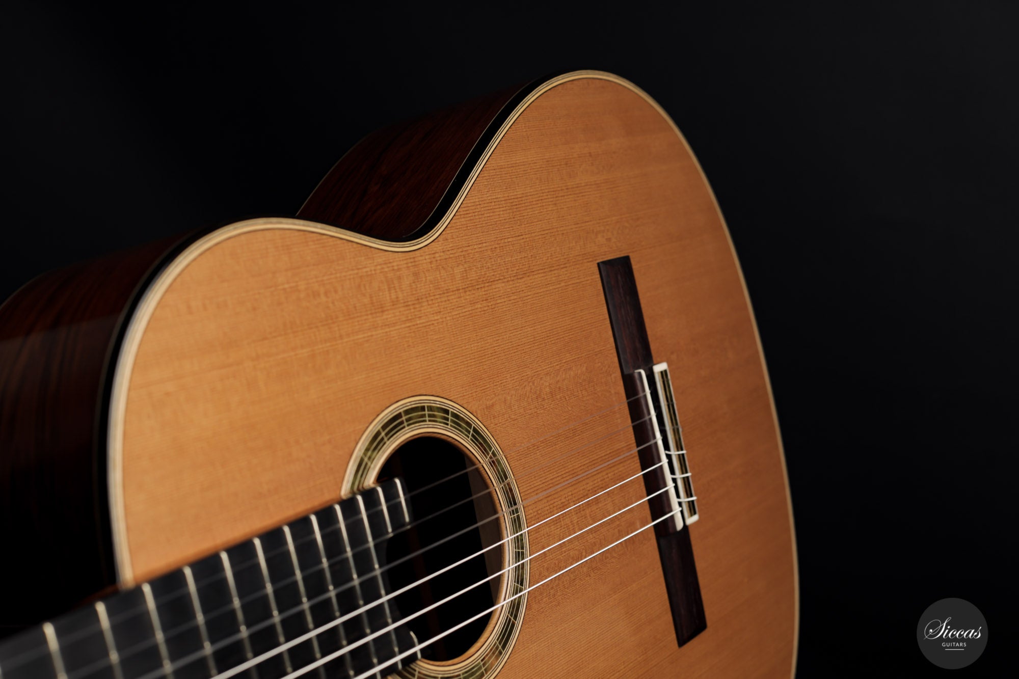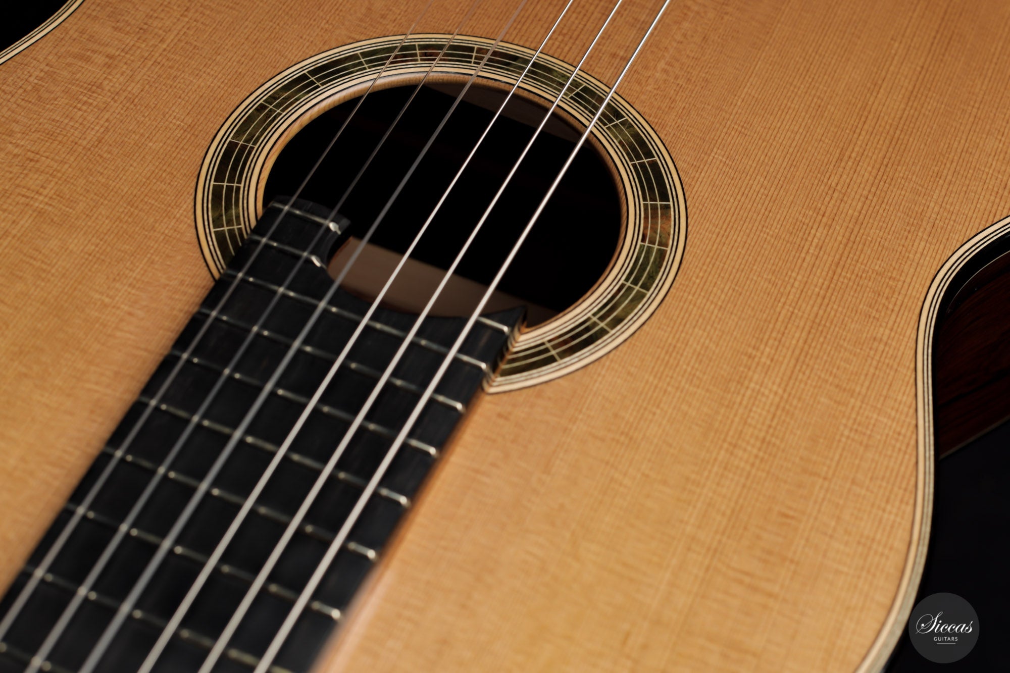 Diese Gitarre mit der Nummer 42 kommt direkt aus Vincents Werkstatt und ist eine Freude sie zu spielen. Mit ihrer 64 cm langen Mensur, dem erhöhten Griffbrett und der reaktionsschnellen Zedern-/Zedern-Doubletopdecke ist diese Gitarre sowohl für die linke als auch für die rechte Hand hervorragend spielbar. Ein reizvolles Detail sind die dreifarbigen Motive der Intarsien, die aus einem dunkelgrünen Furnier bestehen, das durch weiße und schwarze Randeinlagen hervorgehoben werden. Diese Gitarre wird jeden begeistern, der ein Instrument von bemerkenswerter Klangqualität, müheloser Spielbarkeit und ein echtes Kunstwerk sucht.