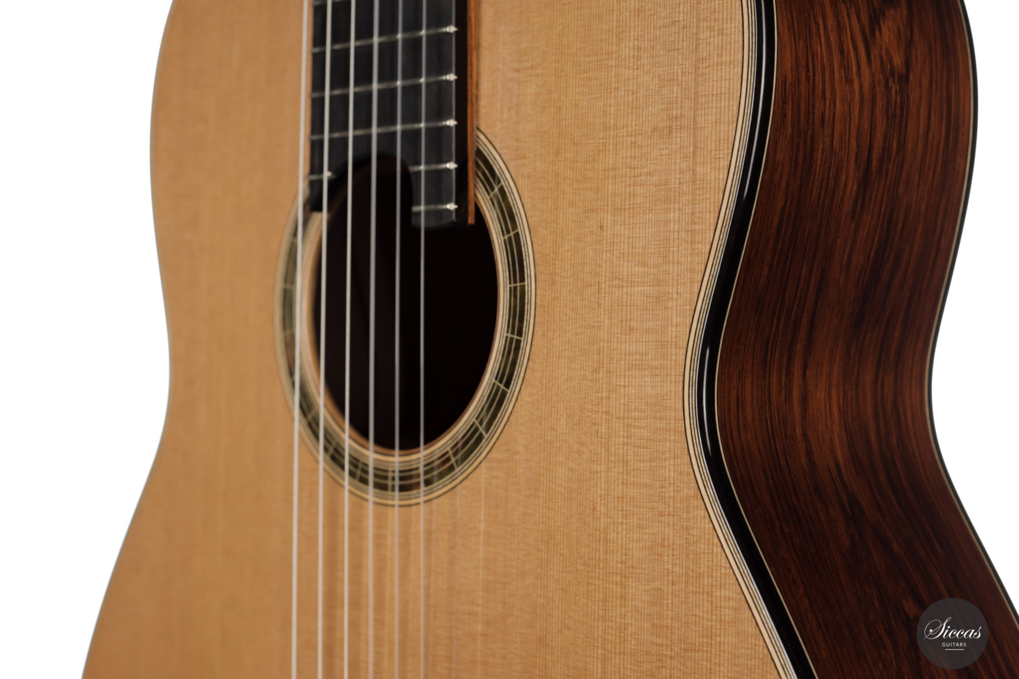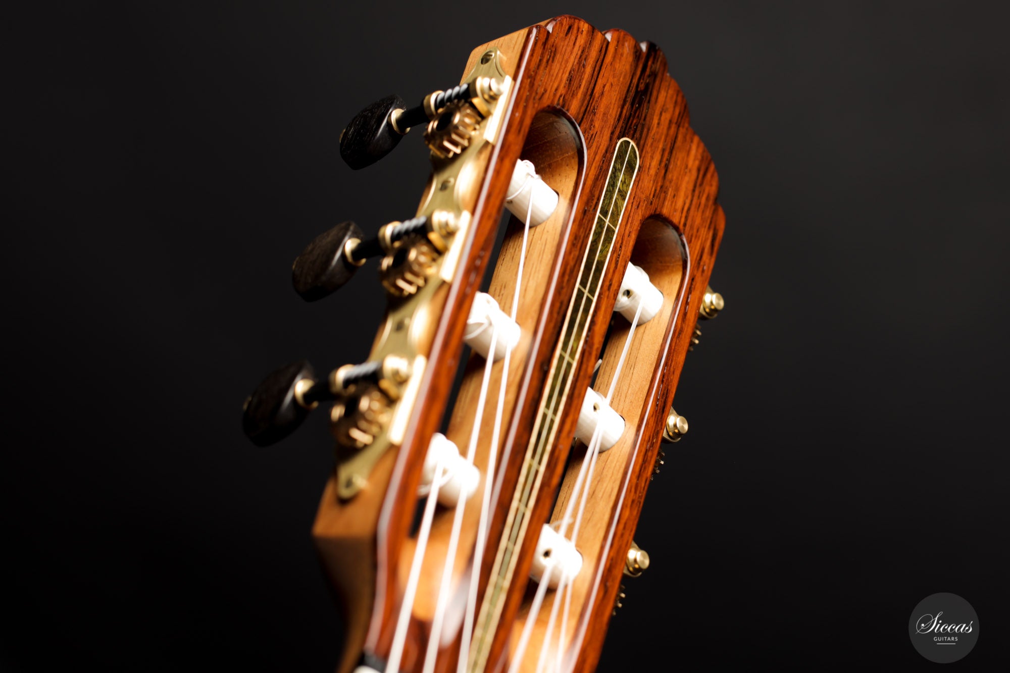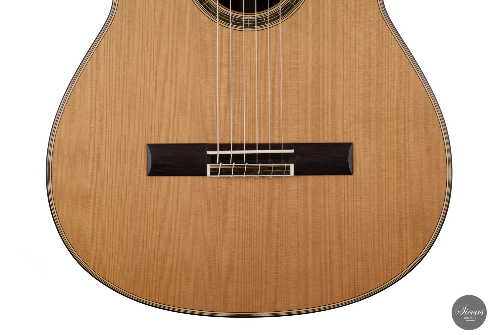 Diese Gitarre mit der Nummer 42 kommt direkt aus Vincents Werkstatt und ist eine Freude sie zu spielen. Mit ihrer 64 cm langen Mensur, dem erhöhten Griffbrett und der reaktionsschnellen Zedern-/Zedern-Doubletopdecke ist diese Gitarre sowohl für die linke als auch für die rechte Hand hervorragend spielbar. Ein reizvolles Detail sind die dreifarbigen Motive der Intarsien, die aus einem dunkelgrünen Furnier bestehen, das durch weiße und schwarze Randeinlagen hervorgehoben werden. Diese Gitarre wird jeden begeistern, der ein Instrument von bemerkenswerter Klangqualität, müheloser Spielbarkeit und ein echtes Kunstwerk sucht.