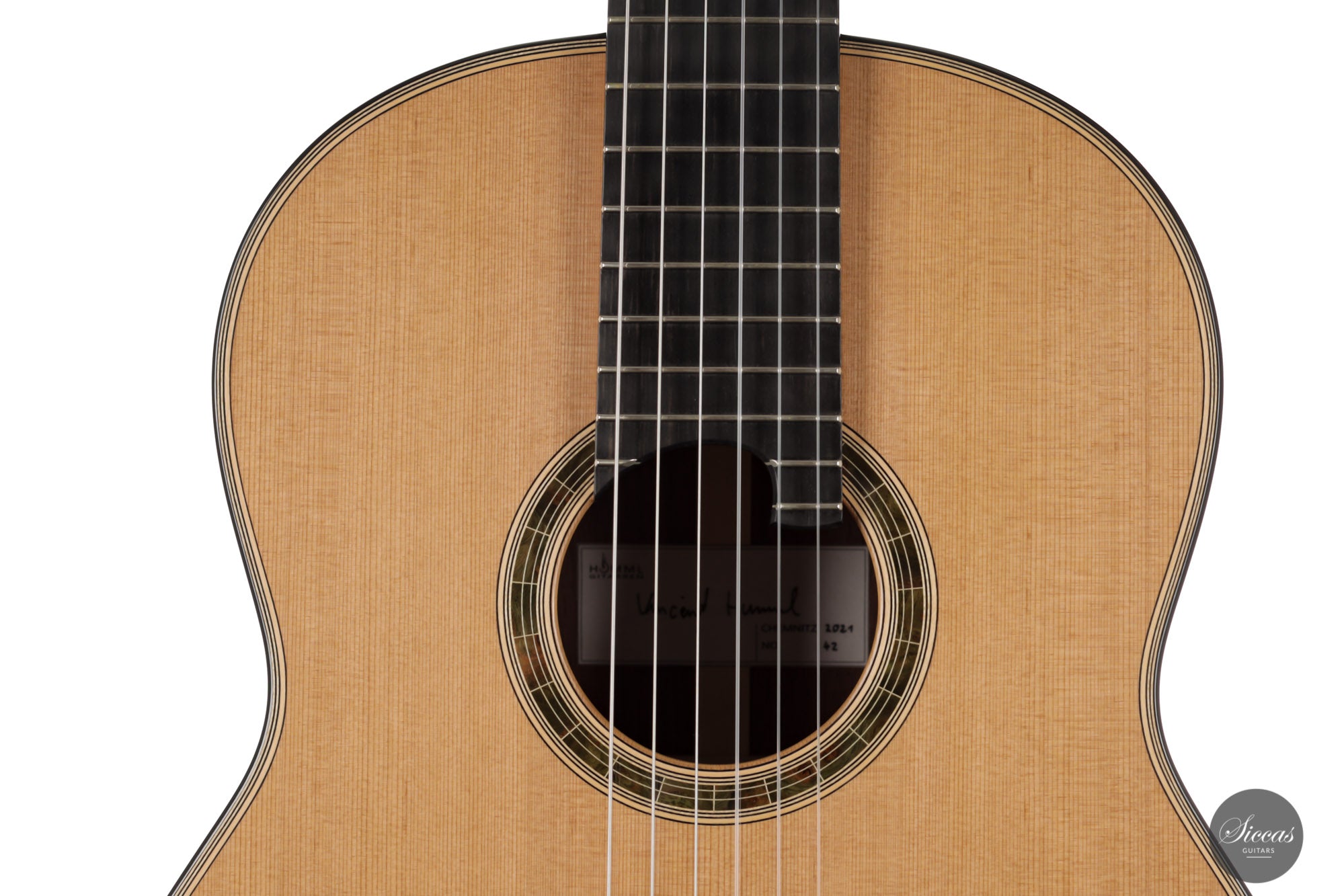 Vincents Gitarren zeichnen sich durch eine moderne Konstruktion und klare Ästhetik aus. Er baut erfolgreich seine Doubletop Gitarren, welche traditionell klingen aber immense Kraft und einem reichen und eleganten Klang haben. Reichtum und Eleganz zeigen sich auch im Aussehen seiner Instrumente. Sein Design ist klar und raffiniert, immer präzise gebaut und geschmackvoll. Vincent gehört zu den Gitarrenbauern der neuen Generation, die bei der Qualität keine Kompromisse eingehen, wie z.B. die Scheller-Mechaniken, die makellose französische Politur und die 1a-Holzqualität bezeugen.