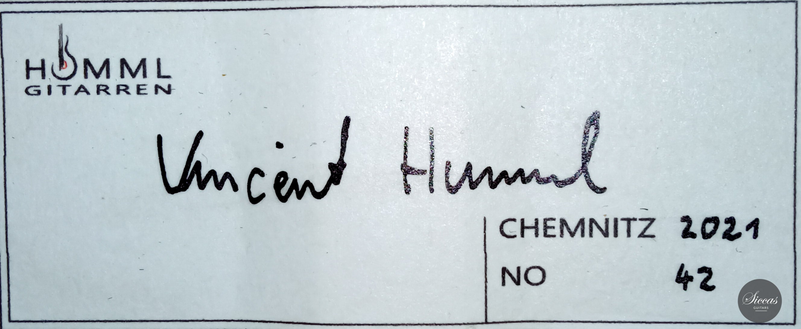 Vincent Humml ist ein deutscher Gitarrenbauer der jungen Generation. Vor neun Jahren begann er eine Lehre als Zupfinstrumentenbauer, studierte in Markneukirchen Gitarrenbau und verfeinerte seine Fähigkeiten in verschiedenen Praktika und Workshops. Nach der Erlangung des sehr anspruchsvollen Meistertitels im Zupfinstrumentenbau im Jahr 2019 gründete er seine Werkstatt in Chemnitz, Deutschland.