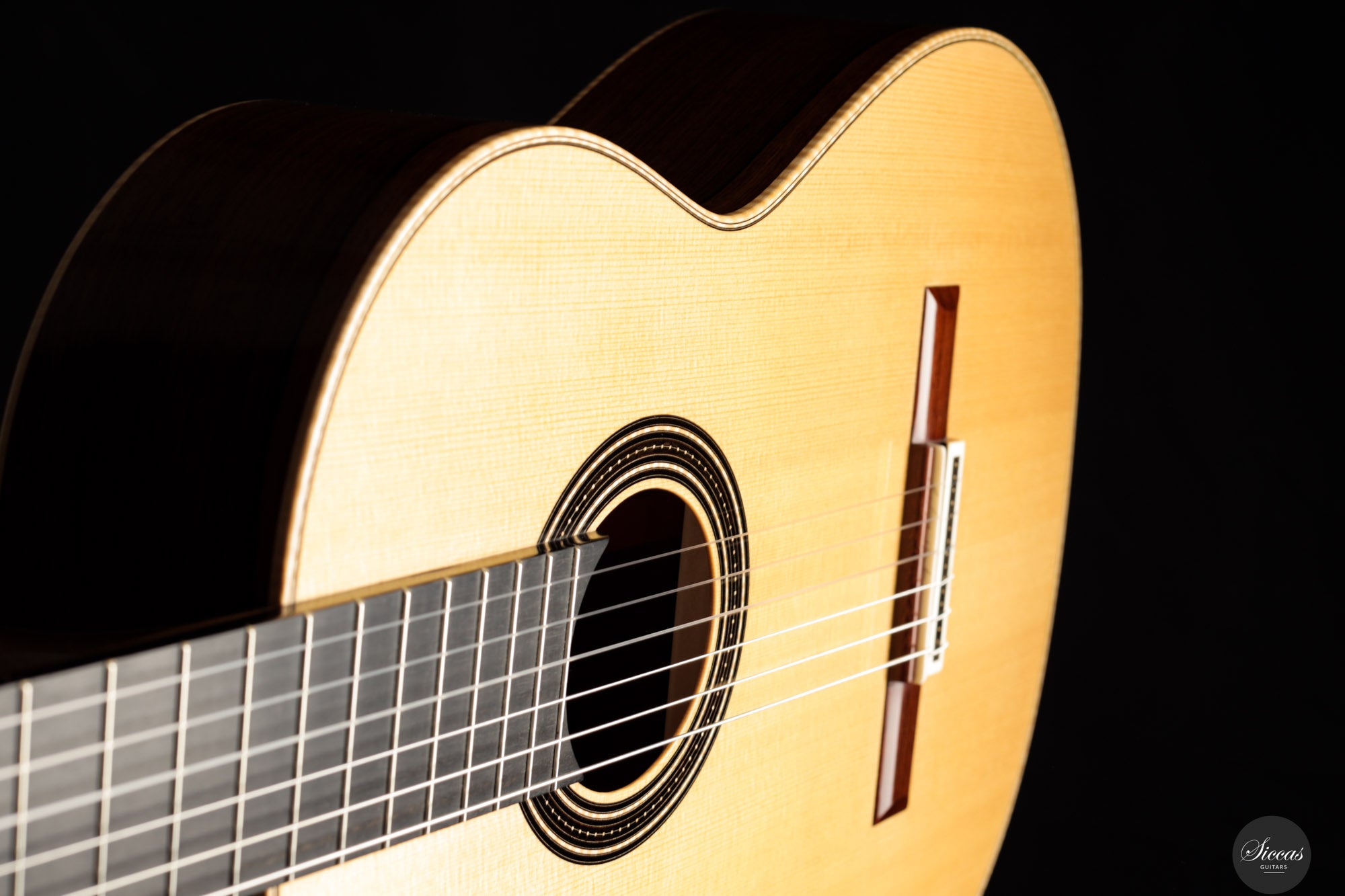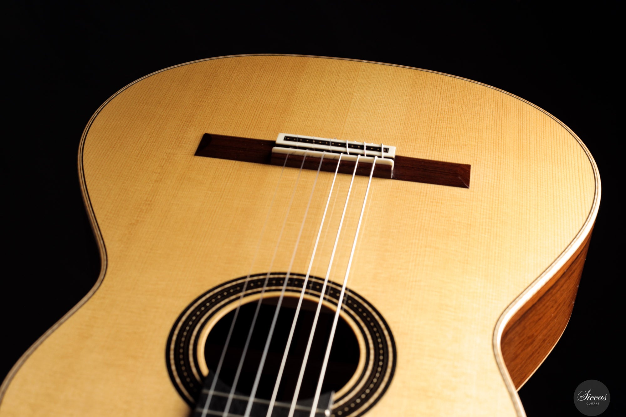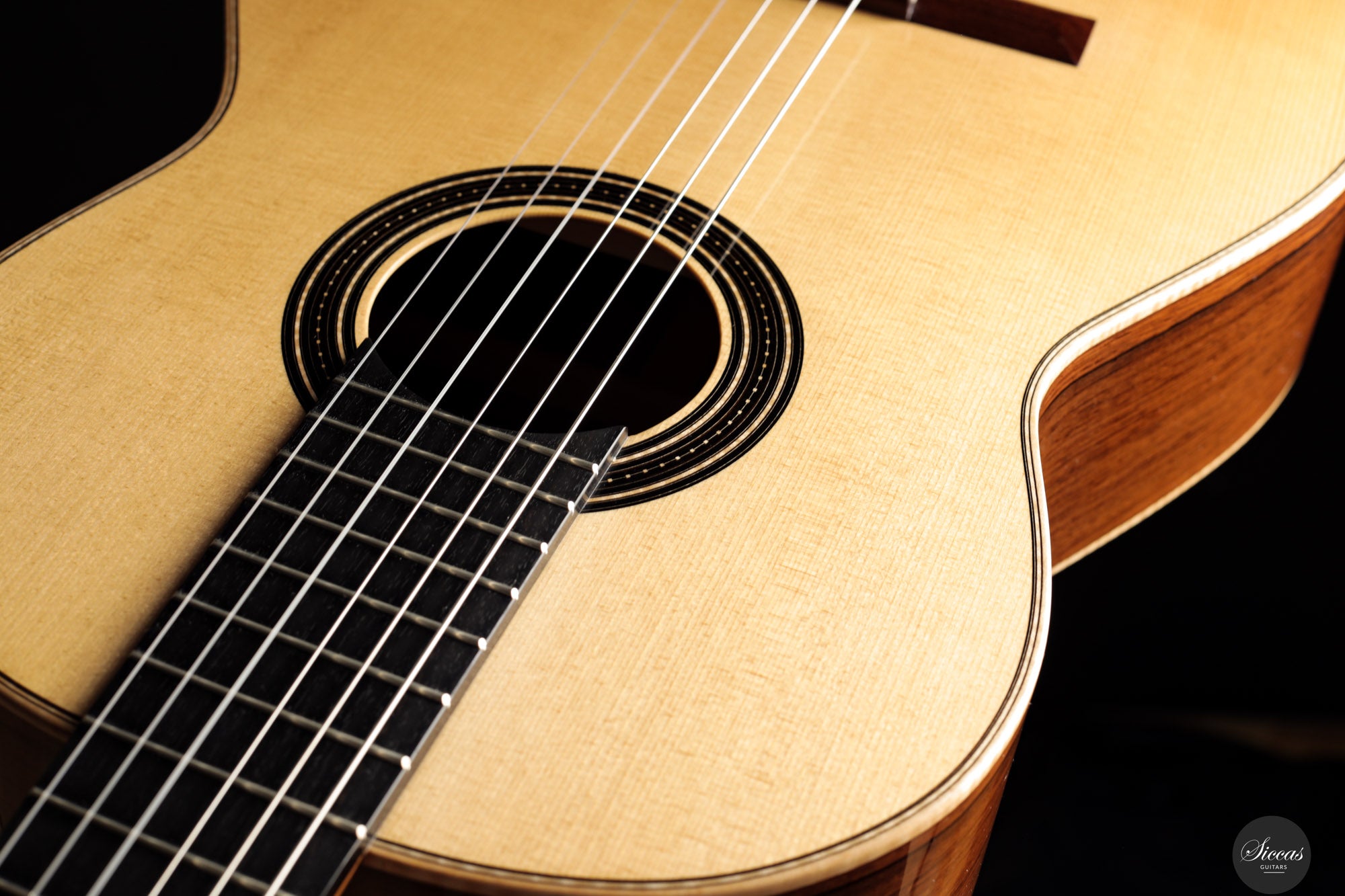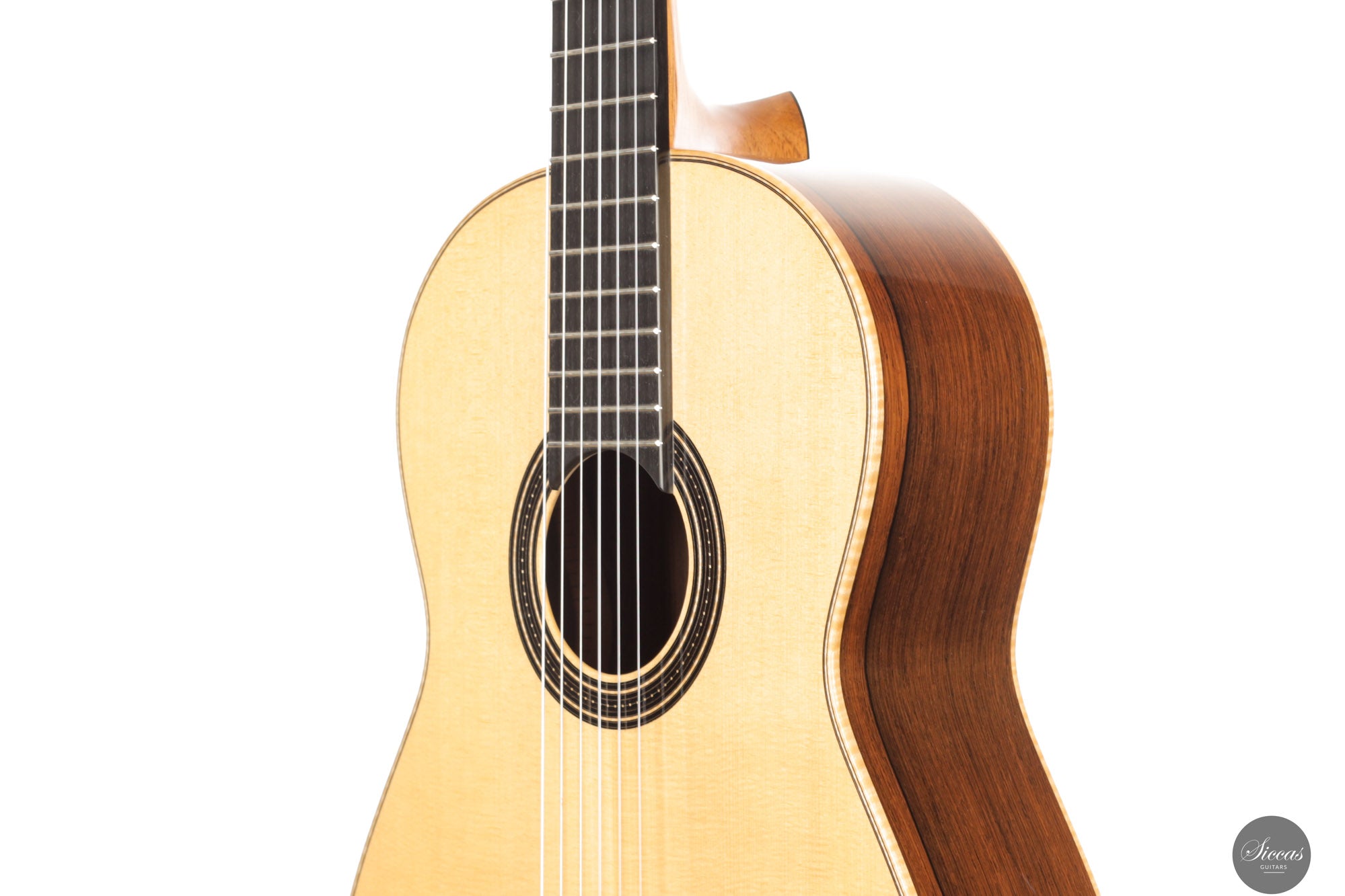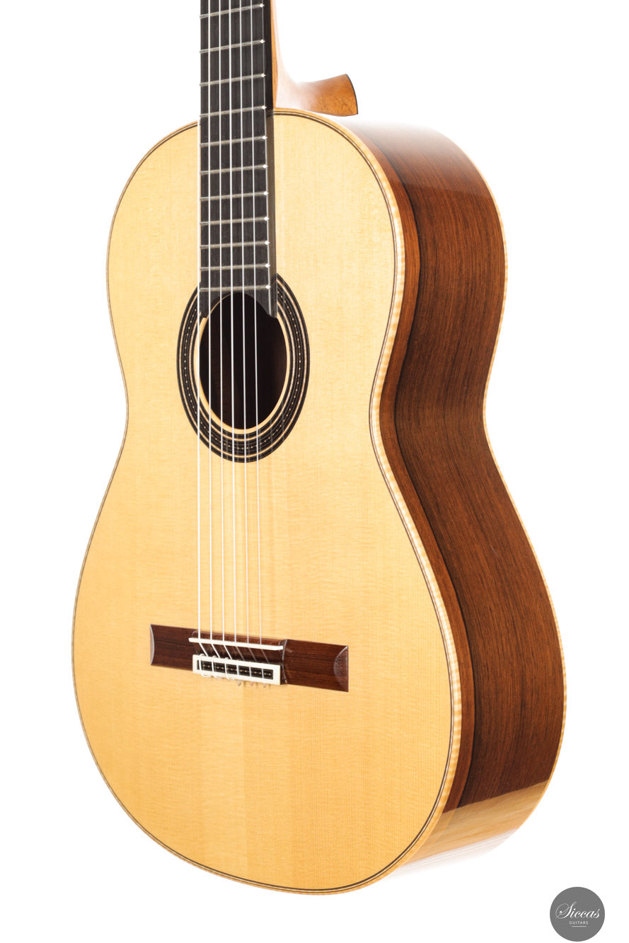 Die Rondine No. 04 ist eine außergewöhnliche Konzertgitarre, die klanglichen Ausdruck mit einem charakterstarken, modernen Erscheinungsbild kombiniert. Für diese Serie entwickelten Verreydt und Gozzini eine eigene Plantilla, lose inspiriert von Torres, ergänzt durch Verreydts fortschrittliche Lattice-Beleistung. Daraus resultiert ein Instrument mit ausgezeichneter Projektion, direkter Klangabstrahlung und einem klanglich fein abgestuften Spektrum. Diese Gitarre verfügt über eine Fichtendecke und Boden und Zargen aus hochwertigem Madagaskar-Palisander, deren tiefes Farbspiel durch helle Ahornbindungen betont wird. Die moderne Schwarz-Weiß-Ästhetik zieht sich durch das gesamte Design: Die Rosette aus Ebenholz und Ahorn, das Mosaik des Stegs sowie die elegante Ebenholz-Kopfplatte greifen dieses Thema ebenso auf wie die edlen Sloane-Mechaniken mit Ebenholzknöpfen. Der Name „Rondine“, italienisch für „Schwalbe“, verweist subtil auf dieses stilistische Wechselspiel von Licht und Dunkel. Klanglich überzeugt das Instrument durch luftige Höhen, schnelle Ansprache und ein breites Spektrum an Klangfarben. Die Gitarre klingt offen, kraftvoll und nuanciert – mit hervorragender Trennschärfe und direkter Ansprache, die feinste dynamische Abstufungen unterstützt. Mit nur 1550 Gramm Gewicht und einem Schellack-Finish ist sie ein leichtes, hochpräzises Konzertinstrument der modernen Gitarrenbaukunst.Zustand