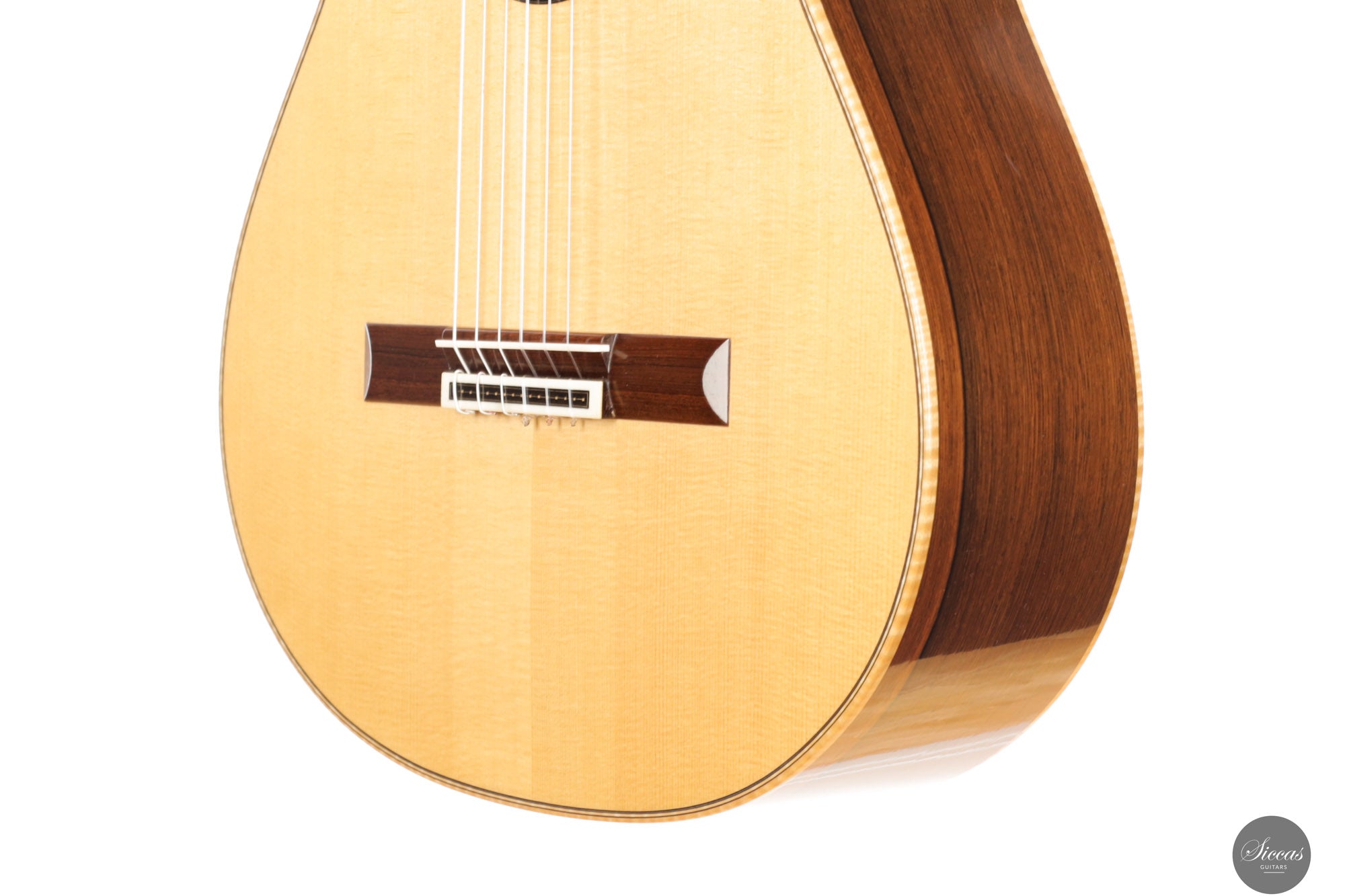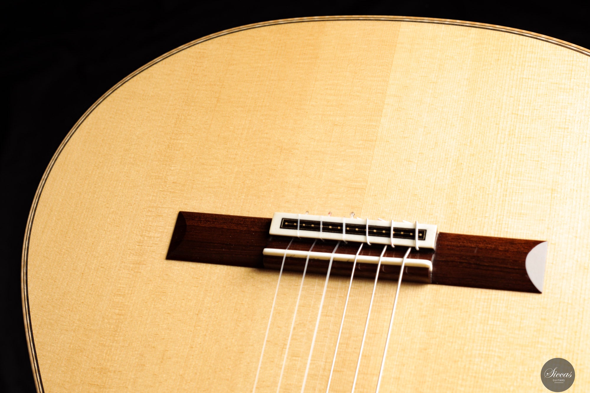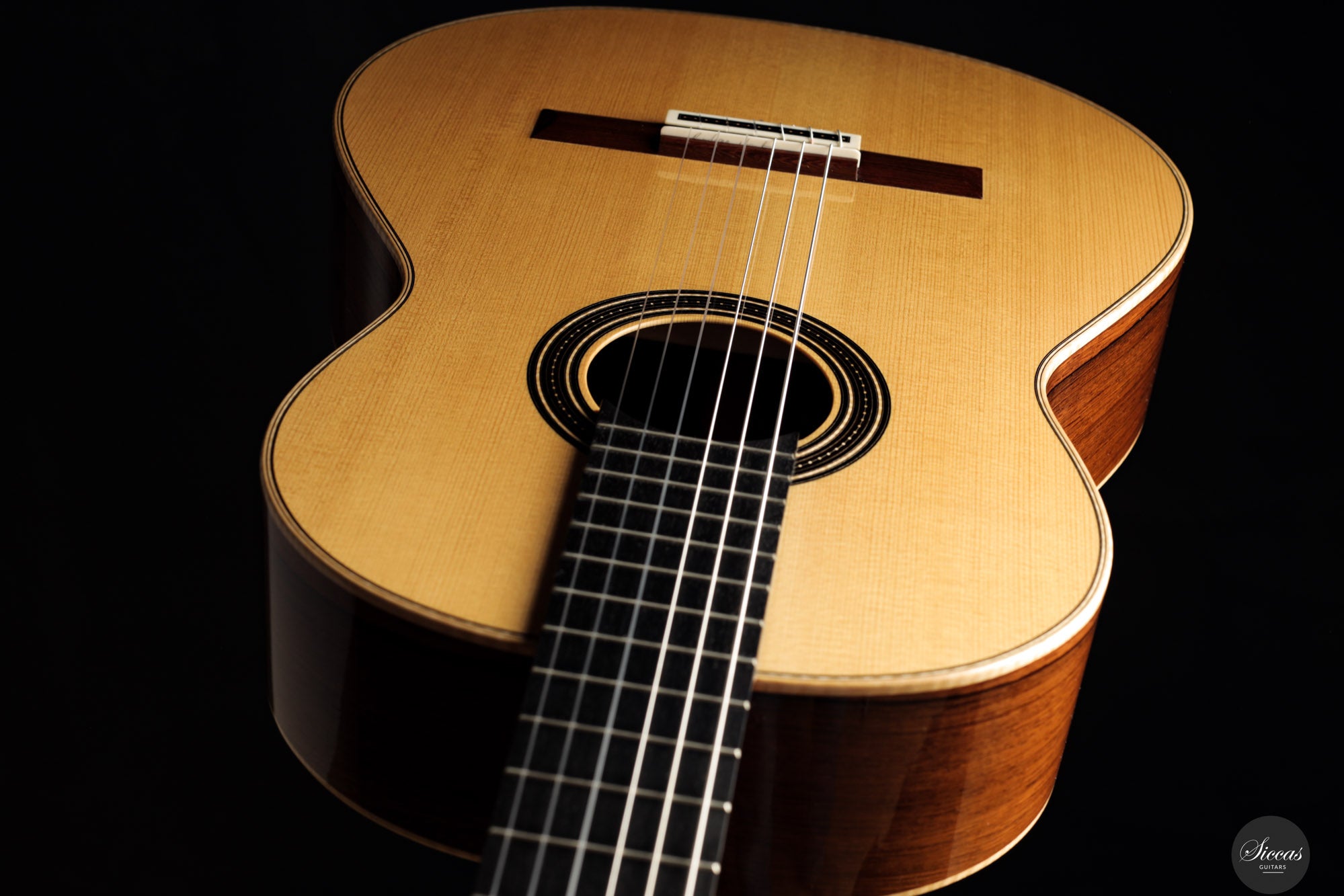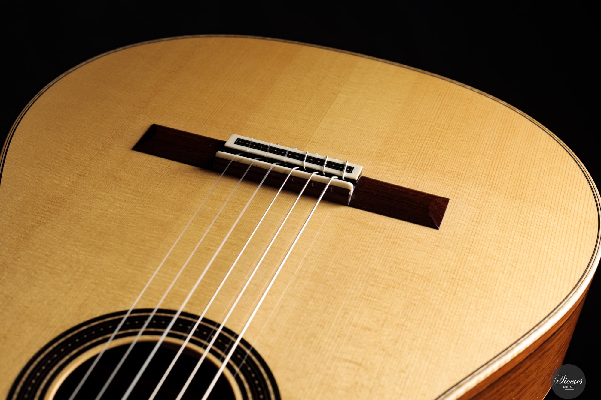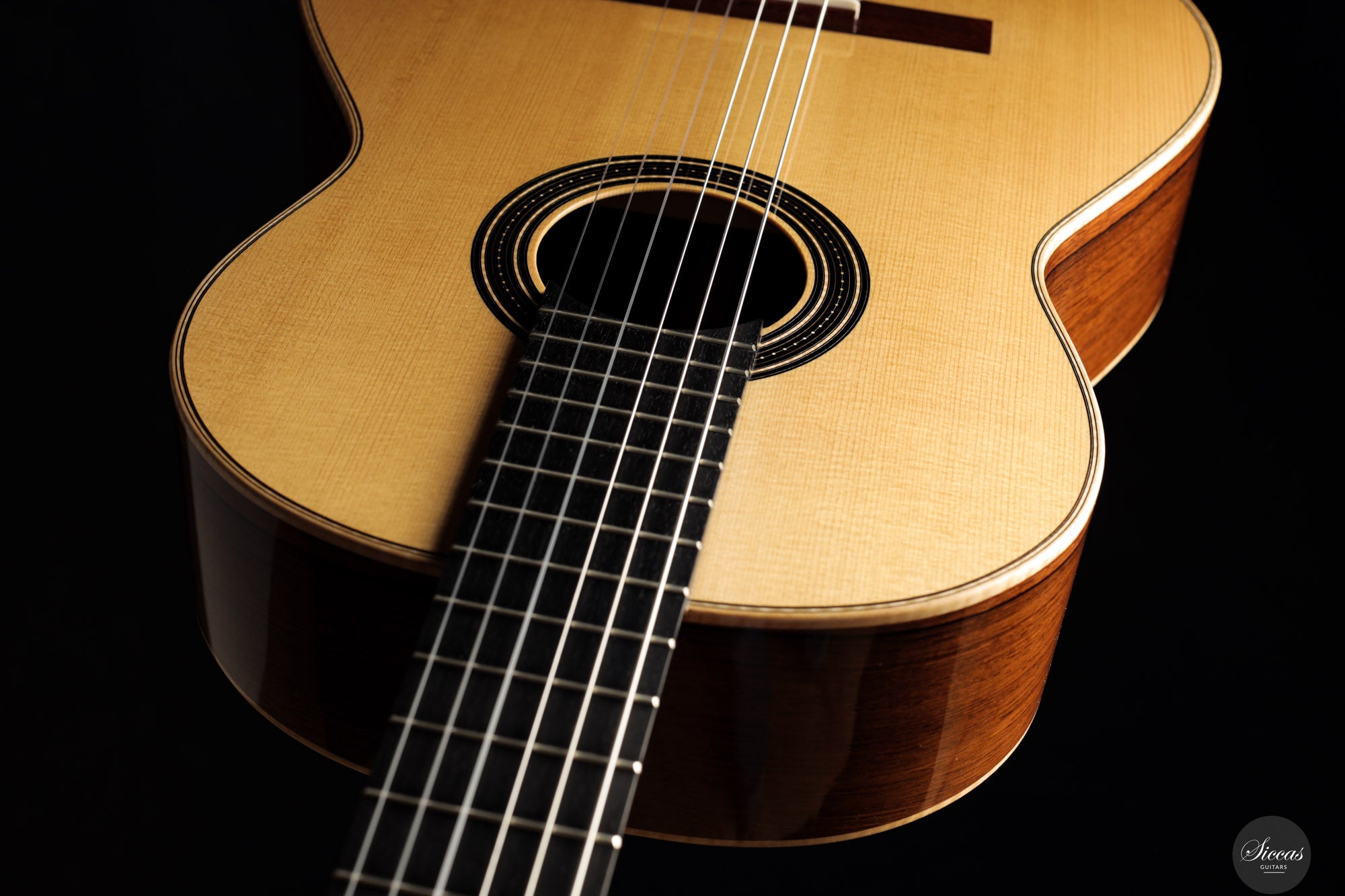 Die Rondine No. 04 ist eine außergewöhnliche Konzertgitarre, die klanglichen Ausdruck mit einem charakterstarken, modernen Erscheinungsbild kombiniert. Für diese Serie entwickelten Verreydt und Gozzini eine eigene Plantilla, lose inspiriert von Torres, ergänzt durch Verreydts fortschrittliche Lattice-Beleistung. Daraus resultiert ein Instrument mit ausgezeichneter Projektion, direkter Klangabstrahlung und einem klanglich fein abgestuften Spektrum. Diese Gitarre verfügt über eine Fichtendecke und Boden und Zargen aus hochwertigem Madagaskar-Palisander, deren tiefes Farbspiel durch helle Ahornbindungen betont wird. Die moderne Schwarz-Weiß-Ästhetik zieht sich durch das gesamte Design: Die Rosette aus Ebenholz und Ahorn, das Mosaik des Stegs sowie die elegante Ebenholz-Kopfplatte greifen dieses Thema ebenso auf wie die edlen Sloane-Mechaniken mit Ebenholzknöpfen. Der Name „Rondine“, italienisch für „Schwalbe“, verweist subtil auf dieses stilistische Wechselspiel von Licht und Dunkel. Klanglich überzeugt das Instrument durch luftige Höhen, schnelle Ansprache und ein breites Spektrum an Klangfarben. Die Gitarre klingt offen, kraftvoll und nuanciert – mit hervorragender Trennschärfe und direkter Ansprache, die feinste dynamische Abstufungen unterstützt. Mit nur 1550 Gramm Gewicht und einem Schellack-Finish ist sie ein leichtes, hochpräzises Konzertinstrument der modernen Gitarrenbaukunst.Zustand