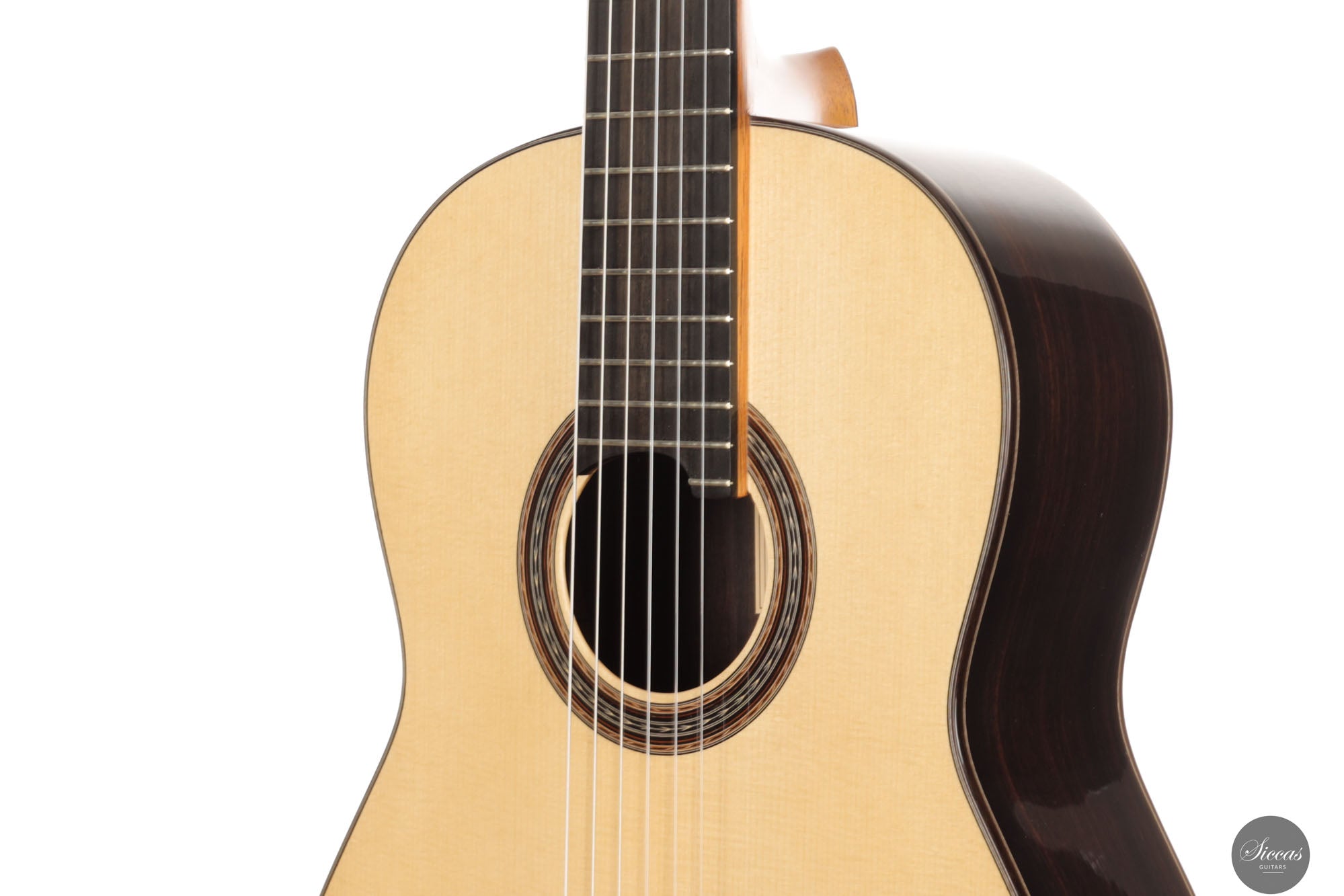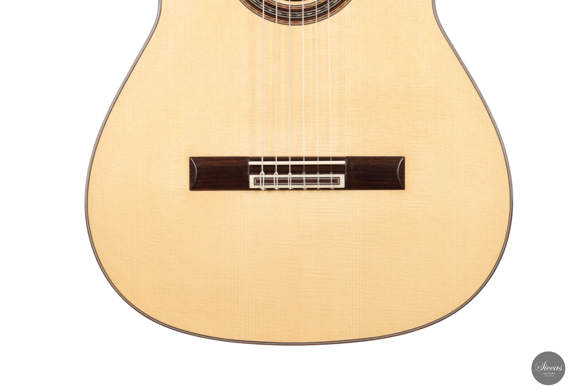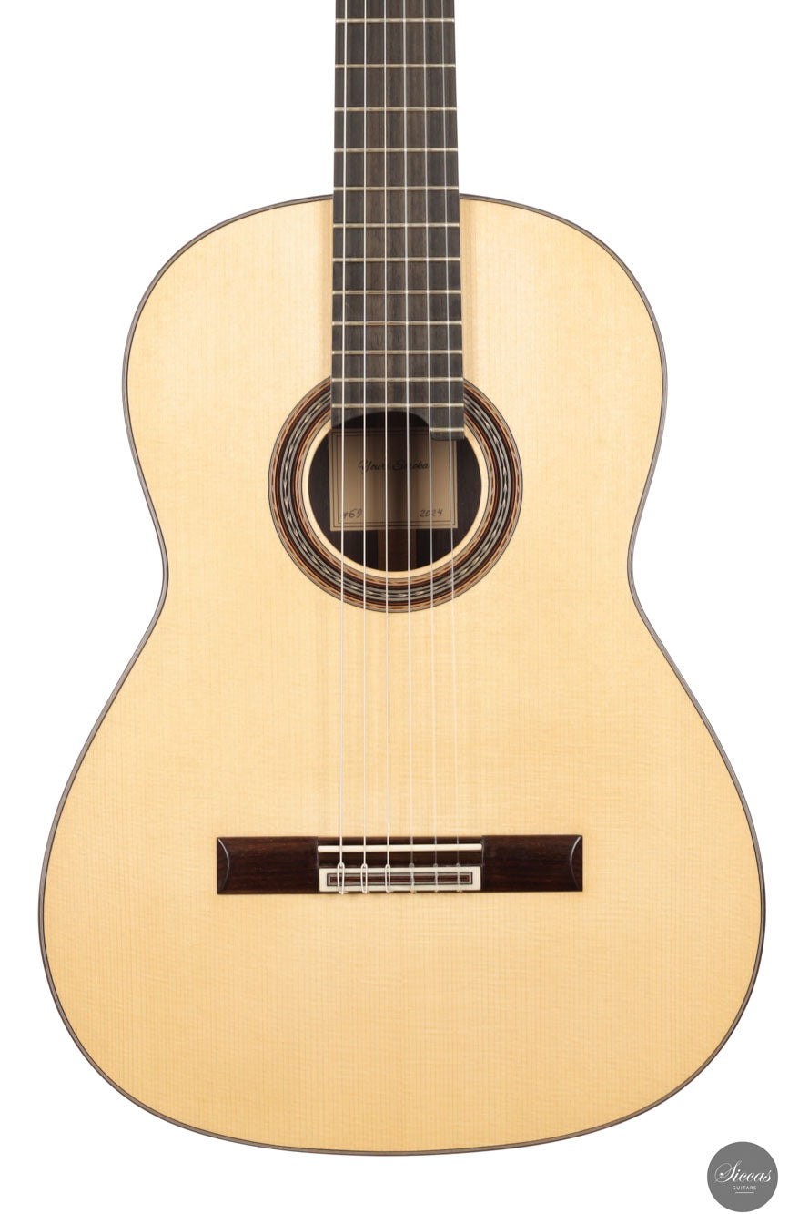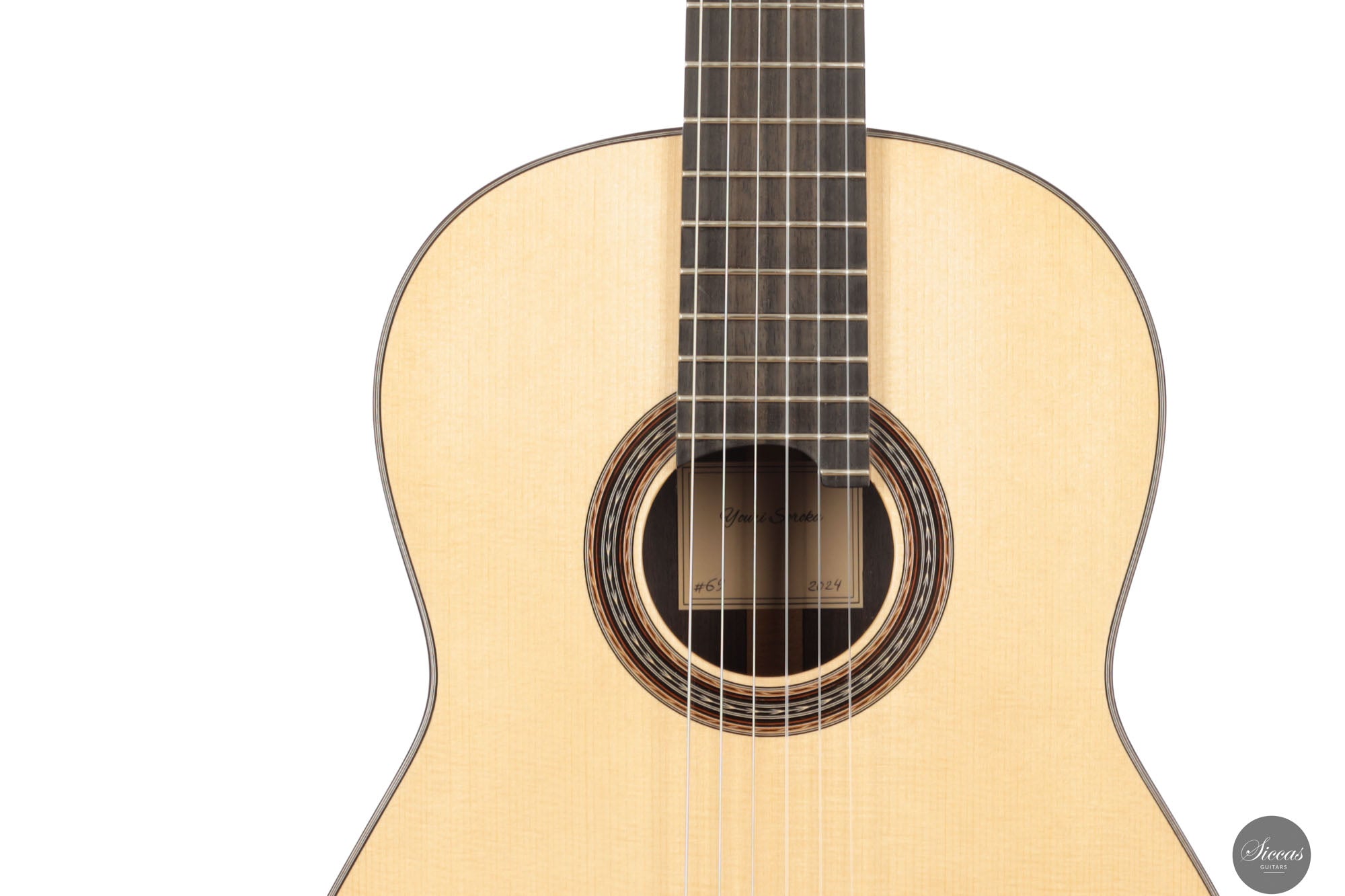 Dies ist Youris Double-Top-Modell, das ein innovatives Design bietet, bei dem italienische Fichte als Grundlage der Verbunddecke mit Western Red Cedar als unterer Schicht kombiniert wird. Diese anspruchsvolle Double-Top-Konstruktion erhöht die Stabilität und Reaktionsfähigkeit der Decke, was zu einem stärkeren Klangvolumen führt, während der traditionelle Klangcharakter durch eine traditionelle 7-Fächer-Beleistung erhalten bleibt. Boden und Zargen sind aus dunkel gemasertem, gerade gewachsenem indischem Palisander gefertigt, der der Gitarre Tiefe und Wärme verleiht. Zusätzlich verbessert das leicht erhöhte Griffbrett die Bespielbarkeit, erhöht die Stabilität des Halses und verringert das Risiko unbeabsichtigter Nagelspuren auf der Decke, wodurch diese wunderschön gefertigte Gitarre sowohl praktisch als auch eine Freude beim Spielen ist.