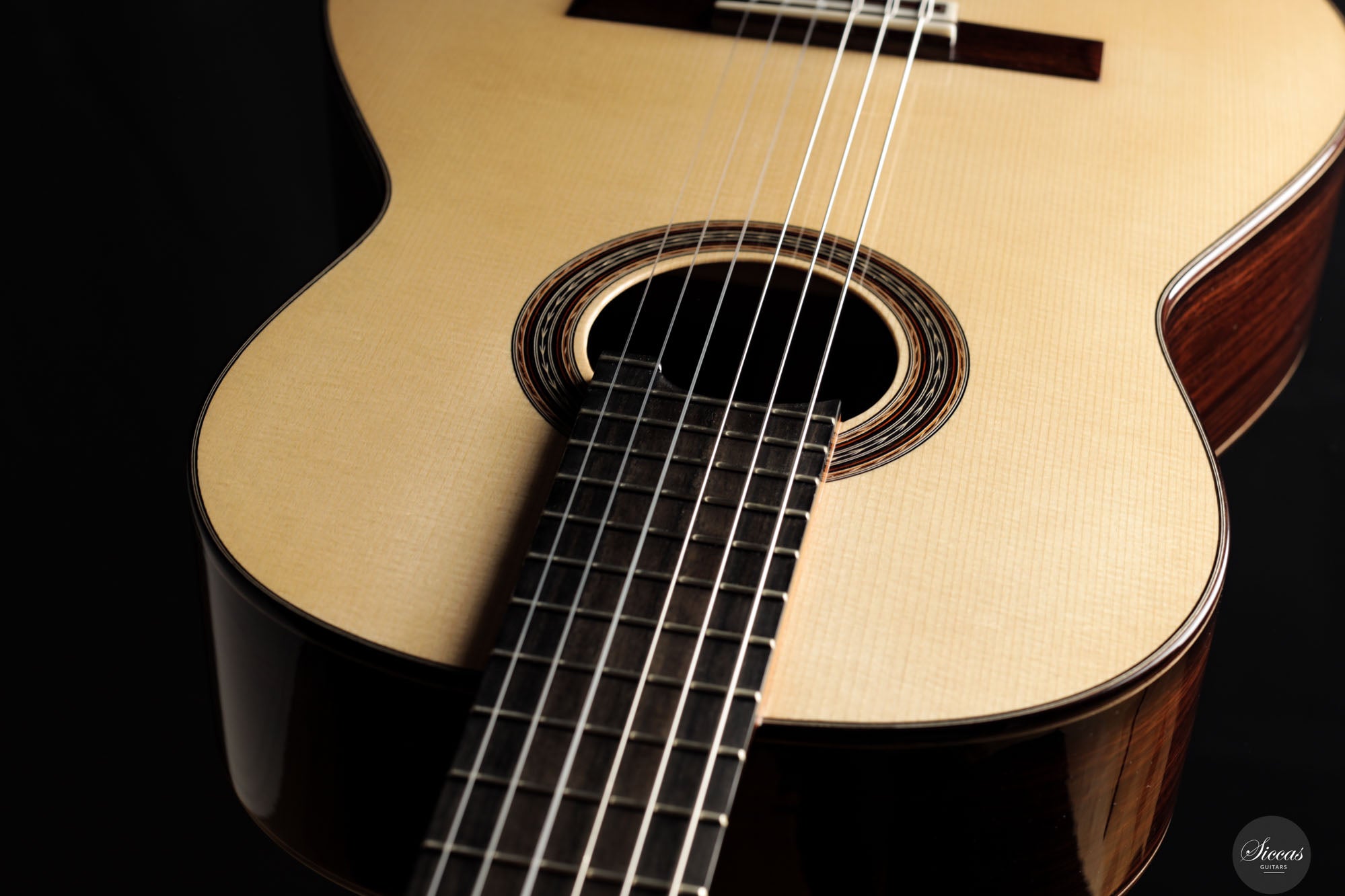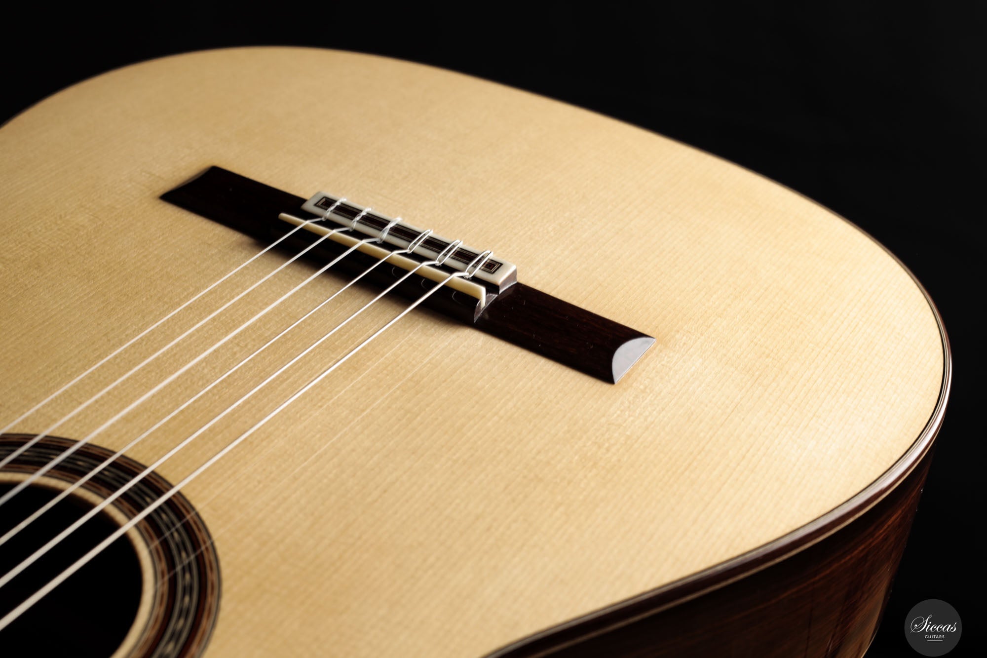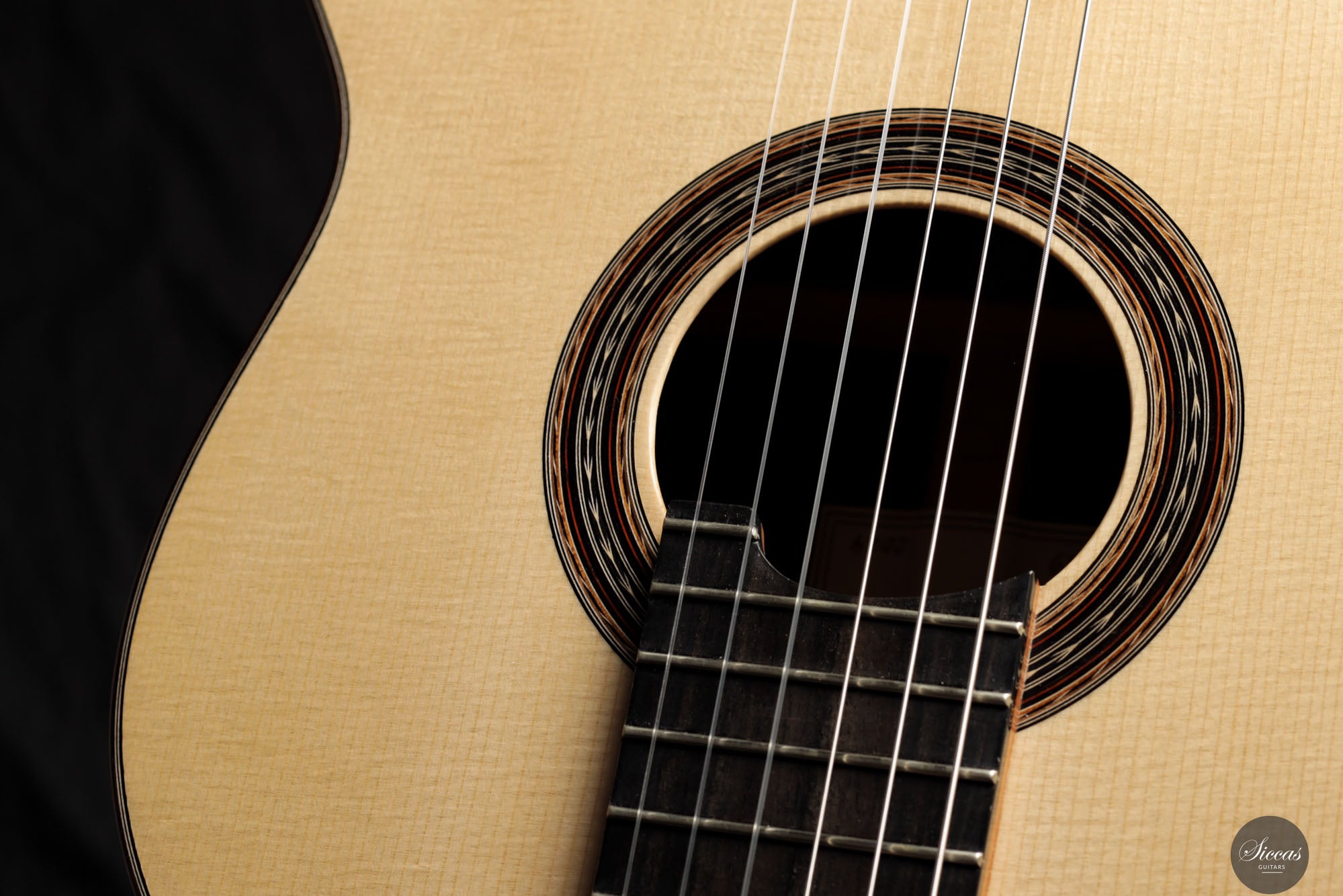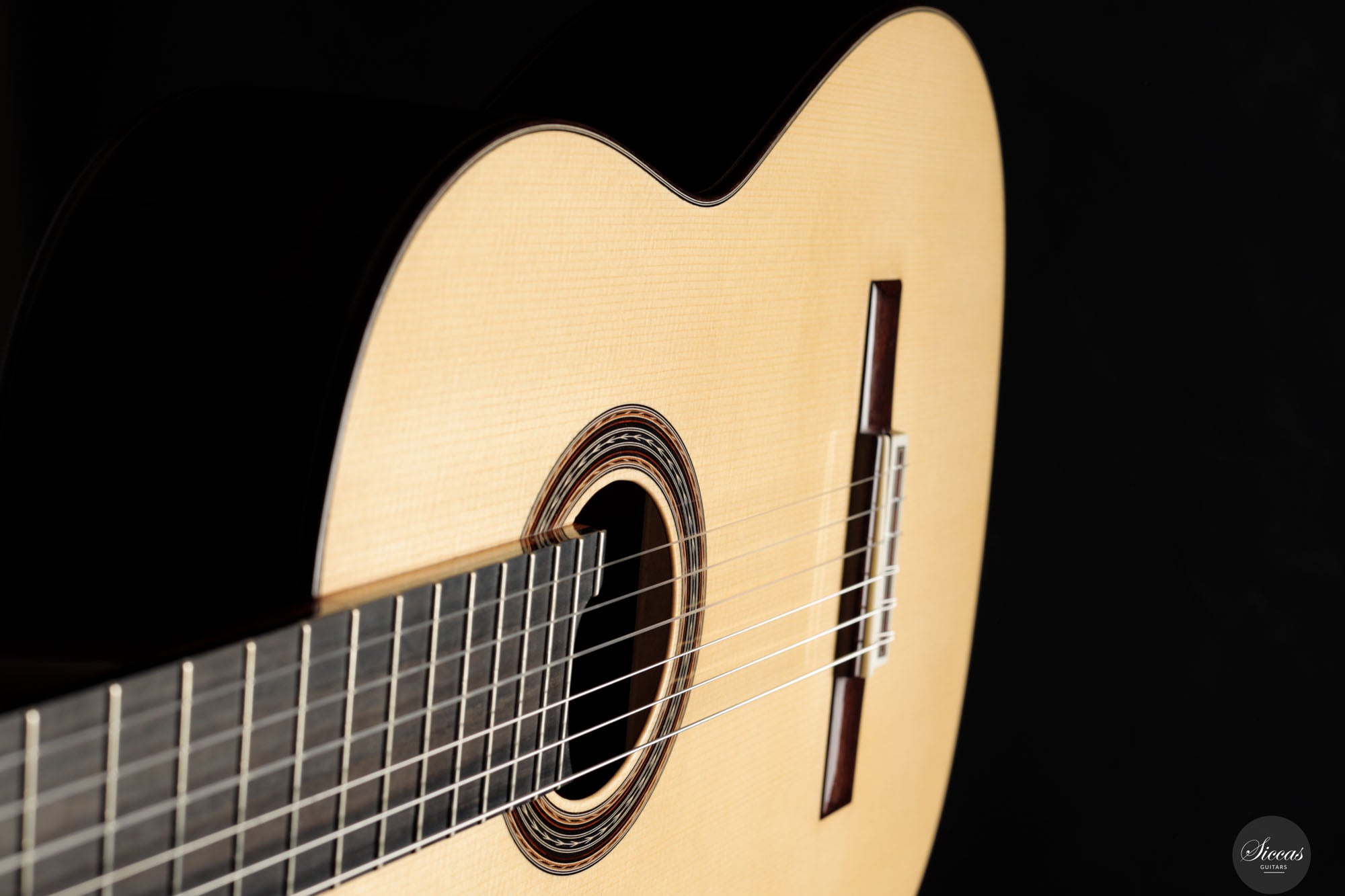 Dies ist Youris Double-Top-Modell, das ein innovatives Design bietet, bei dem italienische Fichte als Grundlage der Verbunddecke mit Western Red Cedar als unterer Schicht kombiniert wird. Diese anspruchsvolle Double-Top-Konstruktion erhöht die Stabilität und Reaktionsfähigkeit der Decke, was zu einem stärkeren Klangvolumen führt, während der traditionelle Klangcharakter durch eine traditionelle 7-Fächer-Beleistung erhalten bleibt. Boden und Zargen sind aus dunkel gemasertem, gerade gewachsenem indischem Palisander gefertigt, der der Gitarre Tiefe und Wärme verleiht. Zusätzlich verbessert das leicht erhöhte Griffbrett die Bespielbarkeit, erhöht die Stabilität des Halses und verringert das Risiko unbeabsichtigter Nagelspuren auf der Decke, wodurch diese wunderschön gefertigte Gitarre sowohl praktisch als auch eine Freude beim Spielen ist.