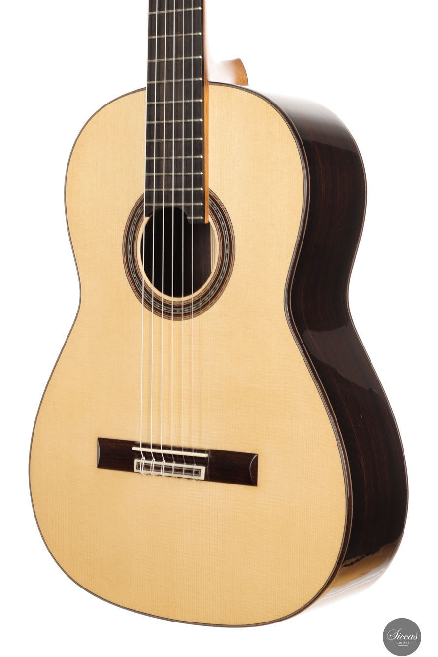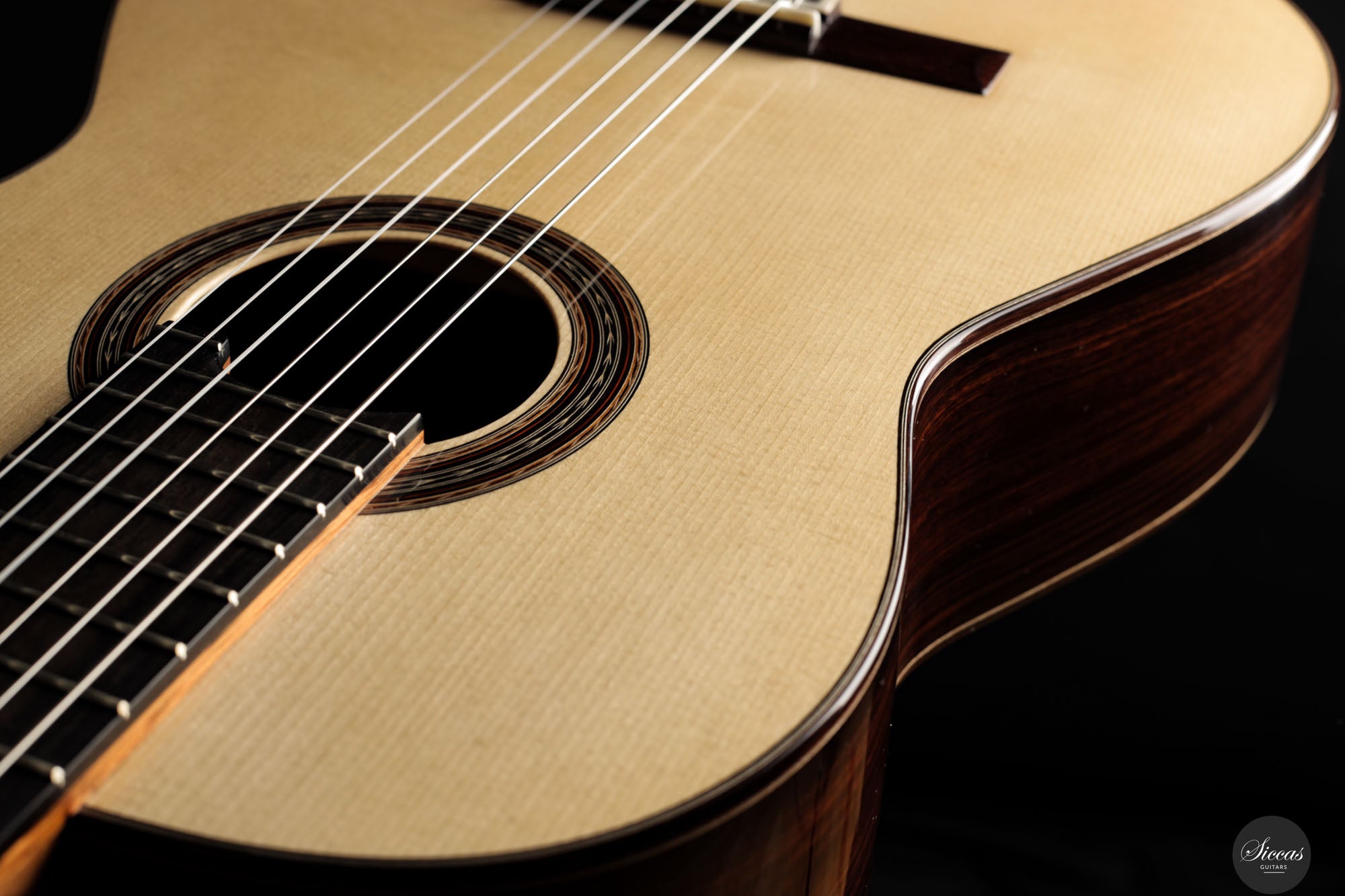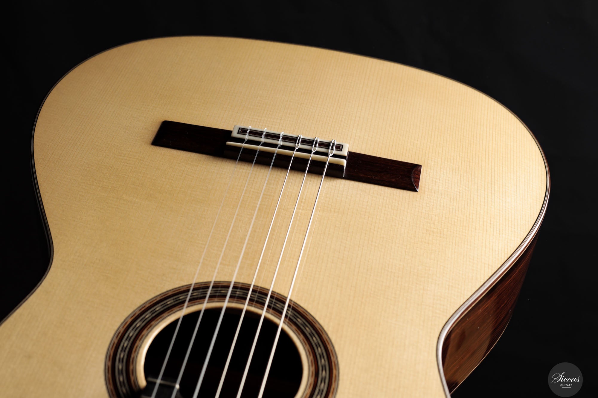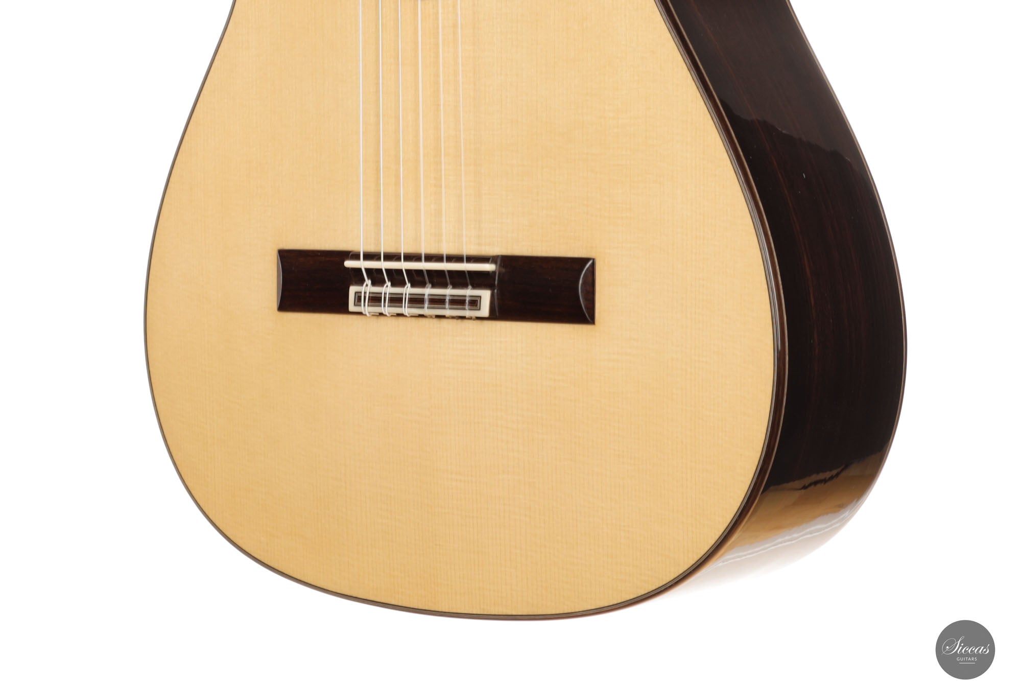 Dies ist Youris Double-Top-Modell, das ein innovatives Design bietet, bei dem italienische Fichte als Grundlage der Verbunddecke mit Western Red Cedar als unterer Schicht kombiniert wird. Diese anspruchsvolle Double-Top-Konstruktion erhöht die Stabilität und Reaktionsfähigkeit der Decke, was zu einem stärkeren Klangvolumen führt, während der traditionelle Klangcharakter durch eine traditionelle 7-Fächer-Beleistung erhalten bleibt. Boden und Zargen sind aus dunkel gemasertem, gerade gewachsenem indischem Palisander gefertigt, der der Gitarre Tiefe und Wärme verleiht. Zusätzlich verbessert das leicht erhöhte Griffbrett die Bespielbarkeit, erhöht die Stabilität des Halses und verringert das Risiko unbeabsichtigter Nagelspuren auf der Decke, wodurch diese wunderschön gefertigte Gitarre sowohl praktisch als auch eine Freude beim Spielen ist.