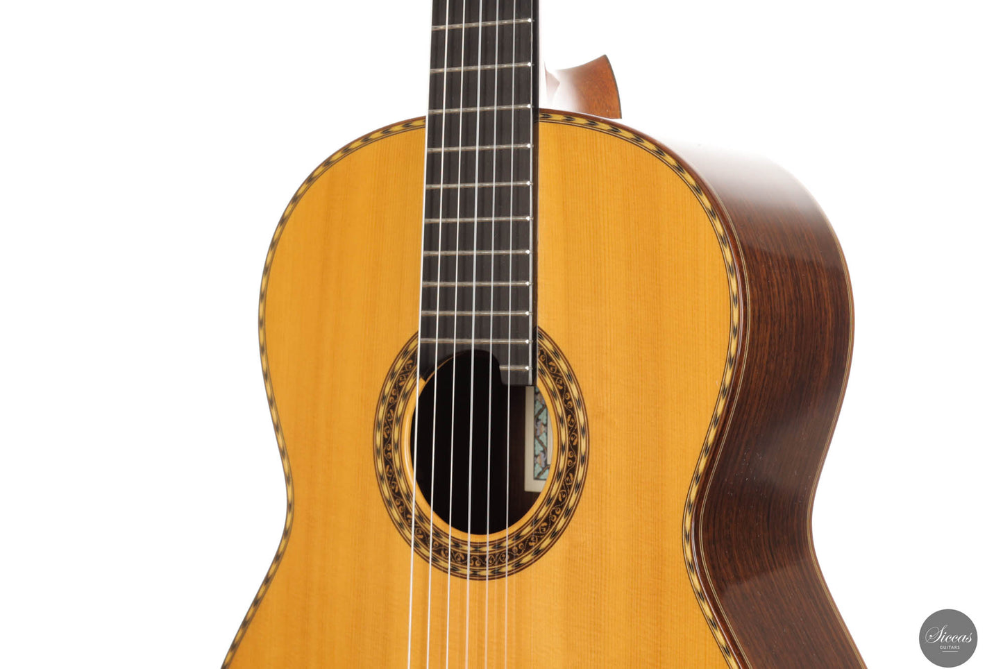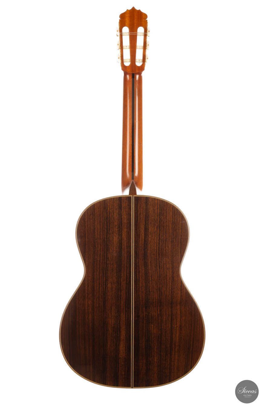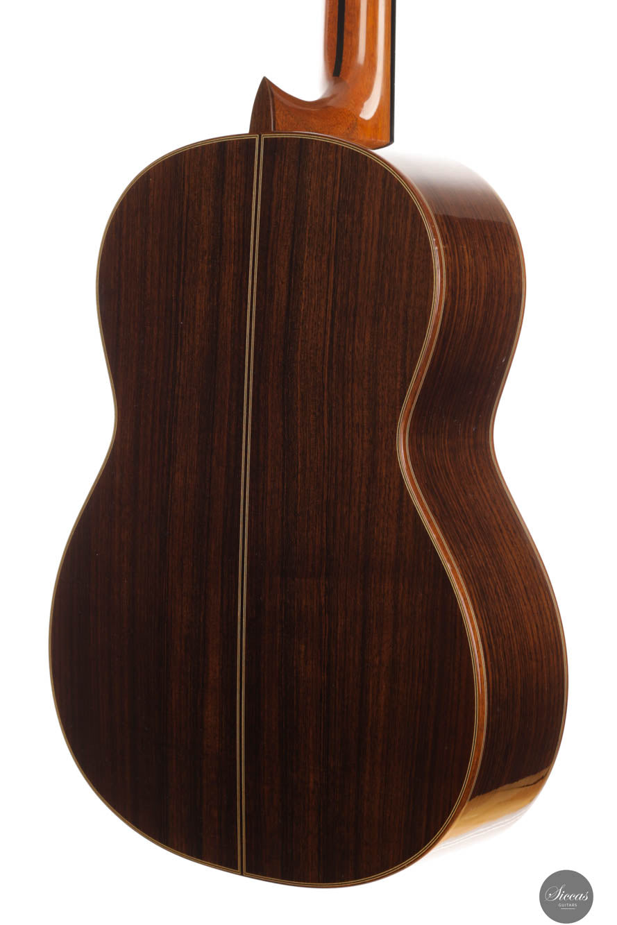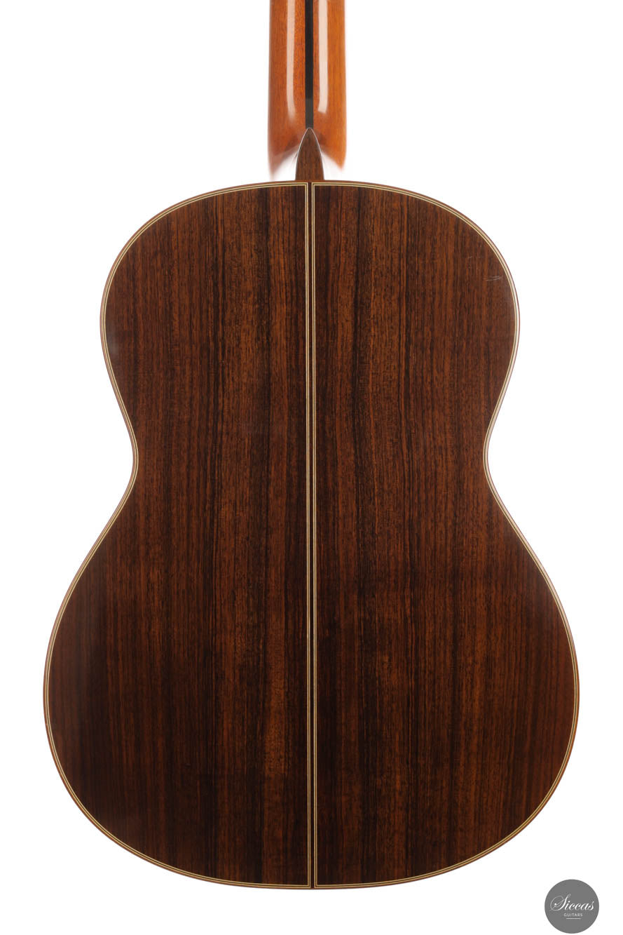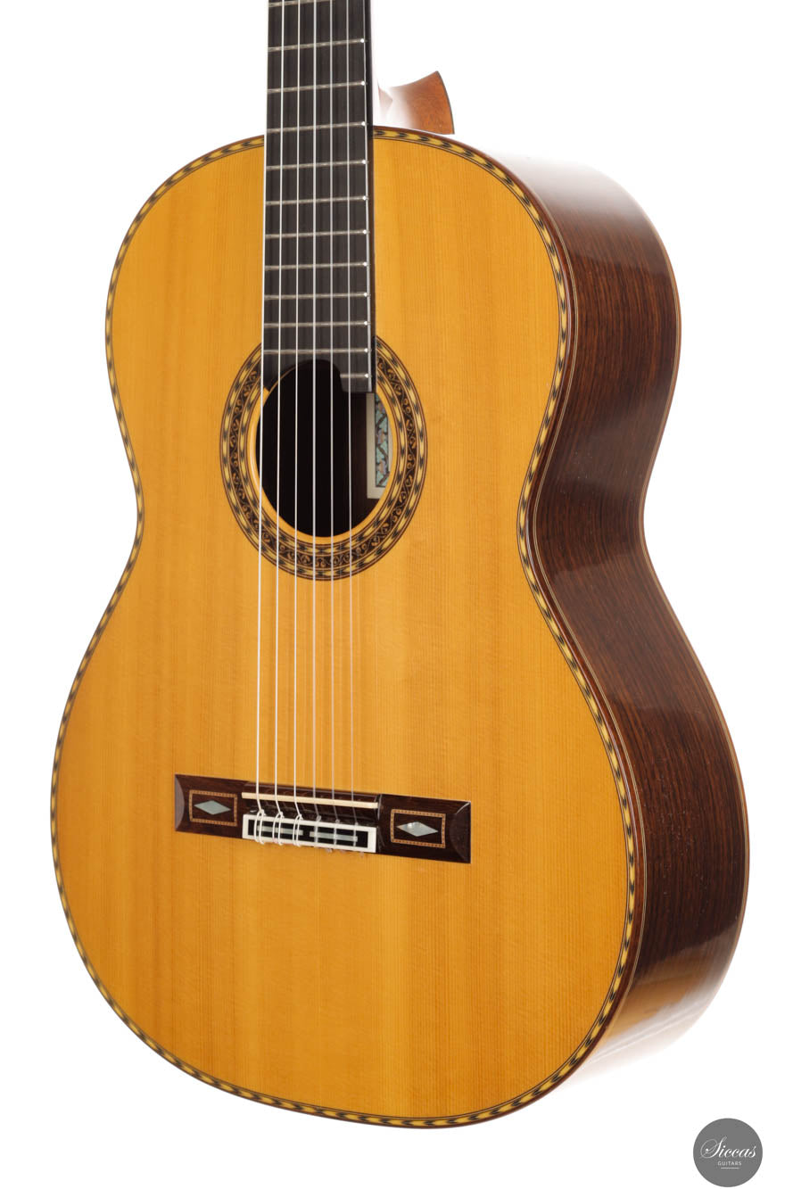 Dieses Instrument aus dem Jahr 2014 ist in jeder Hinsicht eine herausragende Konzertgitarre. Mit ihrem beeindruckenden Volumen, exzellenter Projektion, schneller Ansprache und eloquenter Stimmgebung ist sie die ideale vielseitige Gitarre für Bühnenauftritte, Studioaufnahmen oder kleinere Veranstaltungsorte. Das außergewöhnliche Handwerk von Imai zeigt sich in der aufwendig verzierten Fichtendecke, dem indischen Rosenholz für Boden und Zargen sowie der wunderschön geschnitzten Kopfplatte. Die Decke hat eine zarte honigfarbene Tönung, die durch ein sogenanntes „Cashew“-Finish erzielt wird. Sie befindet sich in ausgezeichnetem Zustand und hat einen gut entwickelten und gereiften Klang. Die festen Bässe und reichen Höhen, zusammen mit der hervorragenden Balance und der klaren Trennung der Töne, machen sie zu einem hochgradig anpassungsfähigen Instrument für jeden musikalischen Kontext. Insgesamt ist es eine Konzertgitarre auf professionellem Niveau von einem hoch angesehenen Gitarrenbauer zu einem großartigen Preis-Leistungs-Verhältnis.