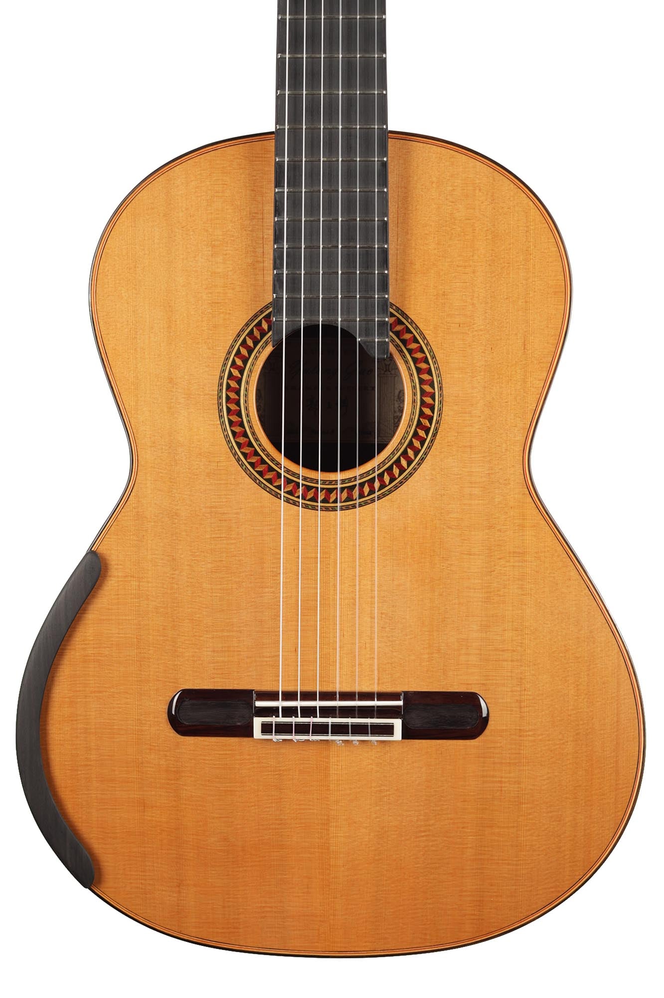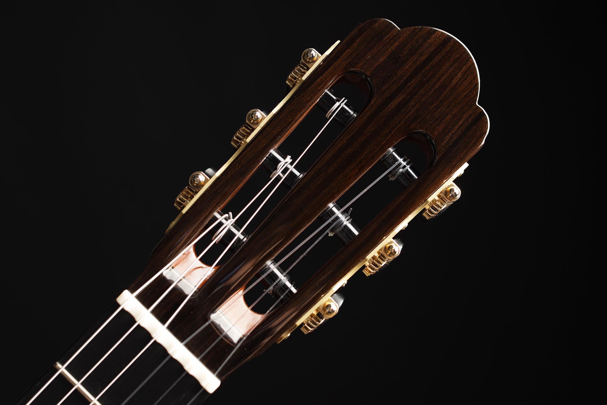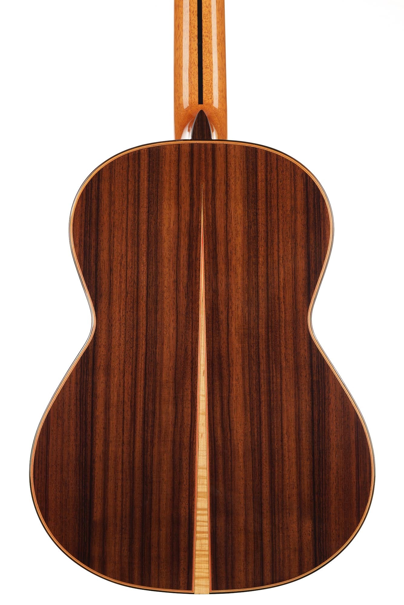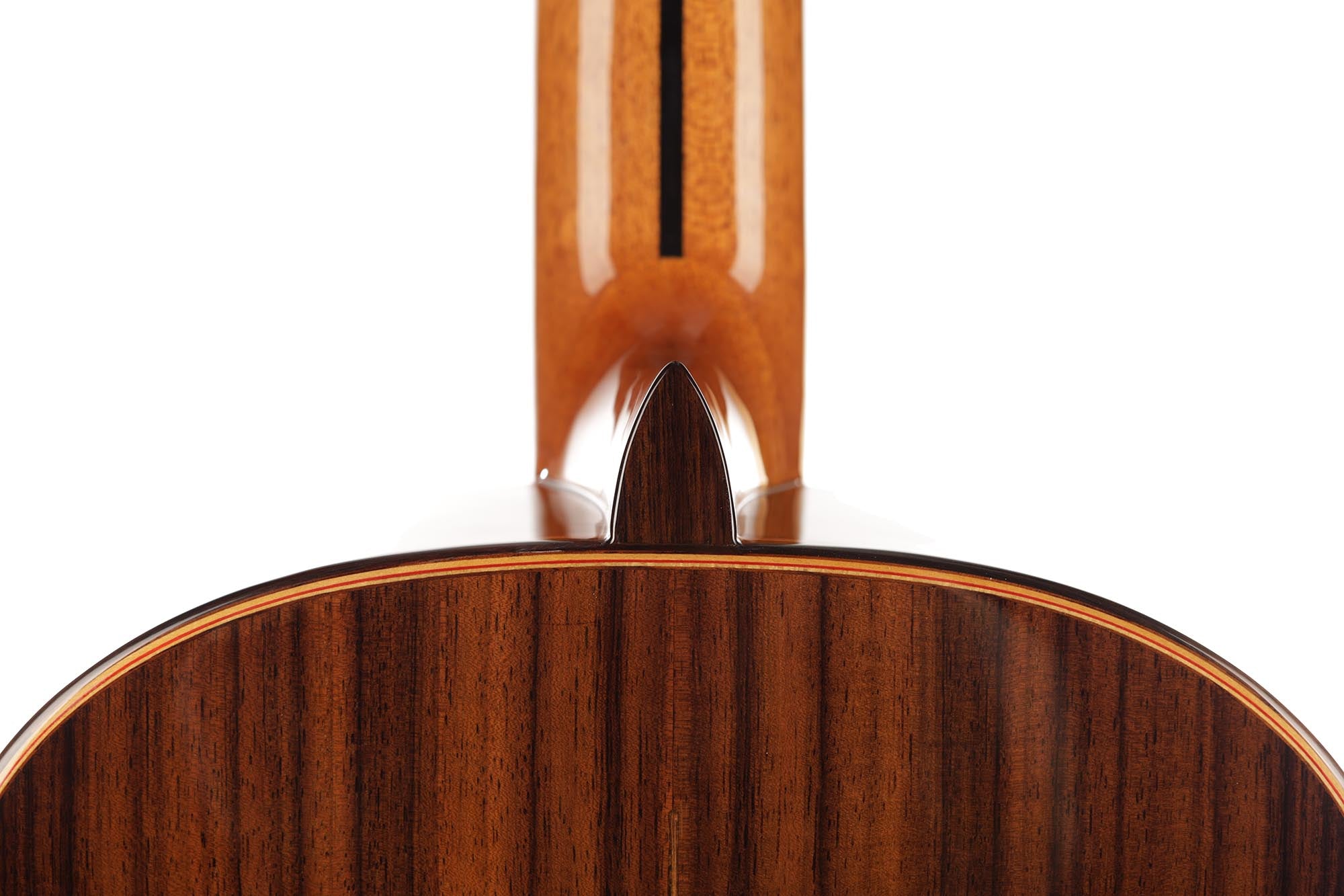 Für dieses Chamber-Concert-Modell wurde die neueste Gitarrenbautechnologie verwendet: eine Doppeldecke aus zwei ultradünnen Schichten von erstklassigem Zedernholz auf beiden Seiten einer Nomex-Schicht, um die für die Haltbarkeit der Decke erforderliche Festigkeit zu gewährleisten. Durch den Einsatz dieser Technik wird auch das Gewicht der Decke reduziert und damit das Klangvolumen und die Ansprache der Gitarre deutlich verbessert. Boden und Zargen sind aus indischen Palisanderholz gefertigt, gewölbt wie bei einer Geige. Diese Technik verleiht der Gitarre eine erstaunliche Klangprojektion und ein beeindruckendes Klangvolumen, was sie ideal für Konzertauftritte macht. Darüber hinaus ist der obere Teil des Korpus abgesenkt, um ein "erhöhtes Griffbrett" im Stil von Humphrey-Gitarren zu erhalten. Dank dieser leichten Anpassung der Höhe des Griffbretts wird die Bespielbarkeit in hohen Lagen stark verbessert.