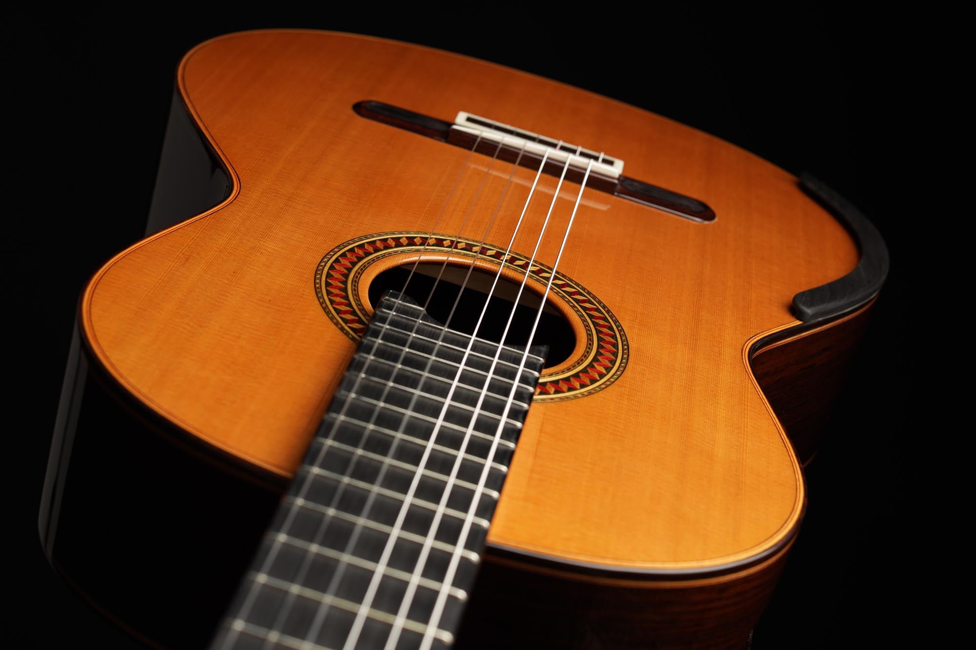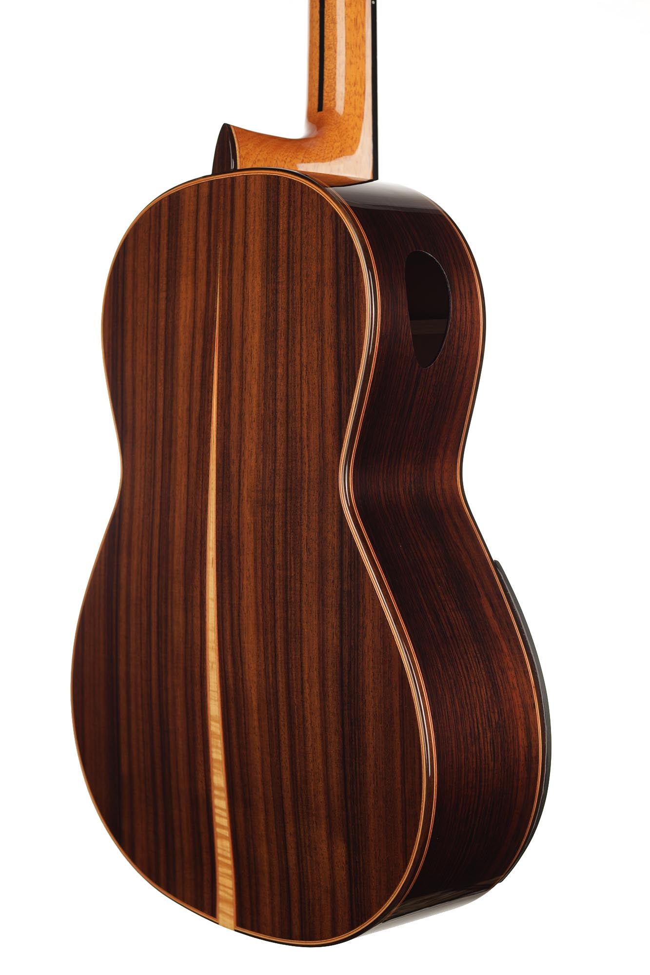 For this Chamber Concert model, the latest classical guitar technology was used: double-top with two ultra-thin layers of first-class cedar on either side of a layer of Nomex to give the strength needed for the durability of the top. Using this technique also reduces the soundboard’s weight, and therefore enhances the guitar’s sound volume and responsiveness by far. Back and sides are made of Indian Rosewood, arched in the manner of the violin. This technique gives the guitar an amazing sound projection and volume, making it ideal for concert performances. Moreover, the upper bout of the body is sloped to provide a ‘raised fingerboard’ in the style of Humphrey guitars. Thanks to this slight change in the height of the fretboard, the playability of the trebles in high positions is greatly improved. A techwood armrest, ultra-smooth frets along with an extra sound port on the side, and a low string action make the Chamber Concert model exceptionally easy and comfortable to play.