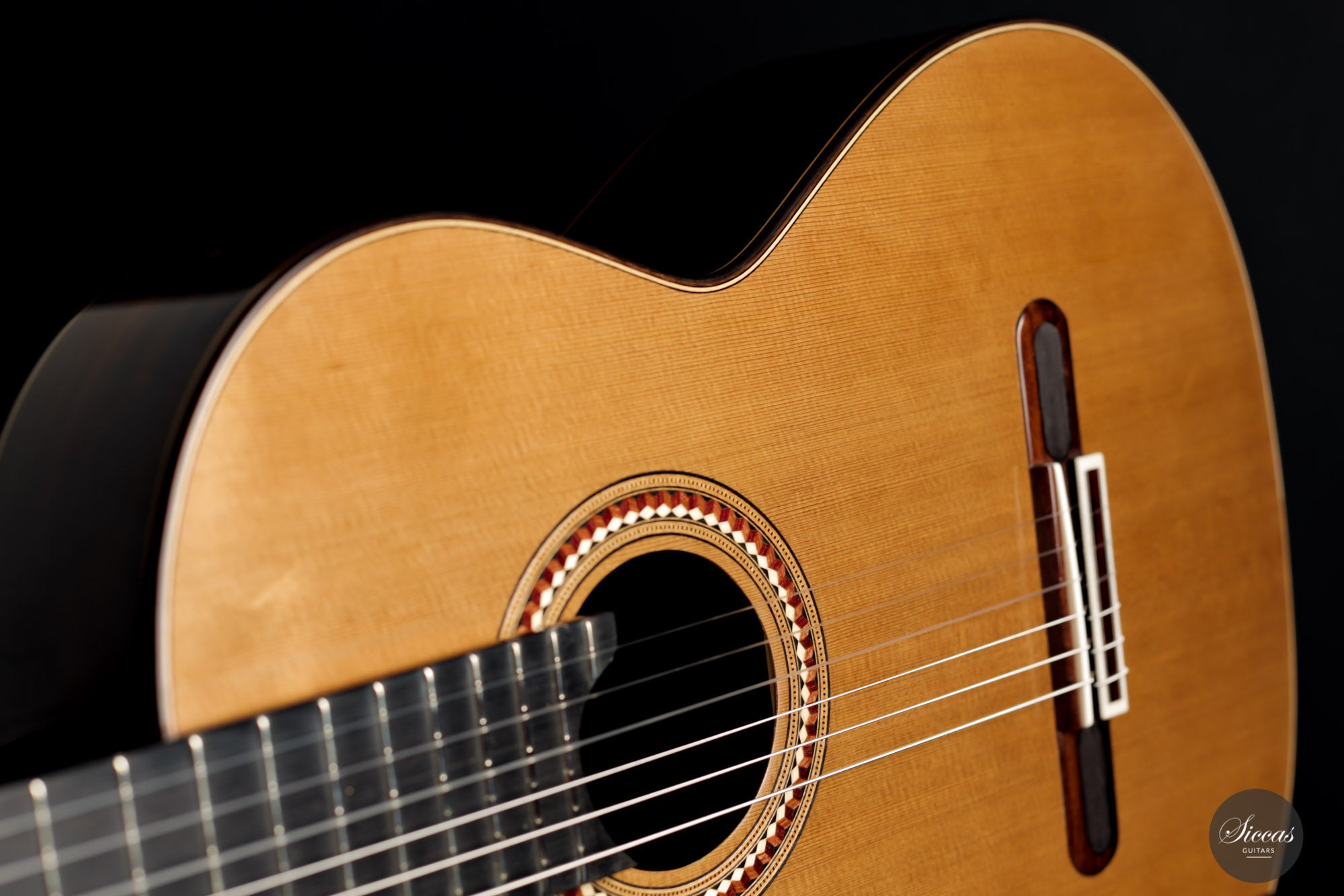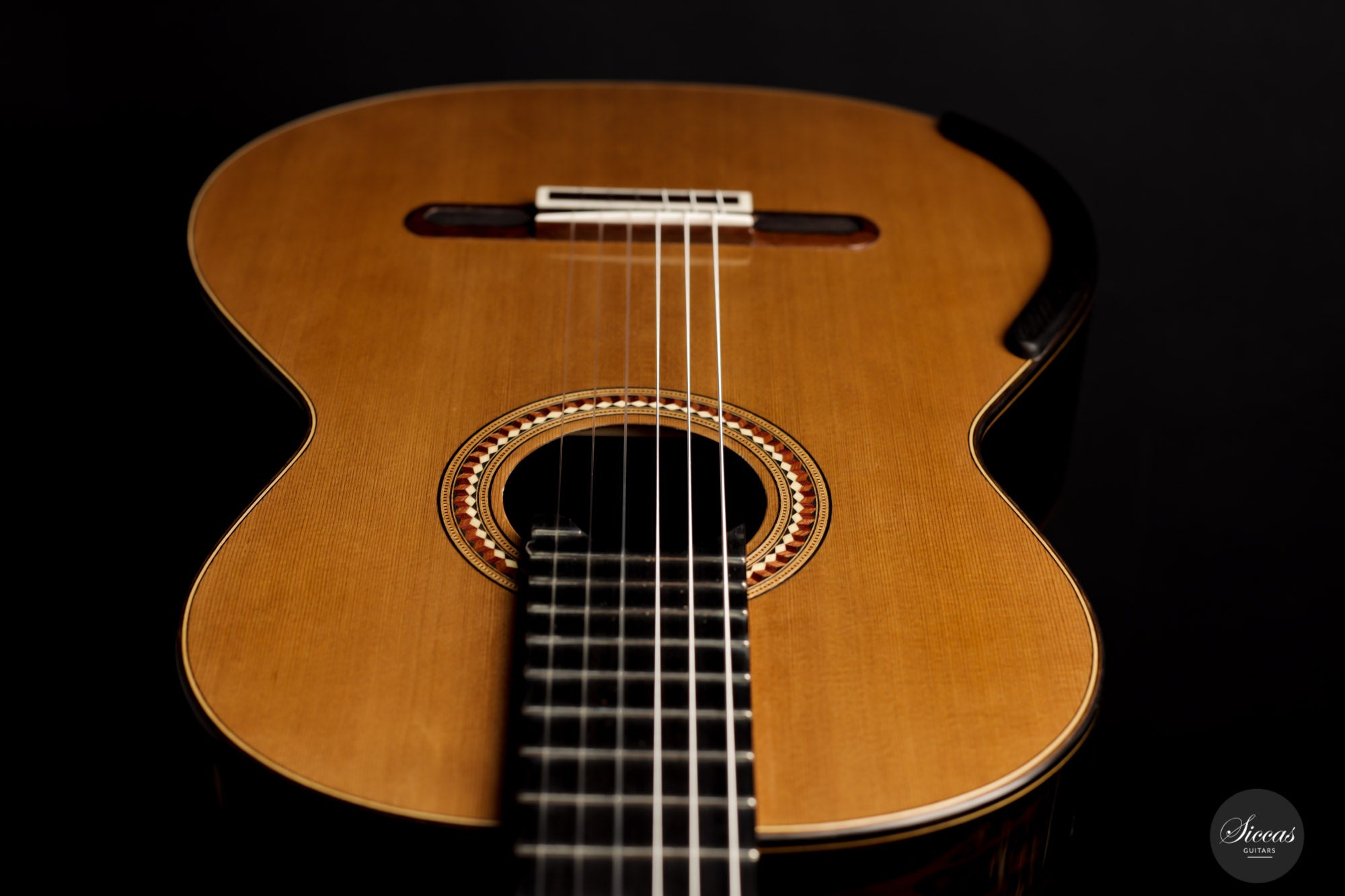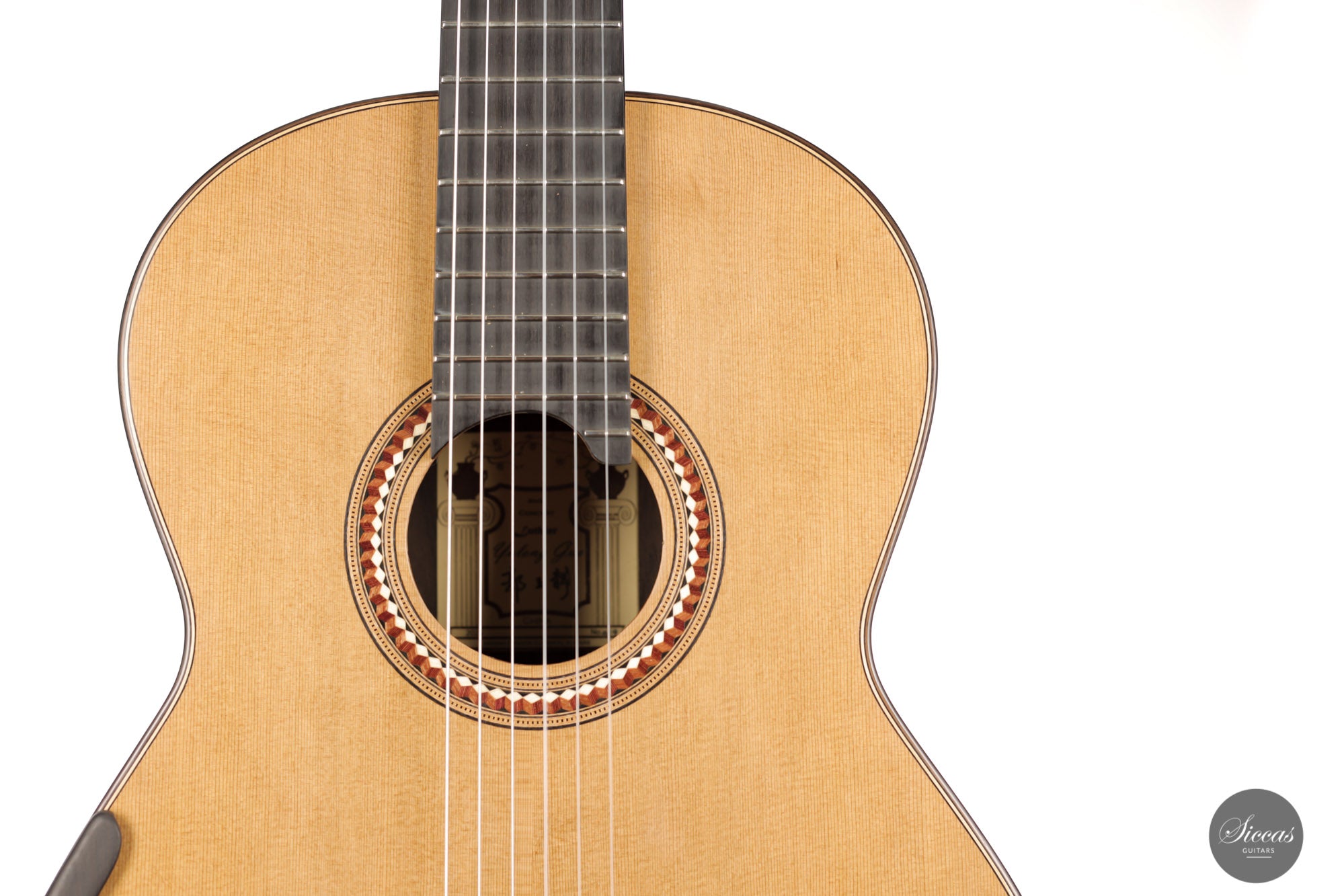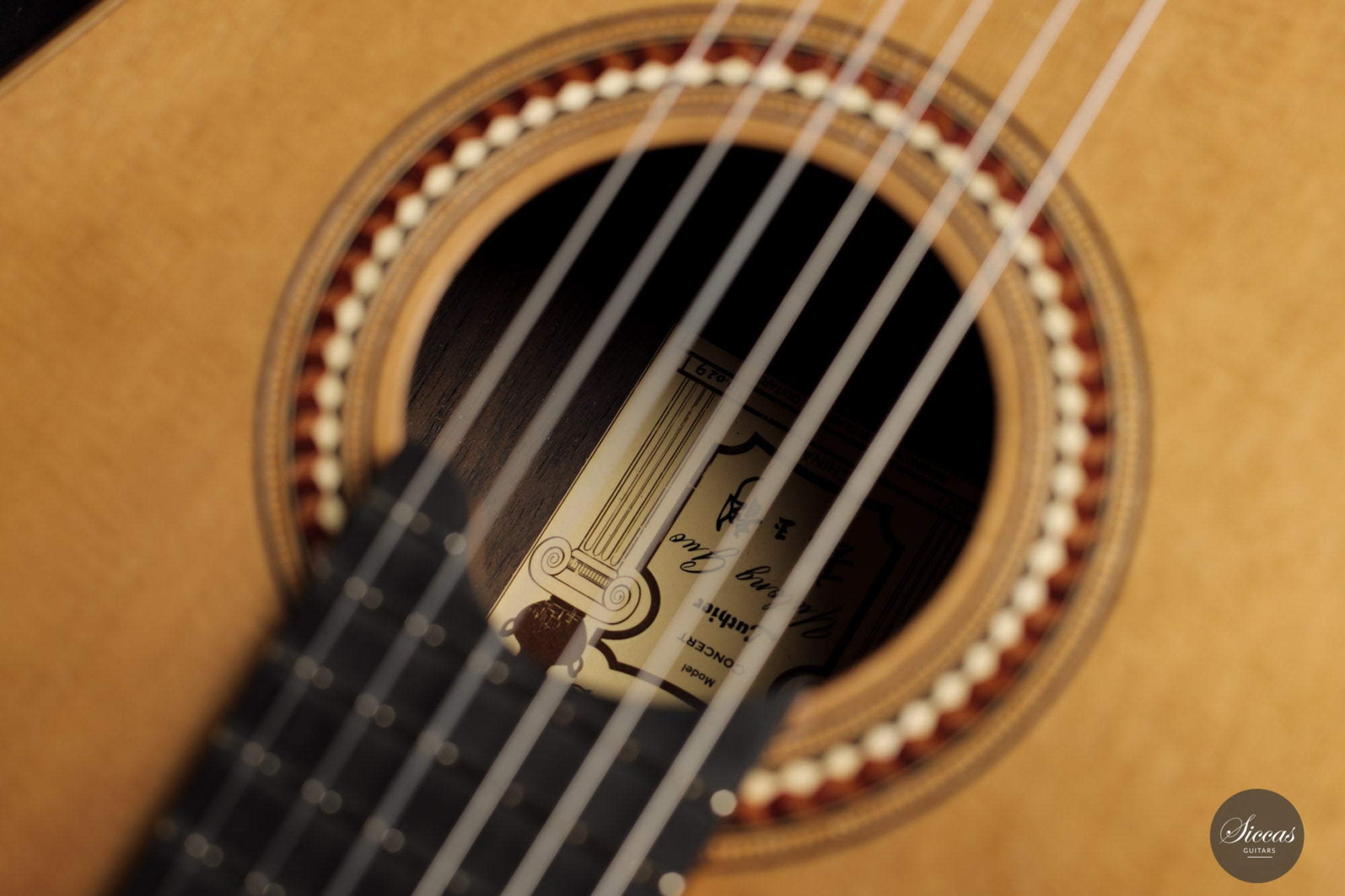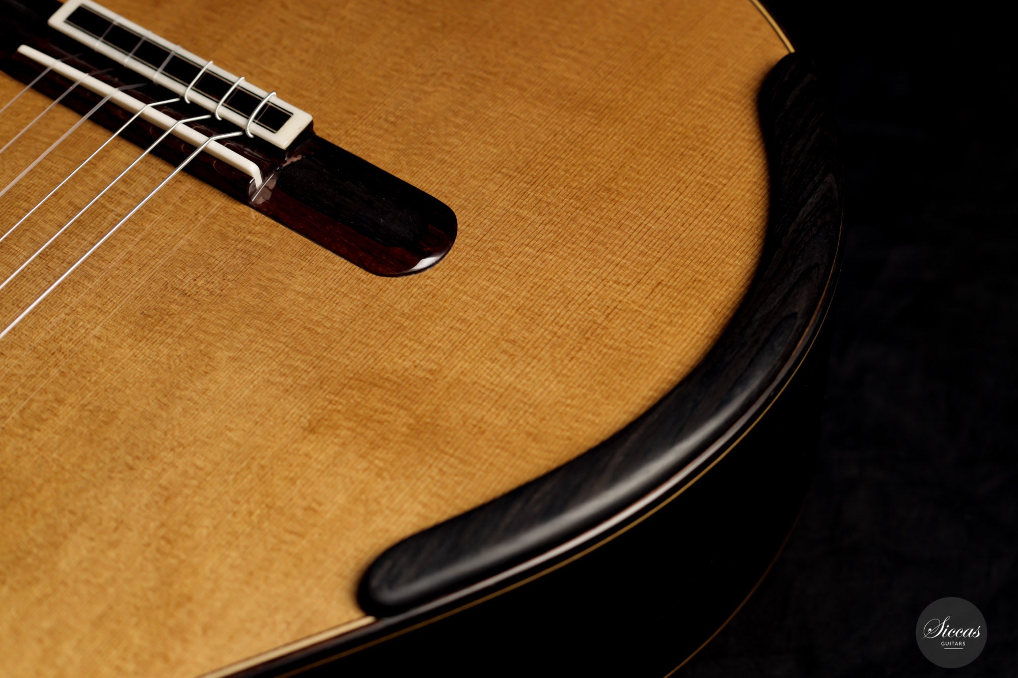This Concert model is a real upgrade from the Chamber Concert model, with a French polished top and a generally more elaborated construction. It is really designed to please the guitarist, particularly the one looking for a powerful tone, ideal playing comfort, and a reliable stage instrument. The elevated fingerboard, the additional sound port on the side, and the armrest combined with a lattice double top soundboard make for a first-class modern concert guitar
