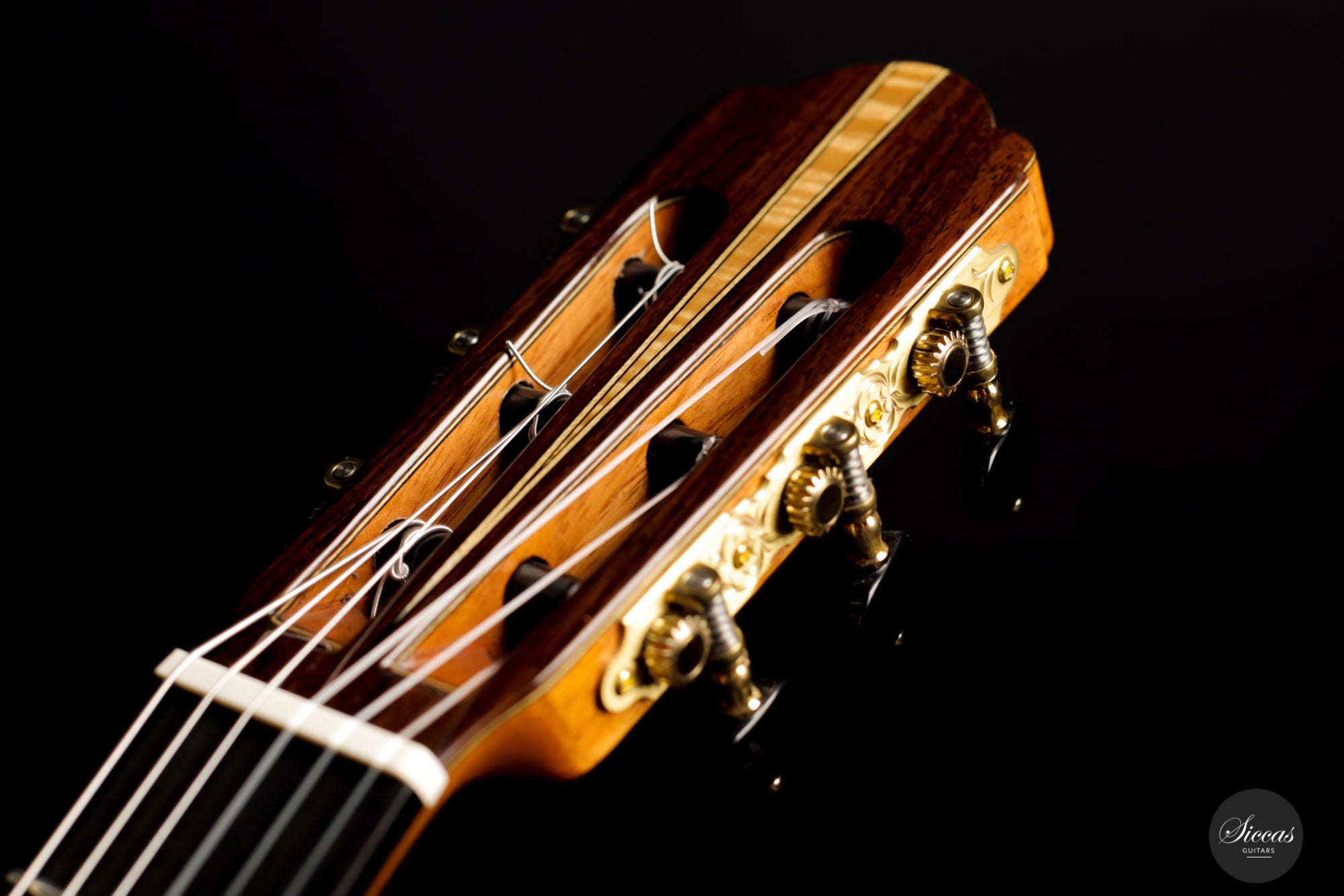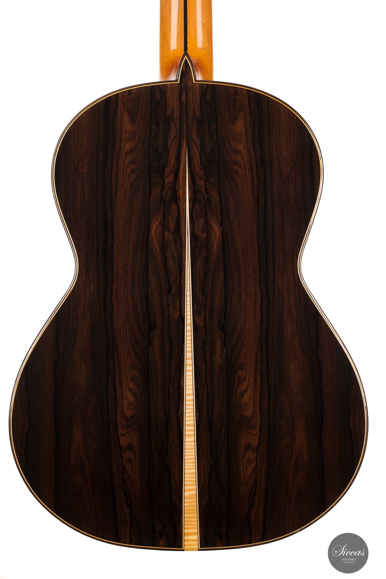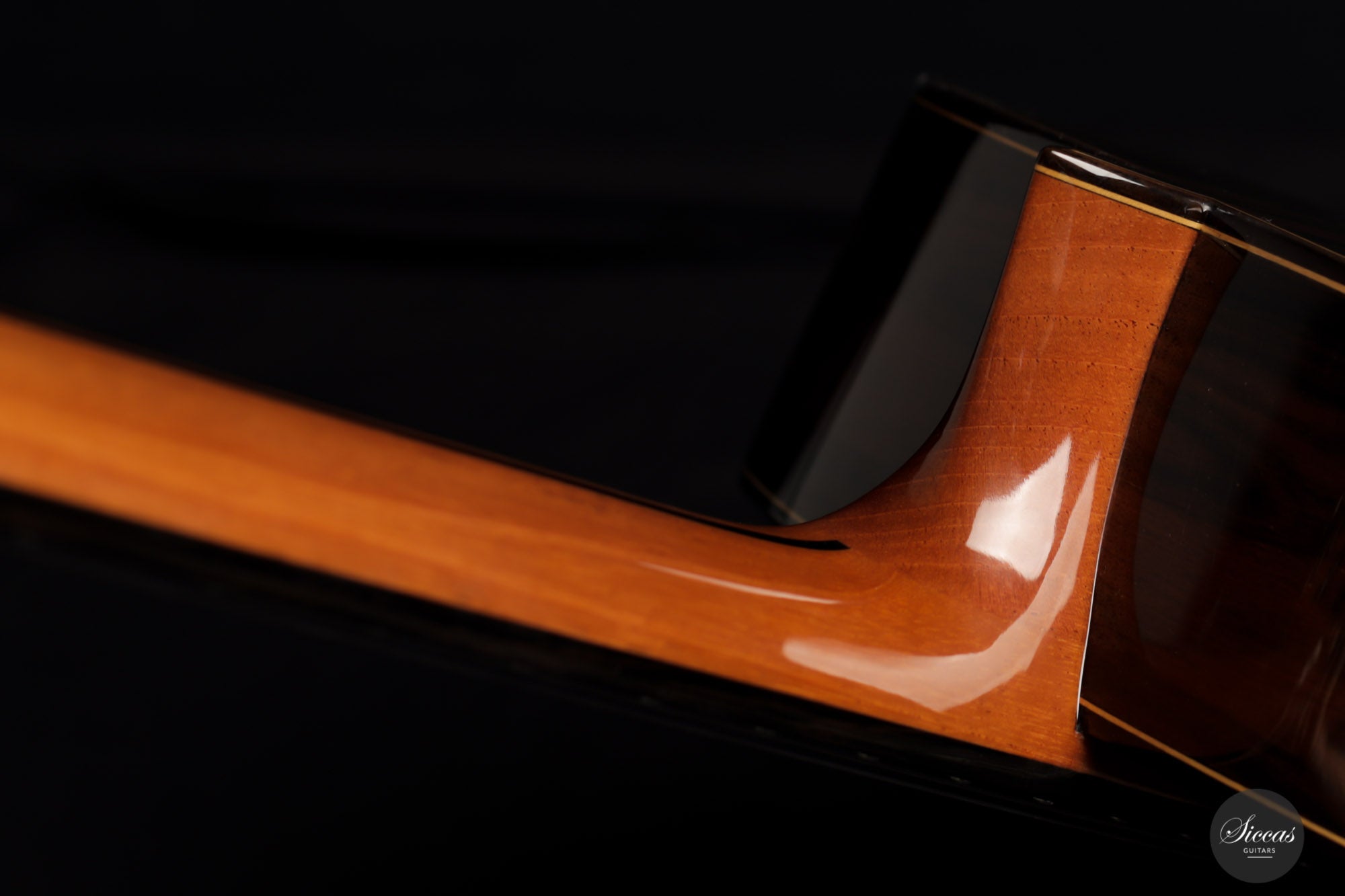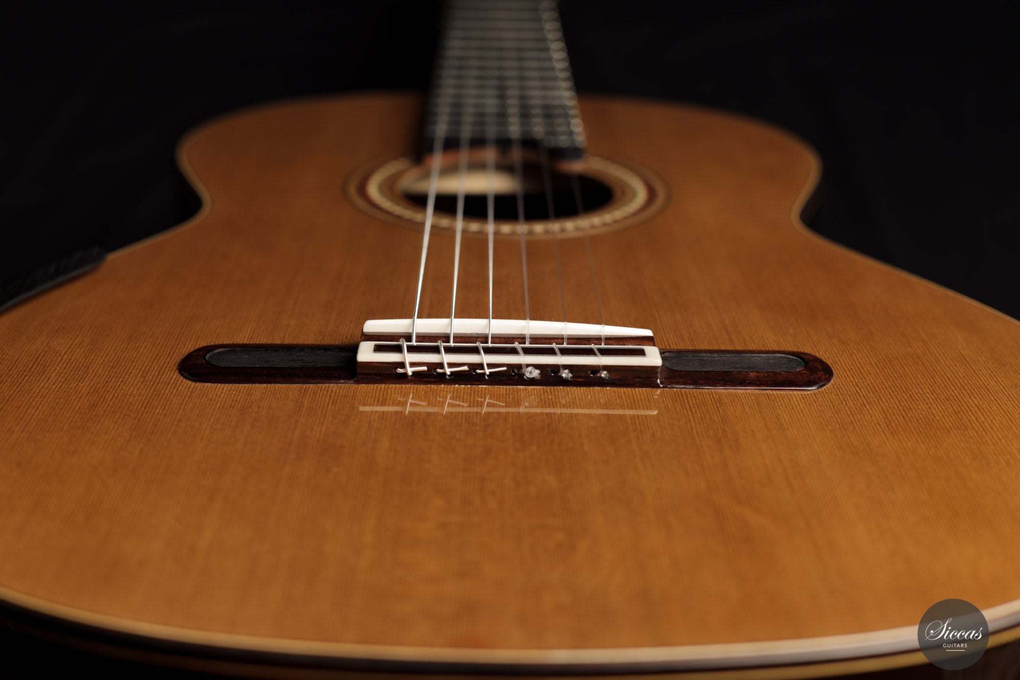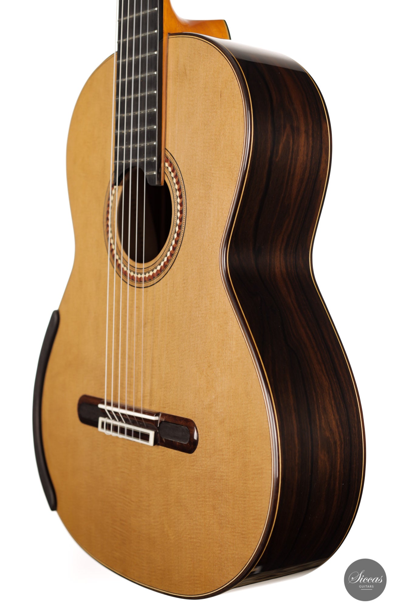 This Concert model is a real upgrade from the Chamber Concert model, with a French polished top and a generally more elaborated construction. It is really designed to please the guitarist, particularly the one looking for a powerful tone, ideal playing comfort, and a reliable stage instrument. The elevated fingerboard, the additional sound port on the side, and the armrest combined with a lattice double top soundboard make for a first-class modern concert guitar