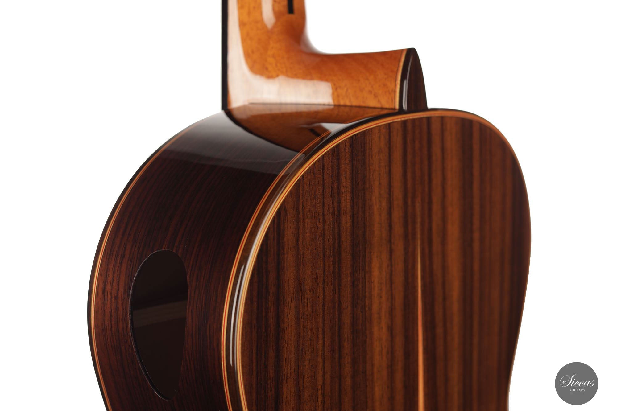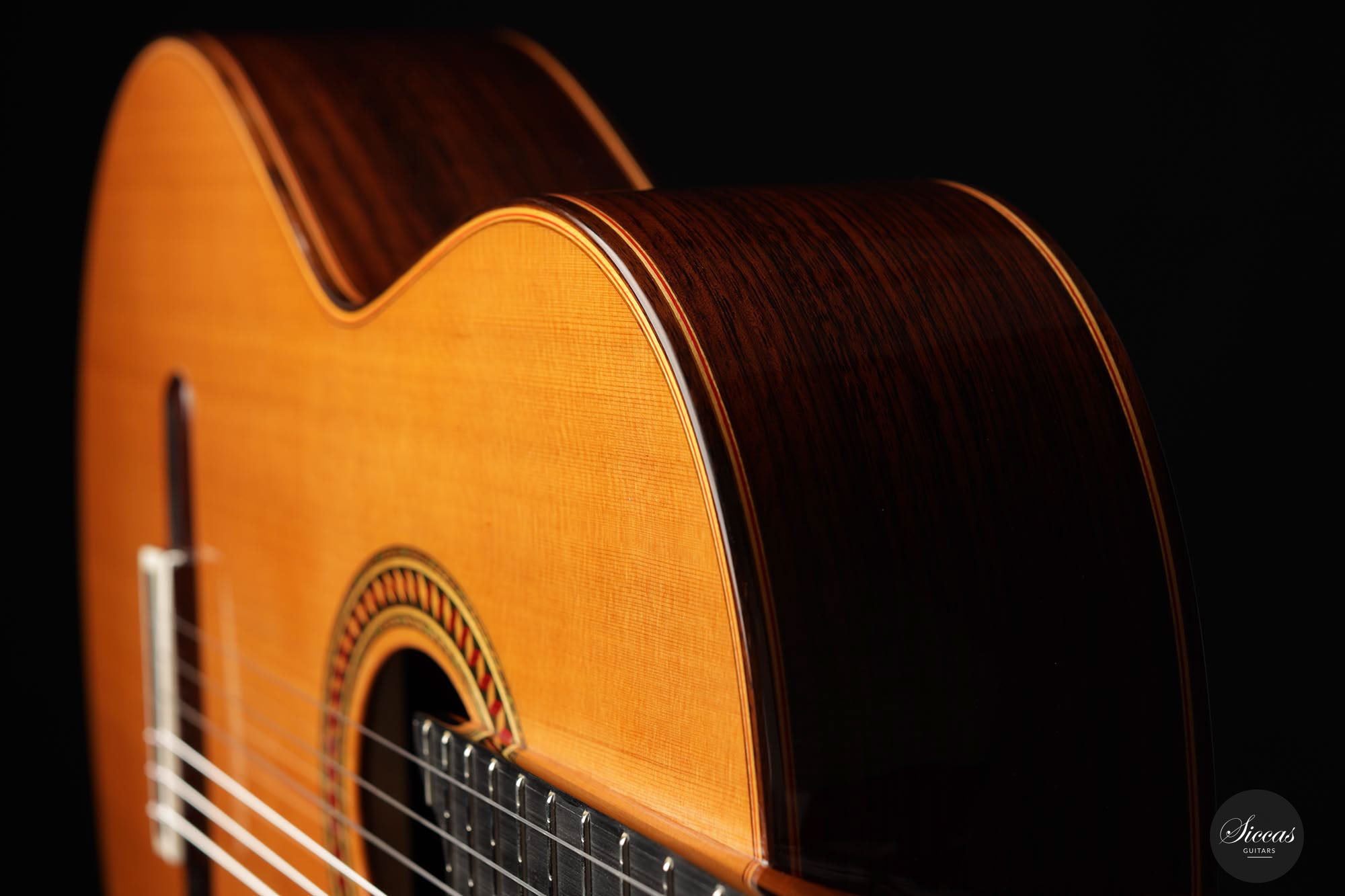 For this Chamber Concert model, the latest classical guitar technology was used: double-top with two ultra-thin layers of first-class cedar on either side of a layer of Nomex to give the strength needed for the durability of the top. Using this technique also reduces the soundboard’s weight, and therefore enhances the guitar’s sound volume and responsiveness by far. Back and sides are made of Indian Rosewood, arched in the manner of the violin. This technique gives the guitar an amazing sound projection and volume, making it ideal for concert performances. Moreover, the upper bout of the body is sloped to provide a ‘raised fingerboard’ in the style of Humphrey guitars. Thanks to this slight change in the height of the fretboard, the playability of the trebles in high positions is greatly improved. A techwood armrest, ultra-smooth frets along with an extra sound port on the side, and a low string action make the Chamber Concert model exceptionally easy and comfortable to play.