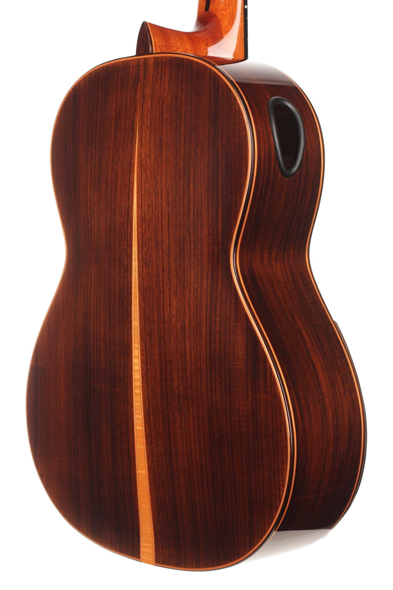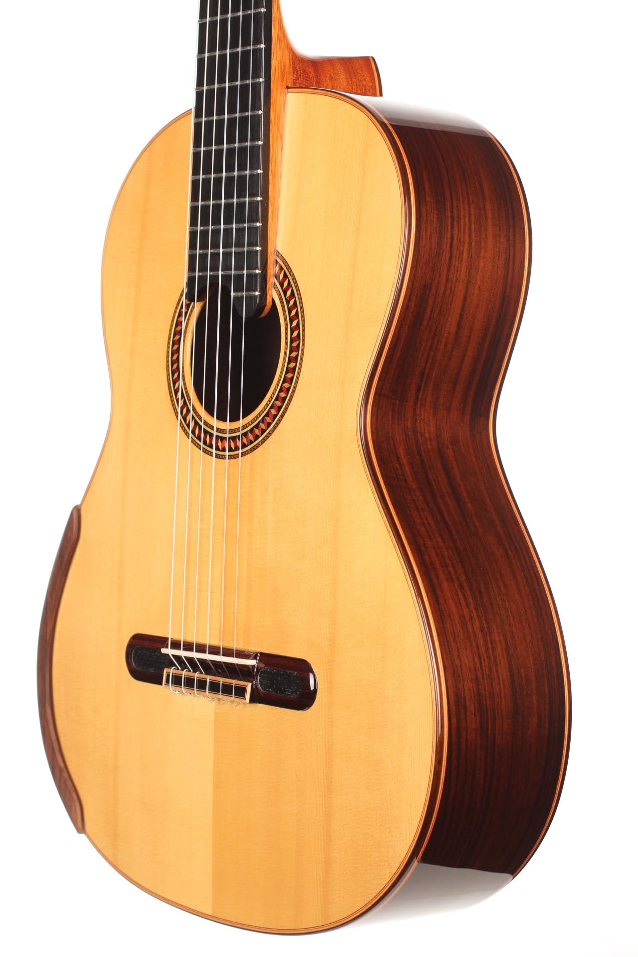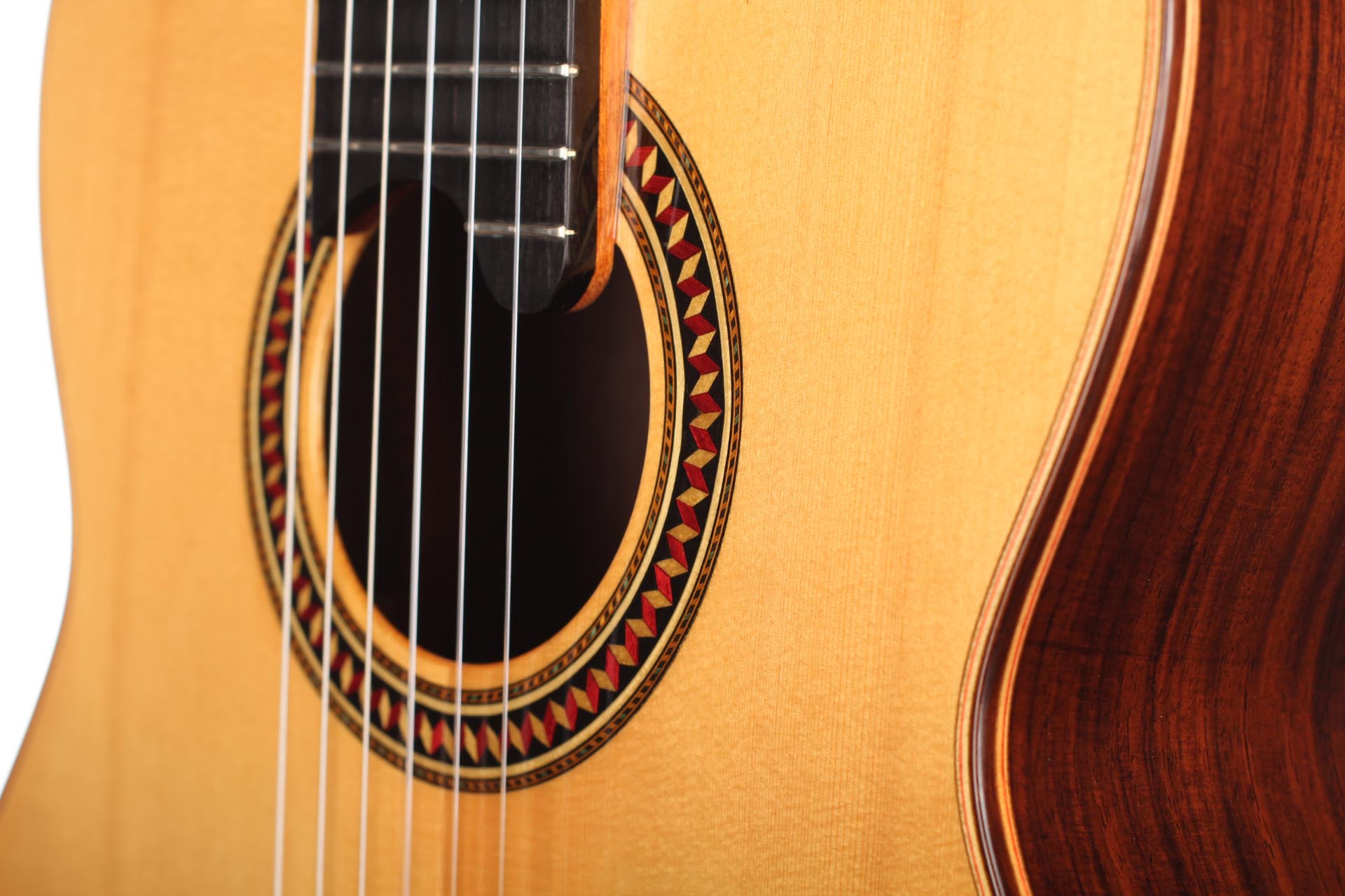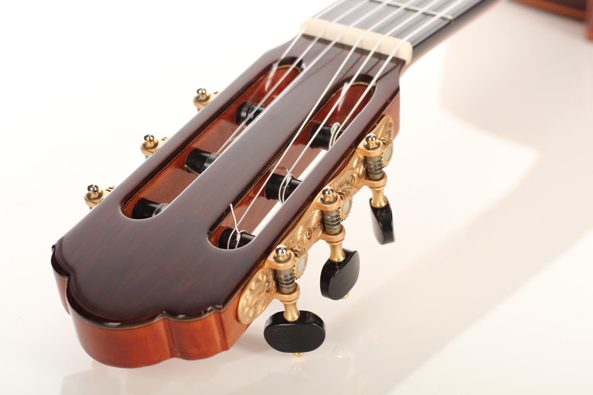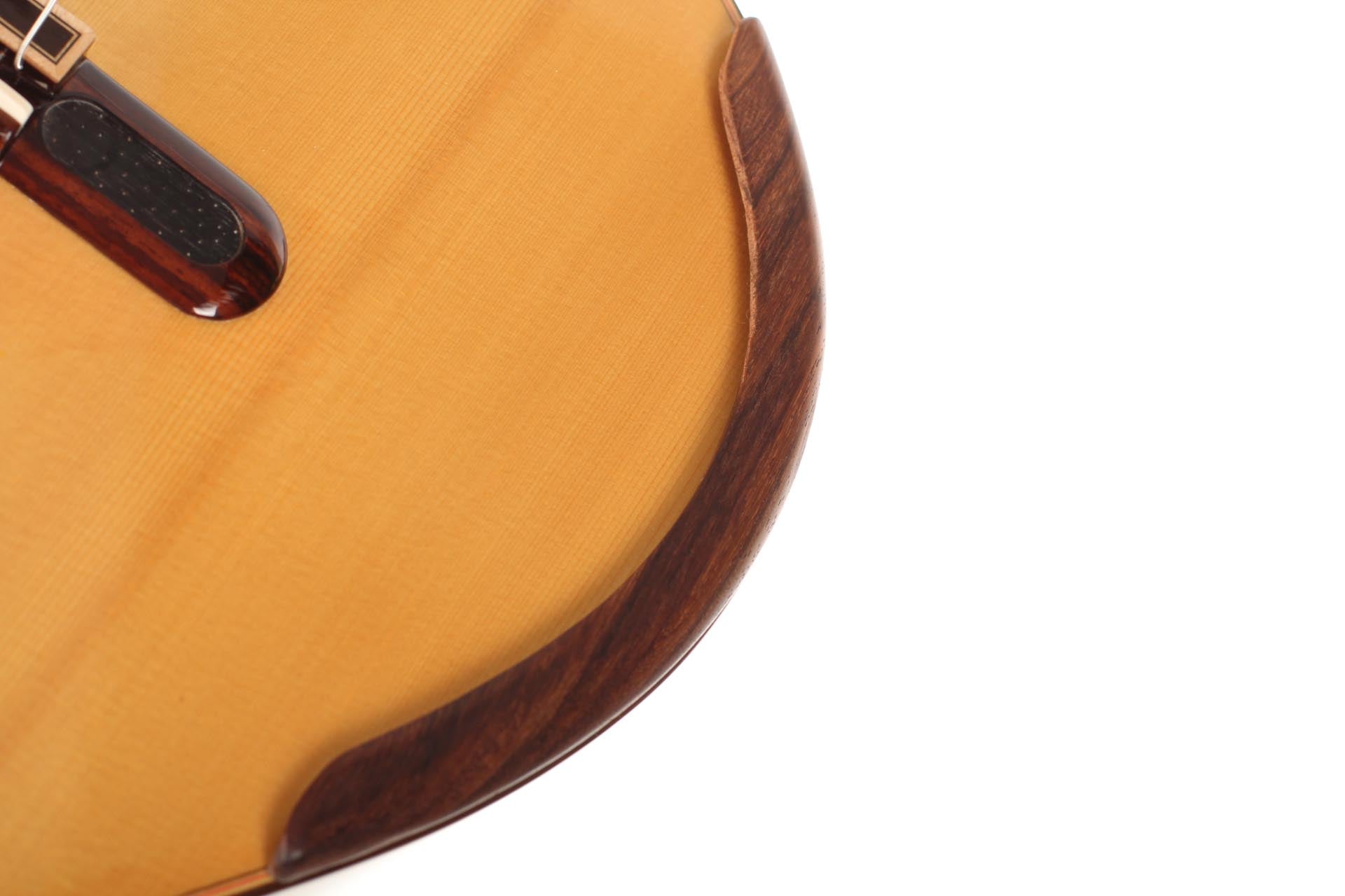 For this Chamber Concert model the latest classical guitar technology was used: double-top with two ultra-thin layers of high quality sound woods on either side of a layer of Nomex to give the strength needed for the durability of the top. Back and sides are made of solid Indian Rosewood. The arched “violin back” gives the guitar amazing sound projection and volume, making it ideal for concert performances. The upper bout of the body is sloped to give a ‘raised fingerboard’ in the style of Humphrey guitars. The ebony fingerboard is 52 mm in width at the nut and 62 mm at the 12th fret. The fingerboard also extends to the 20th fret for the treble strings. A rosewood armrest, ultra-smooth frets, a slight radius in the fingerboard and a low string action make the Chamber Concert exceptionally easy and comfortable to play. The orignal hard-sehll case is included.