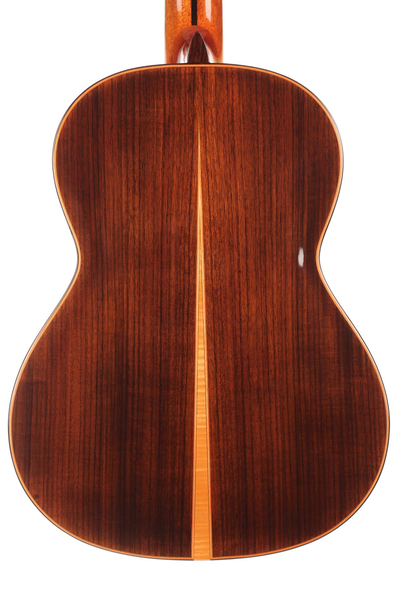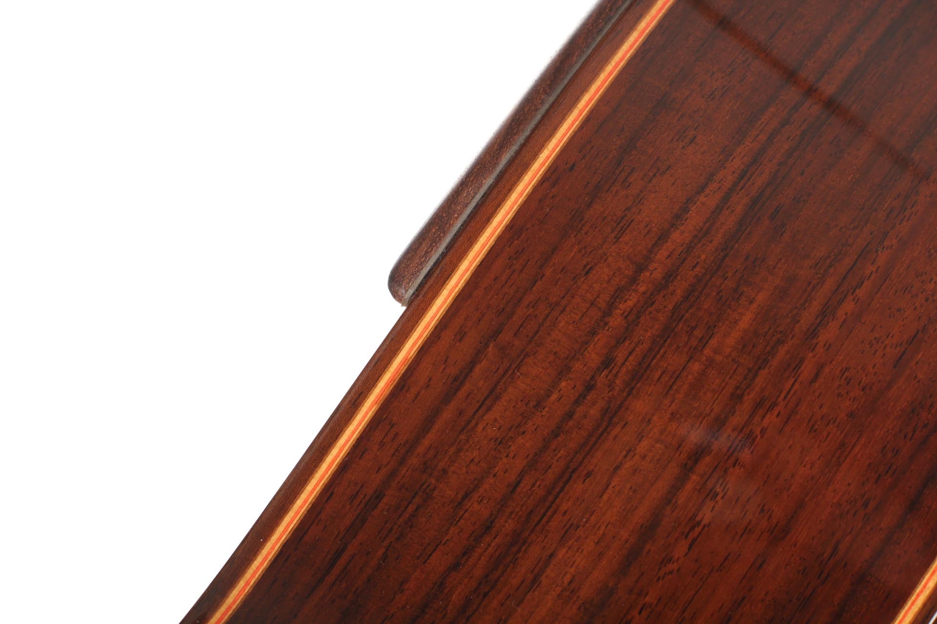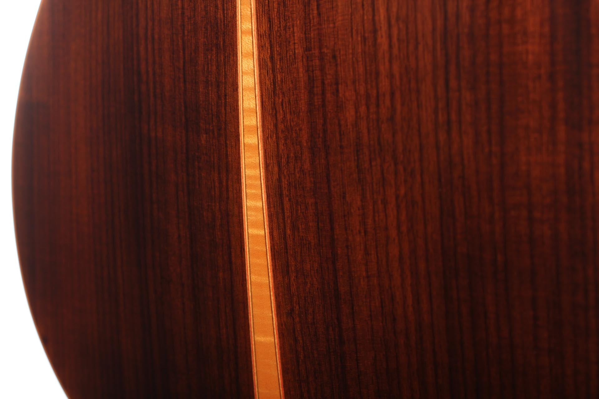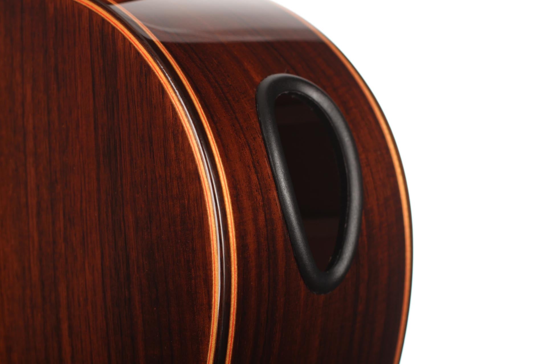 For this Chamber Concert model the latest classical guitar technology was used: double-top with two ultra-thin layers of high quality sound woods on either side of a layer of Nomex to give the strength needed for the durability of the top. Back and sides are made of solid Indian Rosewood. The arched “violin back” gives the guitar amazing sound projection and volume, making it ideal for concert performances. The upper bout of the body is sloped to give a ‘raised fingerboard’ in the style of Humphrey guitars. The ebony fingerboard is 52 mm in width at the nut and 62 mm at the 12th fret. The fingerboard also extends to the 20th fret for the treble strings. A rosewood armrest, ultra-smooth frets, a slight radius in the fingerboard and a low string action make the Chamber Concert exceptionally easy and comfortable to play. The orignal hard-sehll case is included.