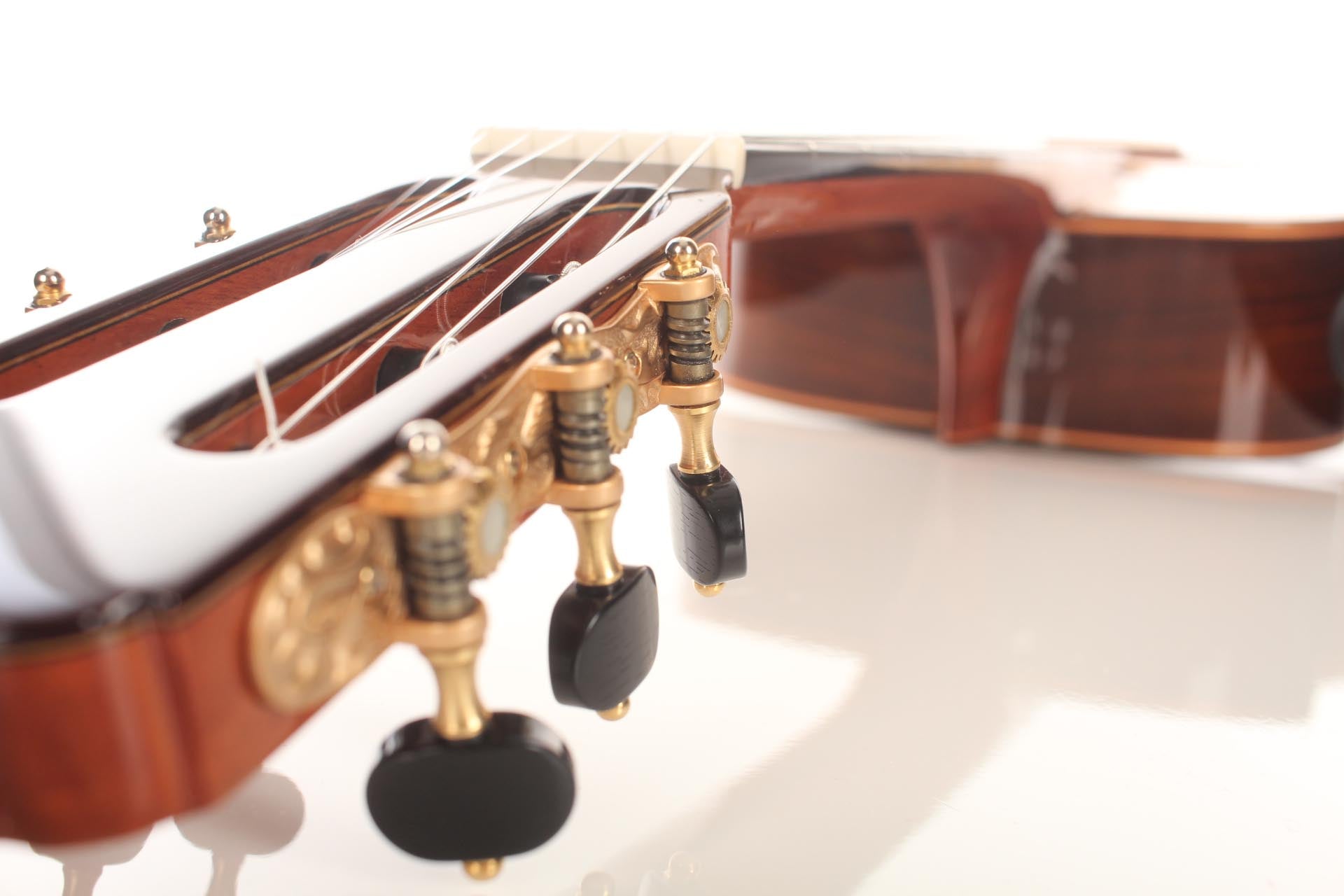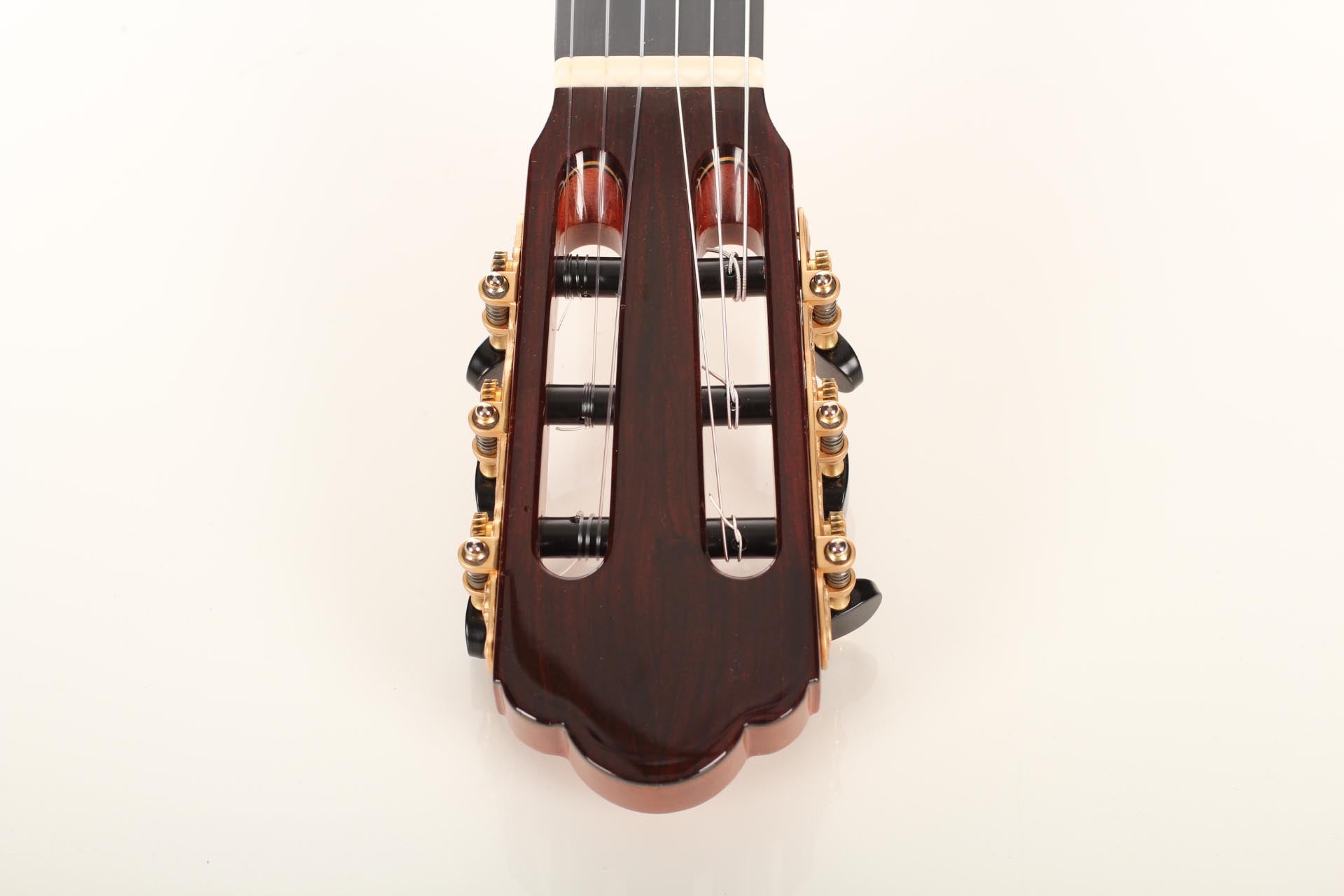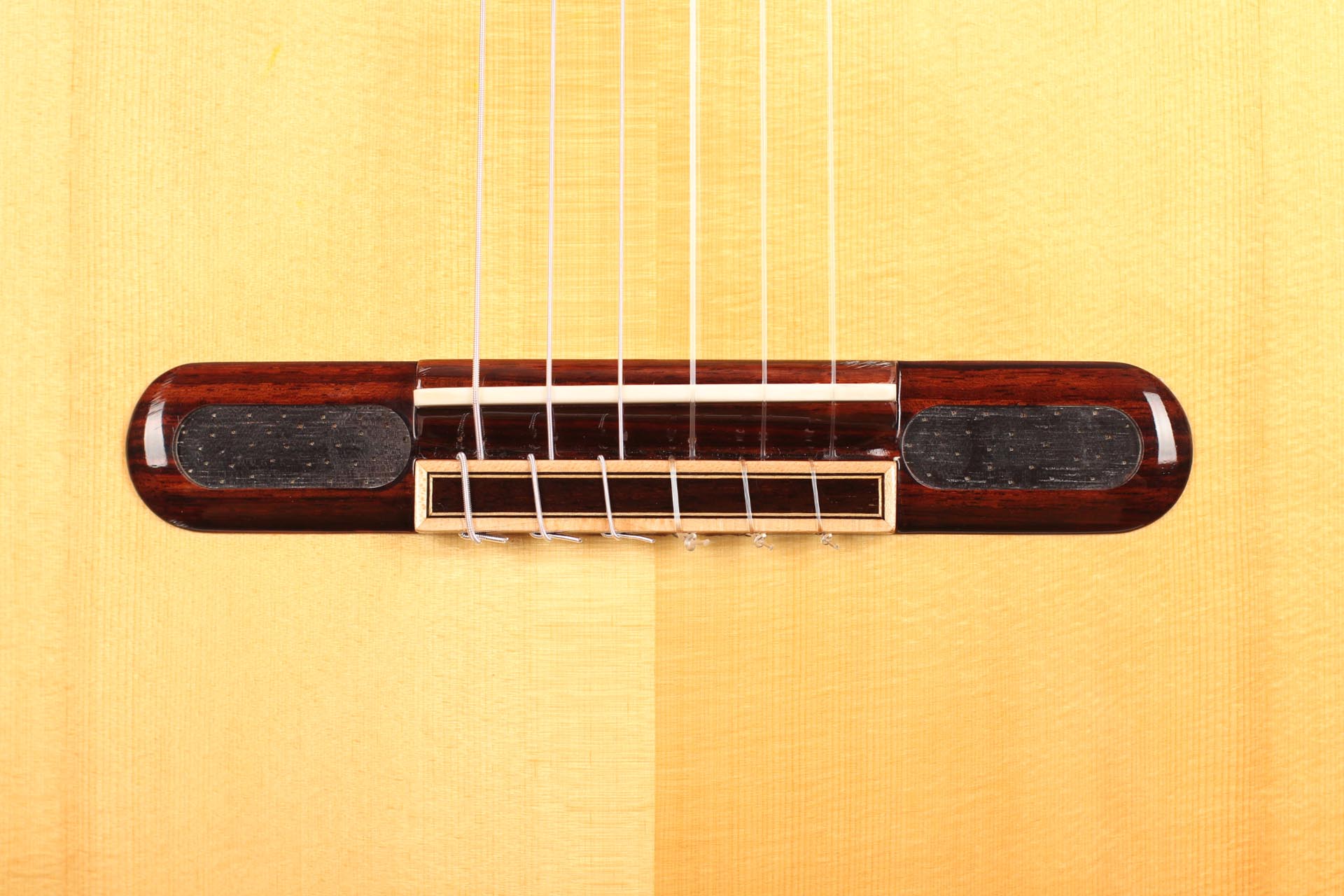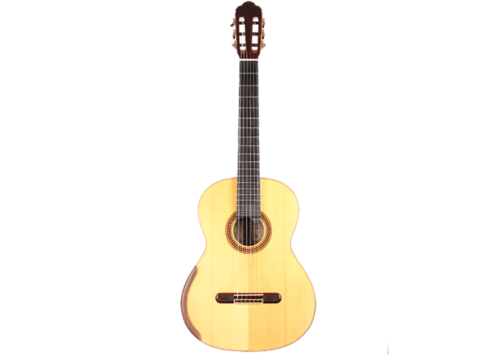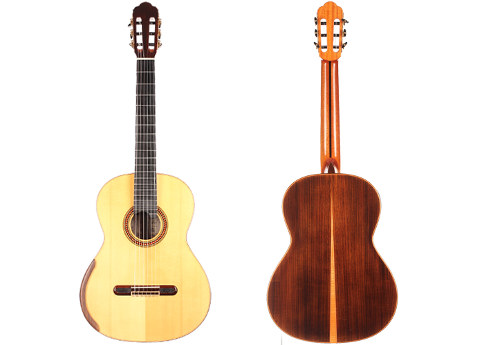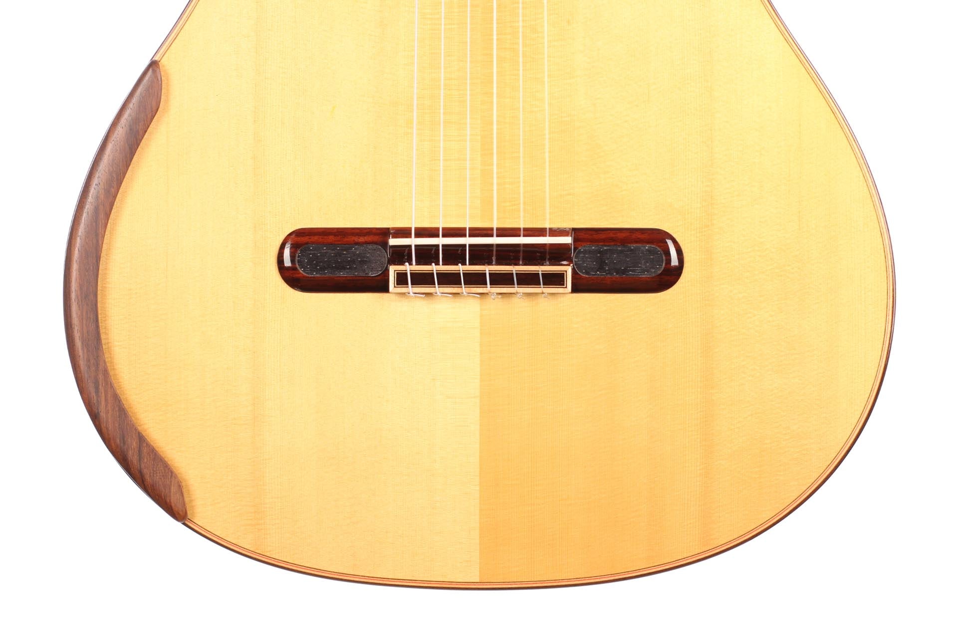 For this Chamber Concert model the latest classical guitar technology was used: double-top with two ultra-thin layers of high quality sound woods on either side of a layer of Nomex to give the strength needed for the durability of the top. Back and sides are made of solid Indian Rosewood. The arched “violin back” gives the guitar amazing sound projection and volume, making it ideal for concert performances. The upper bout of the body is sloped to give a ‘raised fingerboard’ in the style of Humphrey guitars. The ebony fingerboard is 52 mm in width at the nut and 62 mm at the 12th fret. The fingerboard also extends to the 20th fret for the treble strings. A rosewood armrest, ultra-smooth frets, a slight radius in the fingerboard and a low string action make the Chamber Concert exceptionally easy and comfortable to play. The orignal hard-sehll case is included.