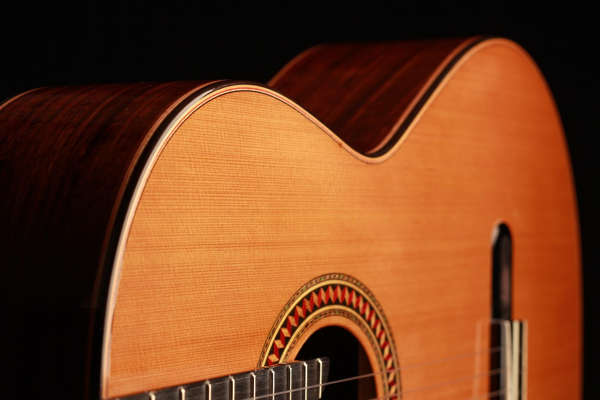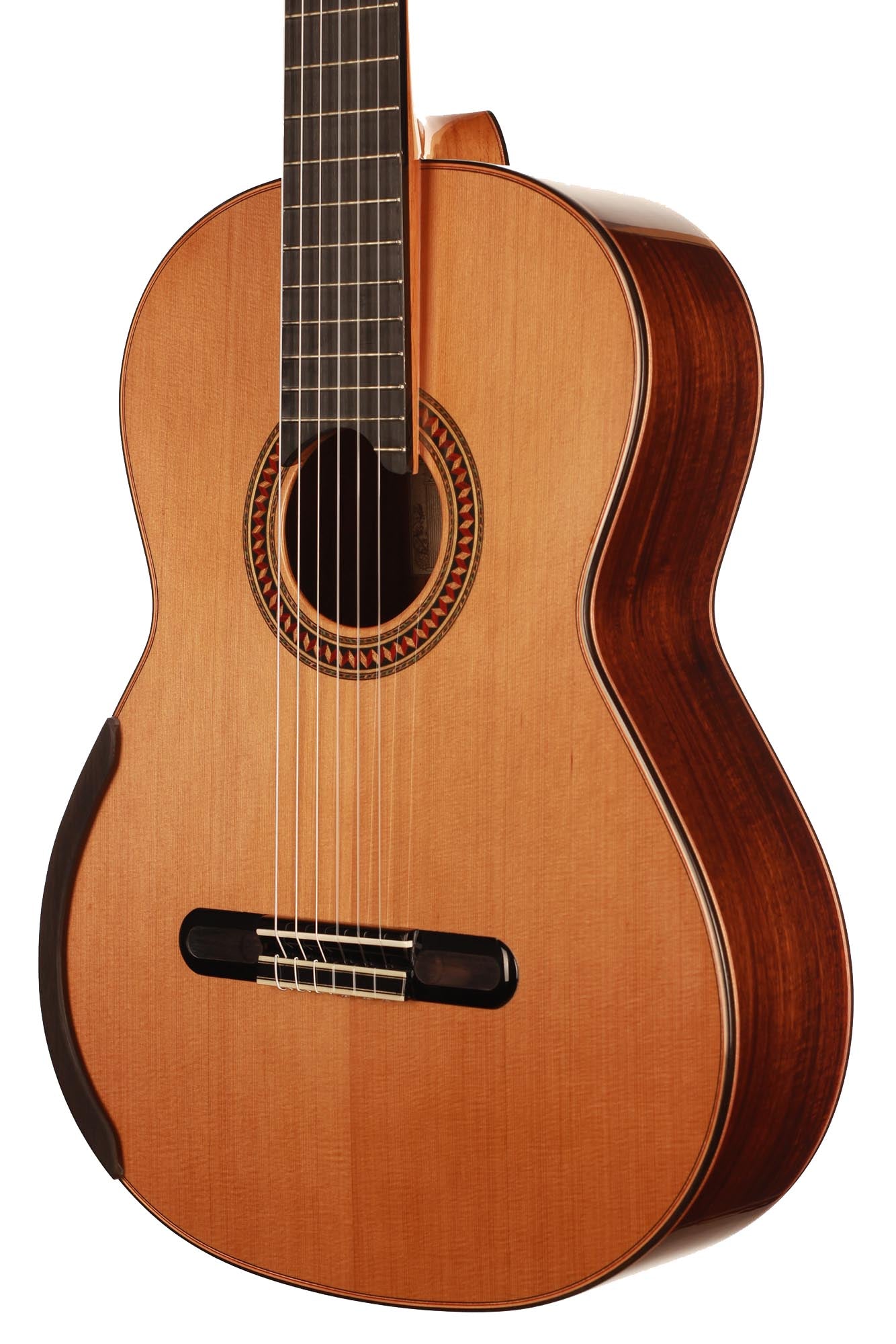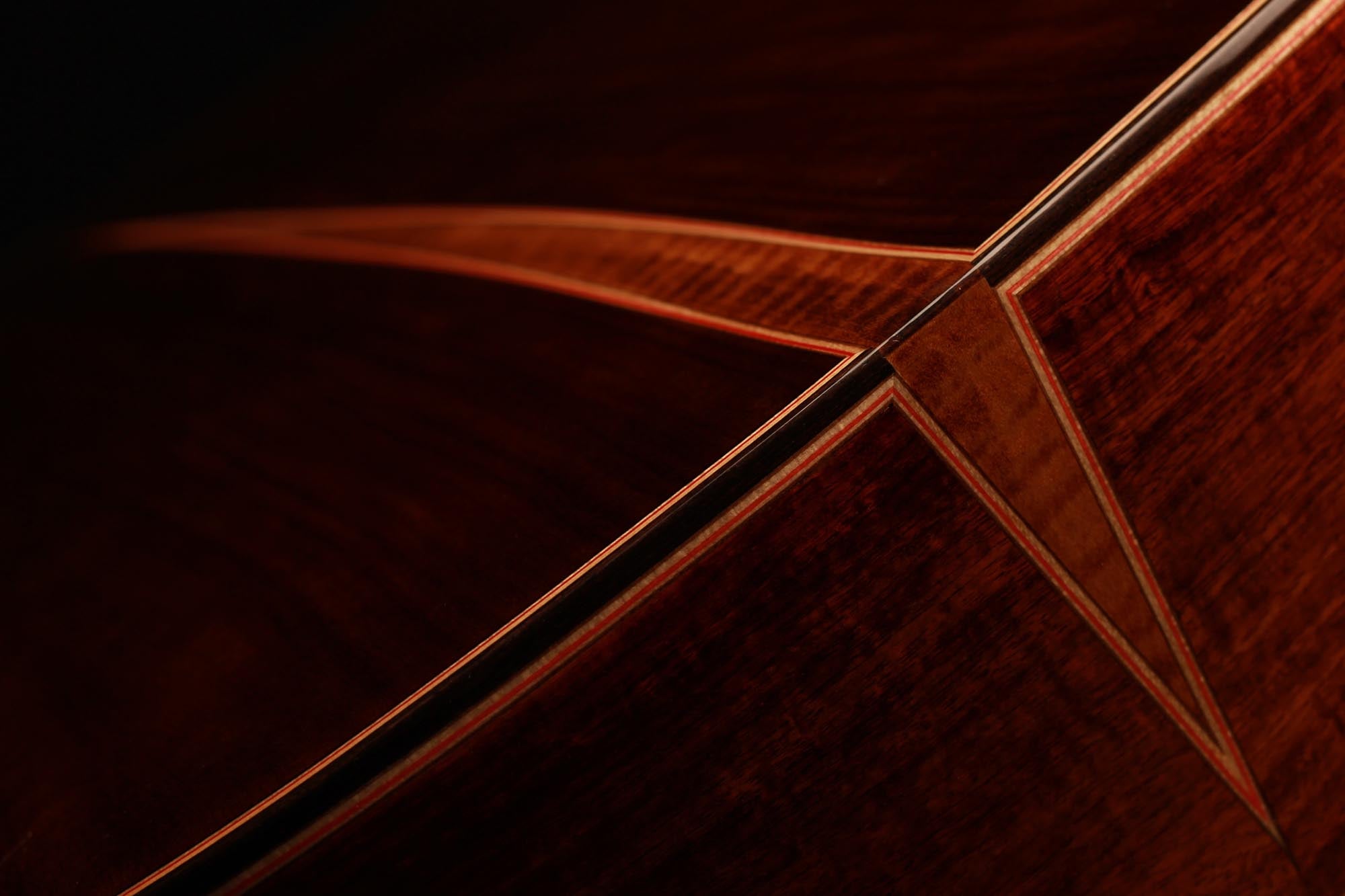 For this Chamber Concert model the latest classical guitar technology was used: double-top with two ultra-thin layers of high quality sound woods on either side of a layer of Nomex to give the strength needed for the durability of the top. The violin-style arched back and the sides are made of Santos Rosewood. The guitar has an amazing sound projection and volume, making it ideal for concert performances. The upper bout of the body is sloped to give a ‘raised fingerboard’ in the style of Humphrey guitars. The ebony fingerboard is 52 mm in width at the nut and 62 mm at the 12th fret. The fingerboard also extends to the 20th fret for the treble strings. An armrest, ultra-smooth frets and a low string action make the Chamber Concert exceptionally easy and comfortable to play. This guitar is CITES-free! The original hard-shell case is included.