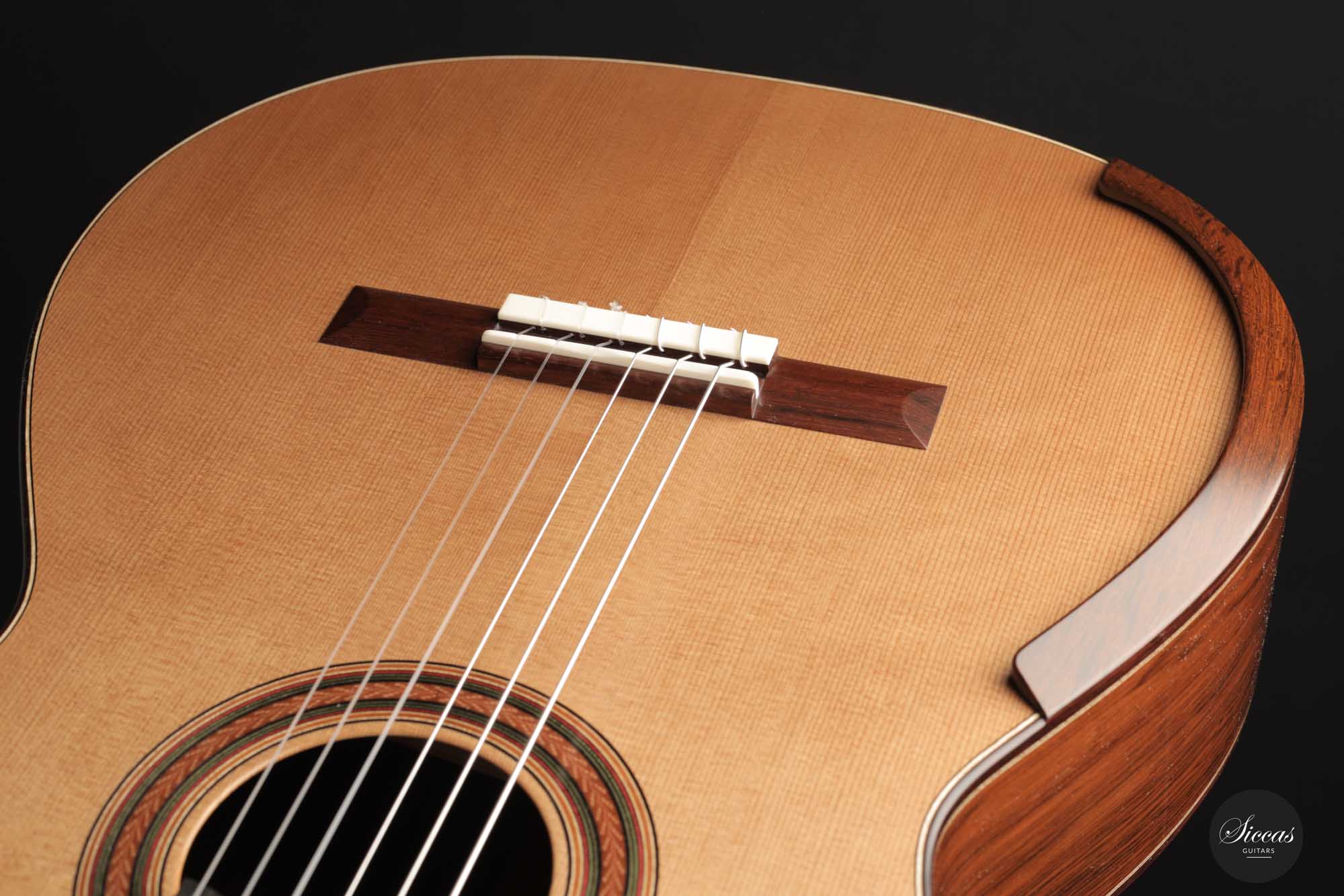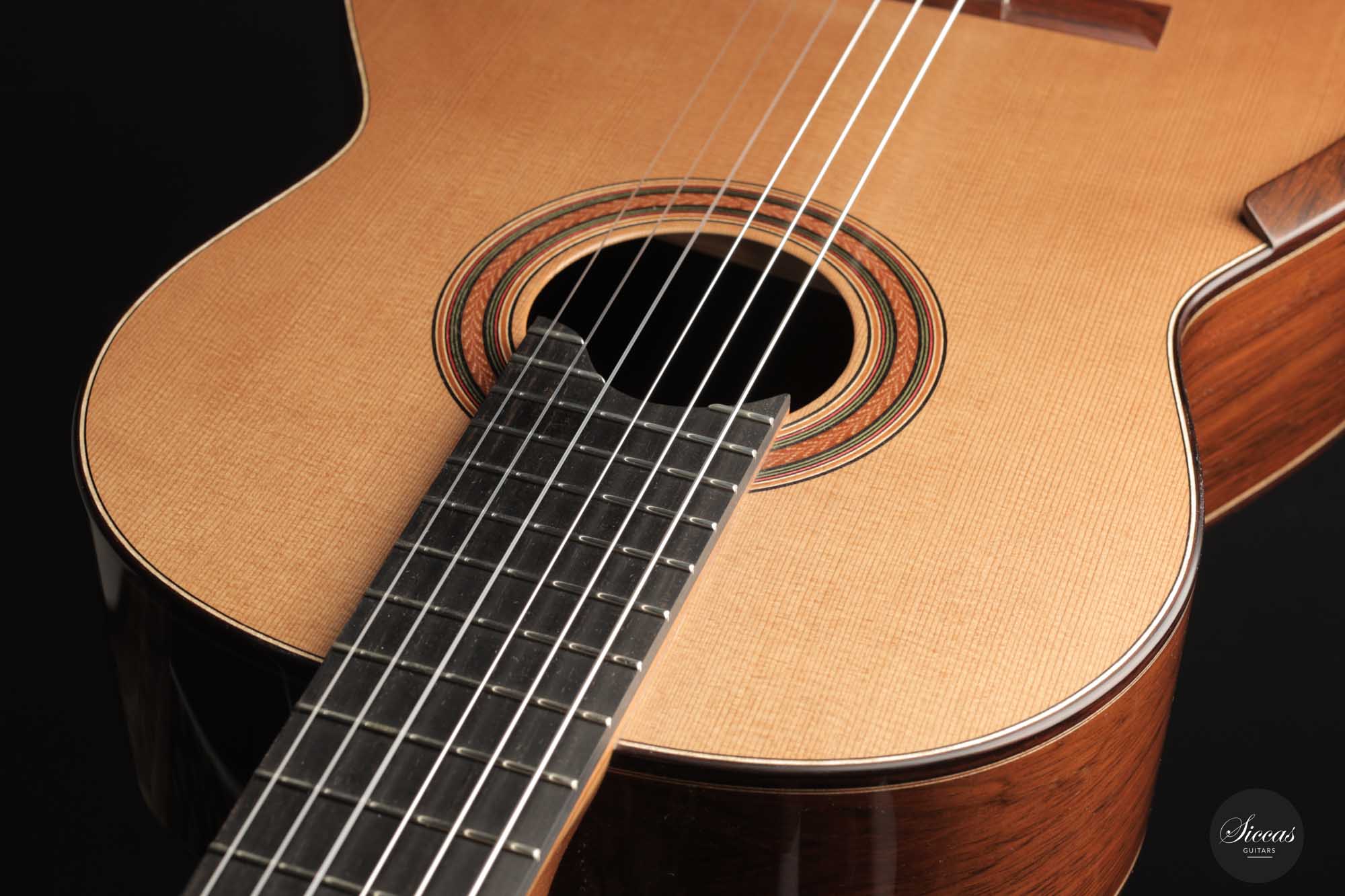 Diese Gnatek ist ein Kunstwerk und ein wahres Meisterstück der Gitarrenbaukunst. Sie zeugt von ästhetischer Harmonie und ausgezeichnetem Geschmack. Viele Details sind besonders bemerkenswert. Die Decke ist aus feiner Zeder und Boden und Zargen aus einem herrlichen Madagaskarpalisander gefertigt. Im Vergleich zu anderen australischen Gitarren ist dieses Instrument in Lattice-Bauweise relativ leicht gebaut und durch ihre sorgfältige Verarbeitung und ihren beeindruckenden Klang sticht sie deutlich heraus - ein tolles Instrument, das jeder Konzertsituation gerecht wird. Die 640-mm-Mensur ist eine hervorragende Gelegenheit für Gitarristen mit beispielsweise kleineren Händen, auf der Suche nach einer Gitarre mit üppigem Klangvolumen und Projektion. Dieses Instrument bietet herausragende Diskantklänge mit reichen und schönen Obertönen, gepaart mit direkten und knackigen Bässen.
