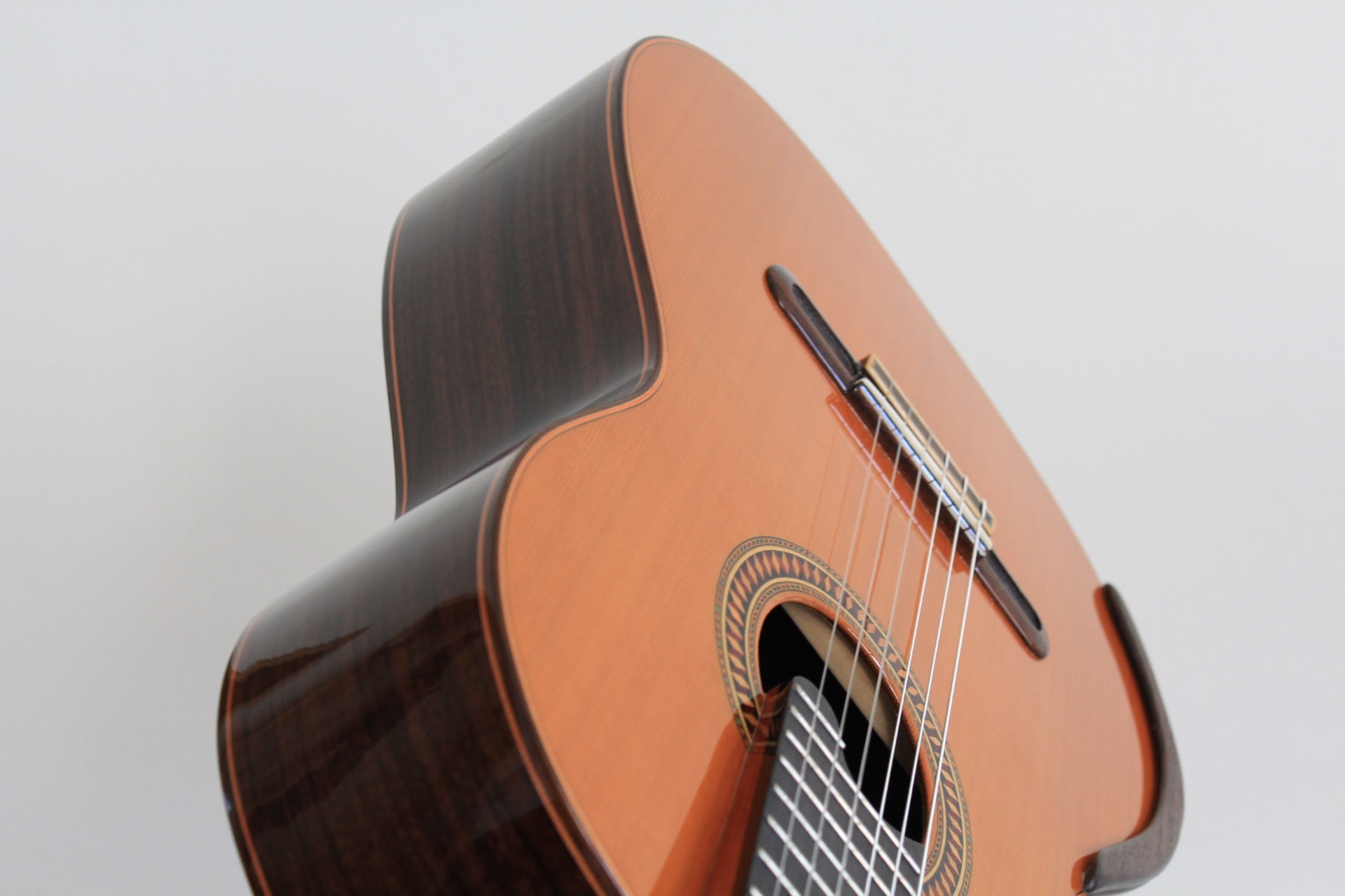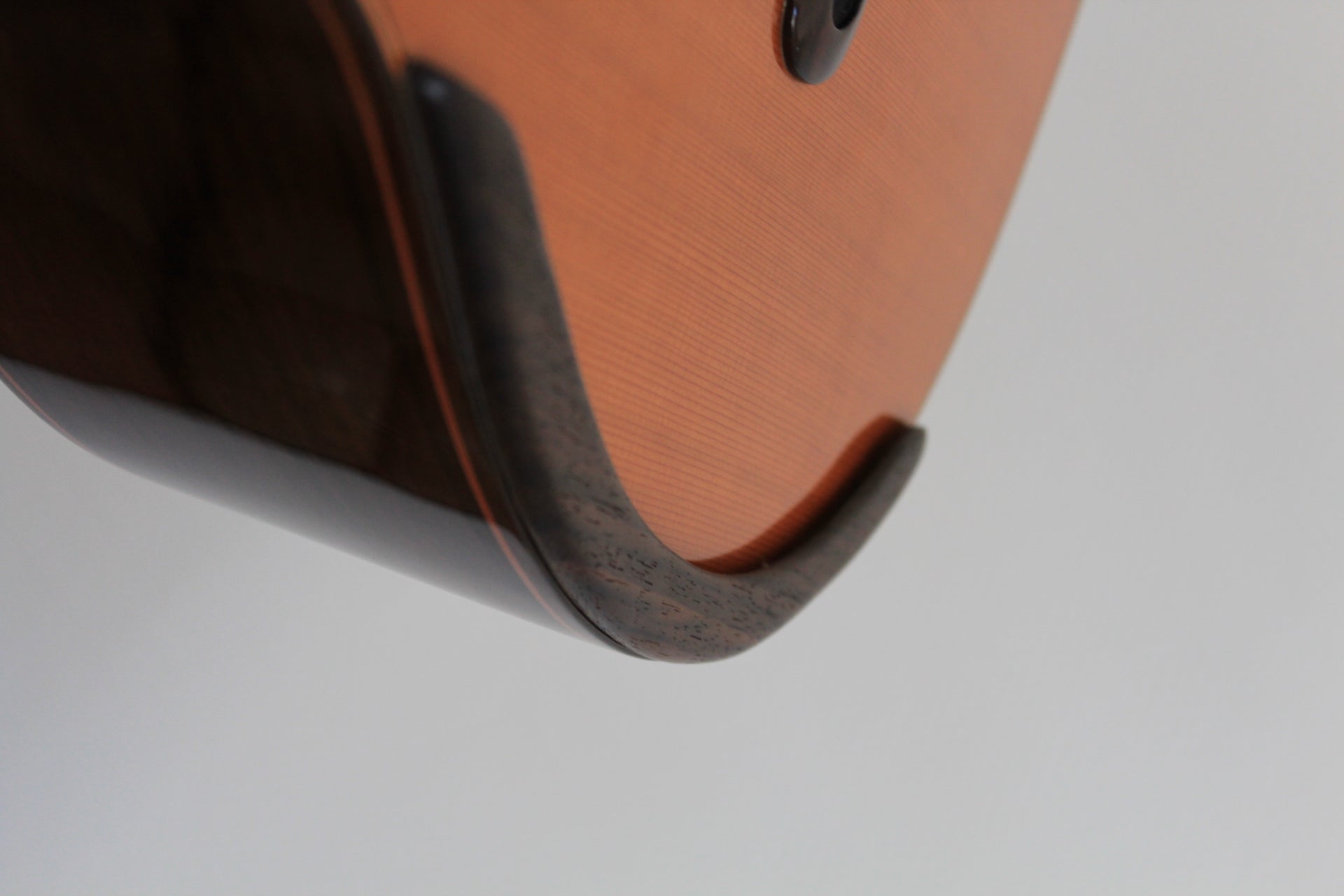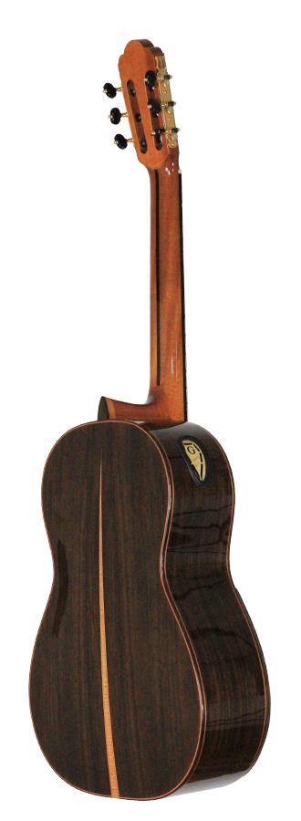 The Chamber Concert utilizes the latest classical guitar technology double-top with two ultra thin layers of high quality sound woods on either side of a layer of Nomex to give the strength needed for the durability of the top. The Chamber Concert is available with lattice bracing for a full, balanced sound or with traditional fan bracing for amazing clarity and balance. Back and sides are of solid Indian rosewood with the back of arched construction with no bracing. The arched “violin back” gives the guitar amazing sound projection and volume making it ideal for concert performances. The upper bout of the body is sloped to give a "raised fingerboard" in the style of Humphrey guitars. The ebony fingerboard is 52 mm in width at the nut and 62 mm at the 12th fret. The fingerboard also extends to the 20th fret for the treble strings. A rosewood armrest, ultra smooth frets, a slight radius in the fingerboard and a low string action make the Chamber Concert exceptionally easy and comfortable to play.