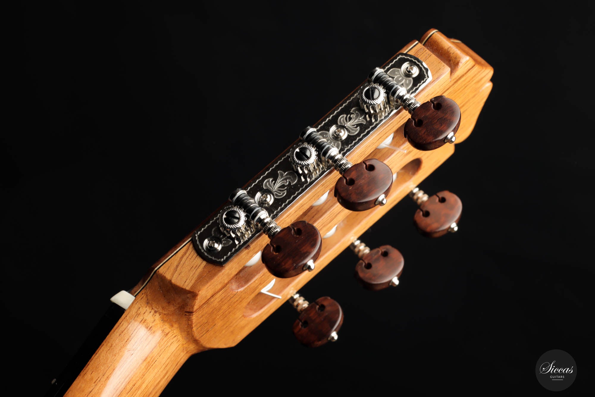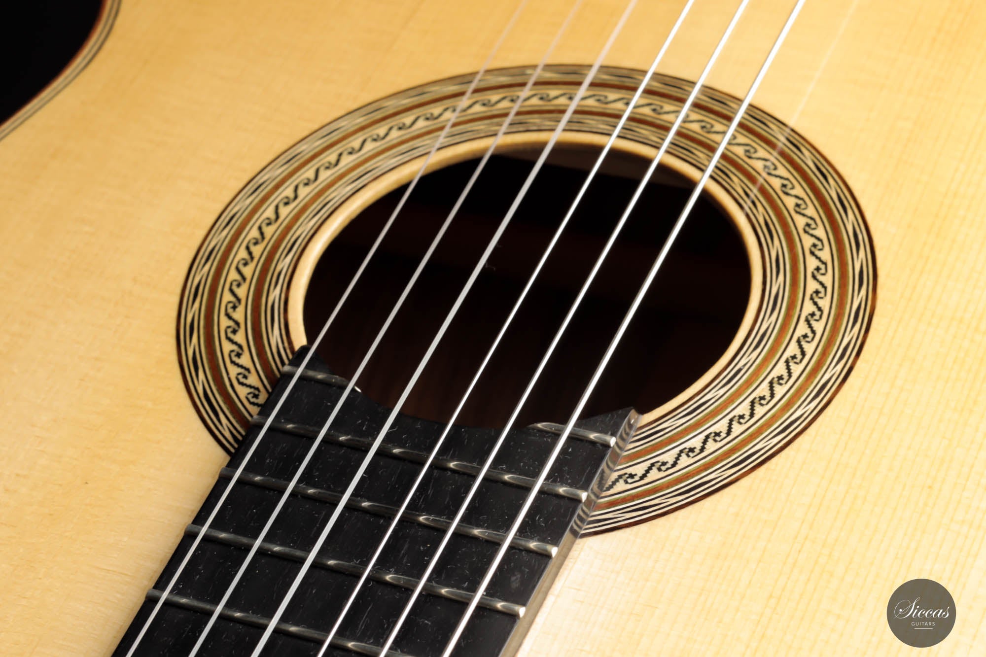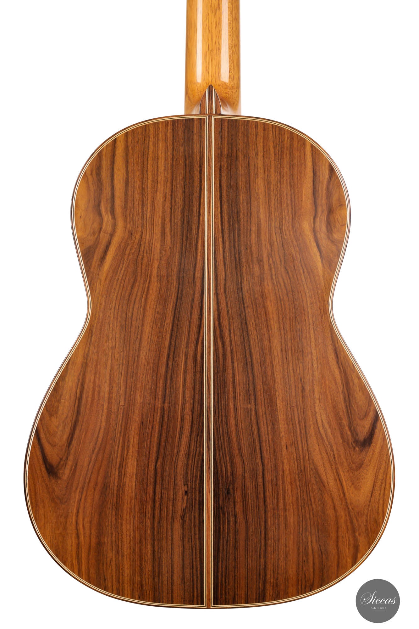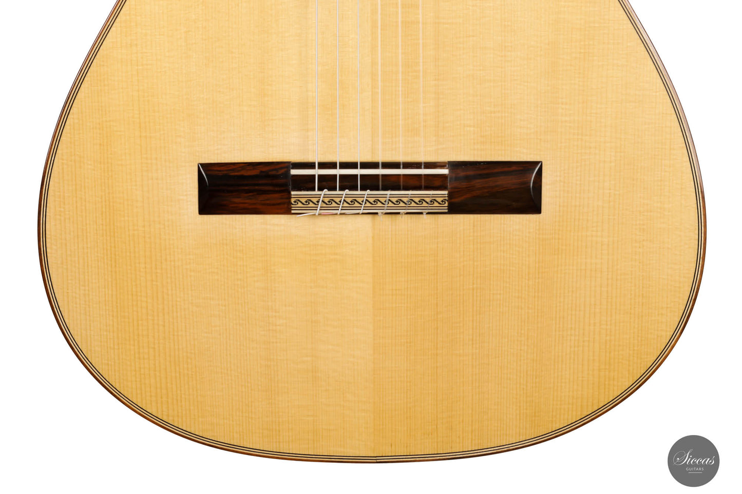 This particular guitar from 2022 was built in the style of Santos Hernandez. One can easily notice this through the rosette and headstock design. Furthermore, it has a beautiful-looking spruce soundboard and Santos rosewood, coated with the highest quality French polish. Acoustically this fine instrument does not disappoint. The brilliant and lively trebles, paired with deep, vintage-sounding basses, are a genuine reminiscence of an old guitar by Santos Hernandez. As a player himself, Achim truly knows how to build an instrument with superb playability.
