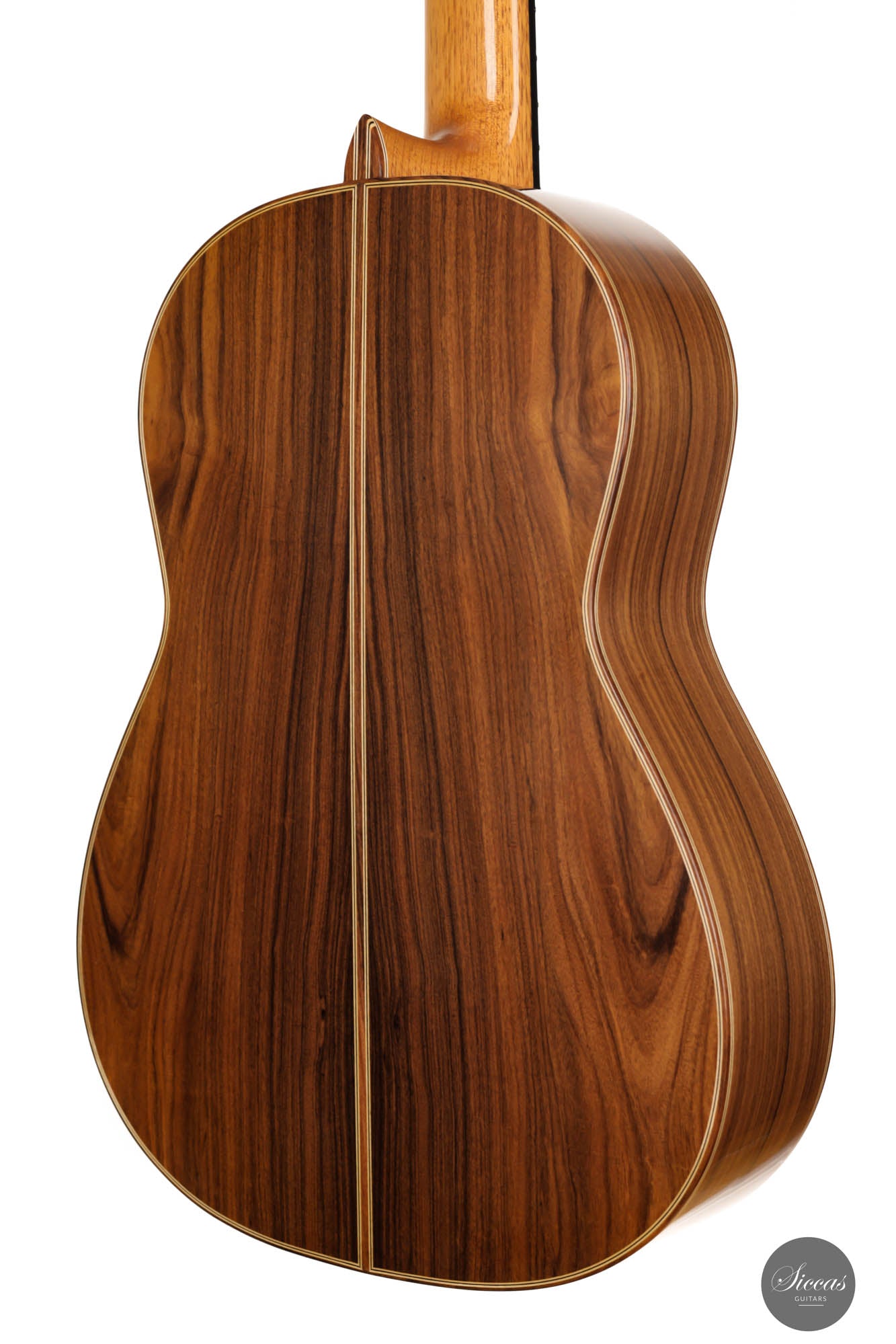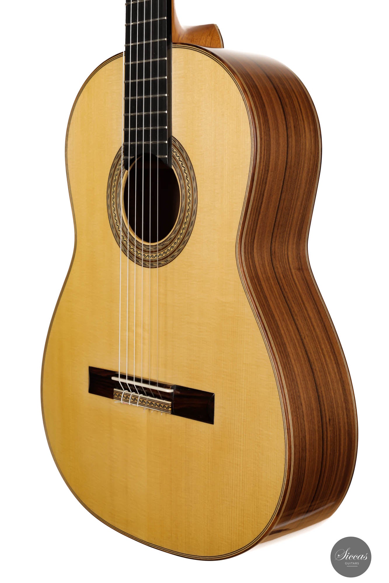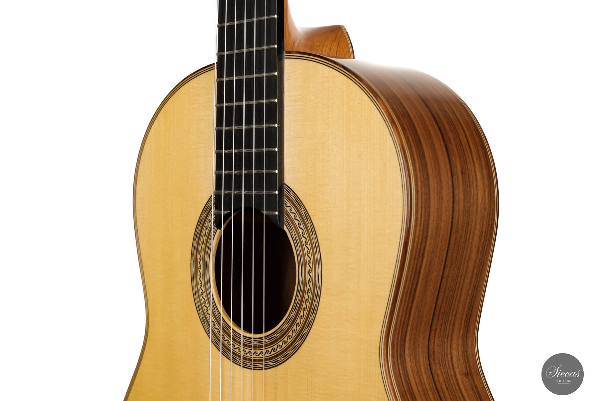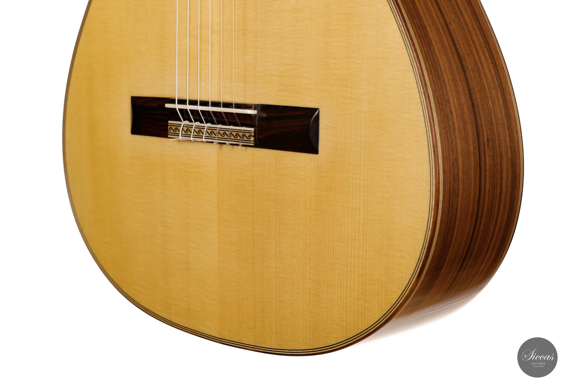This particular guitar from 2022 was built in the style of Santos Hernandez. One can easily notice this through the rosette and headstock design. Furthermore, it has a beautiful-looking spruce soundboard and Santos rosewood, coated with the highest quality French polish. Acoustically this fine instrument does not disappoint. The brilliant and lively trebles, paired with deep, vintage-sounding basses, are a genuine reminiscence of an old guitar by Santos Hernandez. As a player himself, Achim truly knows how to build an instrument with superb playability.