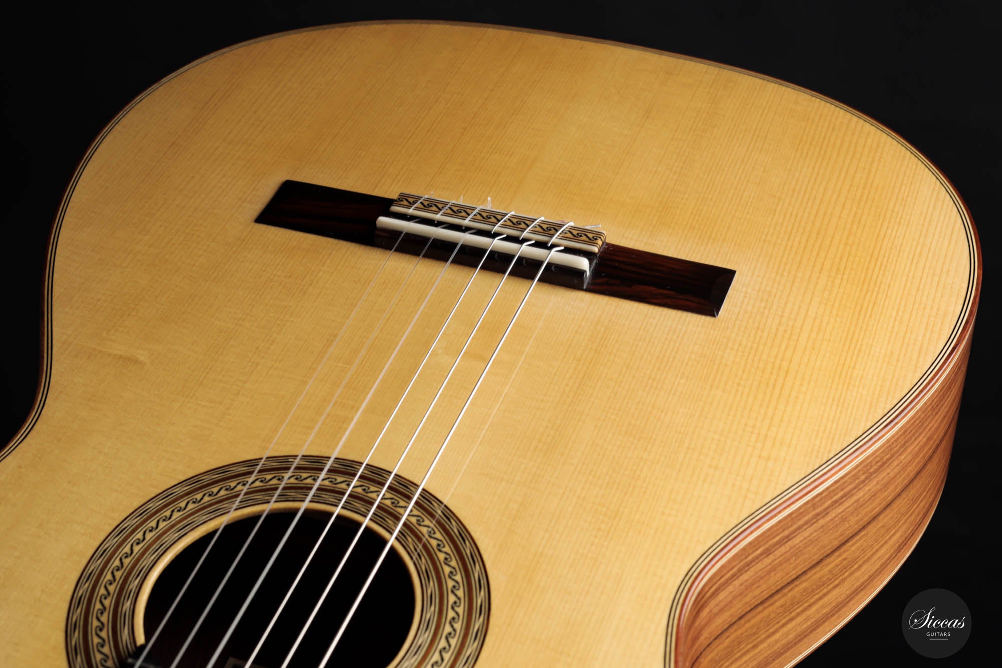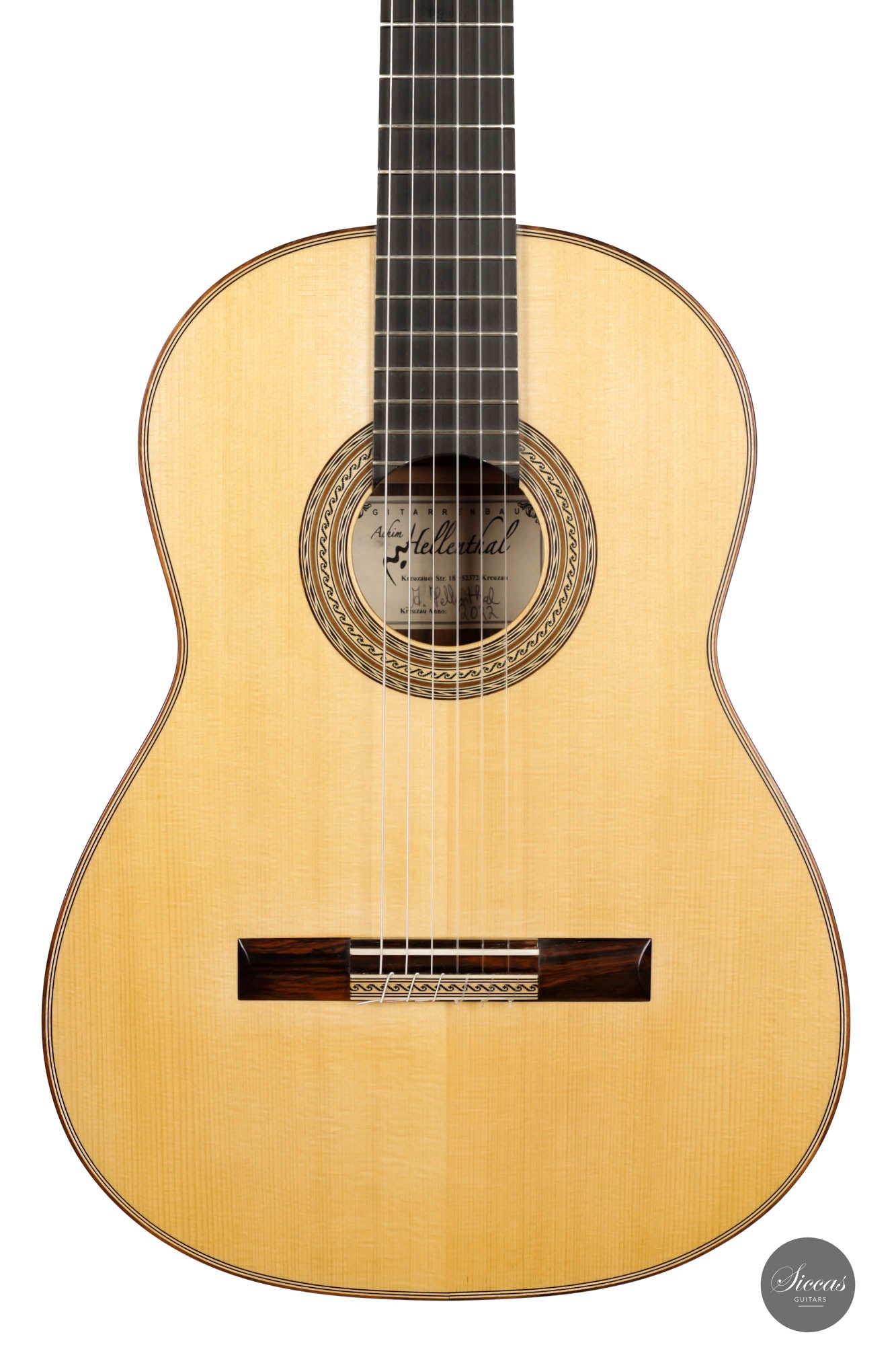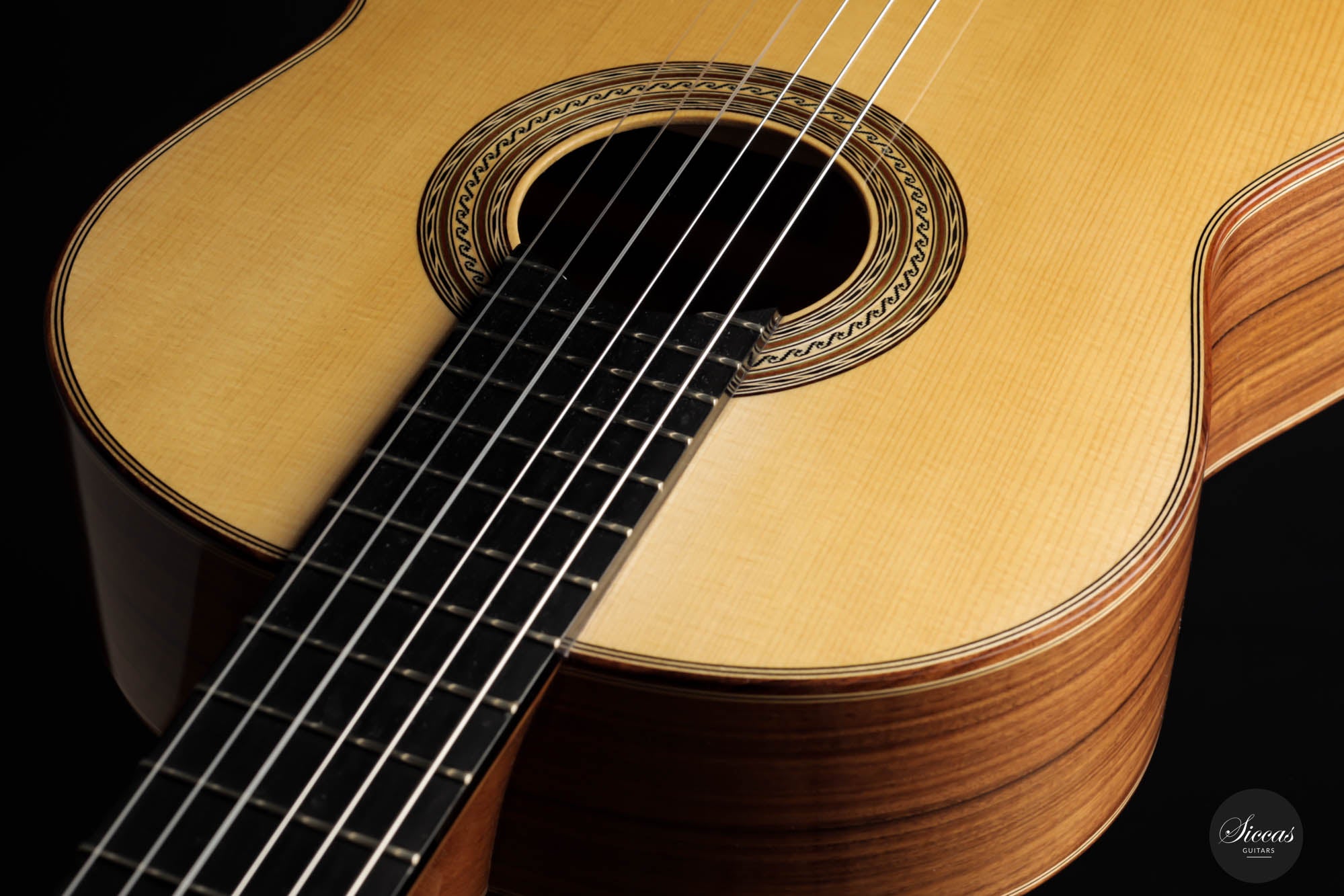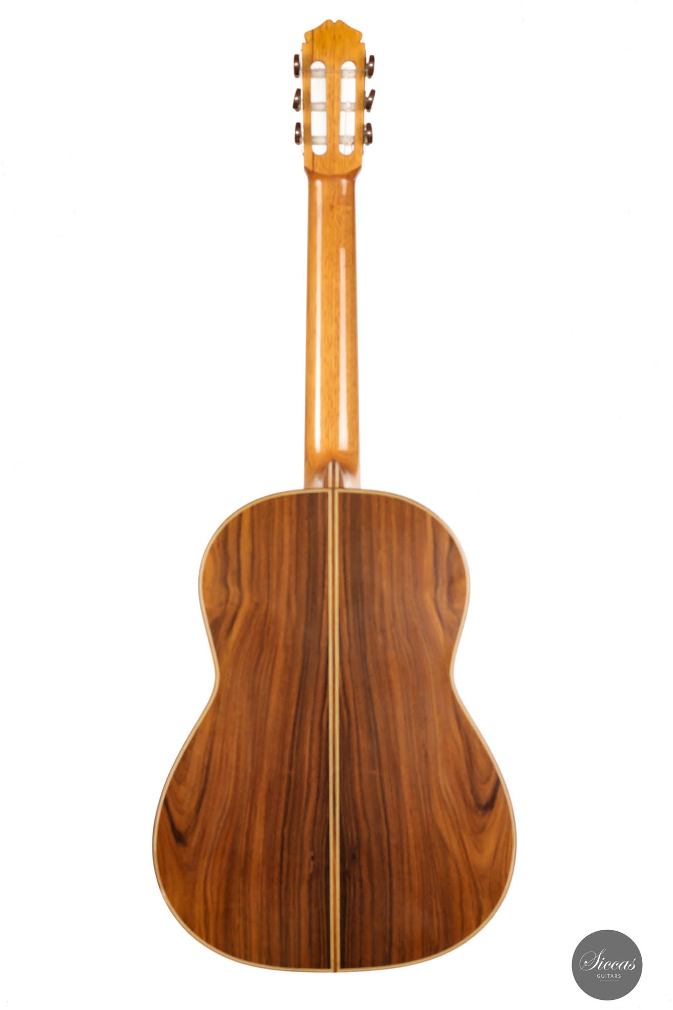 This particular guitar from 2022 was built in the style of Santos Hernandez. One can easily notice this through the rosette and headstock design. Furthermore, it has a beautiful-looking spruce soundboard and Santos rosewood, coated with the highest quality French polish. Acoustically this fine instrument does not disappoint. The brilliant and lively trebles, paired with deep, vintage-sounding basses, are a genuine reminiscence of an old guitar by Santos Hernandez. As a player himself, Achim truly knows how to build an instrument with superb playability.