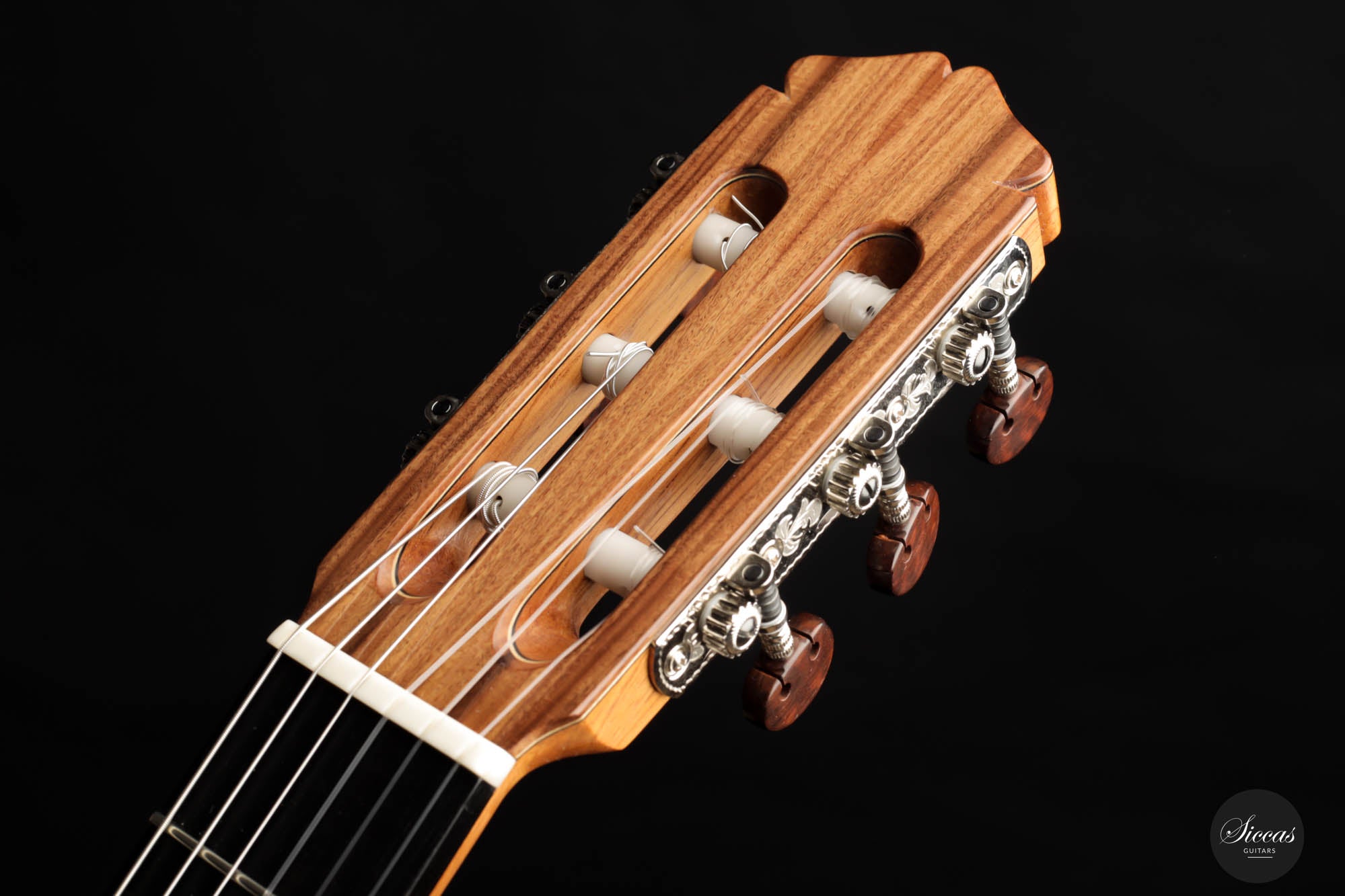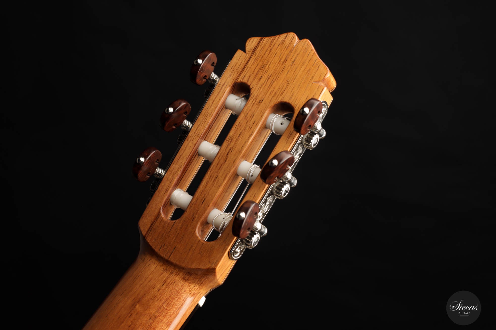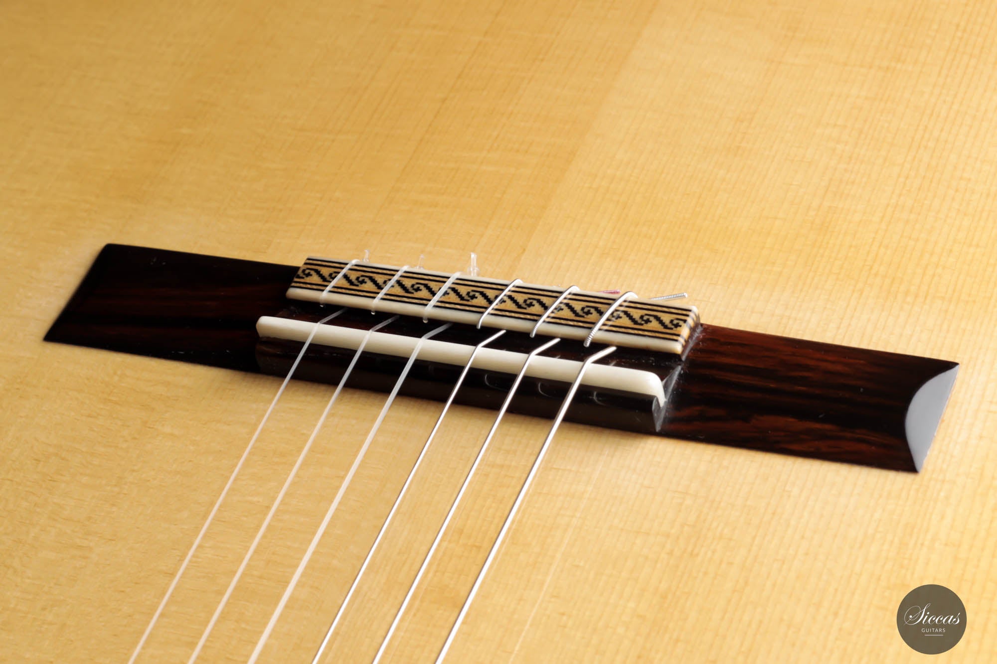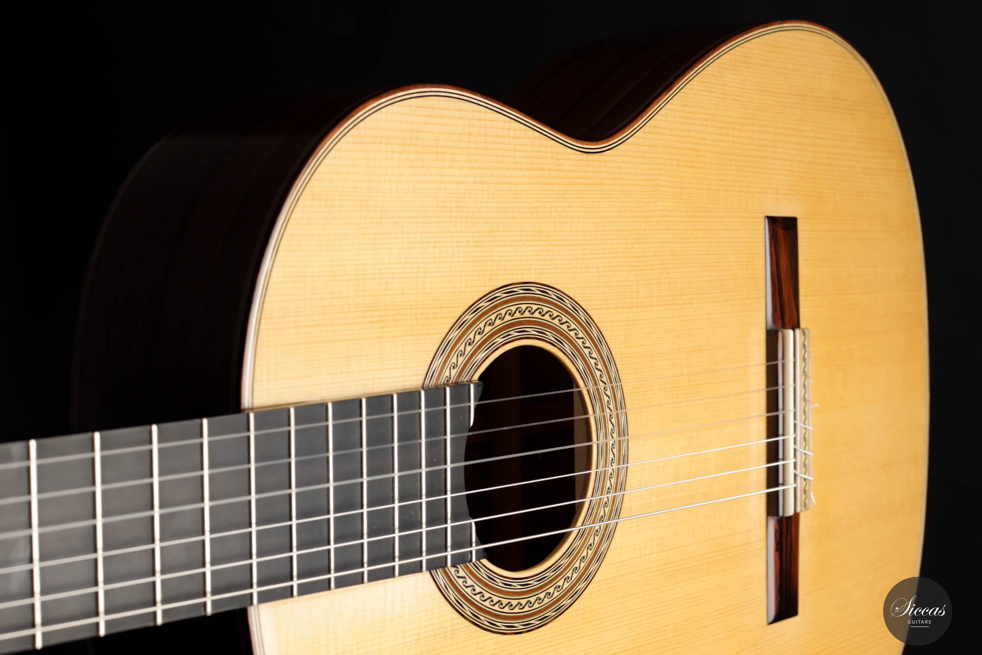 This particular guitar from 2022 was built in the style of Santos Hernandez. One can easily notice this through the rosette and headstock design. Furthermore, it has a beautiful-looking spruce soundboard and Santos rosewood, coated with the highest quality French polish. Acoustically this fine instrument does not disappoint. The brilliant and lively trebles, paired with deep, vintage-sounding basses, are a genuine reminiscence of an old guitar by Santos Hernandez. As a player himself, Achim truly knows how to build an instrument with superb playability.