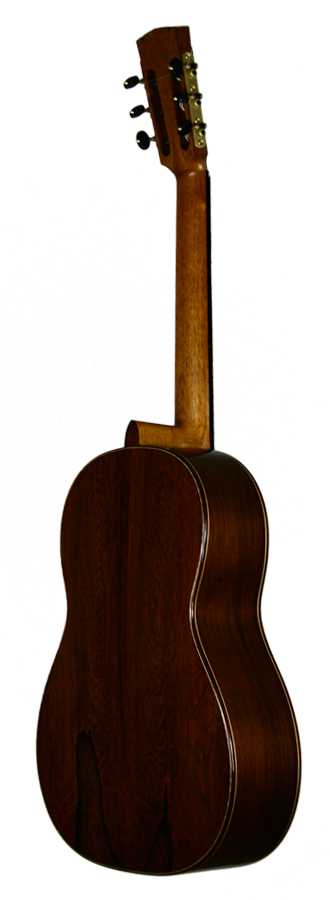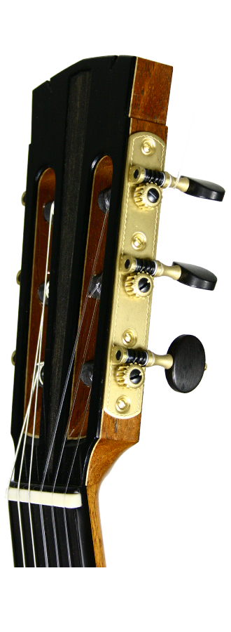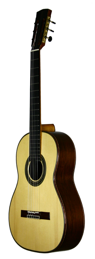 This model of a concert guitar, which is inspired by Francisco Simplicio, secured Heinzelmann the first place in the contest of lutherie in Luby/CZ in June 2012. Many of Adrian’s own ideas are included in this model, like for example the bridge consisting of a three-piece bone inlay. The top is made of fine-grained spruce with an embedded and magnificently decorated rosette. The purflings of the guitar’s top are fine mosaics. Back and ribs are made of East Indian rosewood. The fingerboard is raised above the top. Neck and head are made of cedro. The guitar is refined with shellac polish.
