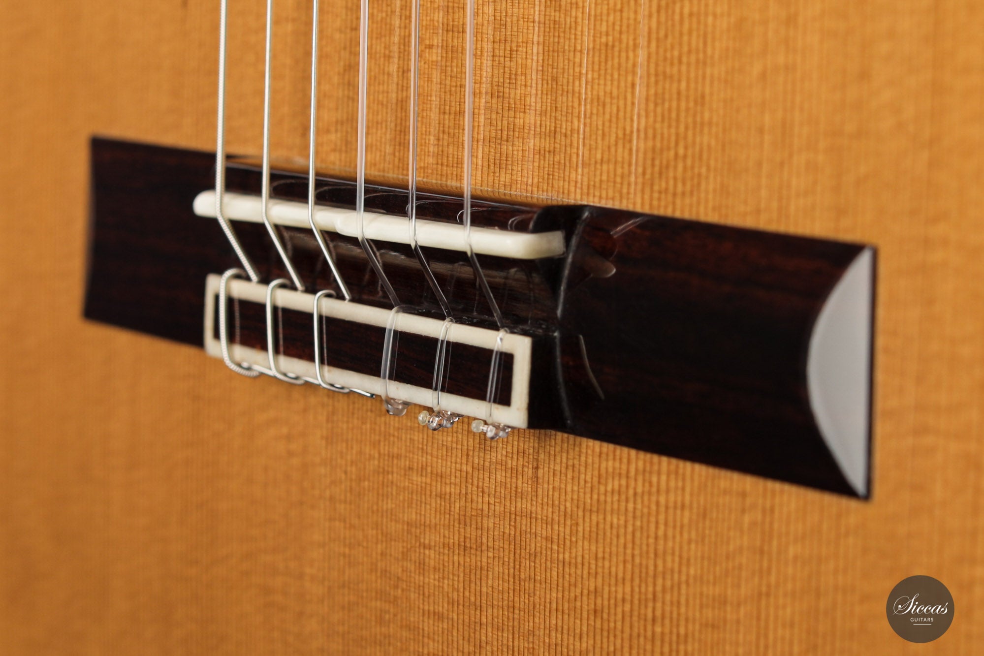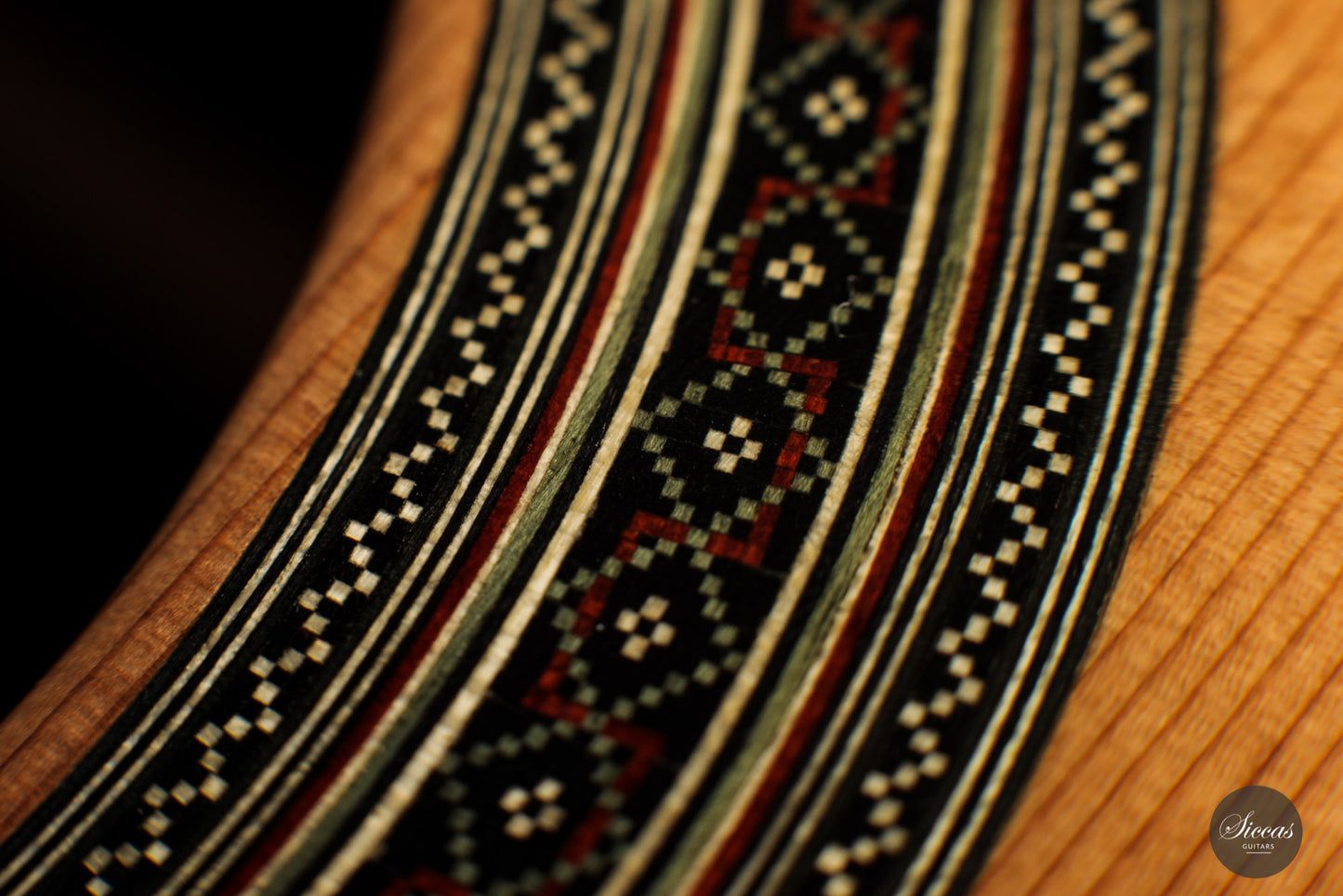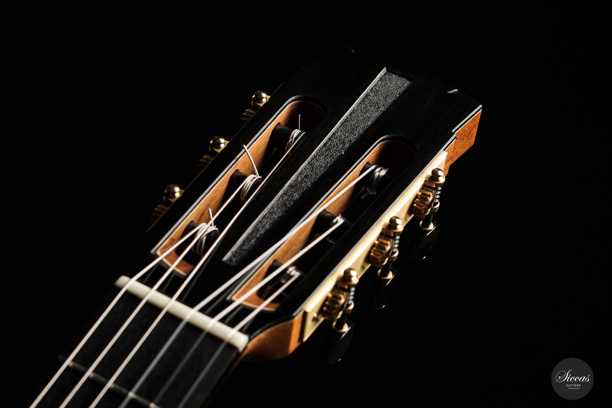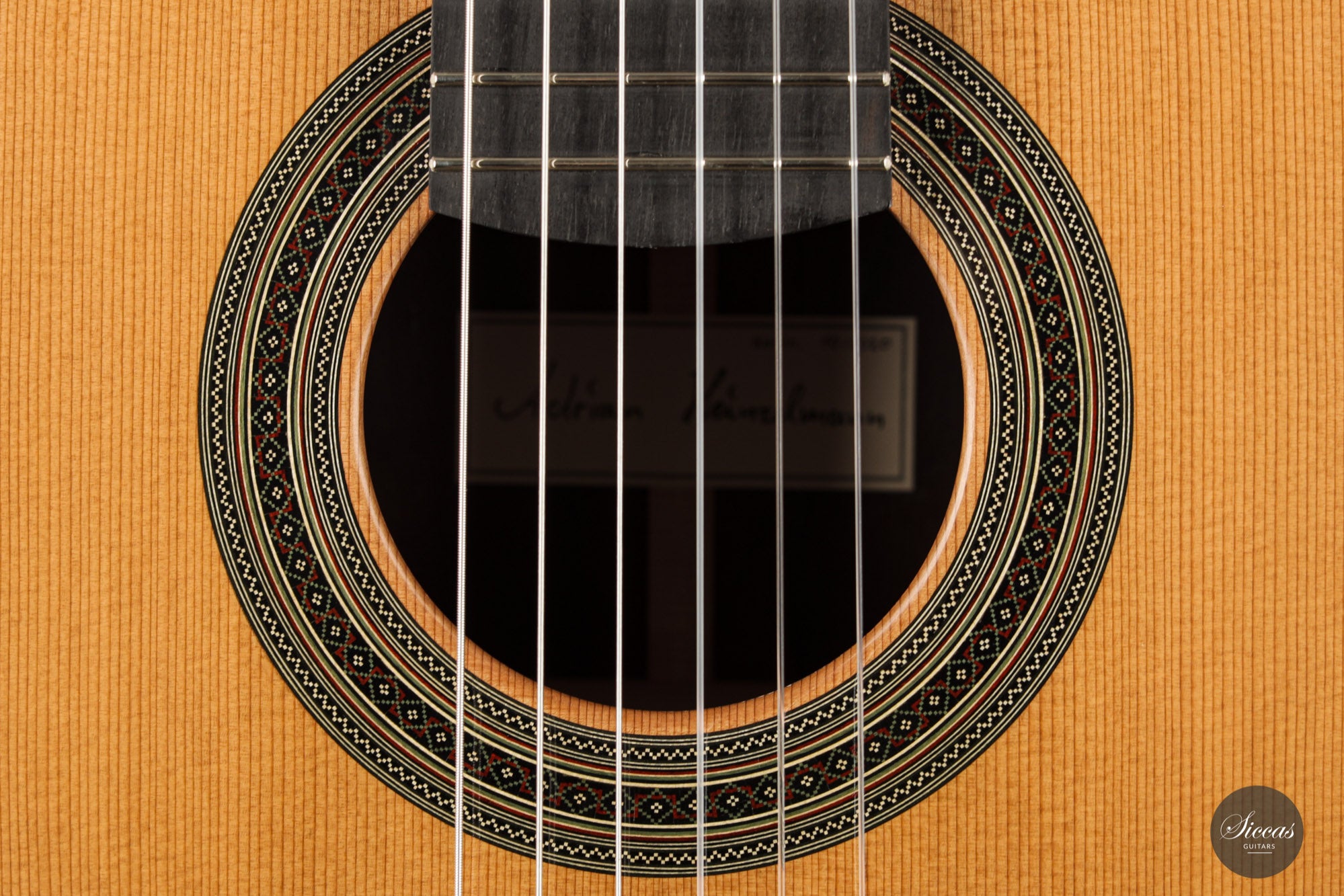 His craftsmanship and the way Adrian Heinzelmann designs his soundboards are unique. Many narrow parallel trenches are carved in the inside of the cedar soundboard to optimize its weight and flexibility. This technique, combined with a lightweight lattice bracing, gives an instrument of great sensitivity and impressive volume. Playing Adrian Heinzelmann’s guitar gives a feeling of confidence and pushes the guitarist to go beyond his limits.