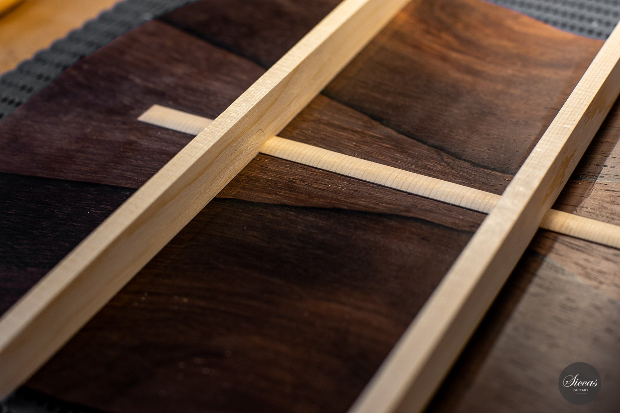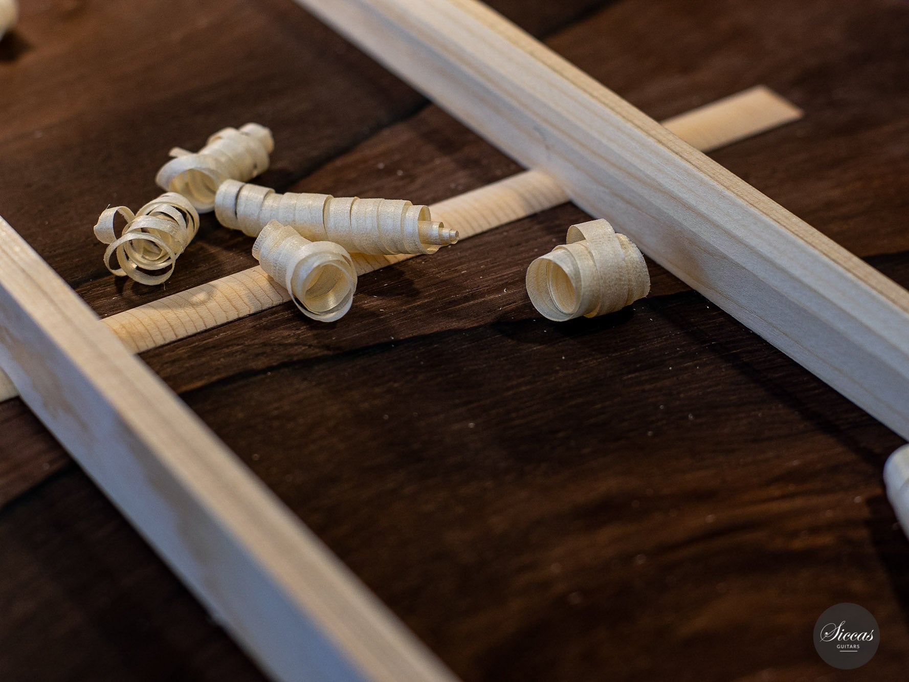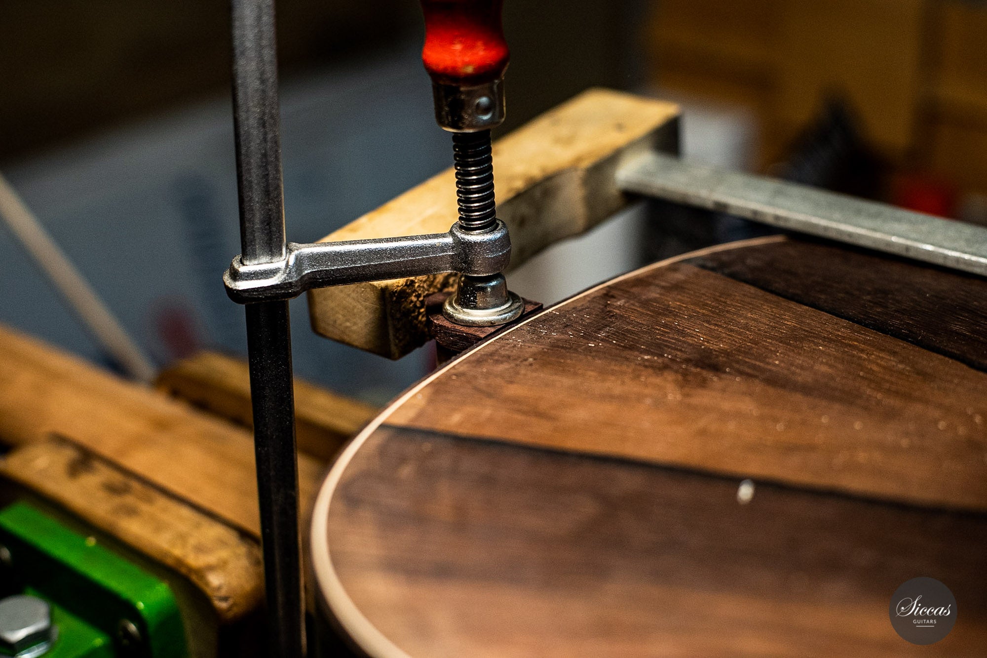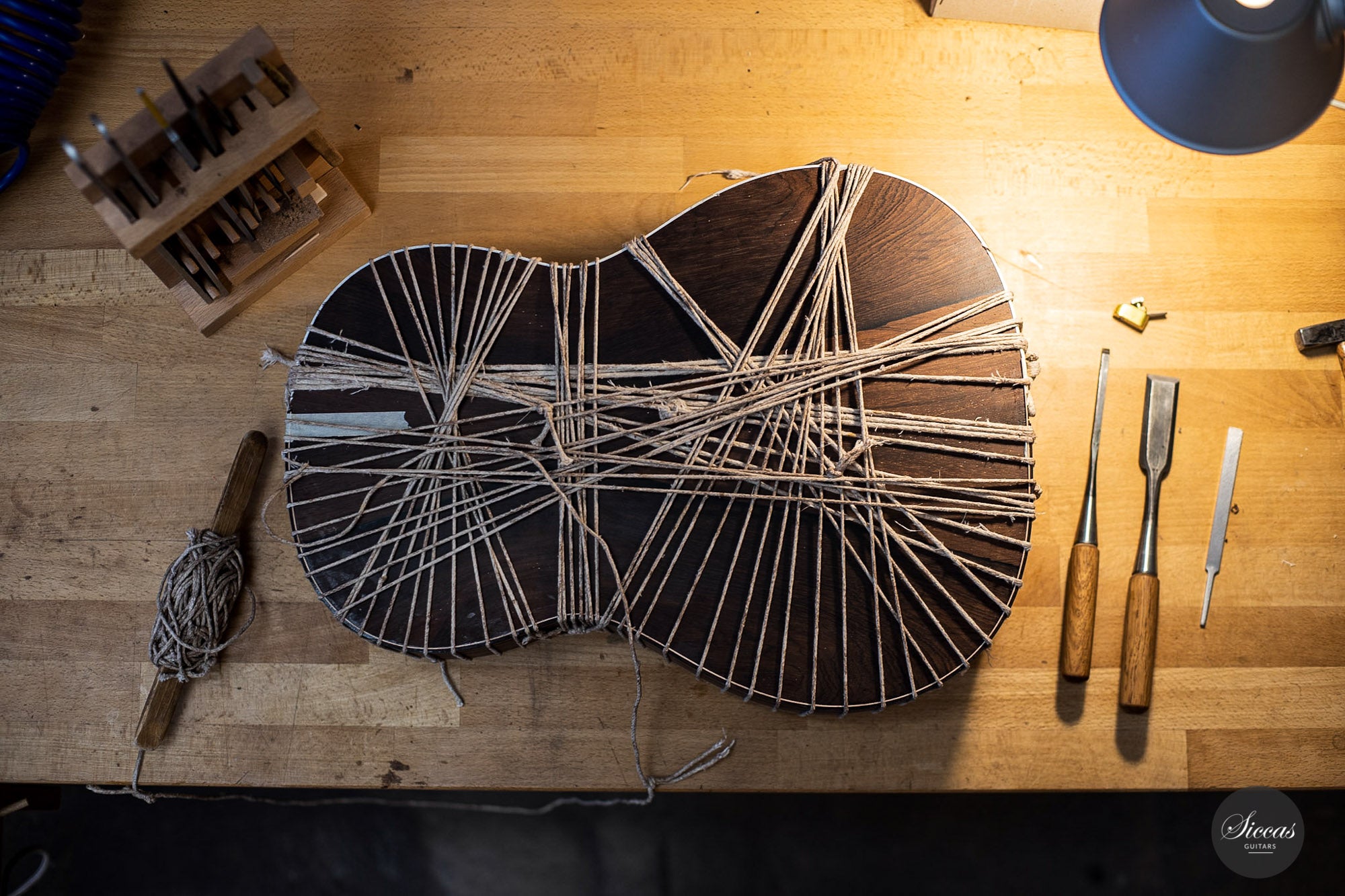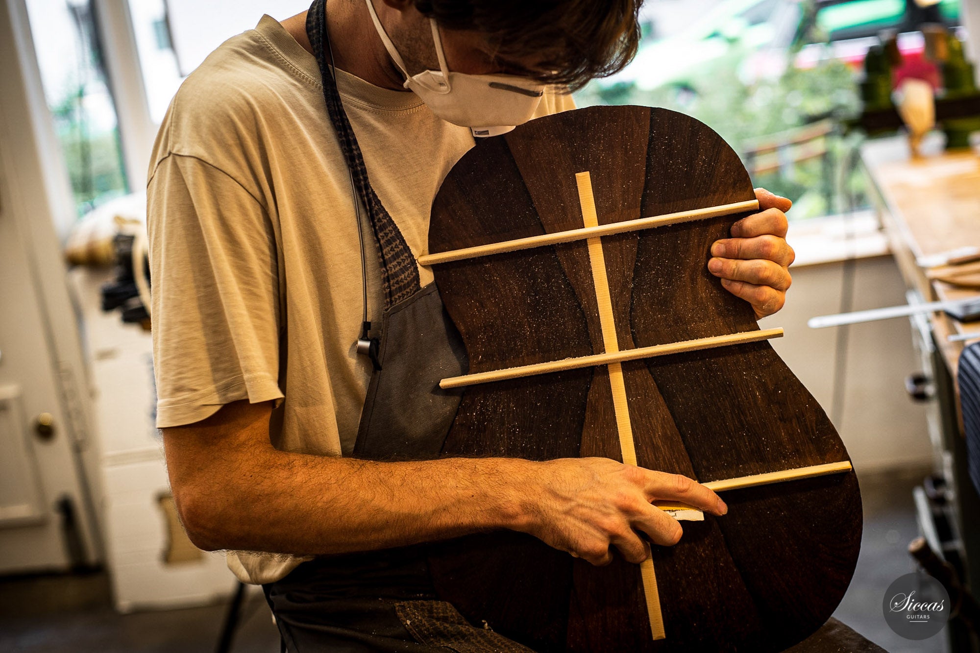 His craftsmanship and the way Adrian Heinzelmann designs his soundboards are unique. Many narrow parallel trenches are carved in the inside of the cedar soundboard to optimize its weight and flexibility. This technique, combined with a lightweight lattice bracing, gives an instrument of great sensitivity and impressive volume. Playing Adrian Heinzelmann’s guitar gives a feeling of confidence and pushes the guitarist to go beyond his limits.
