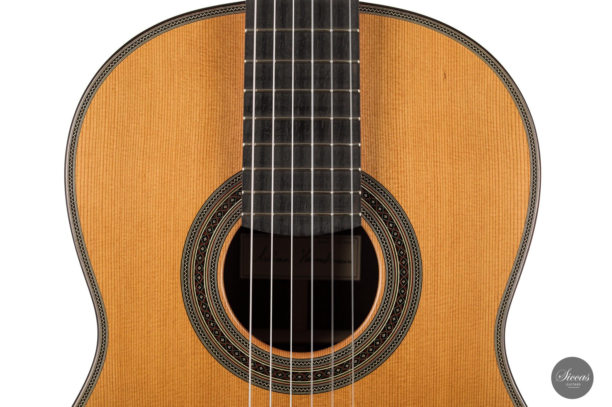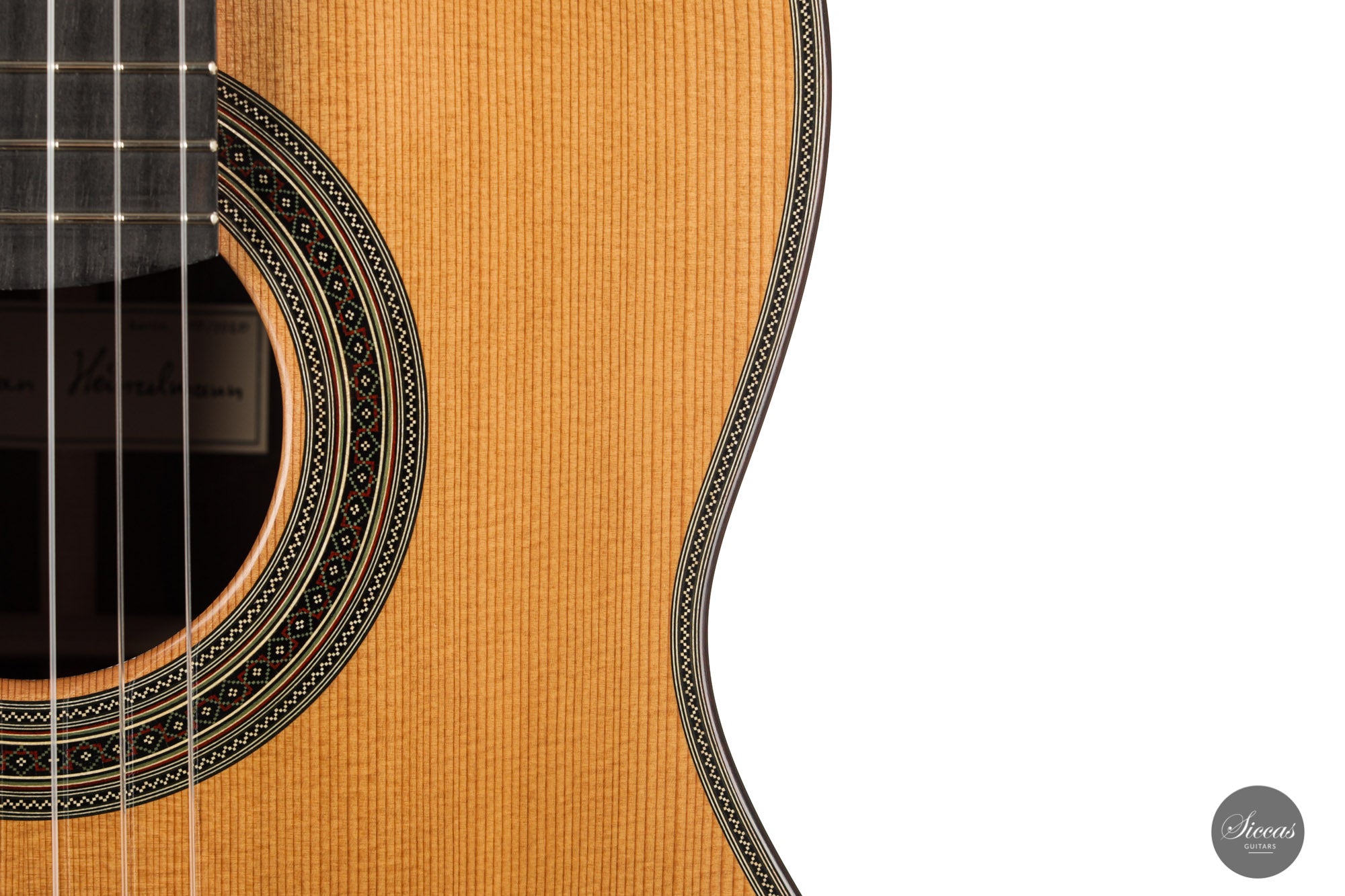This sweet-looking guitar offers all the relevant objective characteristics that a guitarist could wish for. These include an extremely well-balanced sound in chords and an effortlessly shapeable tone, as well as a rich overtone spectrum and long-lasting sustain. On top of that, it offers a truly touching tone that carries melodies easily and allows free musical expression. Moreover, the pleasantly rounded neck, the raised fingerboard, and the very responsive soundboard make for great playing pleasure and bring out the best of what a concert guitarist expects from a master guitar.