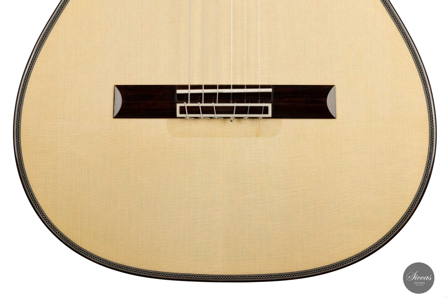 This classy-looking guitar with a modern twist offers all the features that characterize a first-class classical guitar. Including an overall well-balanced sound in polyphonic music, a top-notch separation of voices, and a long sustain. On top of that, it offers a remarkable sound that is both sweet and bold at the same time. The pleasantly round neck, raised fingerboard, and responsive soundboard create a great playing feel and bring out the best that a classical guitarist expects from a master guitar. Due to a broken string, a small repair was performed under the bridge of this brand-new guitar, which was taken into account in the price.