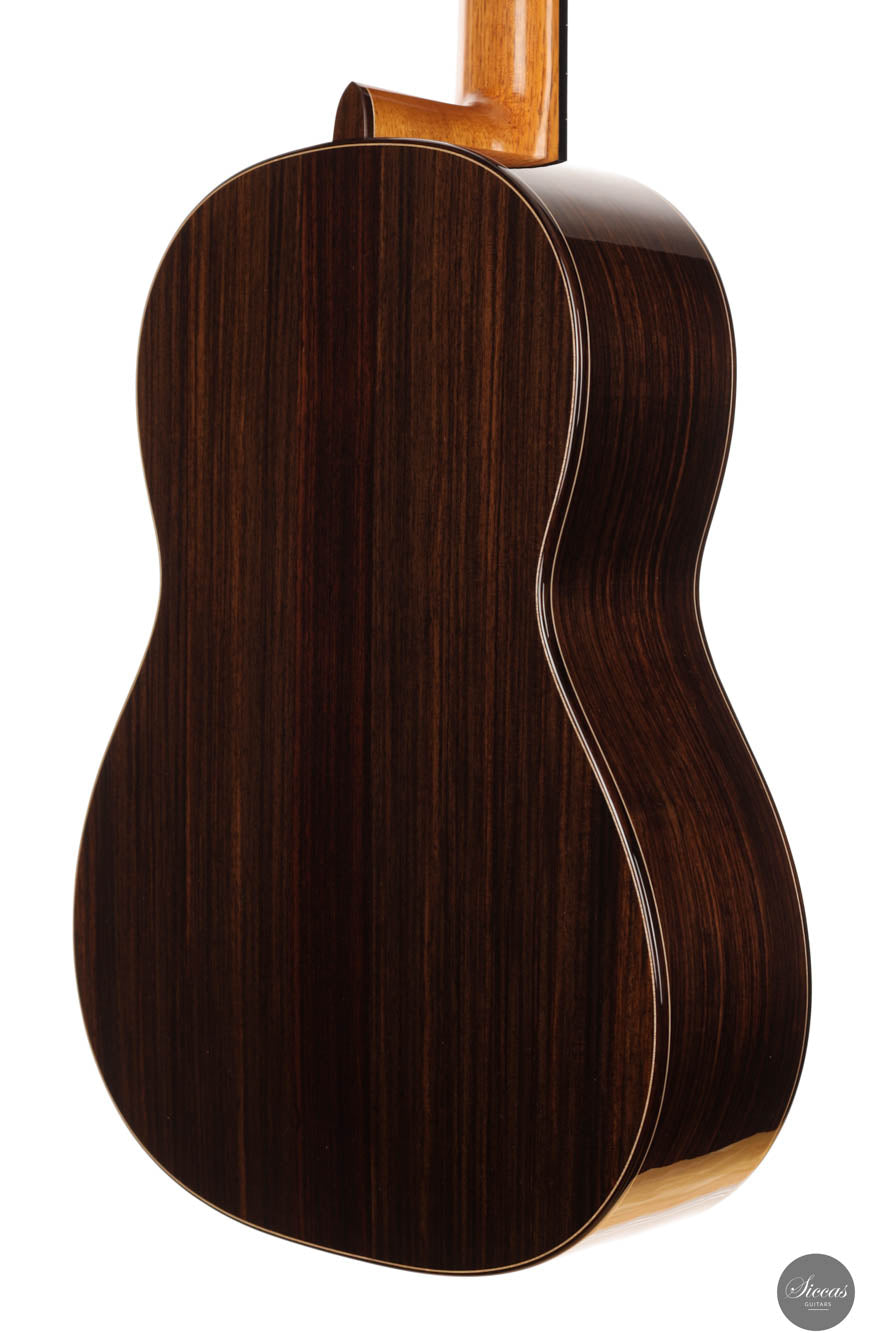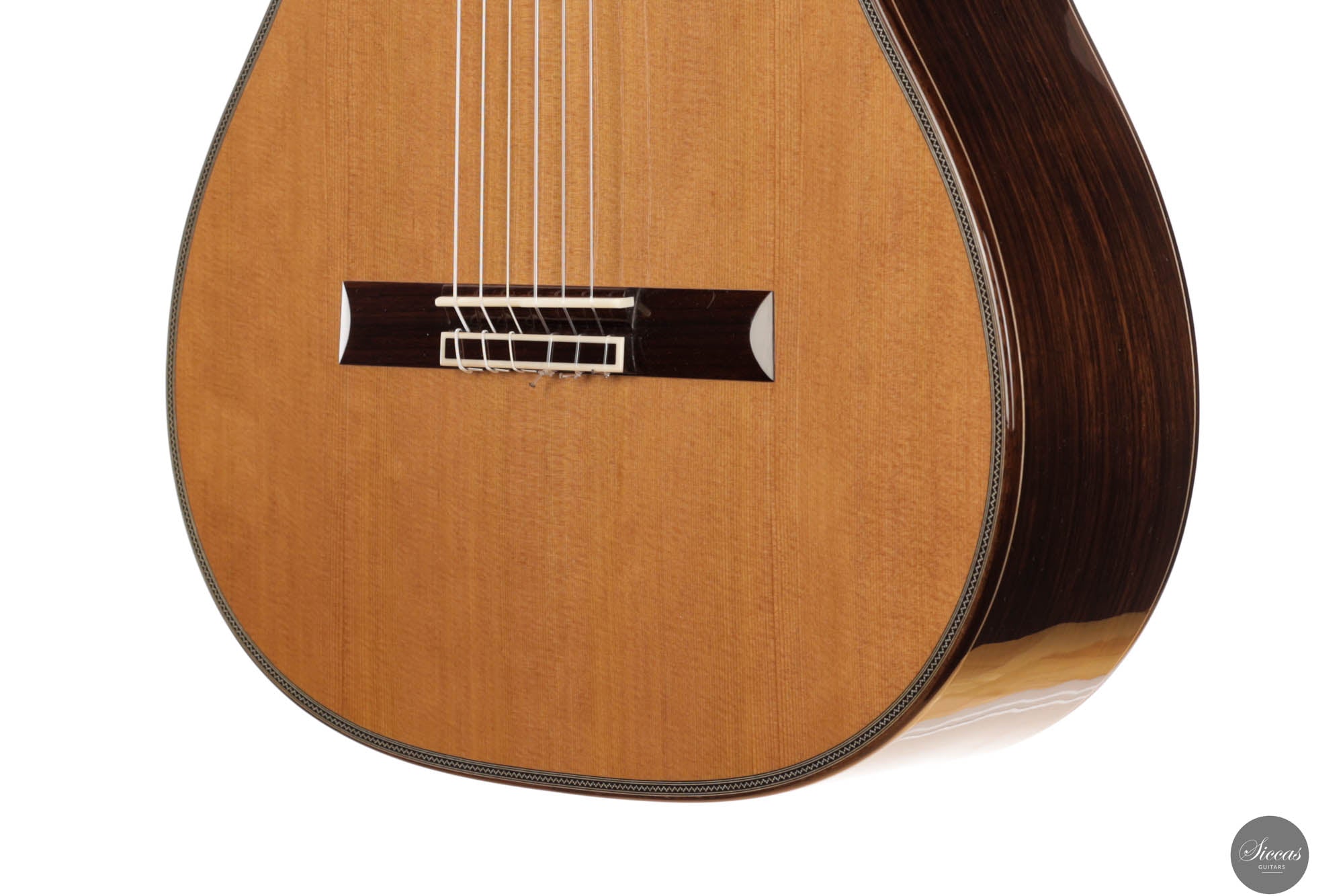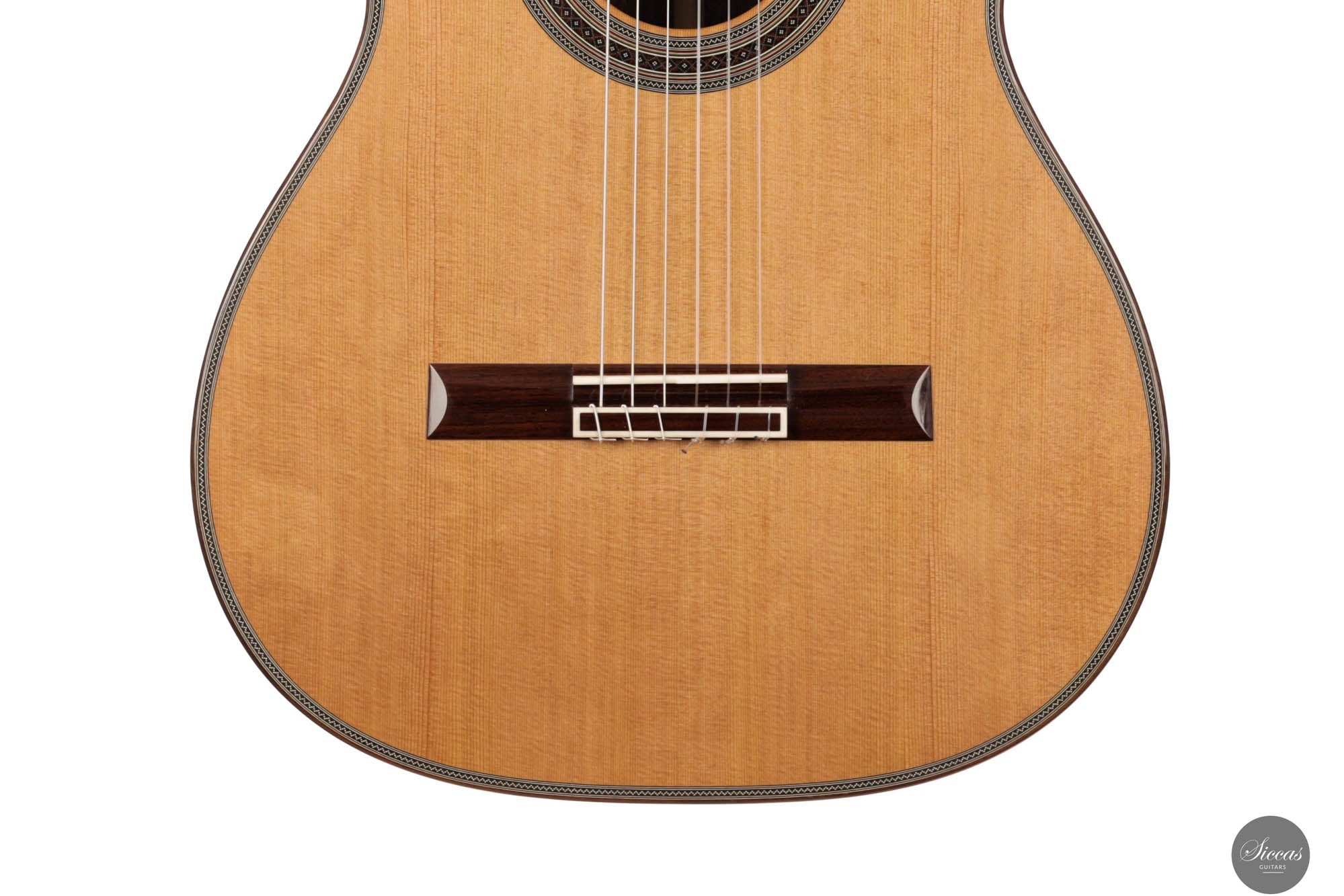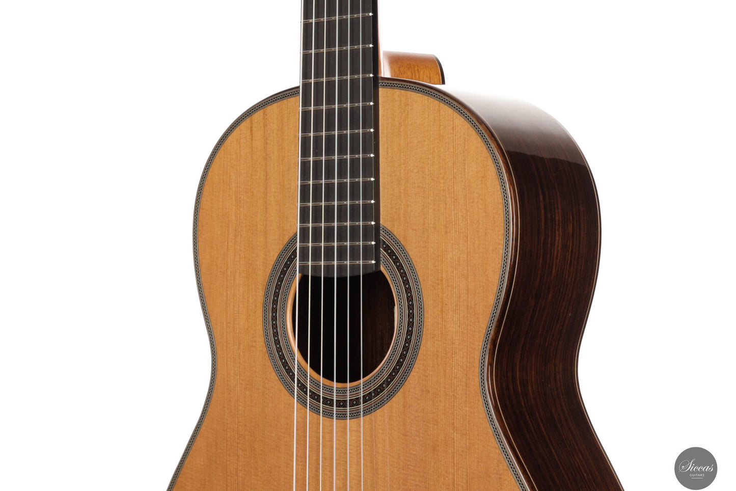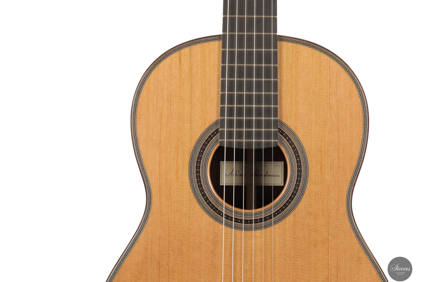 The 2024 Adrian Heinzelmann guitar is a paragon of modern classical guitar design, blending traditional excellence with contemporary flair. This instrument achieves a remarkable synthesis of voice separation, extensive sustain, and a balanced polyphonic sound, presenting a tonal complexity that is both bold and delicate. It features a comfortably rounded neck and a responsive soundboard, crafted to meet the high expectations of discerning classical guitarists. Notably, this guitar boasts exceptional volume, making it suitable for a wide array of concert settings without sacrificing tonal richness. Its capacity for impressive projection is balanced adeptly with its auditory charm, thanks to the meticulous craftsmanship that defines its construction. This latest addition to the Heinzelmann collection stands out as a versatile, concert-grade instrument, excelling both in aesthetics and sound. The careful selection of a cedar top and Indian rosewood for the back and sides further showcases Adrian Heinzelmann’s expertise. With a waiting list extending to 2030, securing one of Adrian's guitars is a testament to his renowned craftsmanship and the high demand for his exceptional instruments.