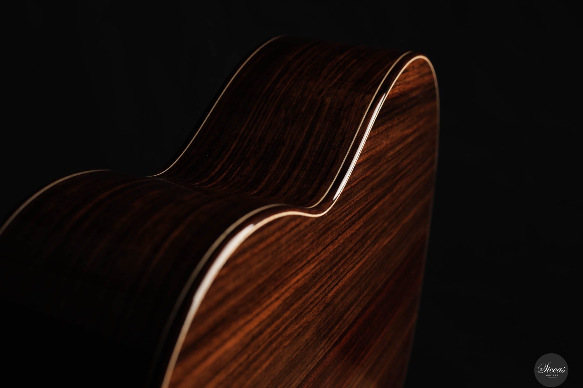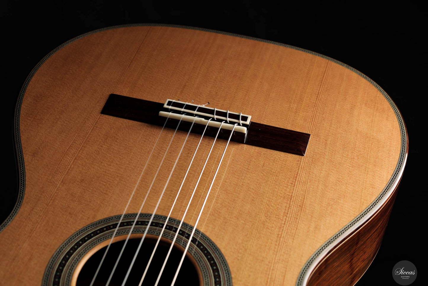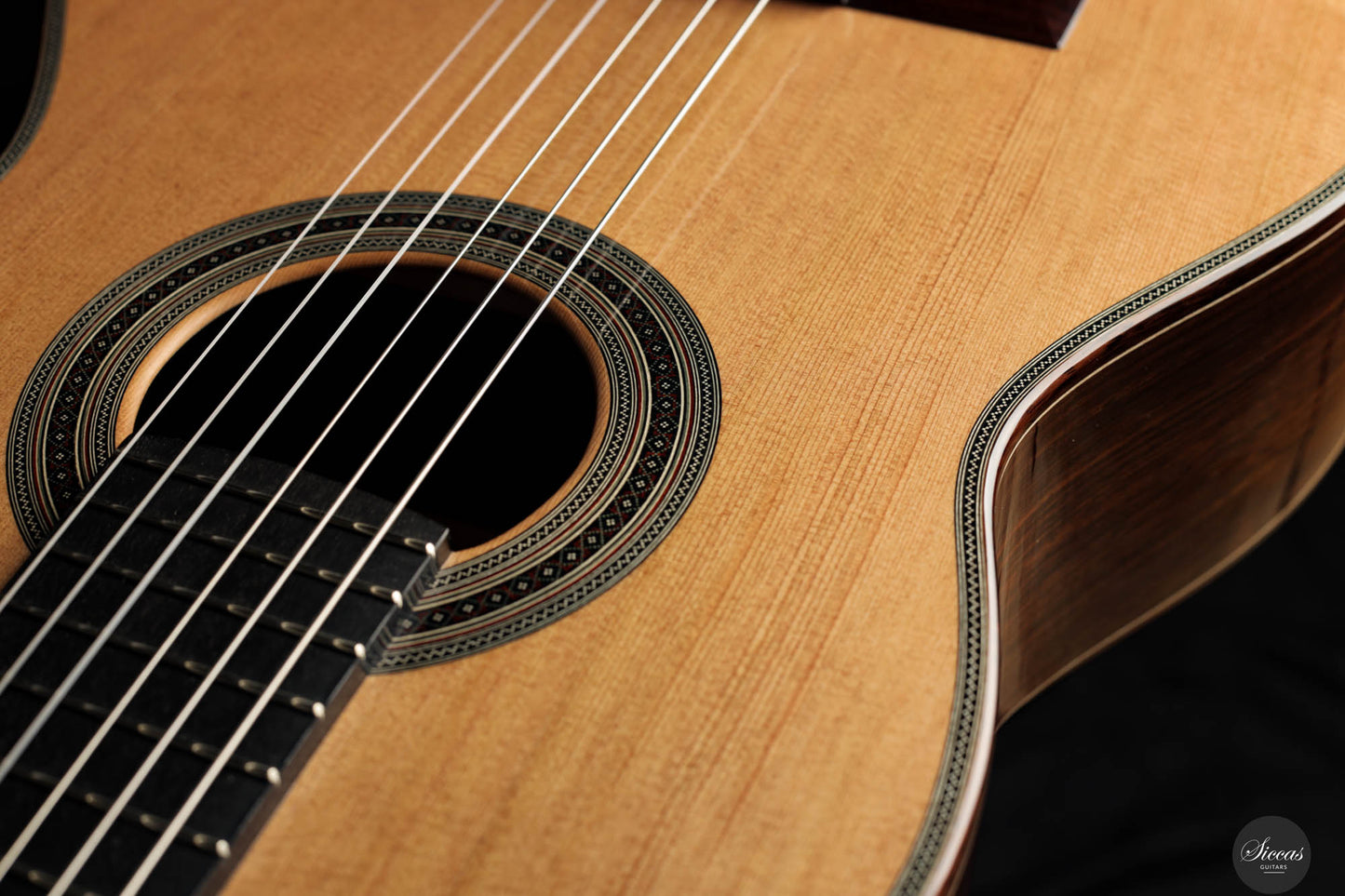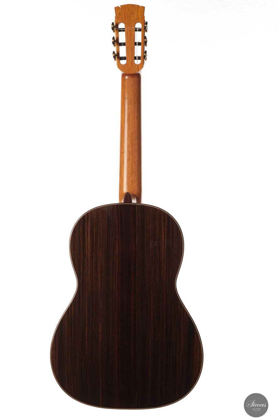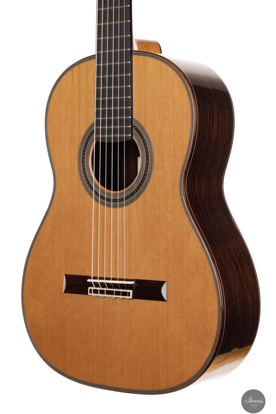 The 2024 Adrian Heinzelmann guitar is a paragon of modern classical guitar design, blending traditional excellence with contemporary flair. This instrument achieves a remarkable synthesis of voice separation, extensive sustain, and a balanced polyphonic sound, presenting a tonal complexity that is both bold and delicate. It features a comfortably rounded neck and a responsive soundboard, crafted to meet the high expectations of discerning classical guitarists. Notably, this guitar boasts exceptional volume, making it suitable for a wide array of concert settings without sacrificing tonal richness. Its capacity for impressive projection is balanced adeptly with its auditory charm, thanks to the meticulous craftsmanship that defines its construction. This latest addition to the Heinzelmann collection stands out as a versatile, concert-grade instrument, excelling both in aesthetics and sound. The careful selection of a cedar top and Indian rosewood for the back and sides further showcases Adrian Heinzelmann’s expertise. With a waiting list extending to 2030, securing one of Adrian's guitars is a testament to his renowned craftsmanship and the high demand for his exceptional instruments.