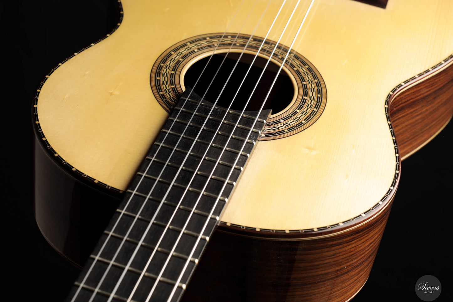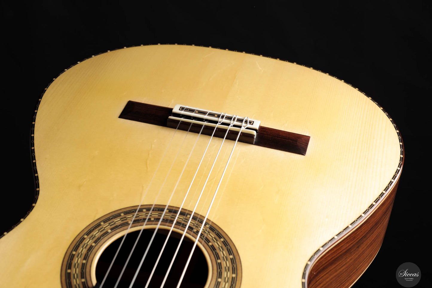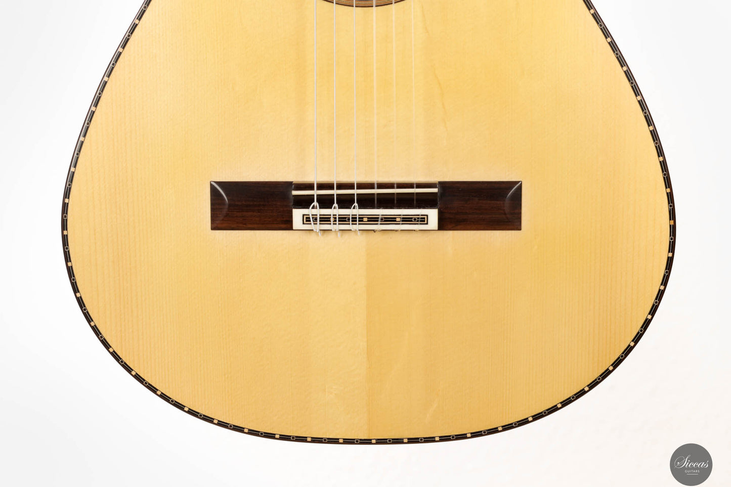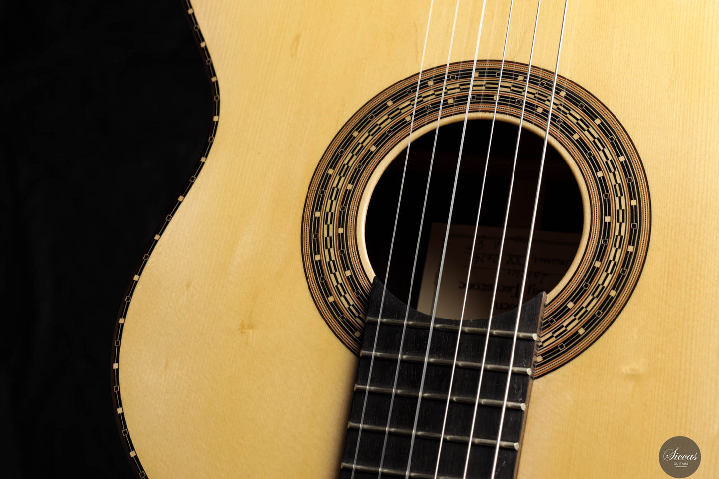 Adrien Savary Freestone's latest guitar creation stands out as a remarkable fusion of traditional craftsmanship and modern innovation. This instrument strikes a harmonious balance, appealing to both purists of classical guitar design and advocates for contemporary advancements. The distinctive use of all-wood lattice bracing on the spruce soundboard is a testament to Freestone's commitment to enhancing the guitar's organic sound qualities, without sacrificing the power and dynamic range that modern players demand. The choice of Indian rosewood for the back and sides adheres to the time-honored traditions of classical guitar construction, ensuring that the instrument not only sounds magnificent but also carries the classic aesthetics of its predecessors.