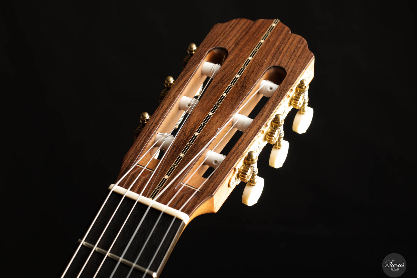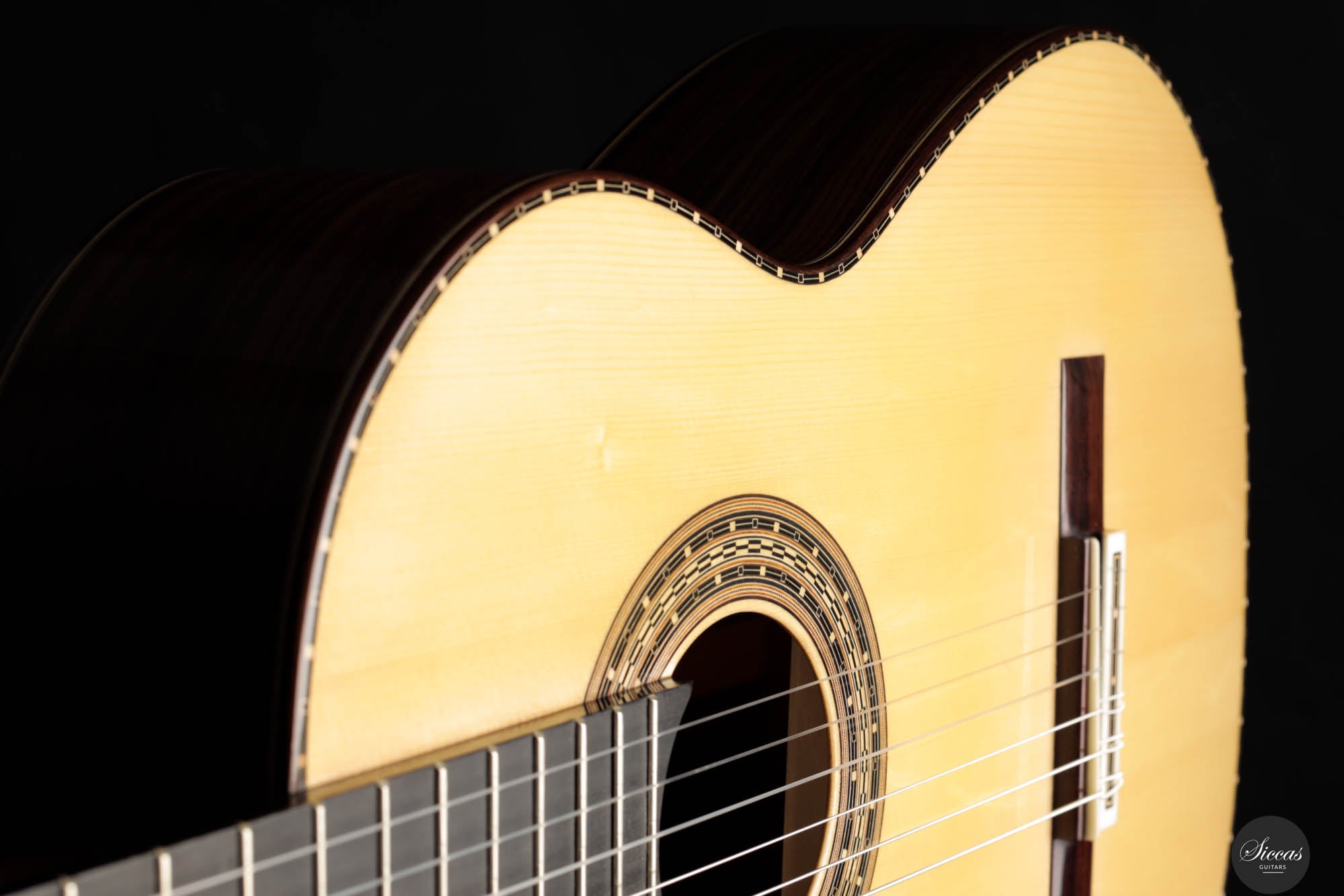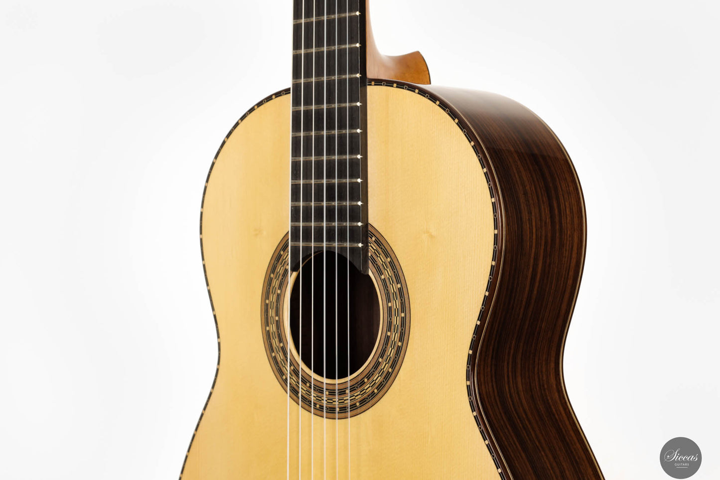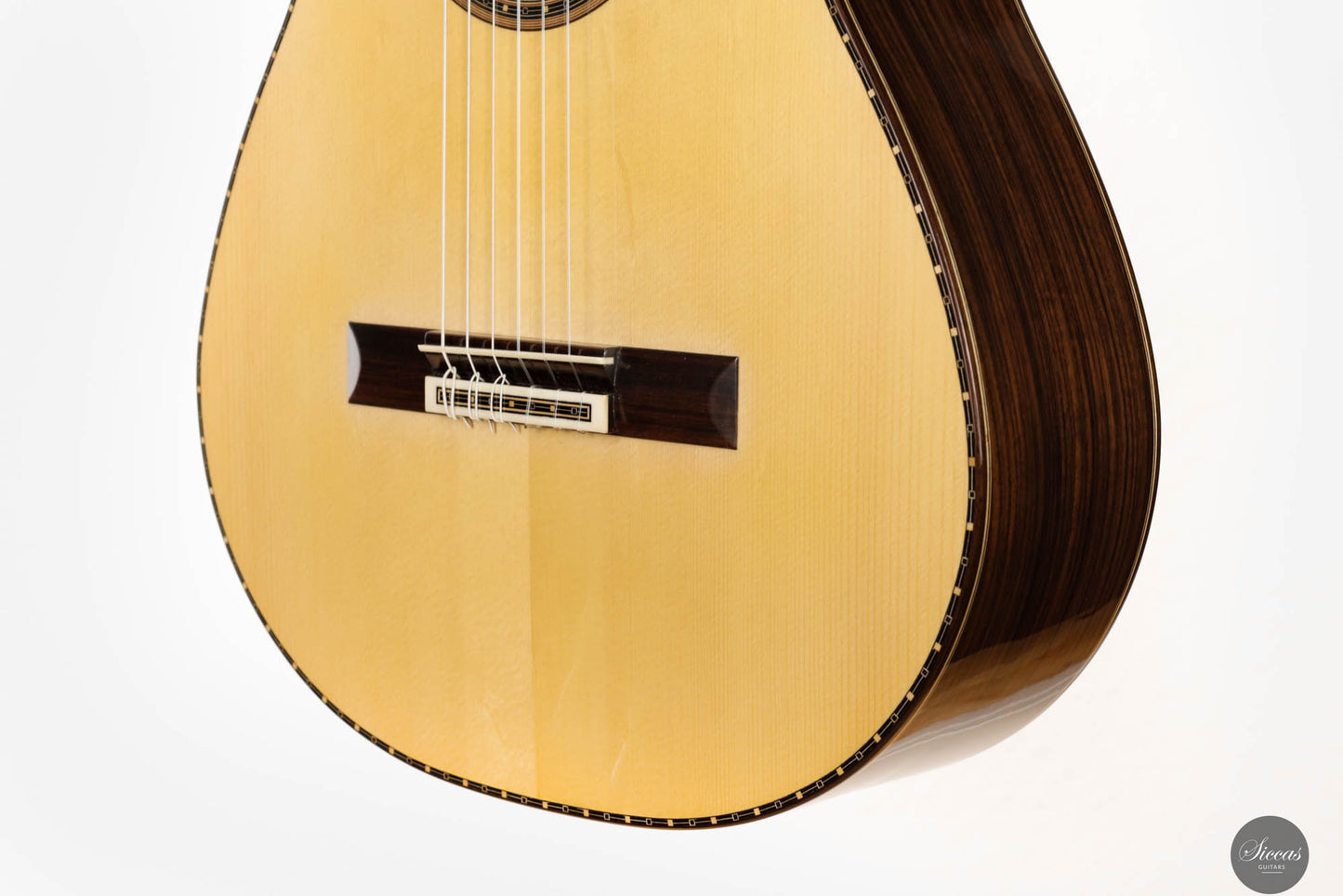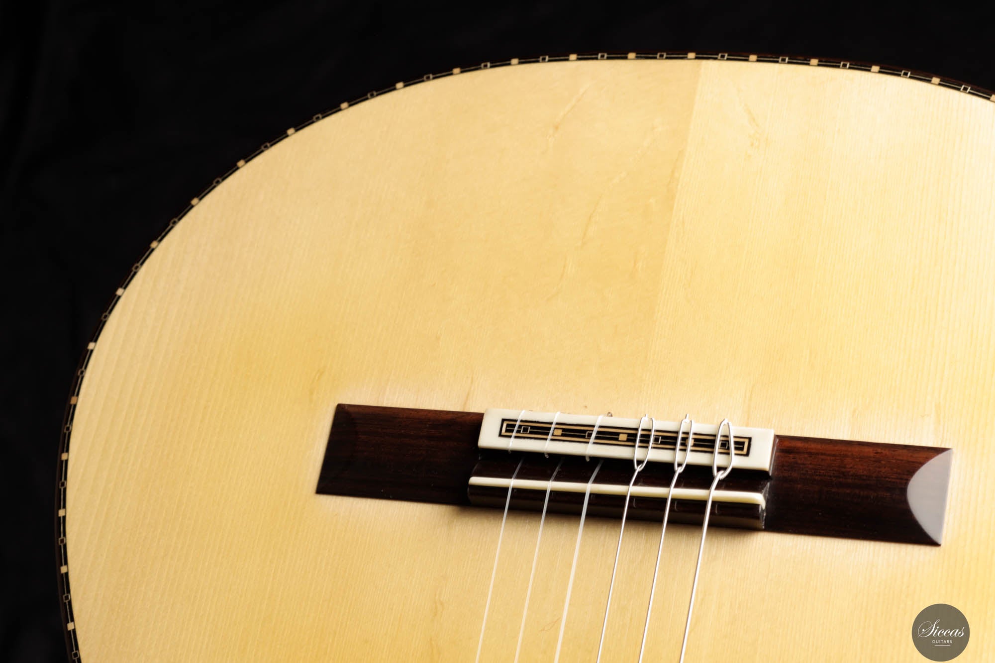 Adrien Savary Freestone's latest guitar creation stands out as a remarkable fusion of traditional craftsmanship and modern innovation. This instrument strikes a harmonious balance, appealing to both purists of classical guitar design and advocates for contemporary advancements. The distinctive use of all-wood lattice bracing on the spruce soundboard is a testament to Freestone's commitment to enhancing the guitar's organic sound qualities, without sacrificing the power and dynamic range that modern players demand. The choice of Indian rosewood for the back and sides adheres to the time-honored traditions of classical guitar construction, ensuring that the instrument not only sounds magnificent but also carries the classic aesthetics of its predecessors.